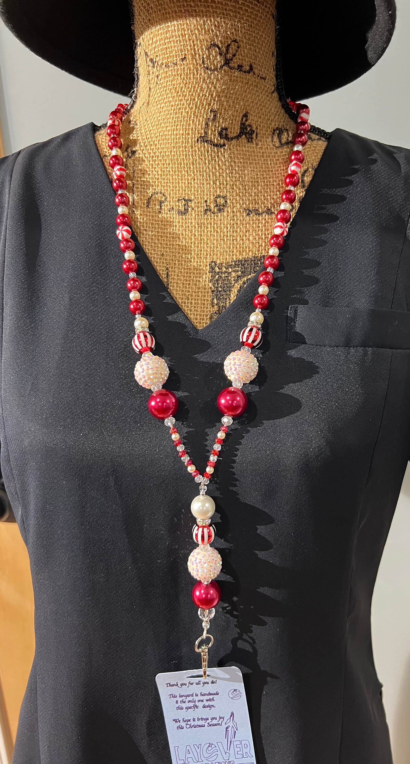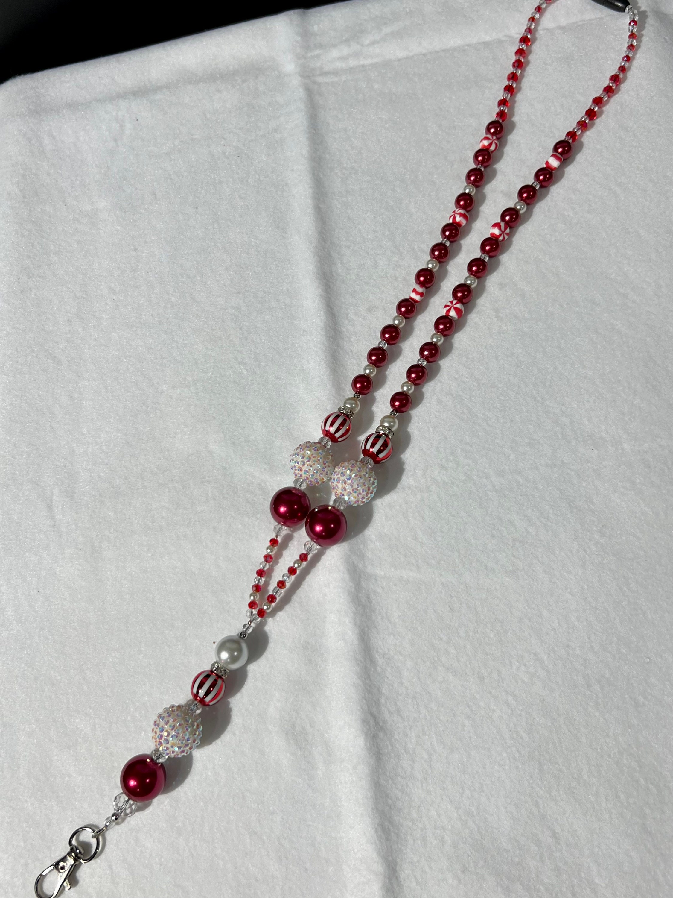 One of A Kind - Red, White, Peppermint, Silver-Coated, Cubic Zirconia, Clear and Pearl Sparkly Beads Create This Elegant Lanyard For Your Holiday Outfits Whether At Work Or Any Special Holiday Events