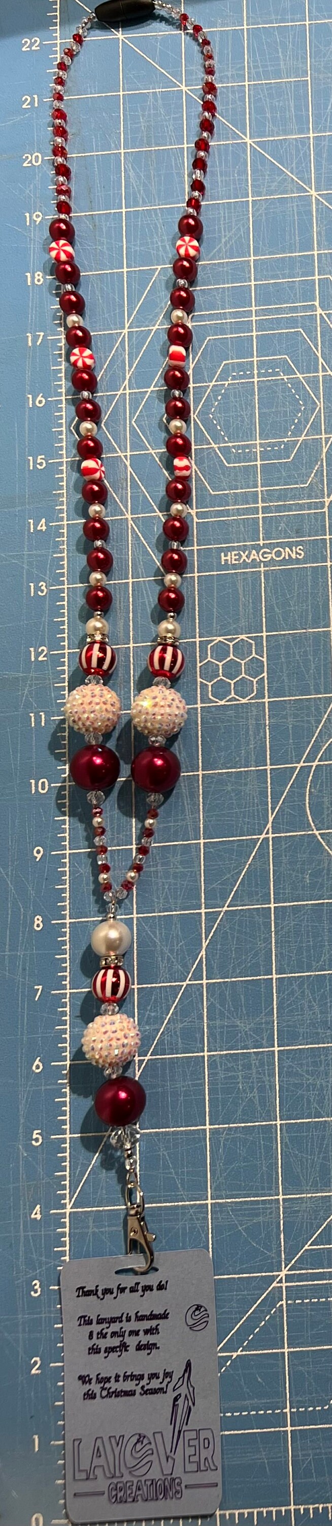 Due to various materials used and the fact that they are handmade, the lengths of each vary slightly. PLEASE SEE PHOTOS WITH RULER SHOWING THE OVERALL LENGTH AND INNER DIMENSION OF EACH LANYARD. In most cases, you can either use the breakaway plastic clasp or effortlessly slip them over your head. Plus, we offer a wide range of designs, including holiday and special event themes like Christmas, Mardi Gras, and Valentine's Day. Some lanyards feature inspirational elements, making them perfect for Christians, educators, medical professionals, flight attendants, or cruise enthusiasts.