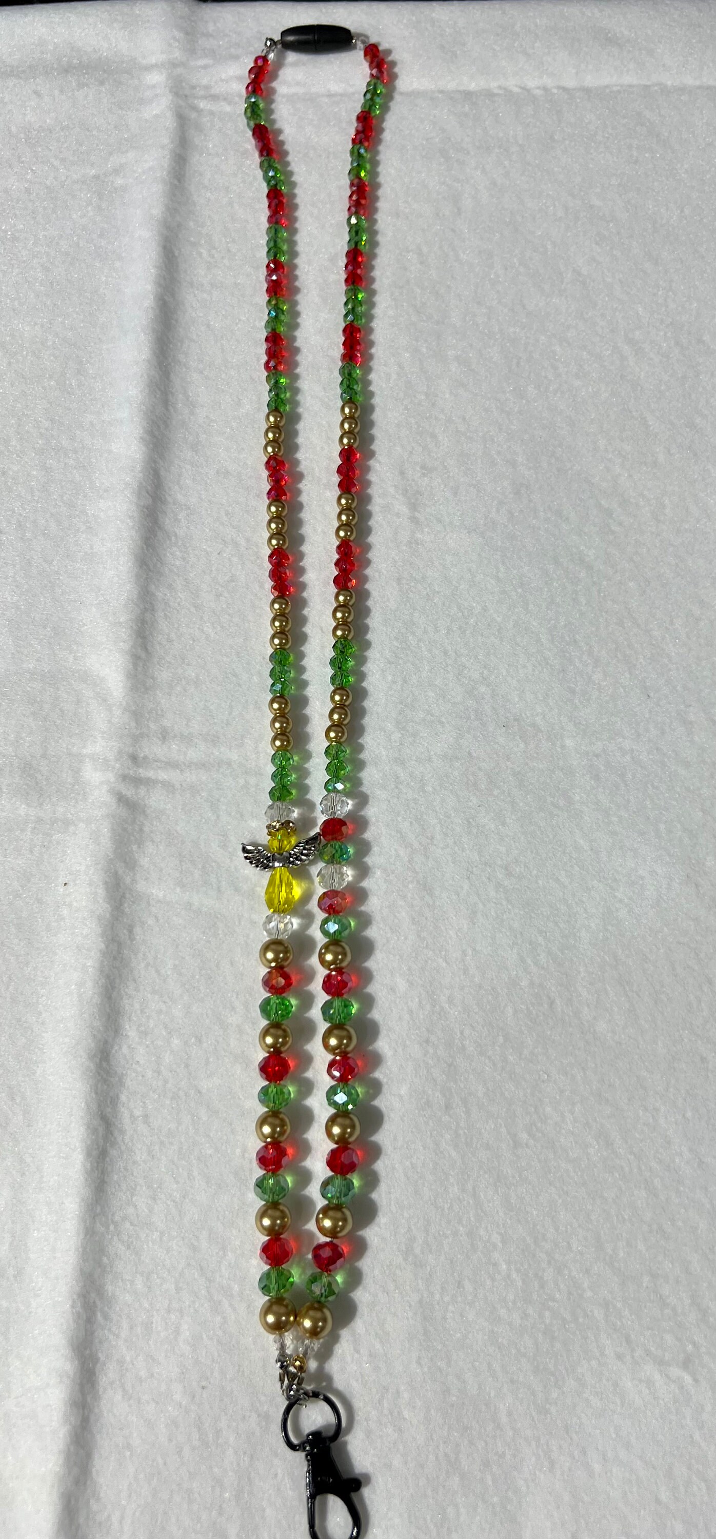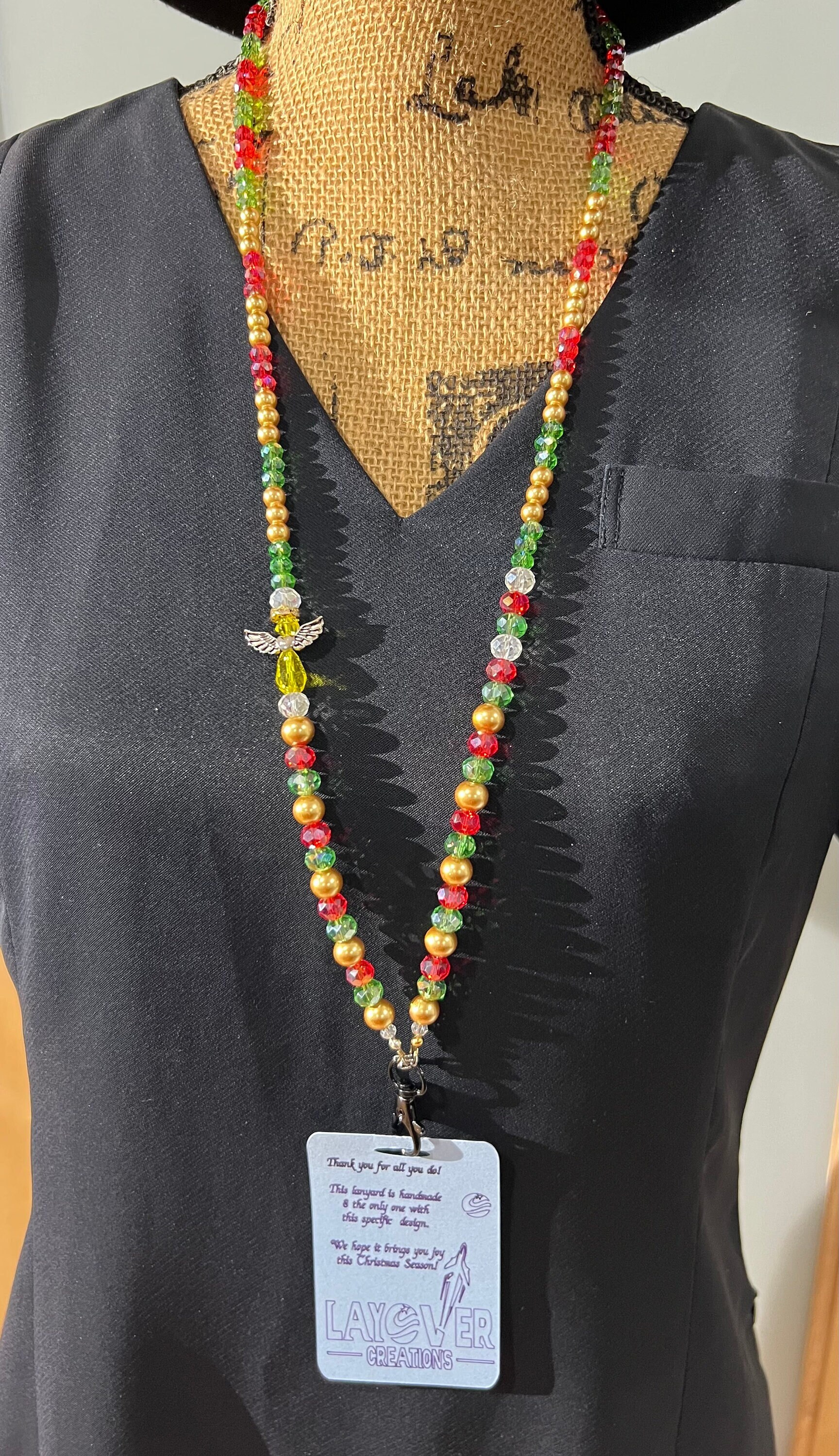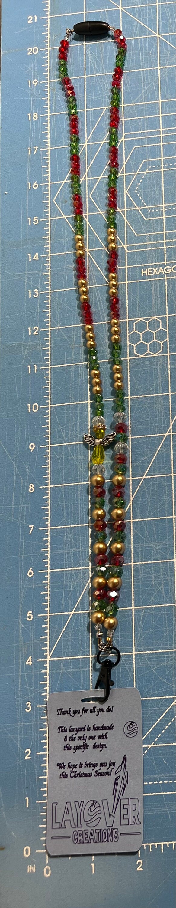One of A Kind - Yellow Angel with Red, Green and Gold Sparkly Beads Create This Elegant Lanyard For Your Holiday Outfits Whether At Work Or Any Special Holiday Events