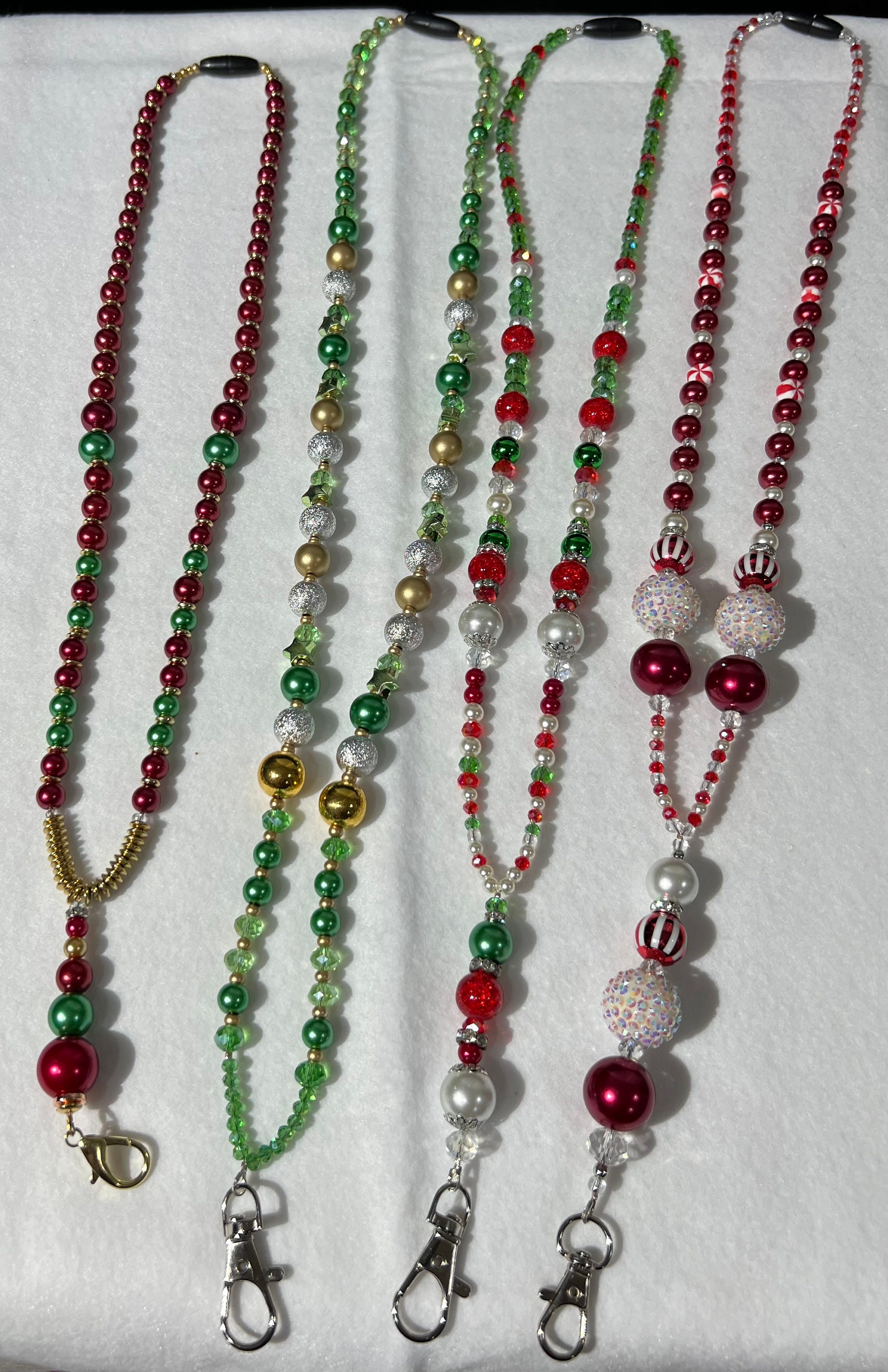 Due to various materials used and the fact that they are handmade, the lengths of each vary slightly. PLEASE SEE PHOTOS WITH RULER SHOWING THE OVERALL LENGTH AND INNER DIMENSION OF EACH LANYARD. In most cases, you can either use the breakaway plastic clasp or effortlessly slip them over your head. Plus, we offer a wide range of designs, including holiday and special event themes like Christmas, Mardi Gras, and Valentine's Day. Some lanyards feature inspirational elements, making them perfect for Christians, educators, medical professionals, flight attendants, or cruise enthusiasts.