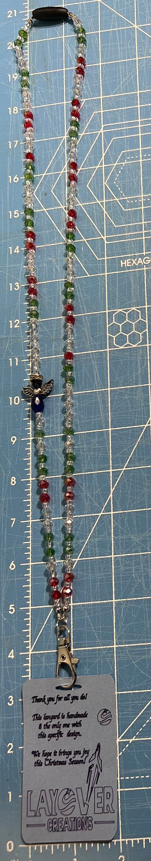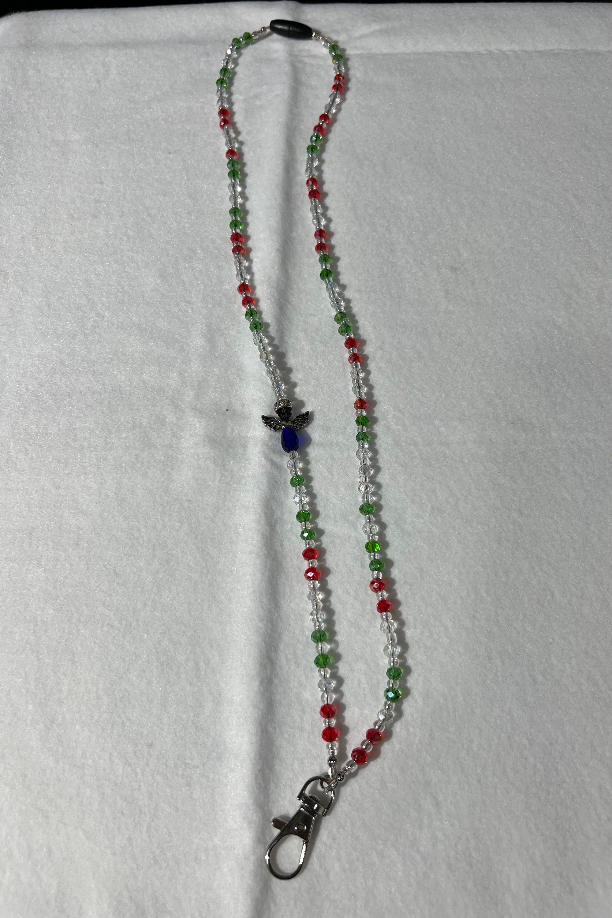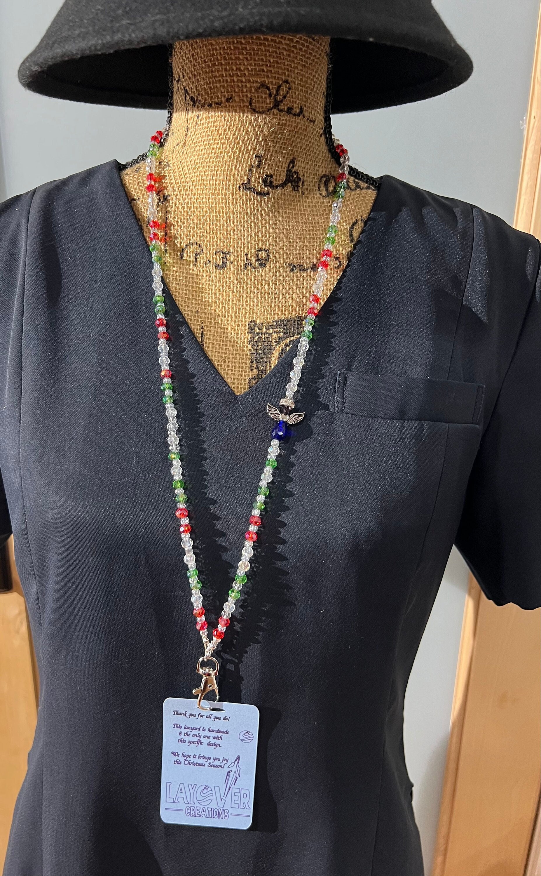 Dark Blue Angel with Red, Green and Clear Sparkly Beads Create This Elegant Lanyard For Your Holiday Outfits Whether At Work Or Any Special Holiday Events
