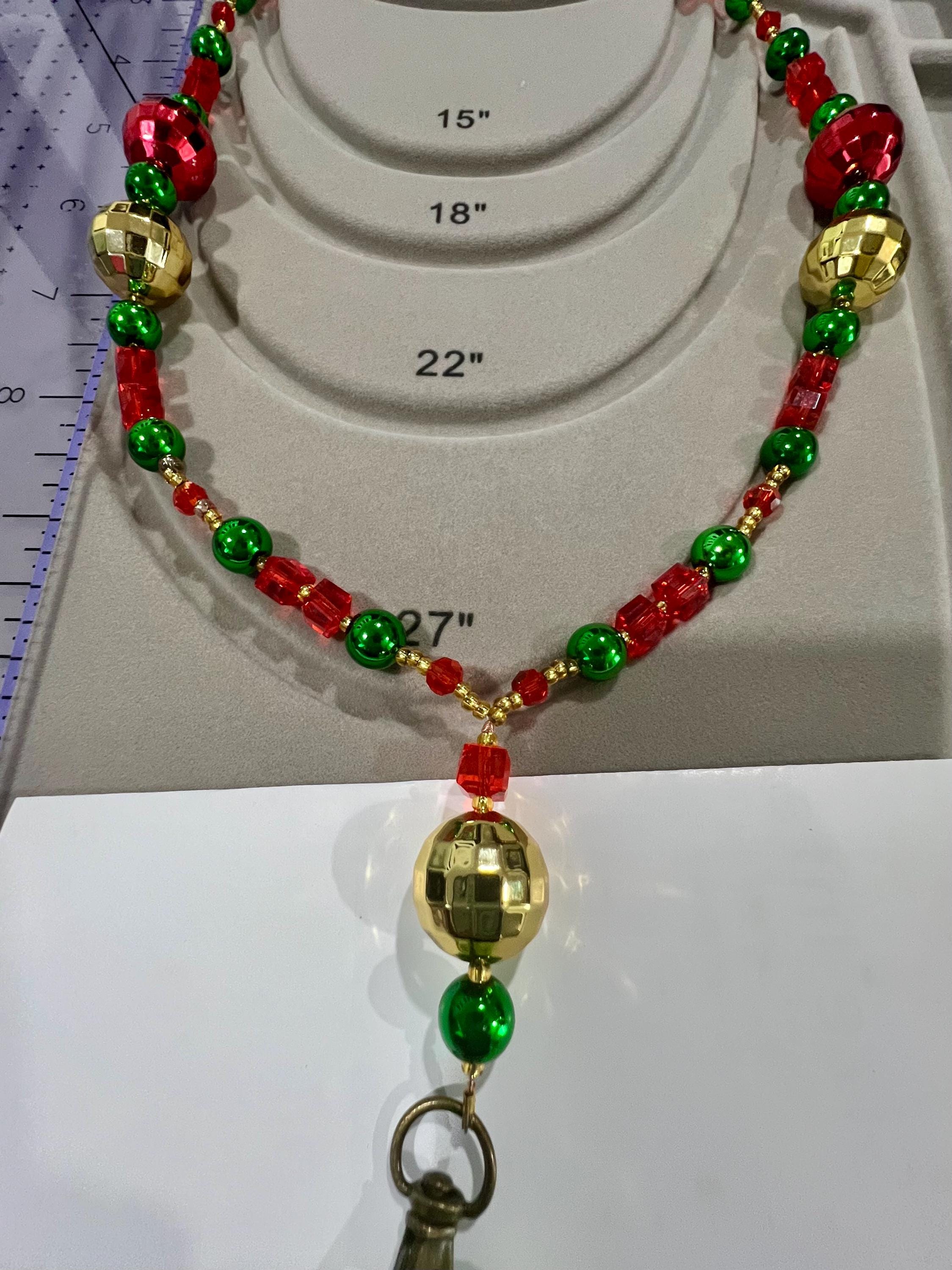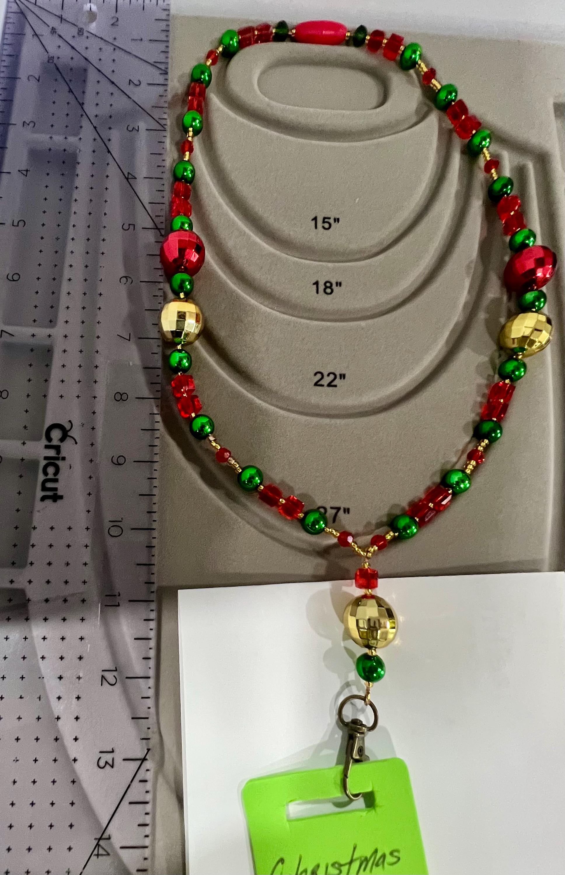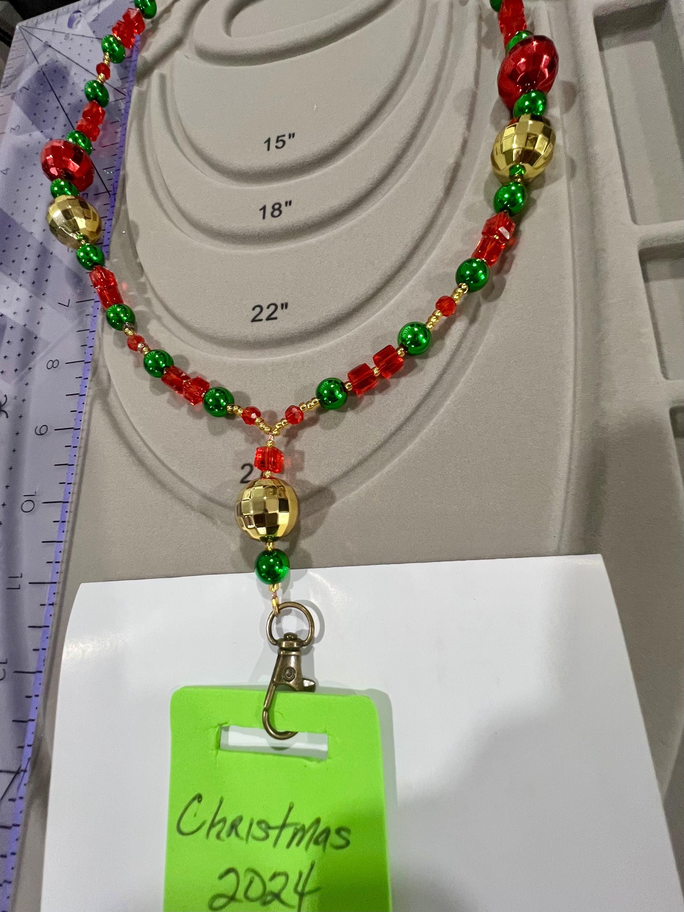One of A Kind -This Lanyard was created with red and gold beads to resemble Christmas ornaments. Additional beads are red, green, clear, gold colors.