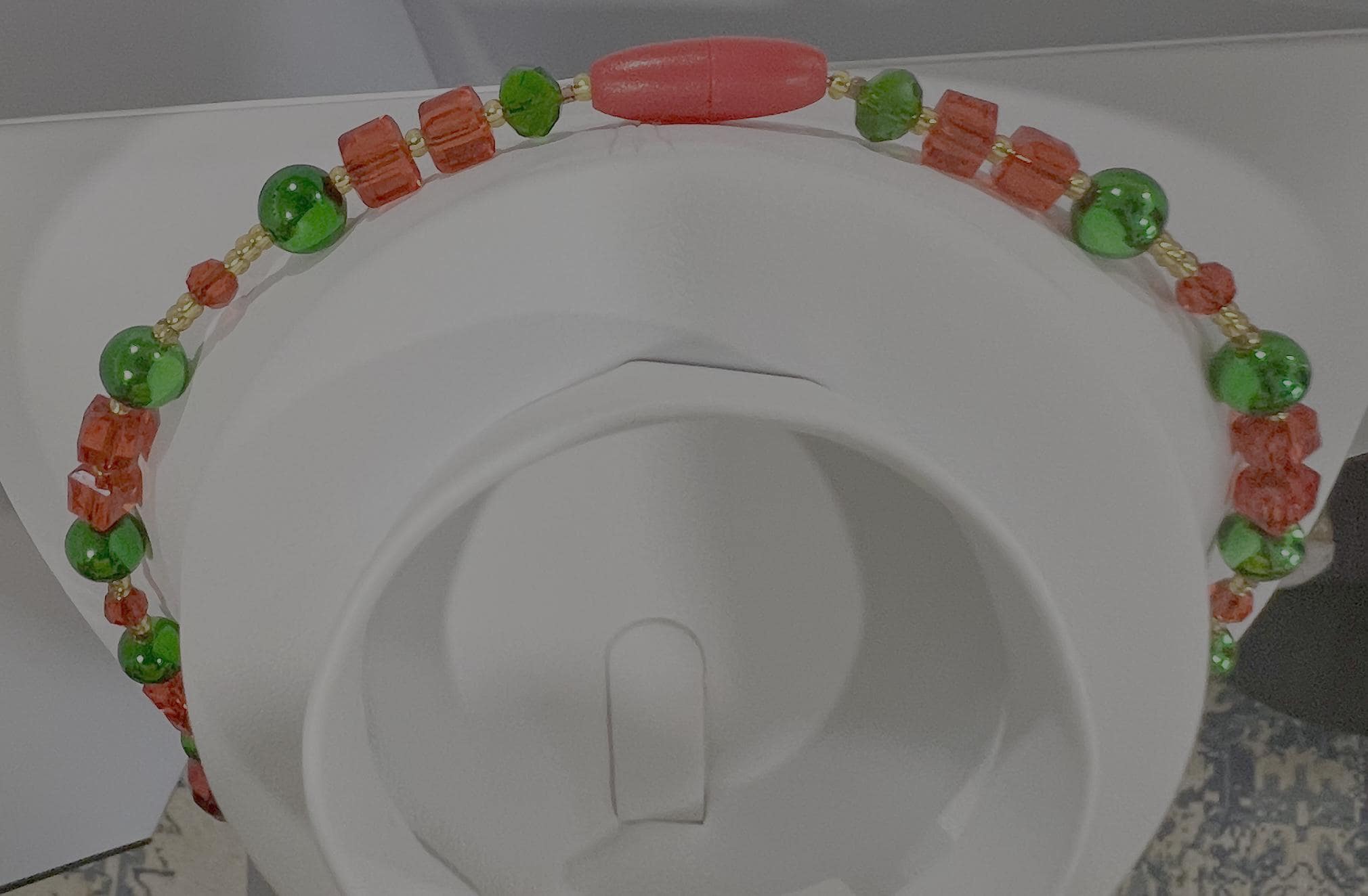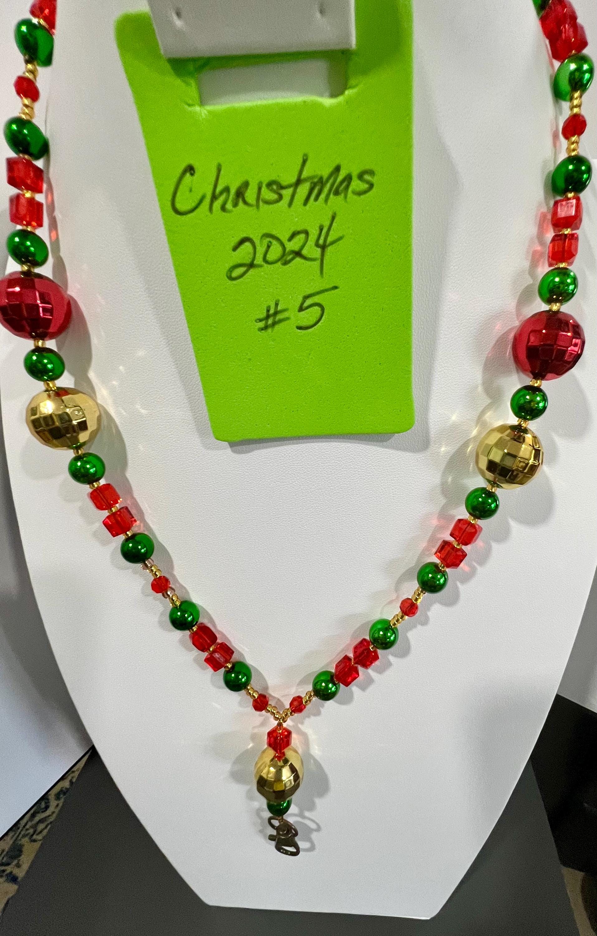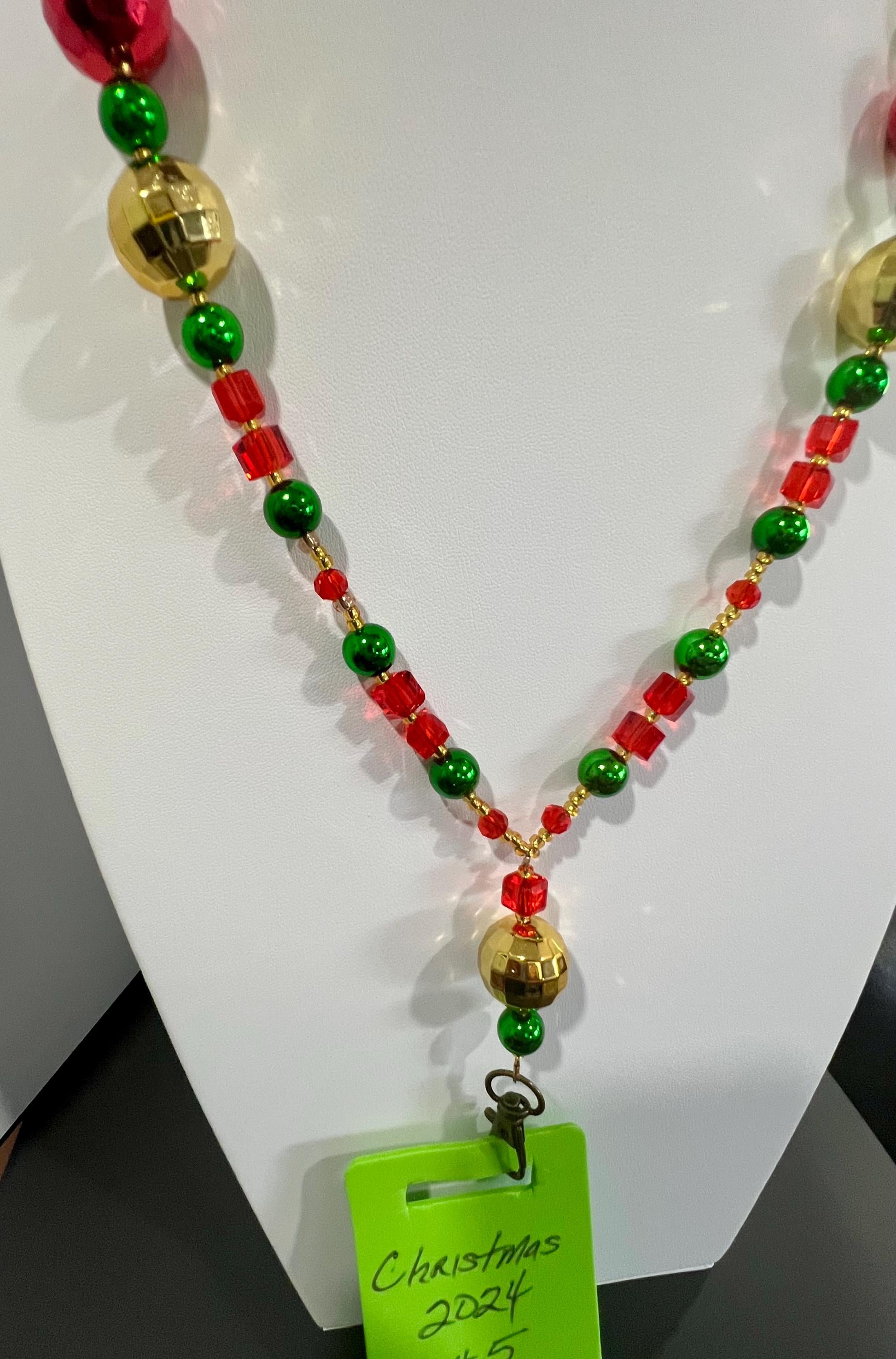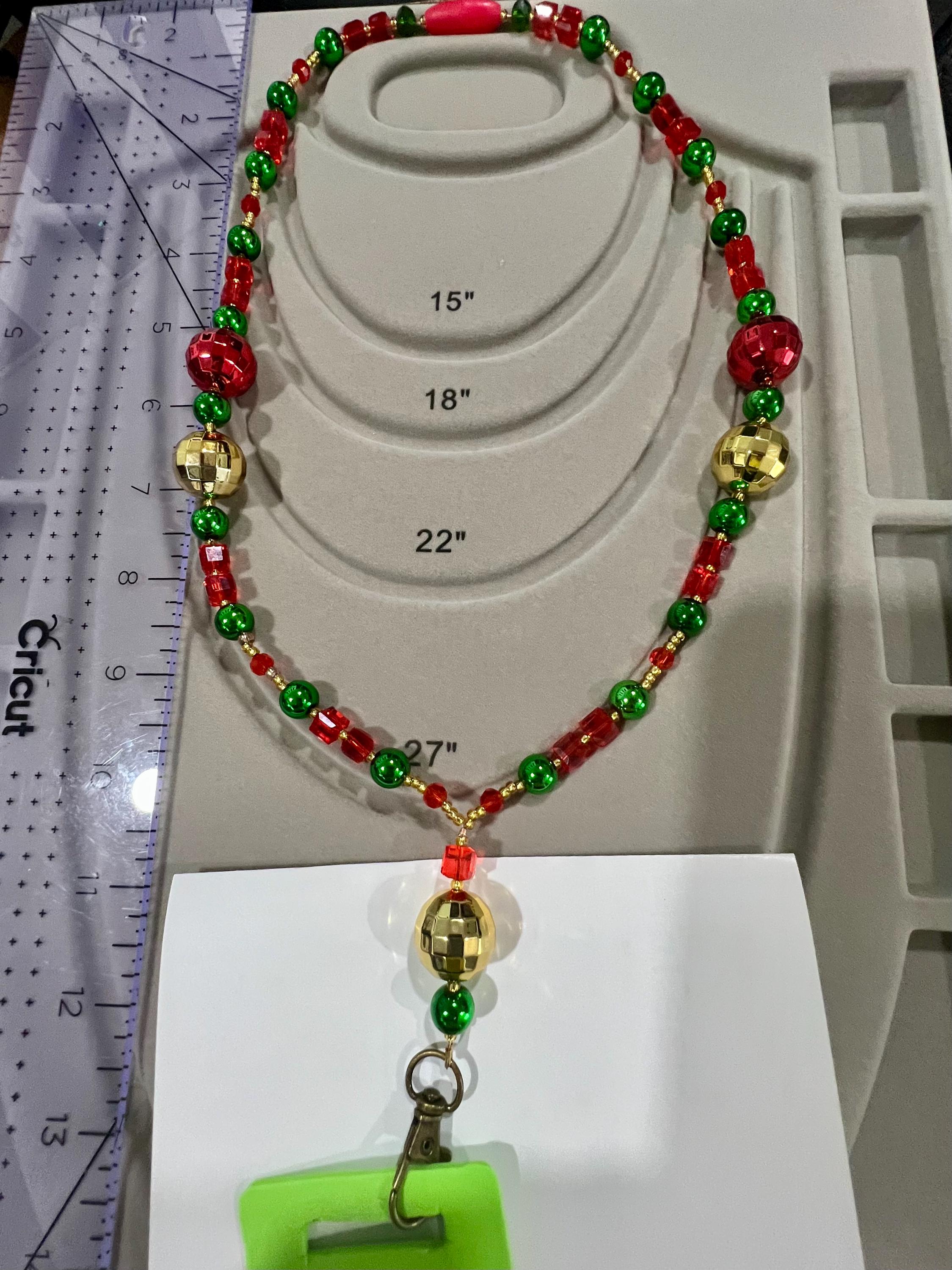 One of A Kind -This Lanyard was created with red and gold beads to resemble Christmas ornaments. Additional beads are red, green, clear, gold colors.