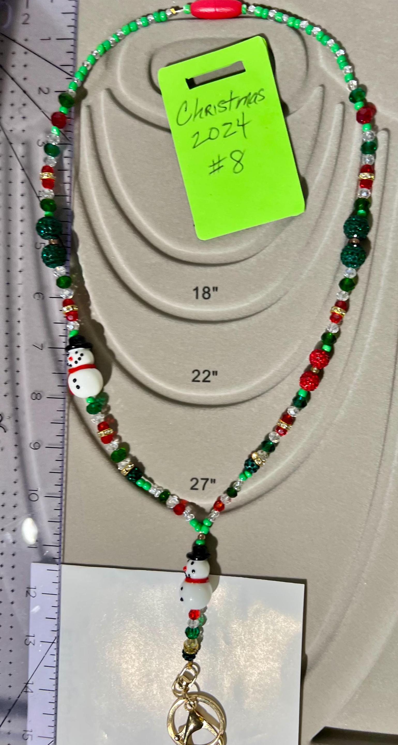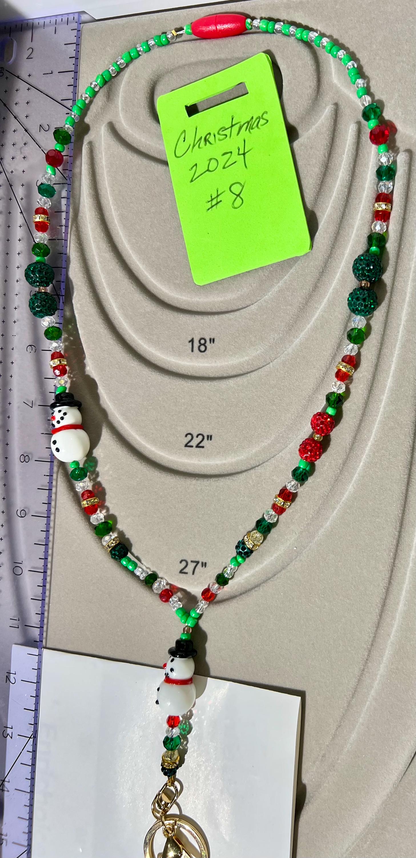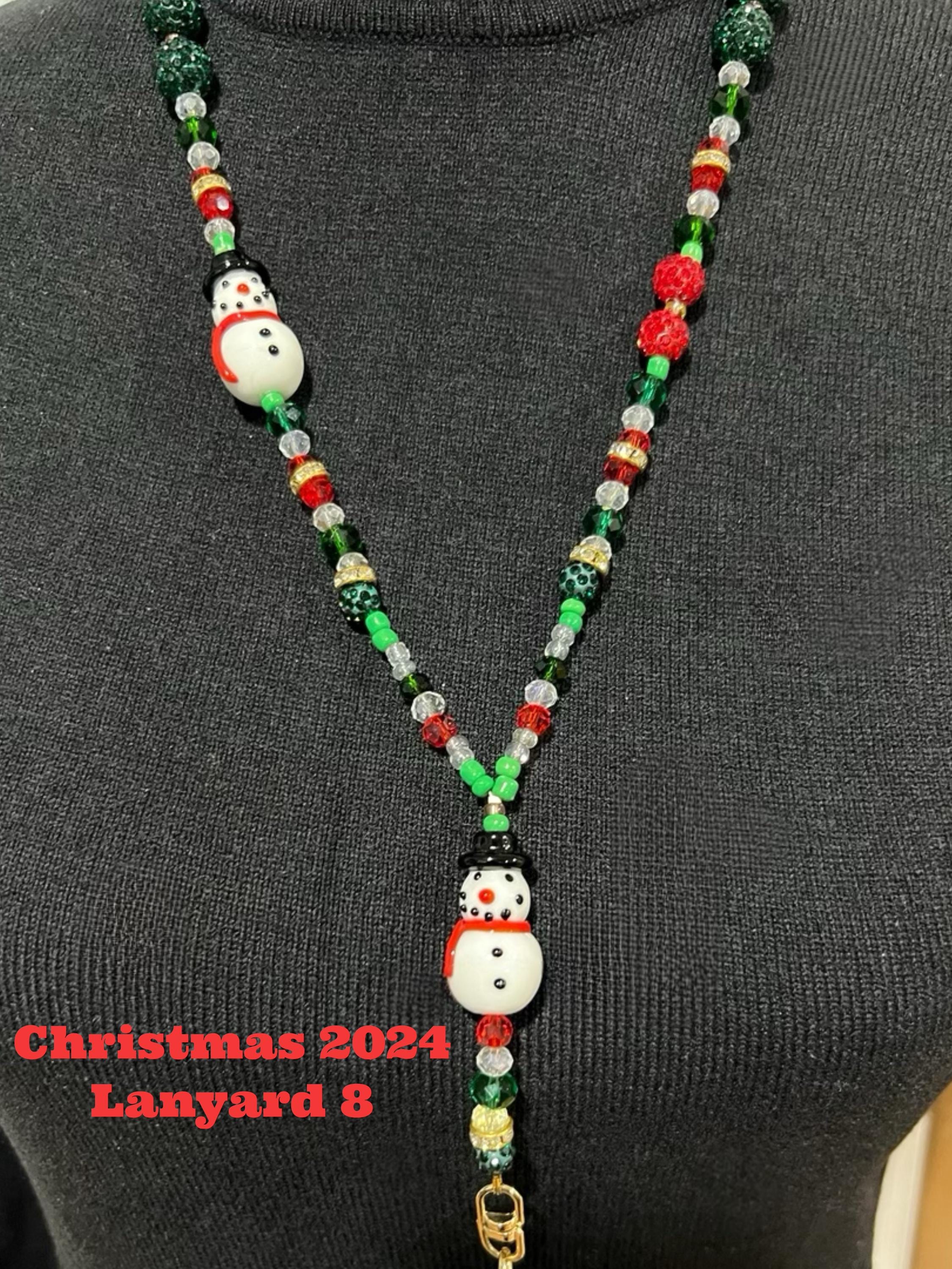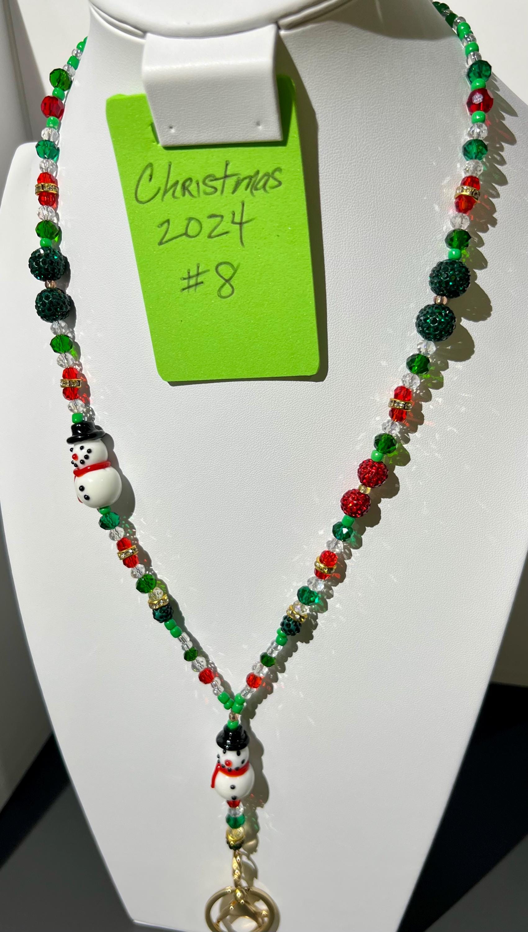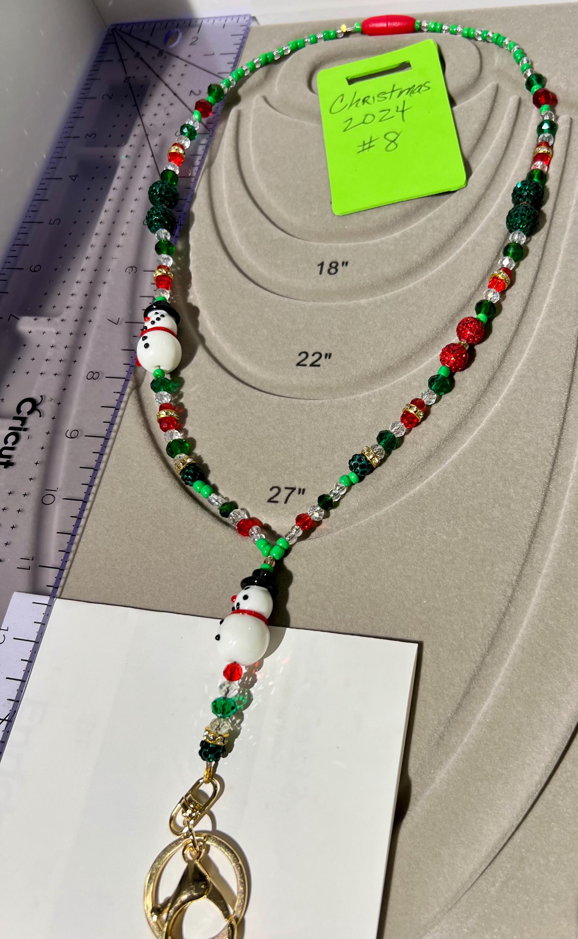 Unique One-Of-A- Kind Breakaway Lanyard - Christmas 2024 #8 - Slightly Irregular Red, White, Green & Clear Beads with 2 Ceramic Snowmen
