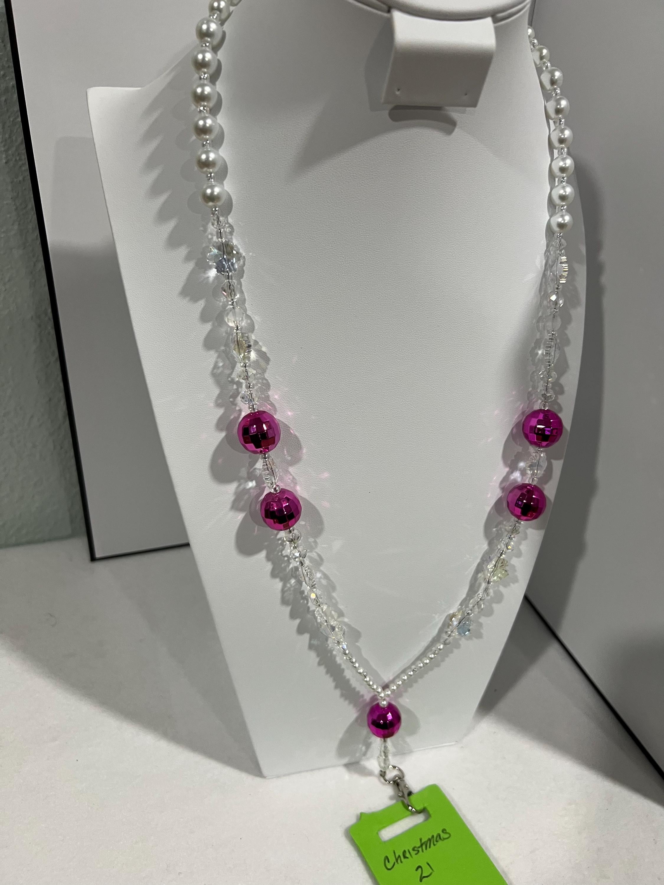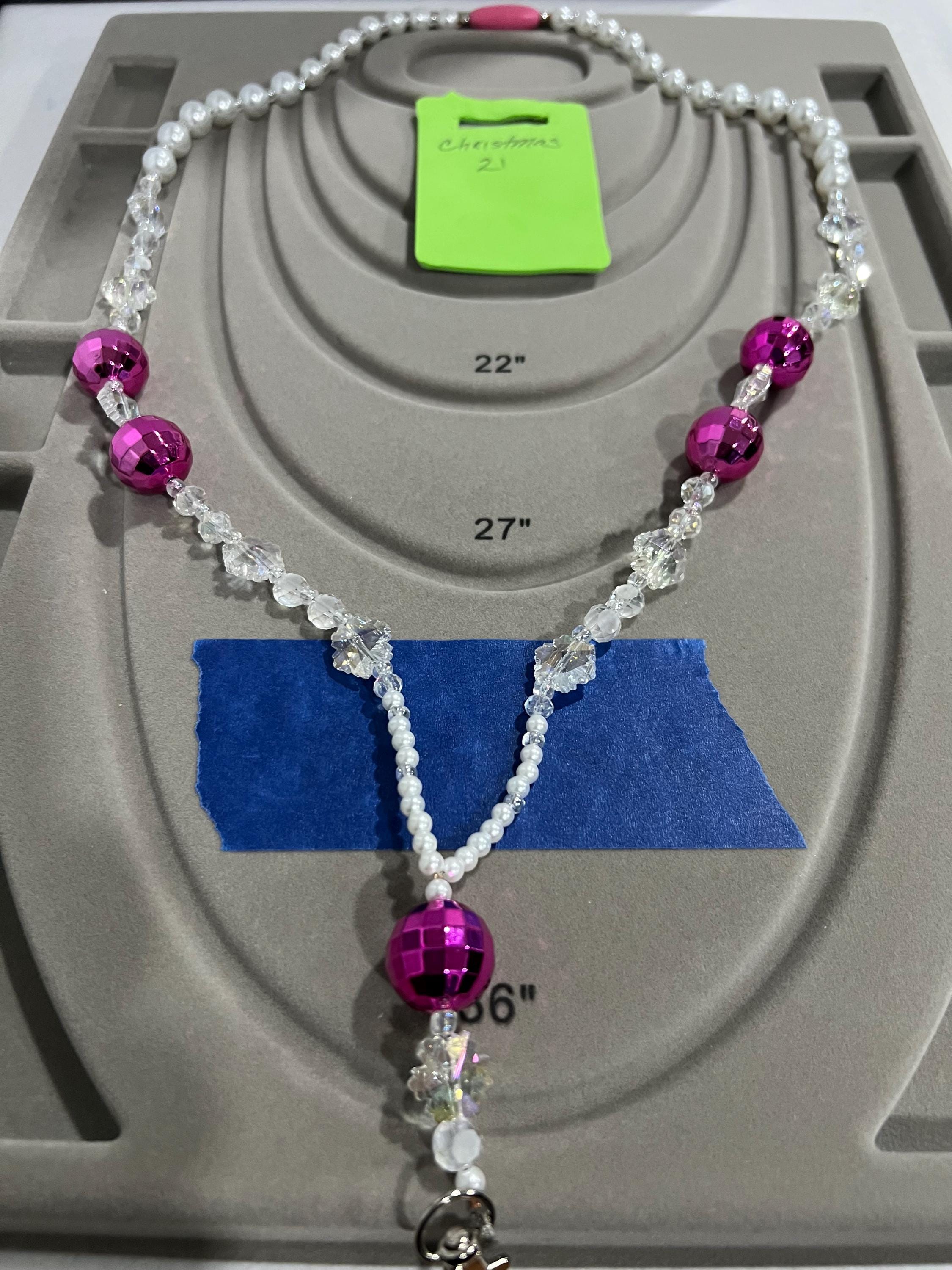 Christmas 21 Breakaway Lanyard - Pearl, Clear, and Fuchsia Beads with Iridescent Snowflakes and Fuchsia Ornaments