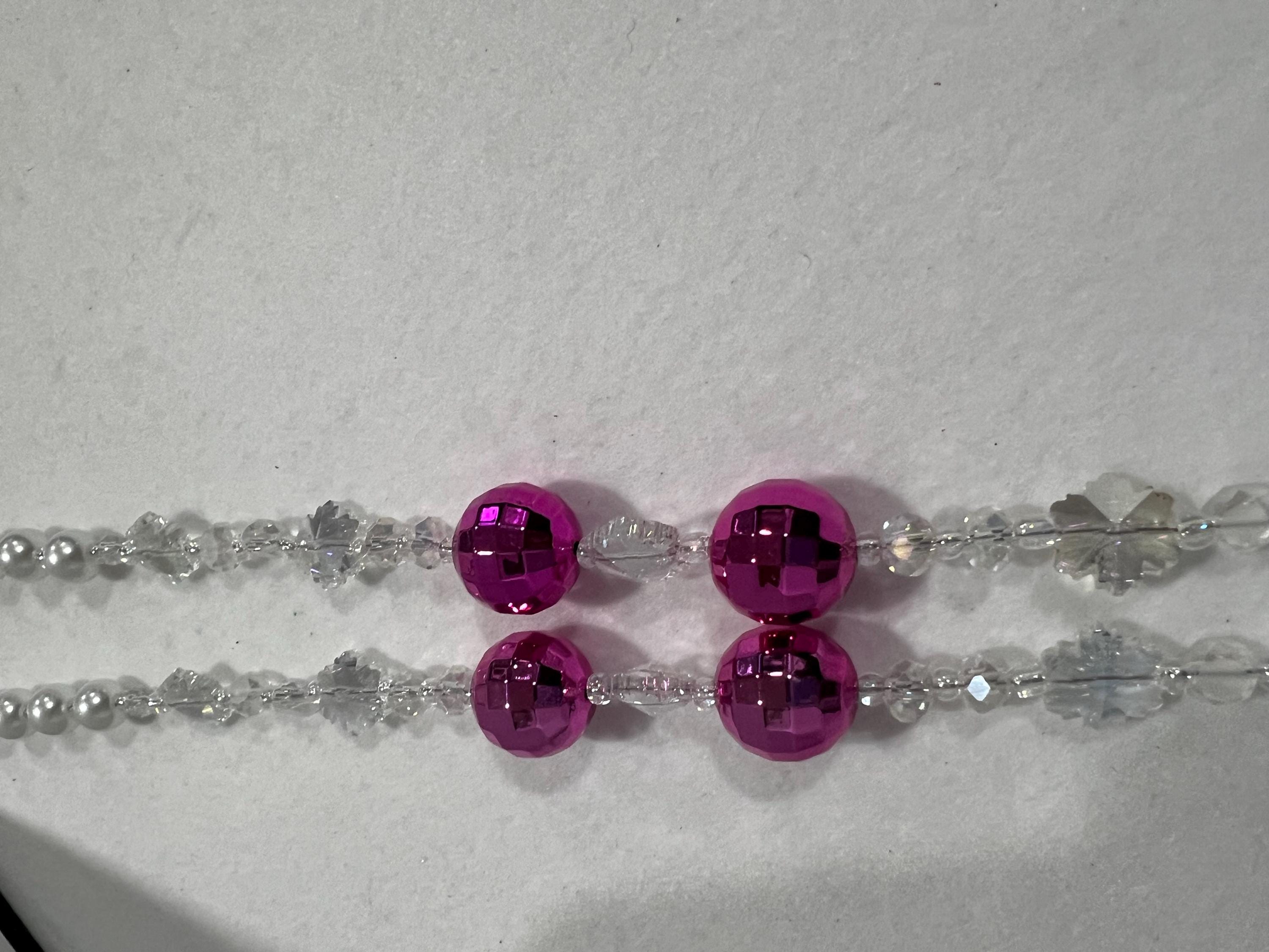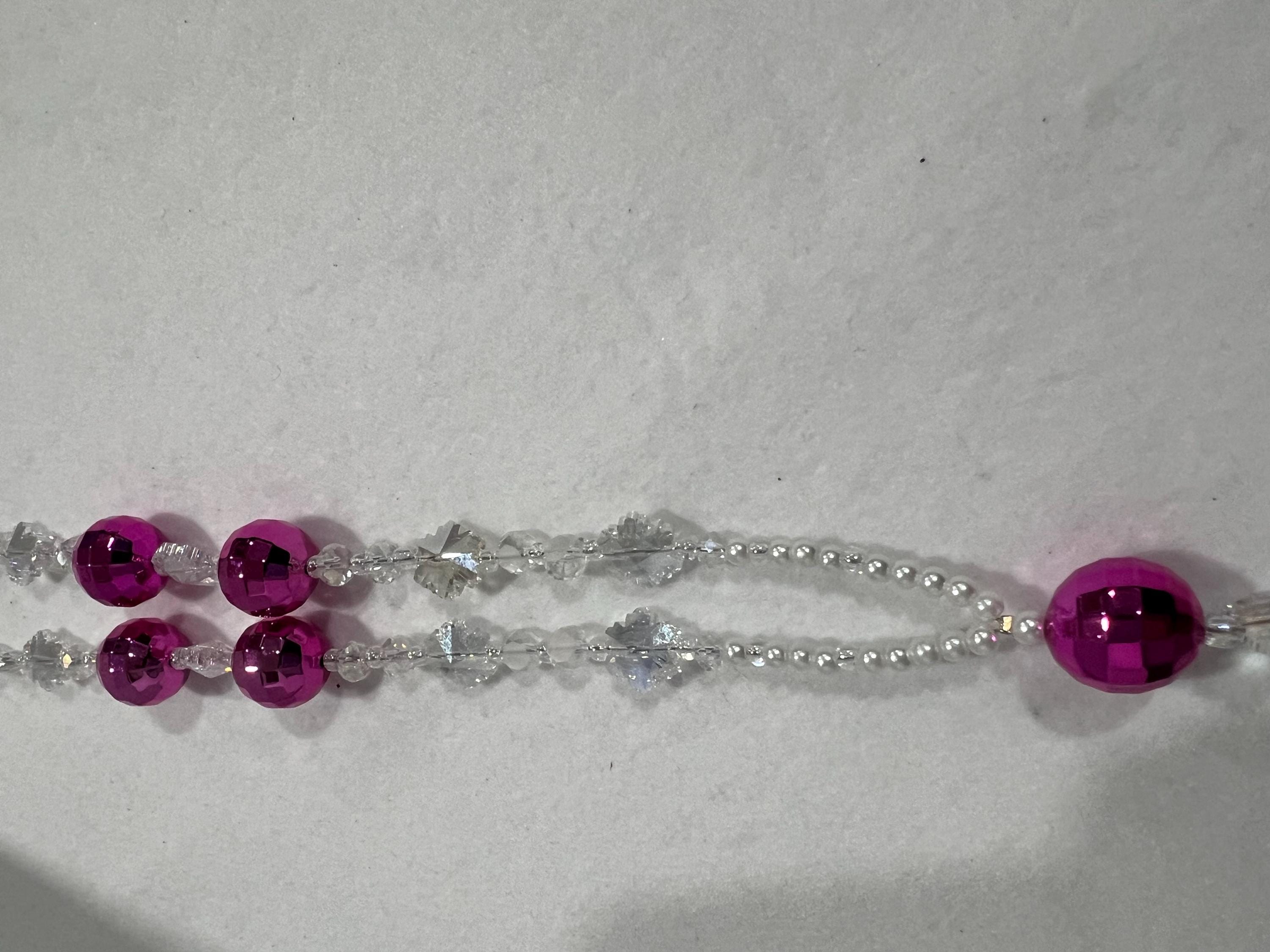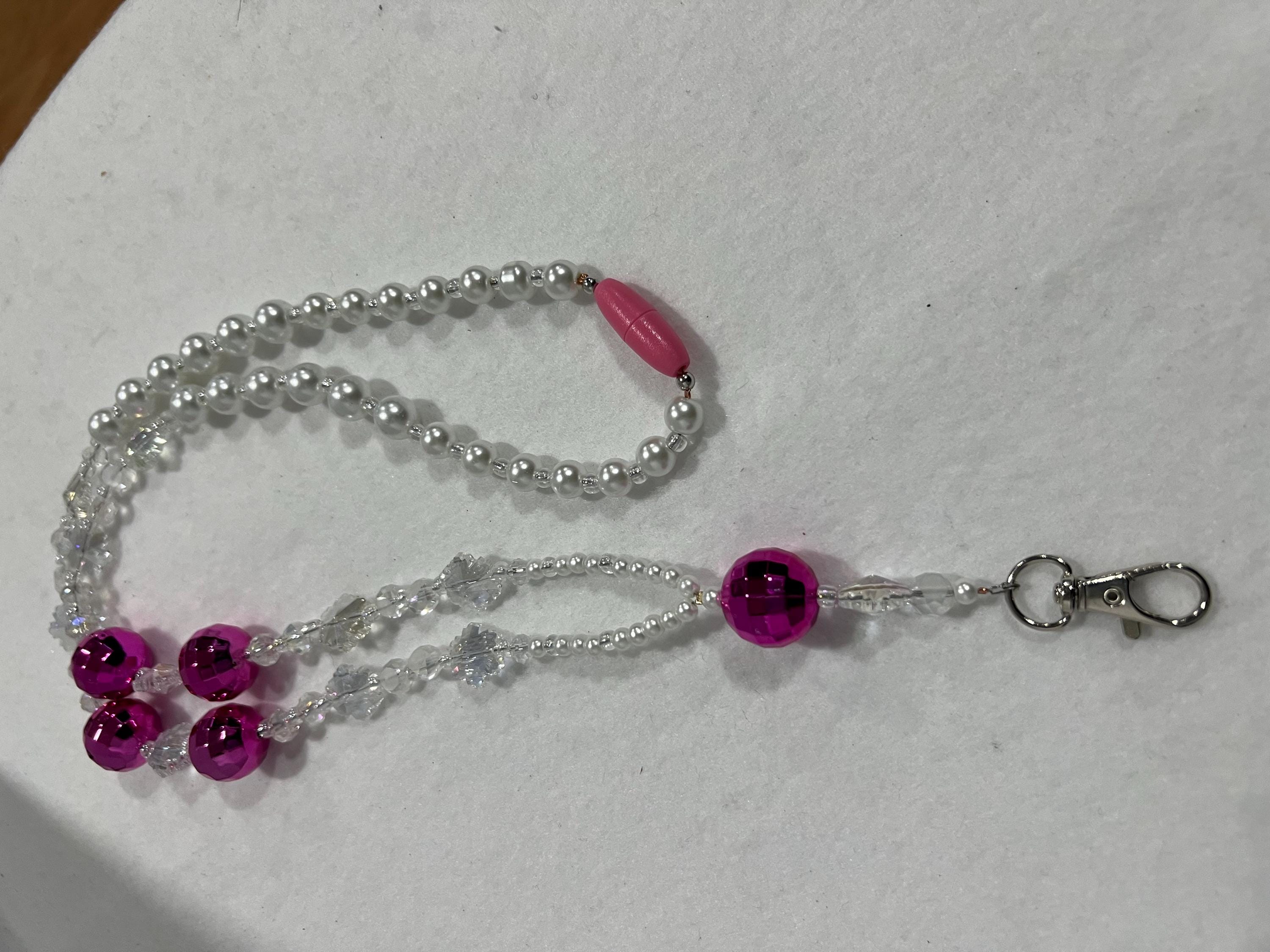 Unique One-Of-A-Kind Breakaway Lanyard - Pearl, Clear, and Fuchsia Beads with Iridescent Snowflakes and Fuchsia Ornaments