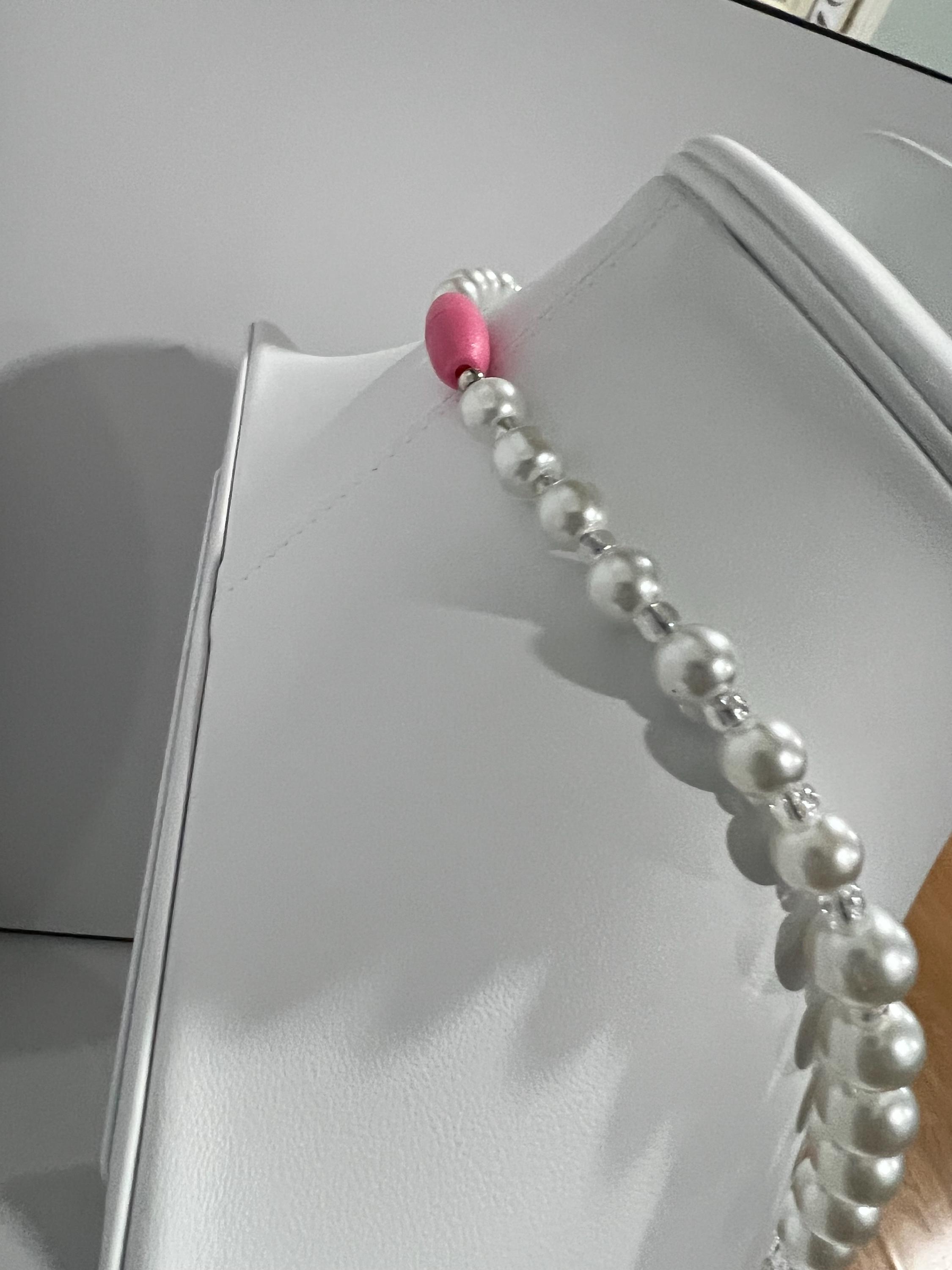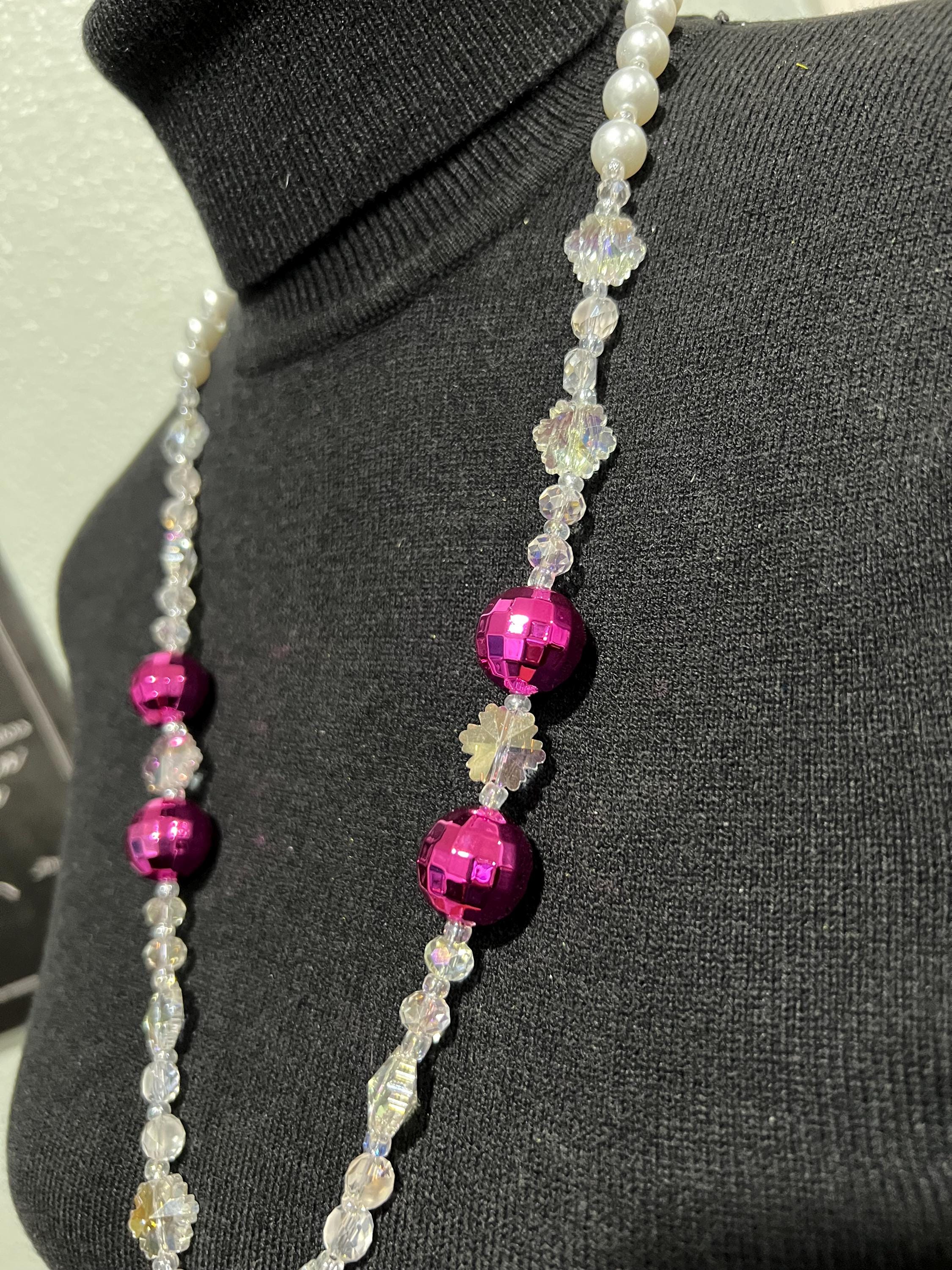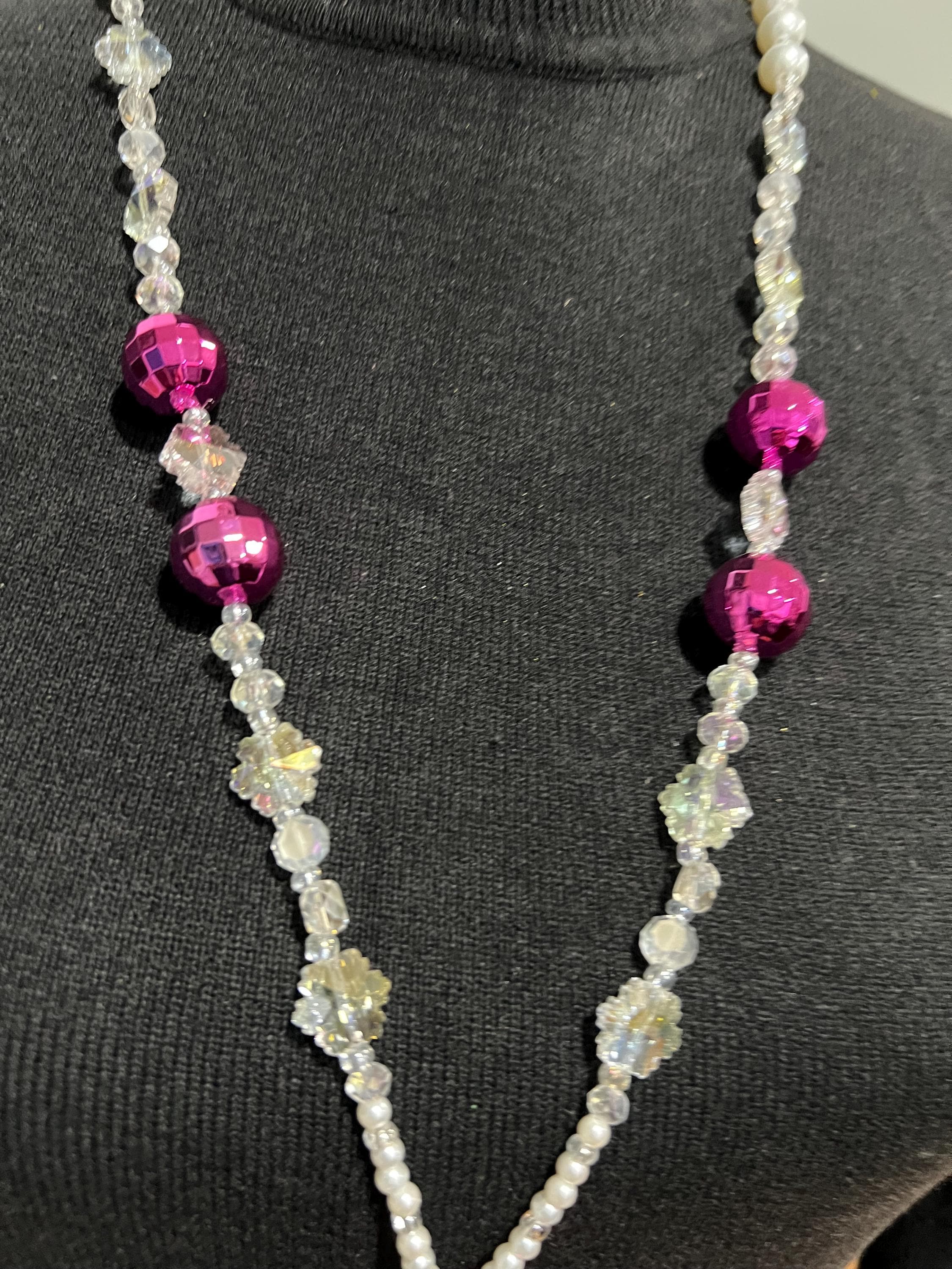 Unique One-Of-A-Kind Breakaway Lanyard - Pearl, Clear, and Fuchsia Beads with Iridescent Snowflakes and Fuchsia Ornaments