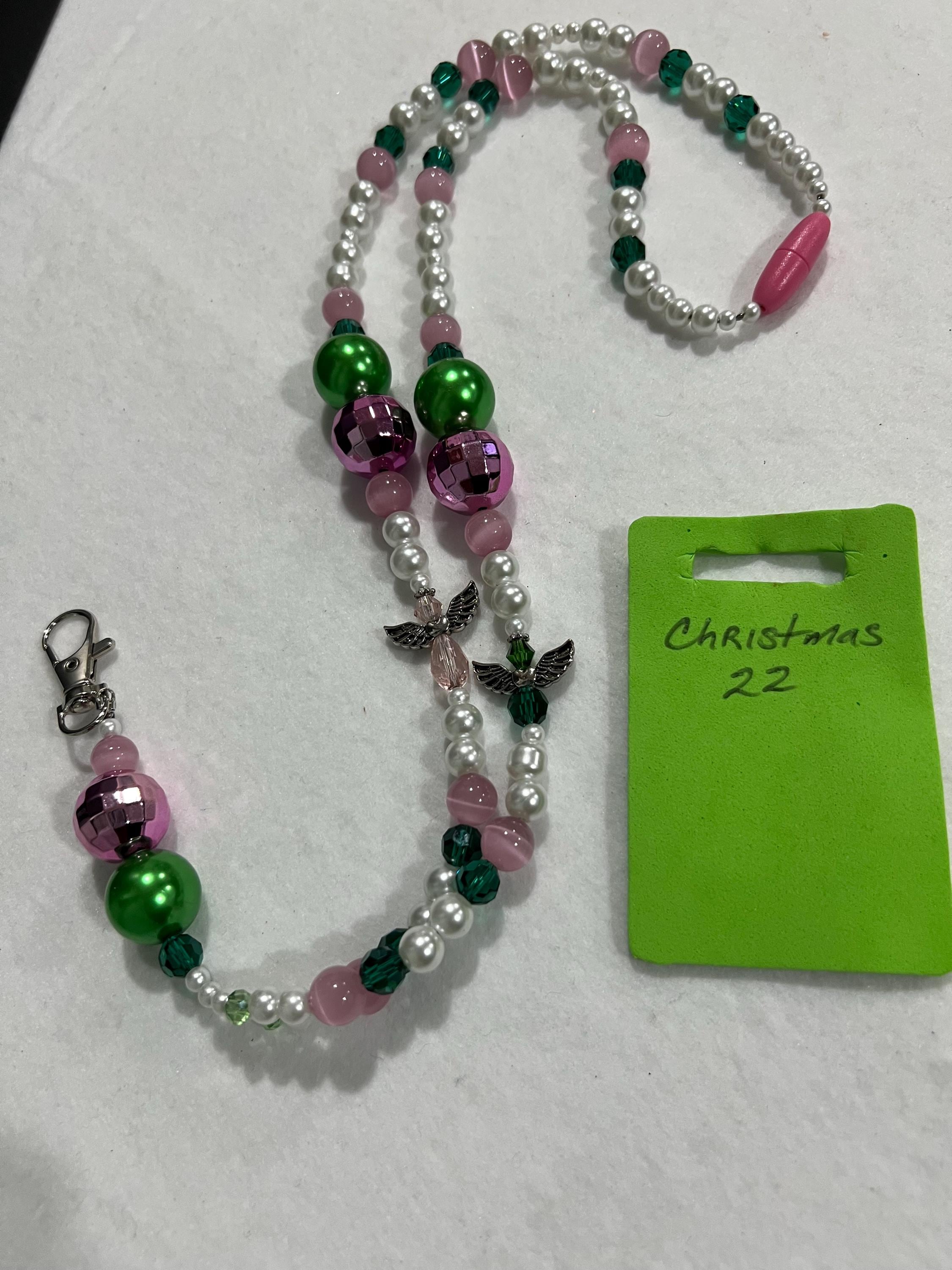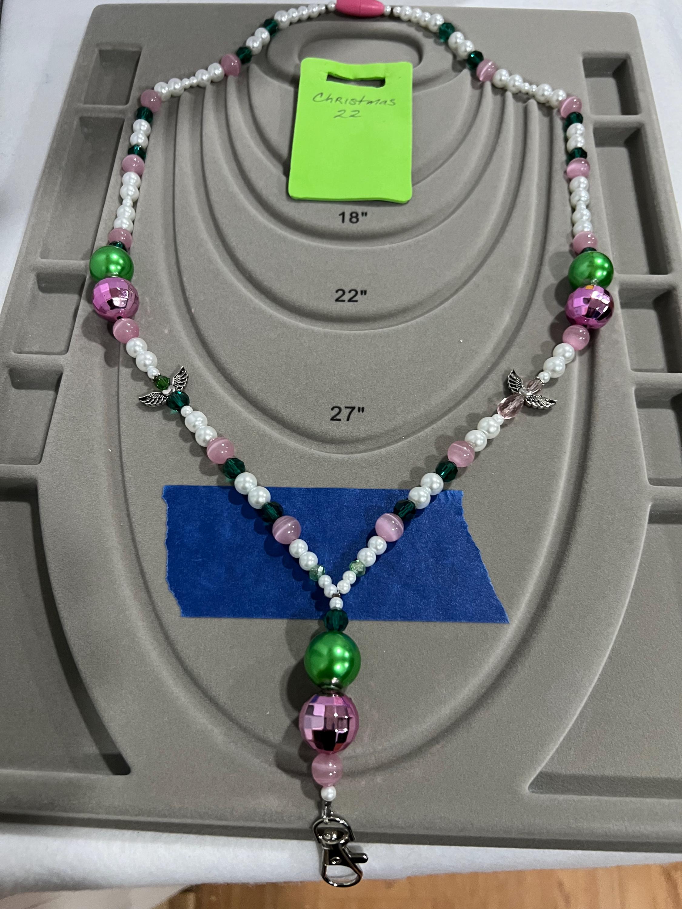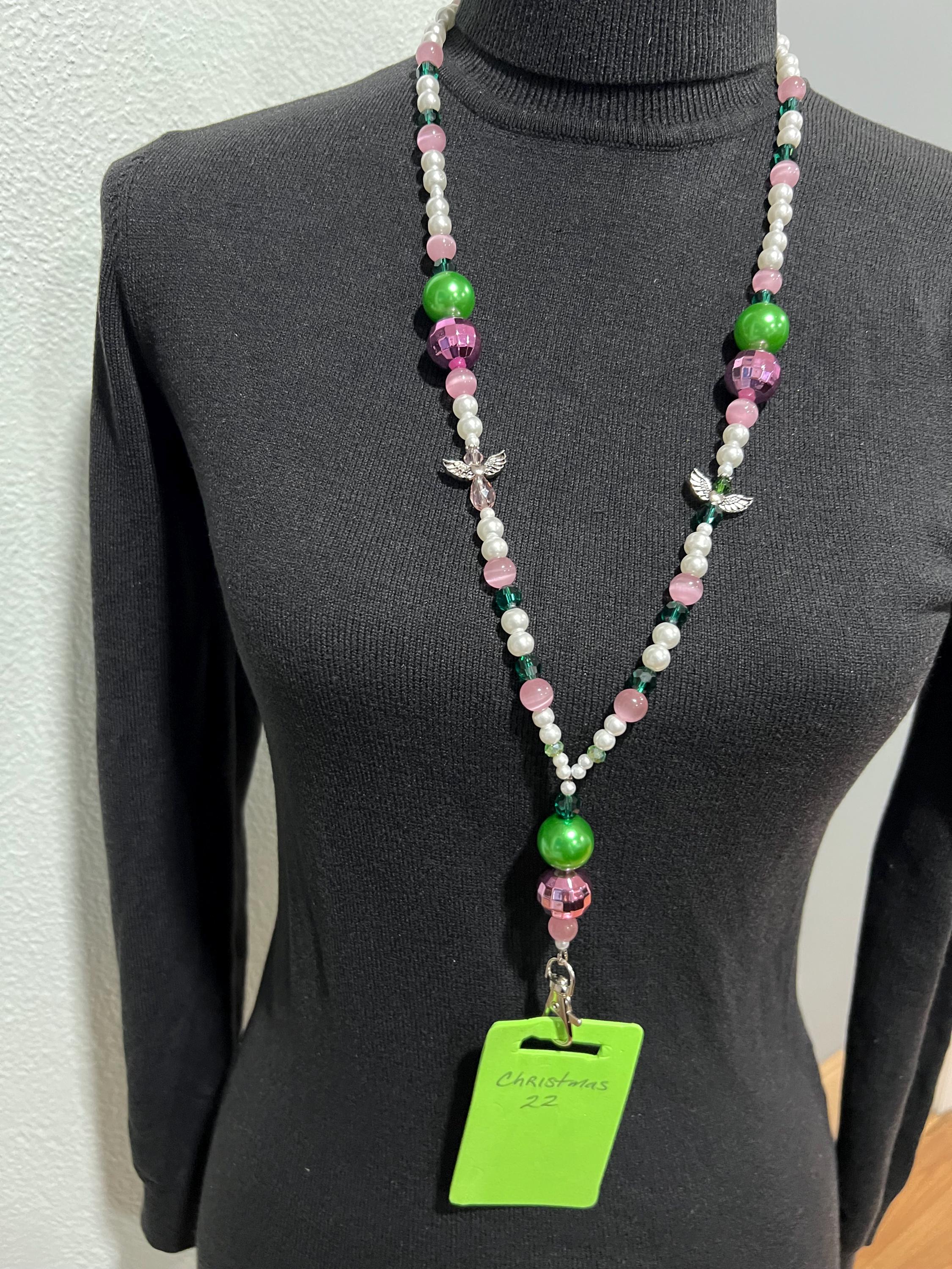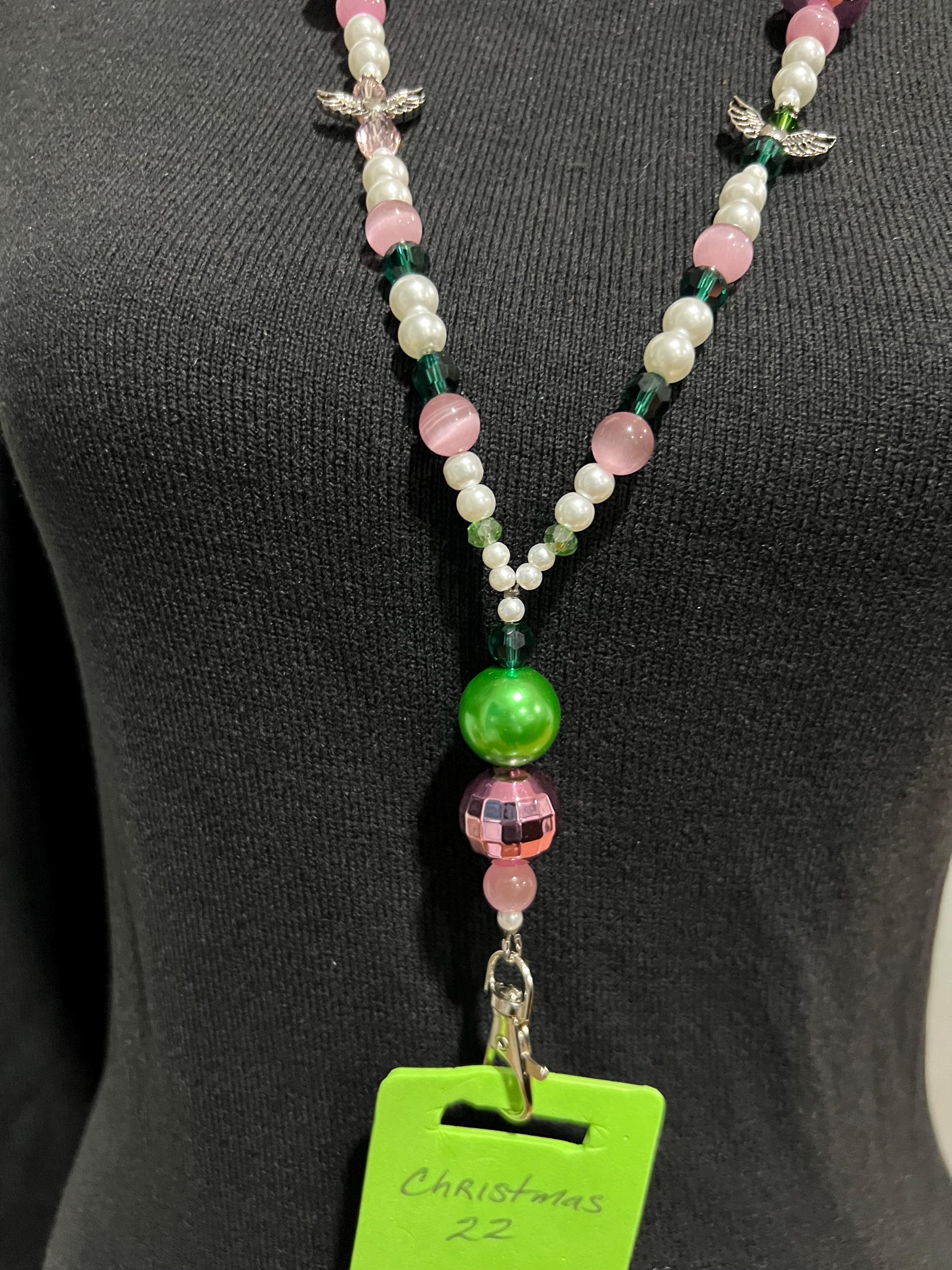 Christmas 22 - Unique One-Of-A-Kind Breakaway Lanyard - Pink, Green and White Beads with Fuchsia Ornaments and Beads To Create Angels