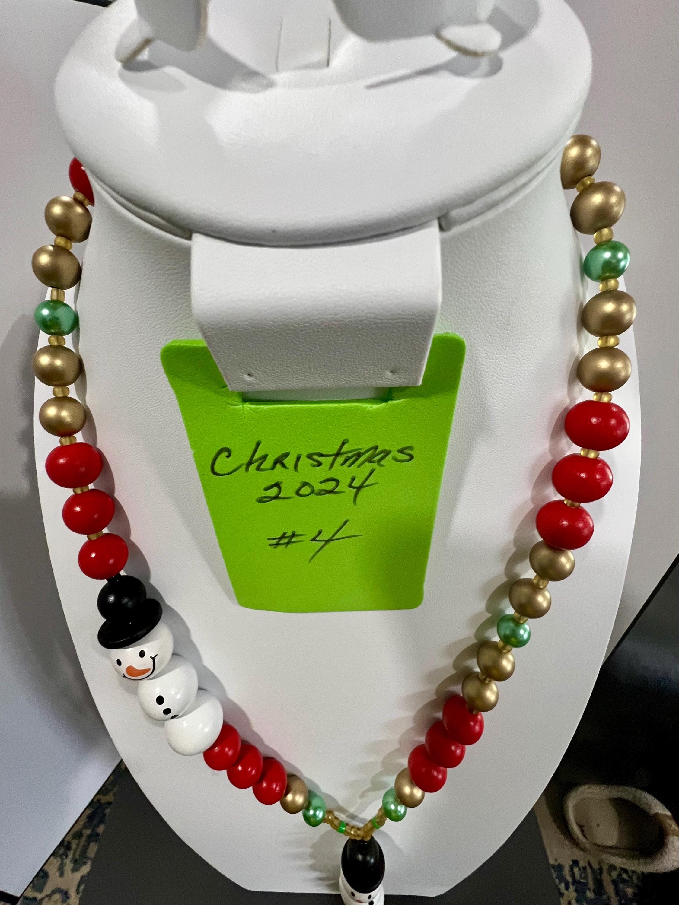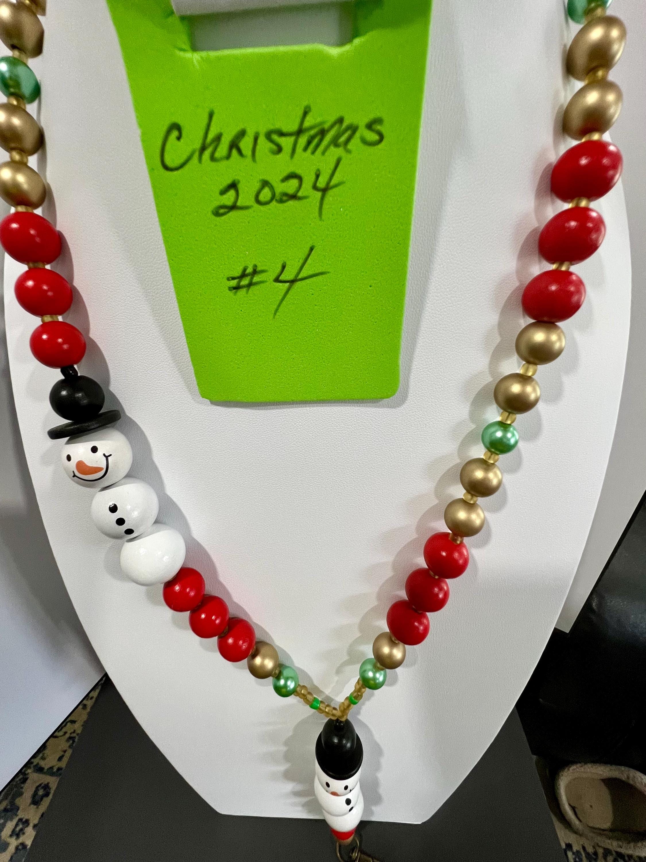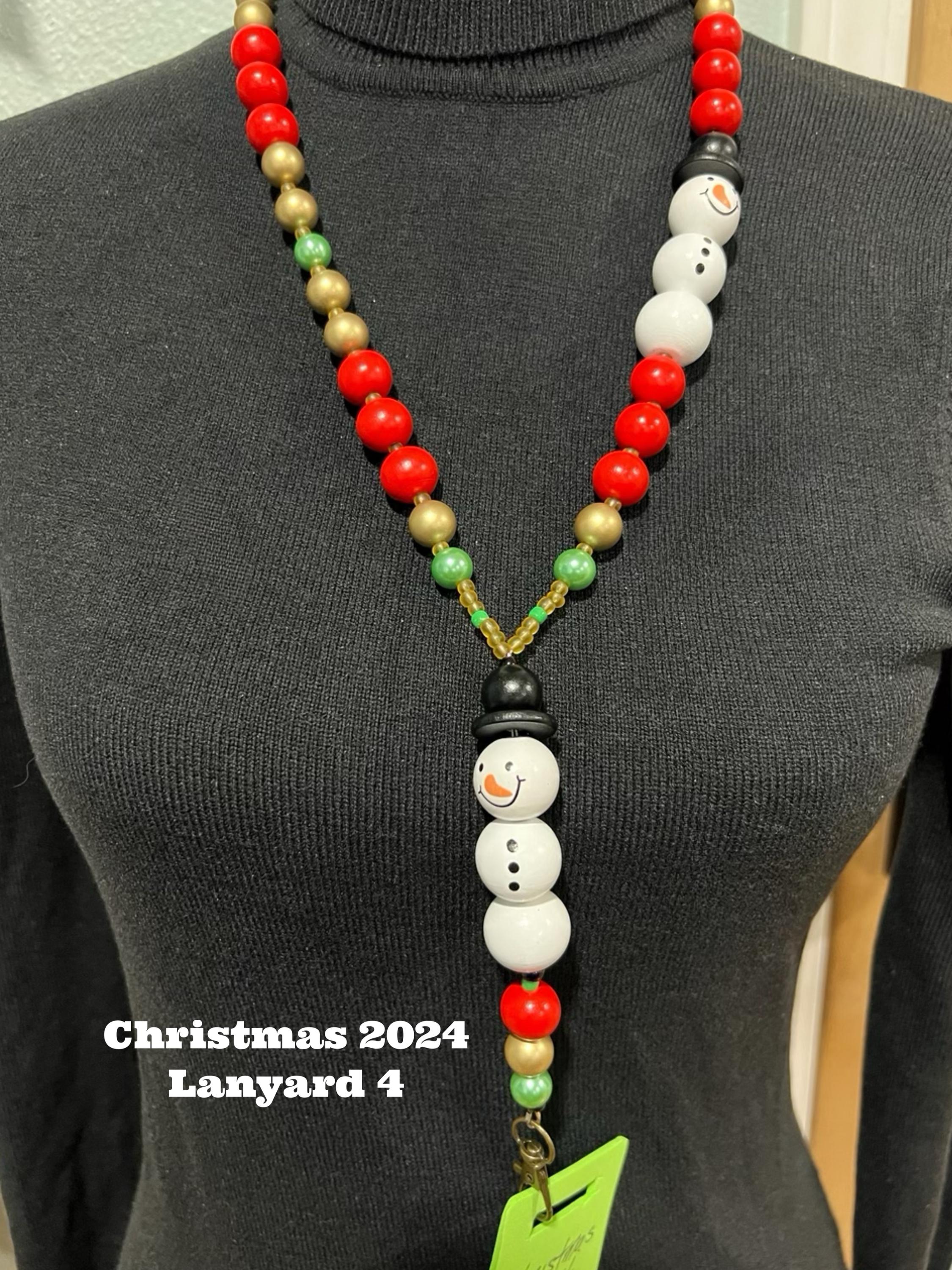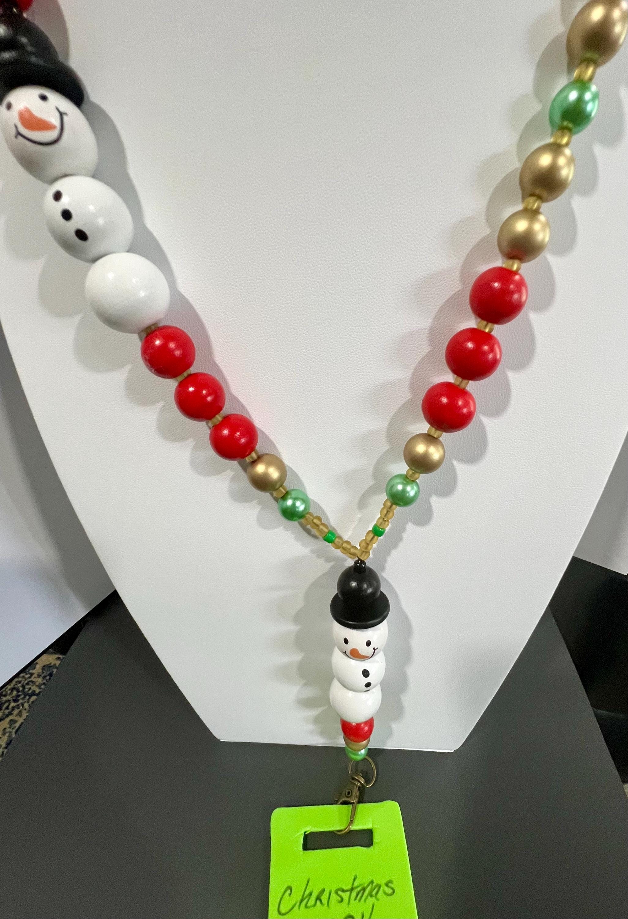 Unique One-Of-A- Kind Breakaway Lanyard - Christmas 2024 #4 - 2 Wooden Snowmen Lanyard - White, Black Red and Gold Beads With Green Accents