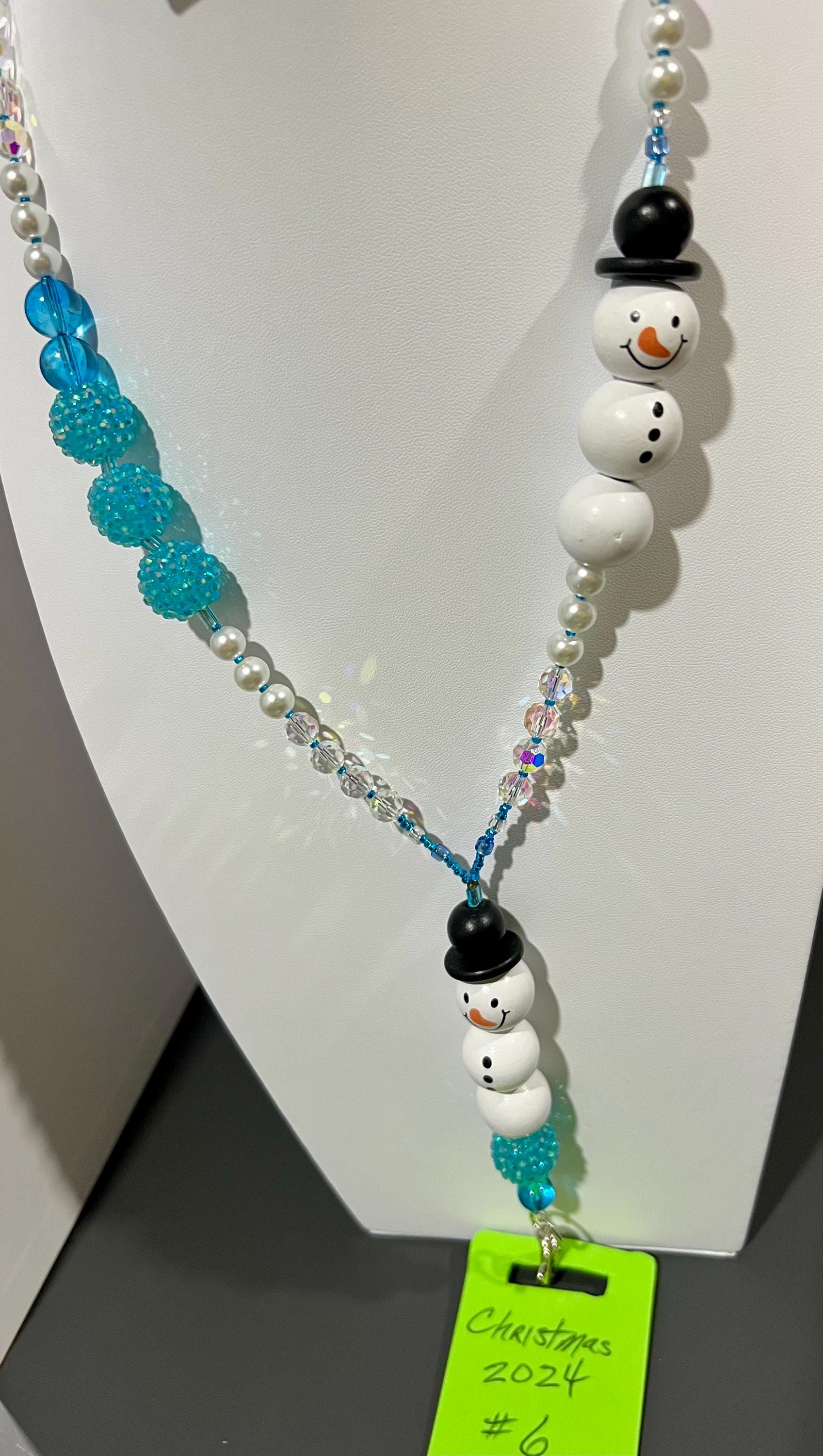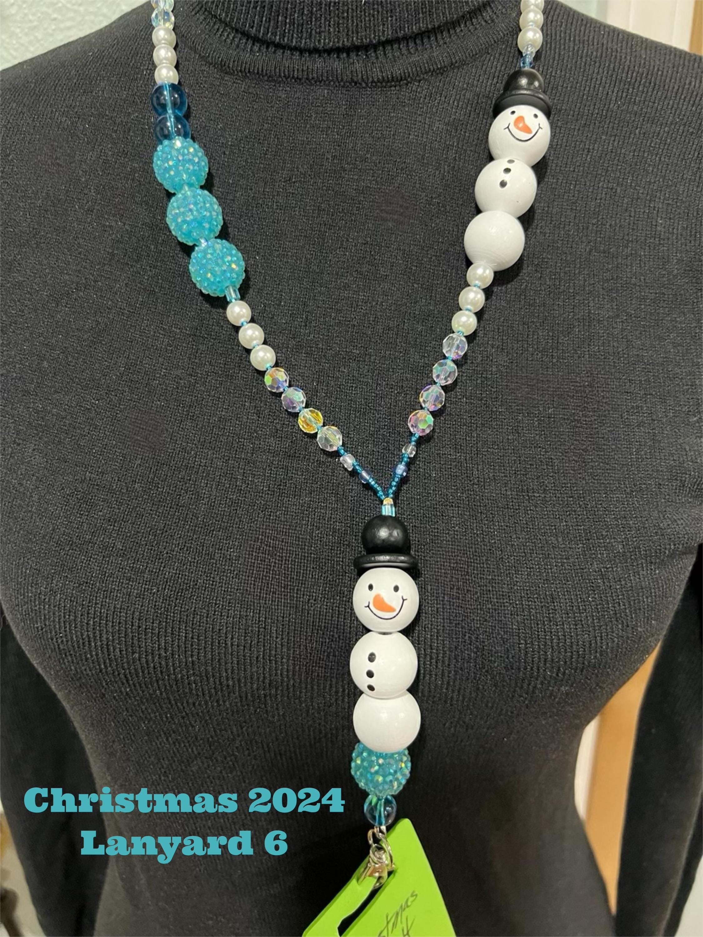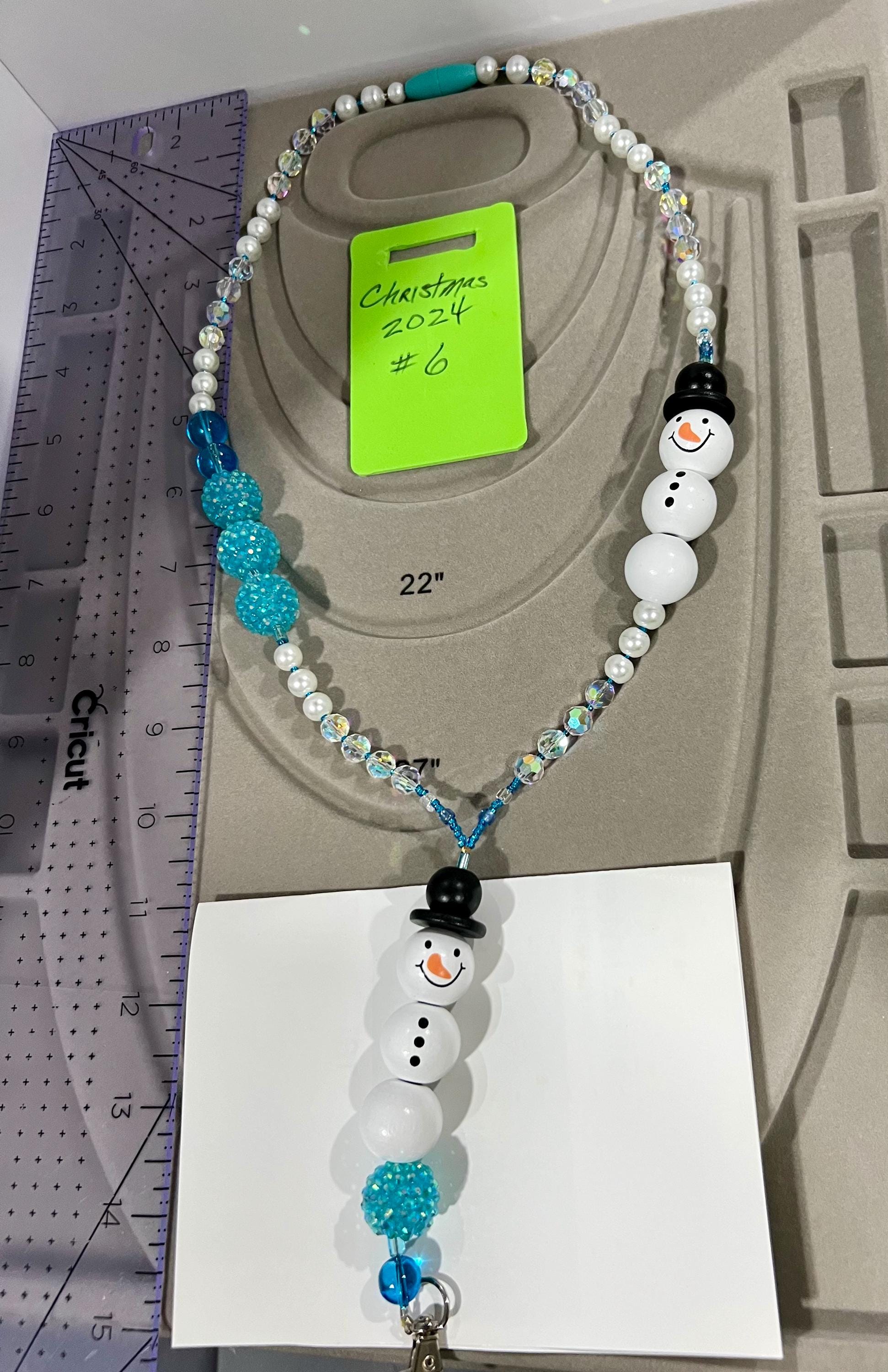 Unique One-Of-A- Kind Breakaway Lanyard - Christmas 2024 #6 - 2 Wooden Snowmen Bead Lanyard With White, Teal and Iridescent Accent Beads