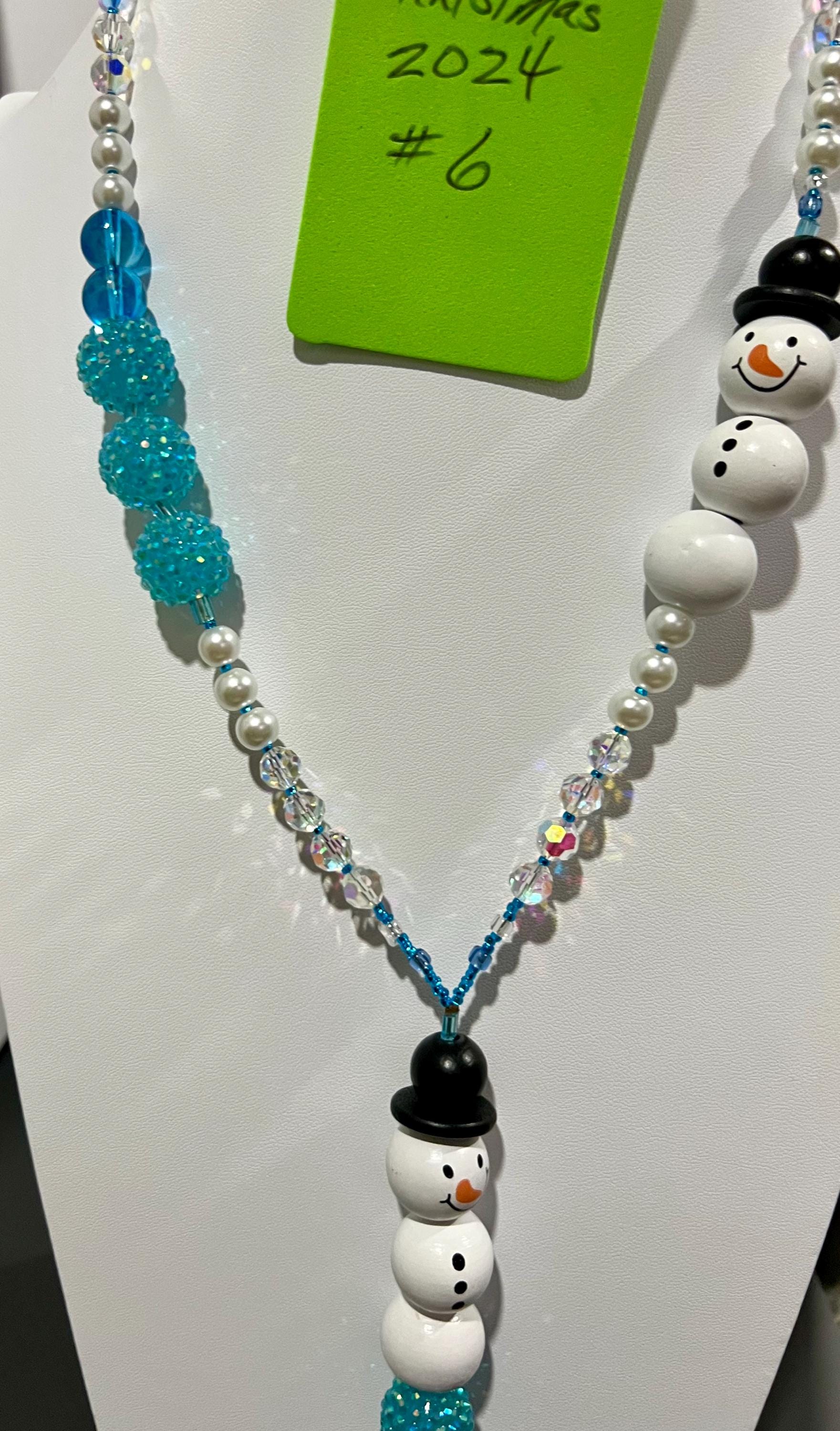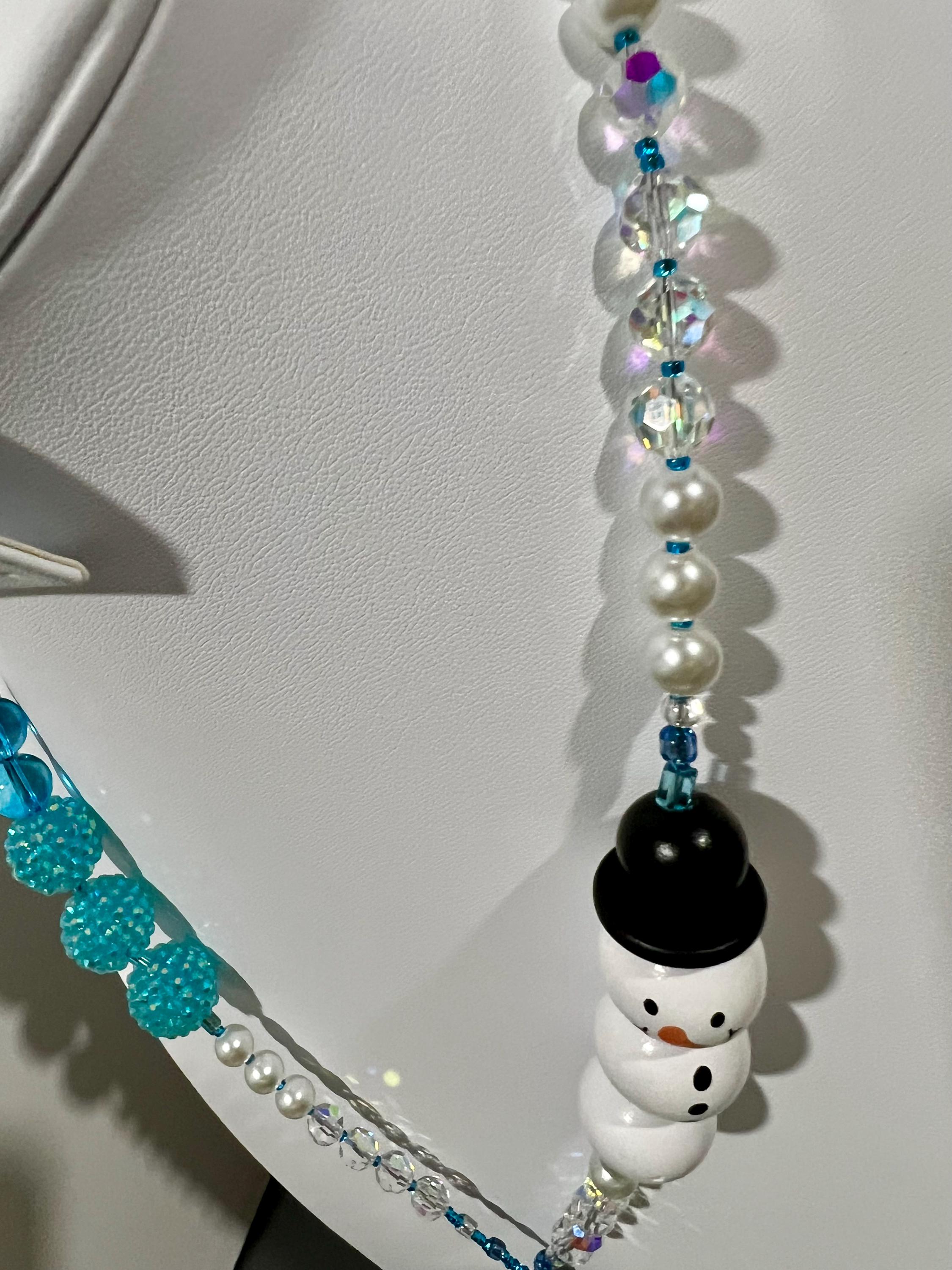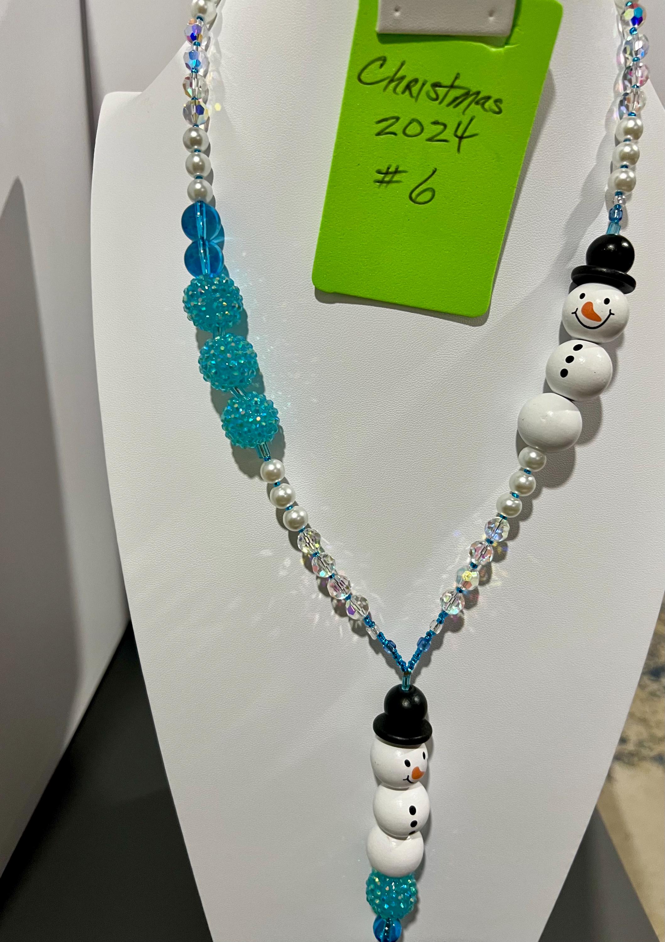Unique One-Of-A- Kind Breakaway Lanyard - Christmas 2024 #6 - 2 Wooden Snowmen Bead Lanyard With White, Teal and Iridescent Accent Beads
