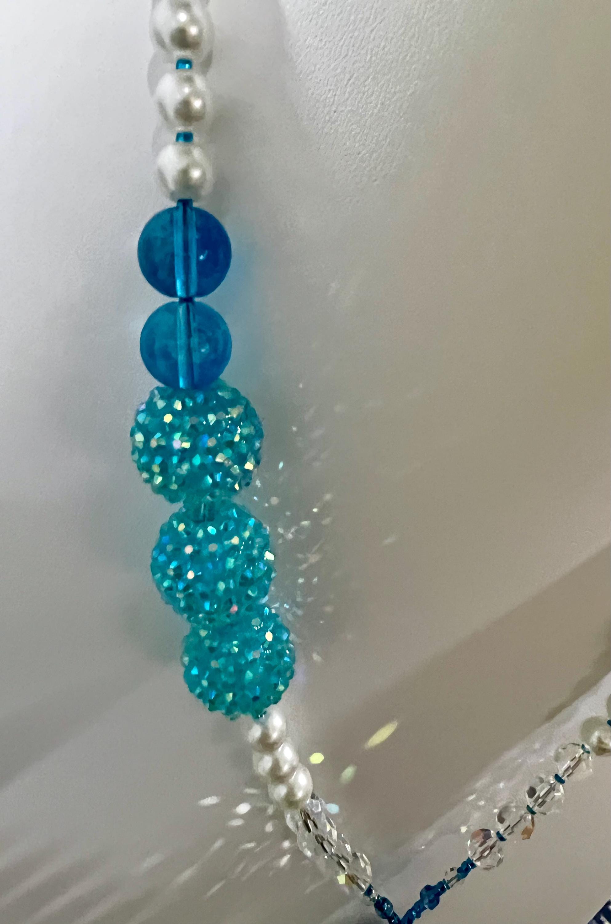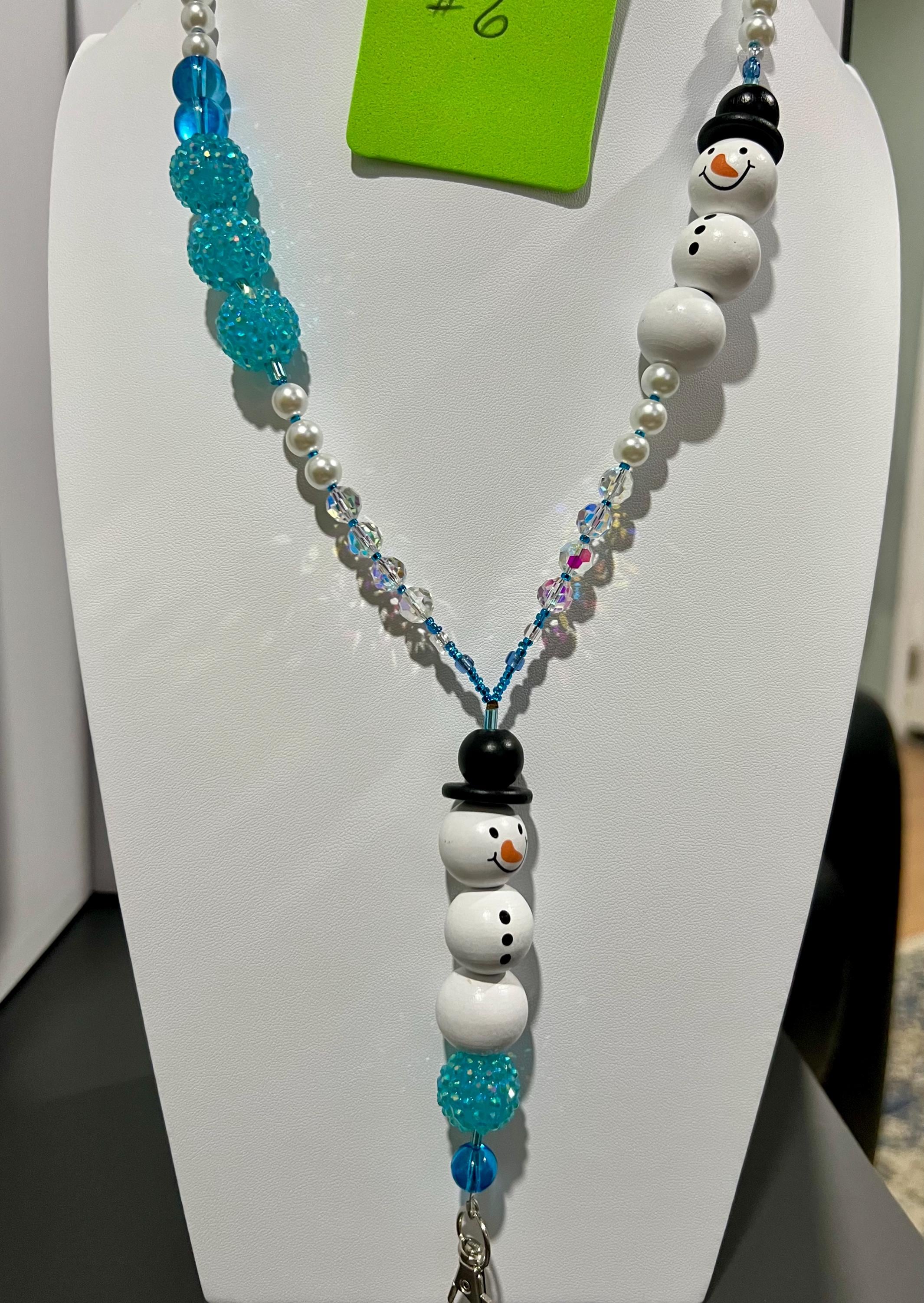 One of A Kind -This Lanyard was created with white and black wood beads to resemble 2 Snowmen. It also includes white, teal and iridescent beads.