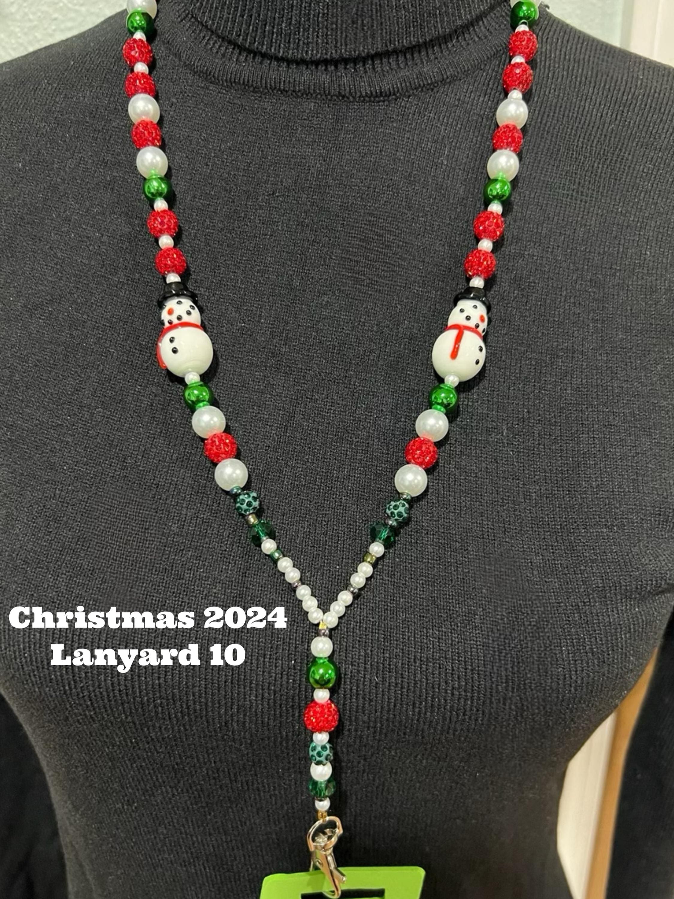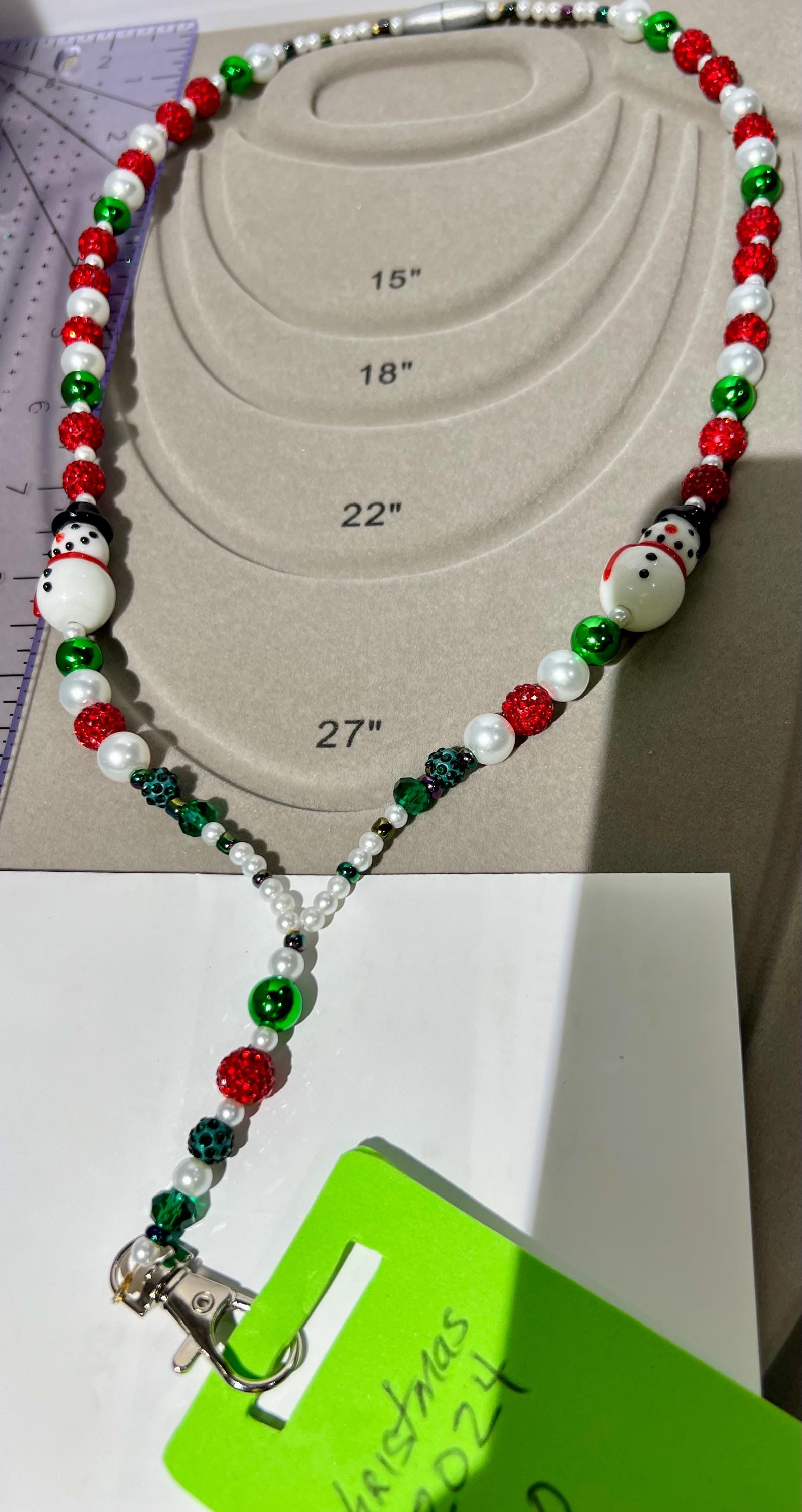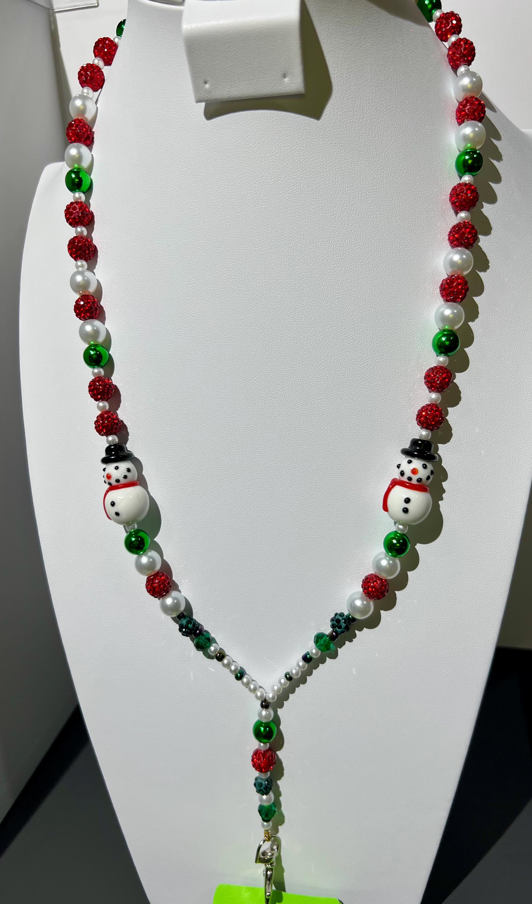 One of A Kind -Red, White & Green Beads with 2 Ceramic Painted Snowmen. The lanyard also has beads that are red and green to resemble ornaments. Additional beads are green, a coated pearl color and black and green metal.