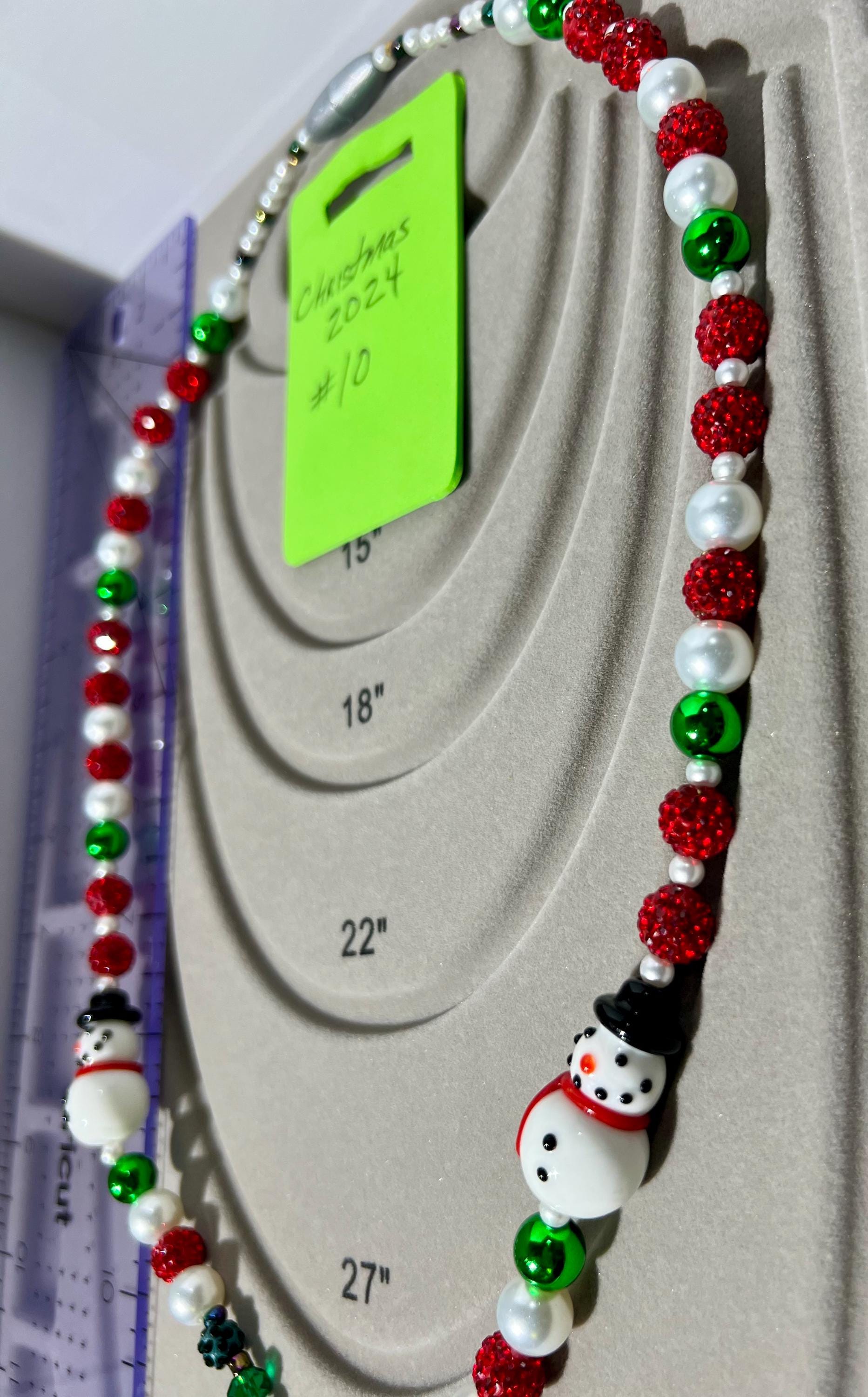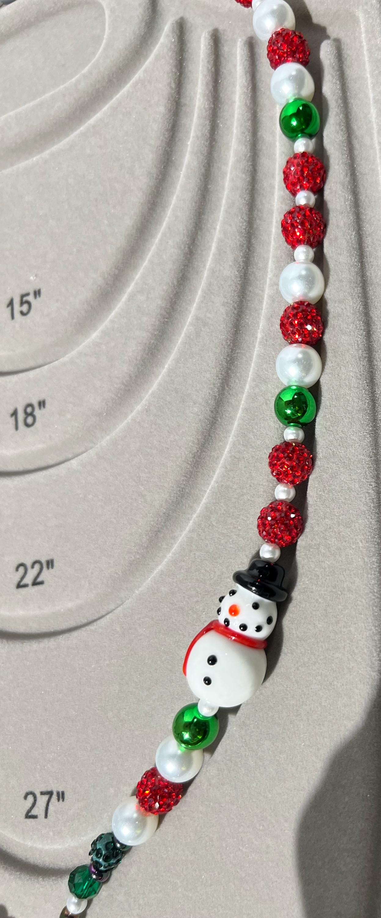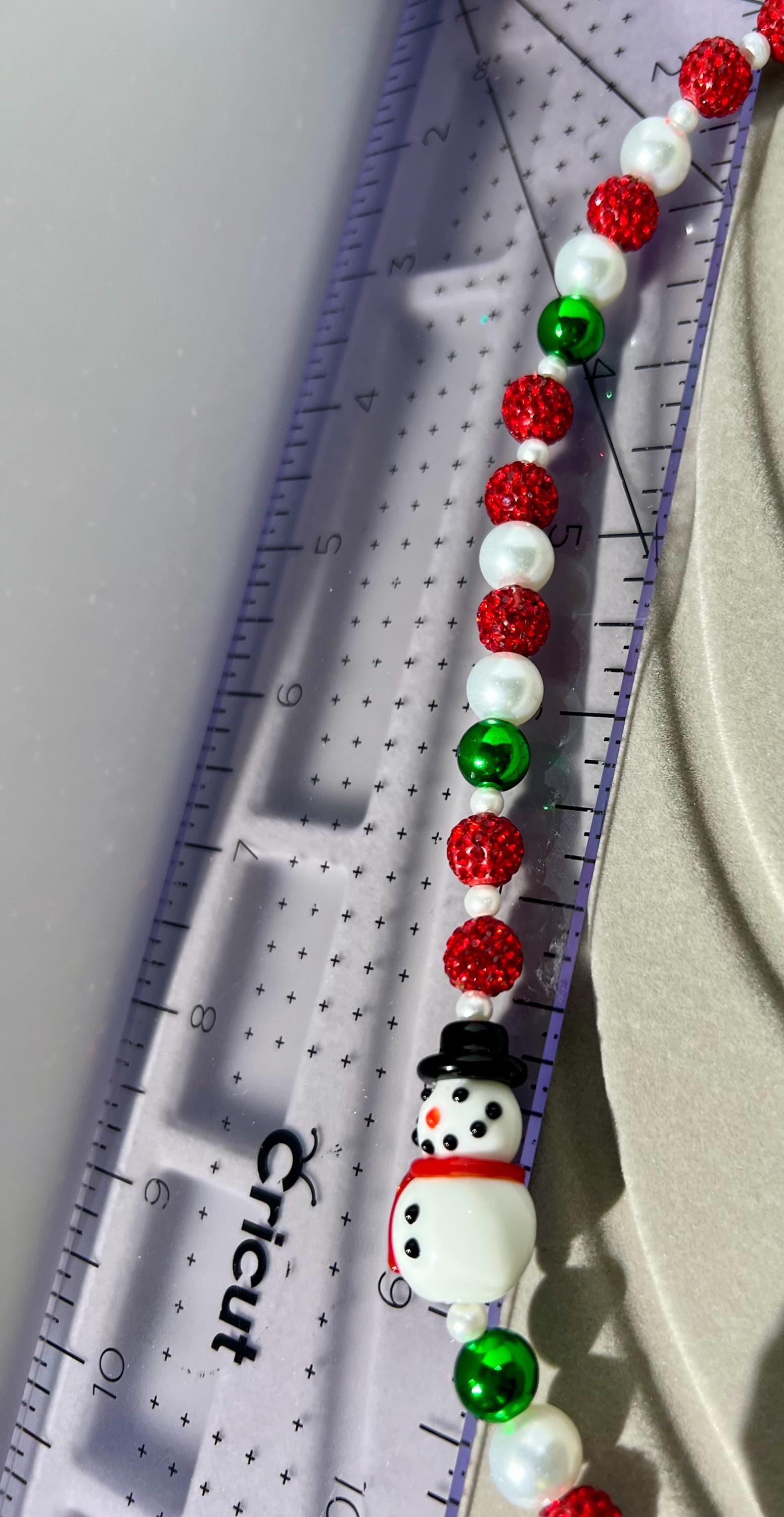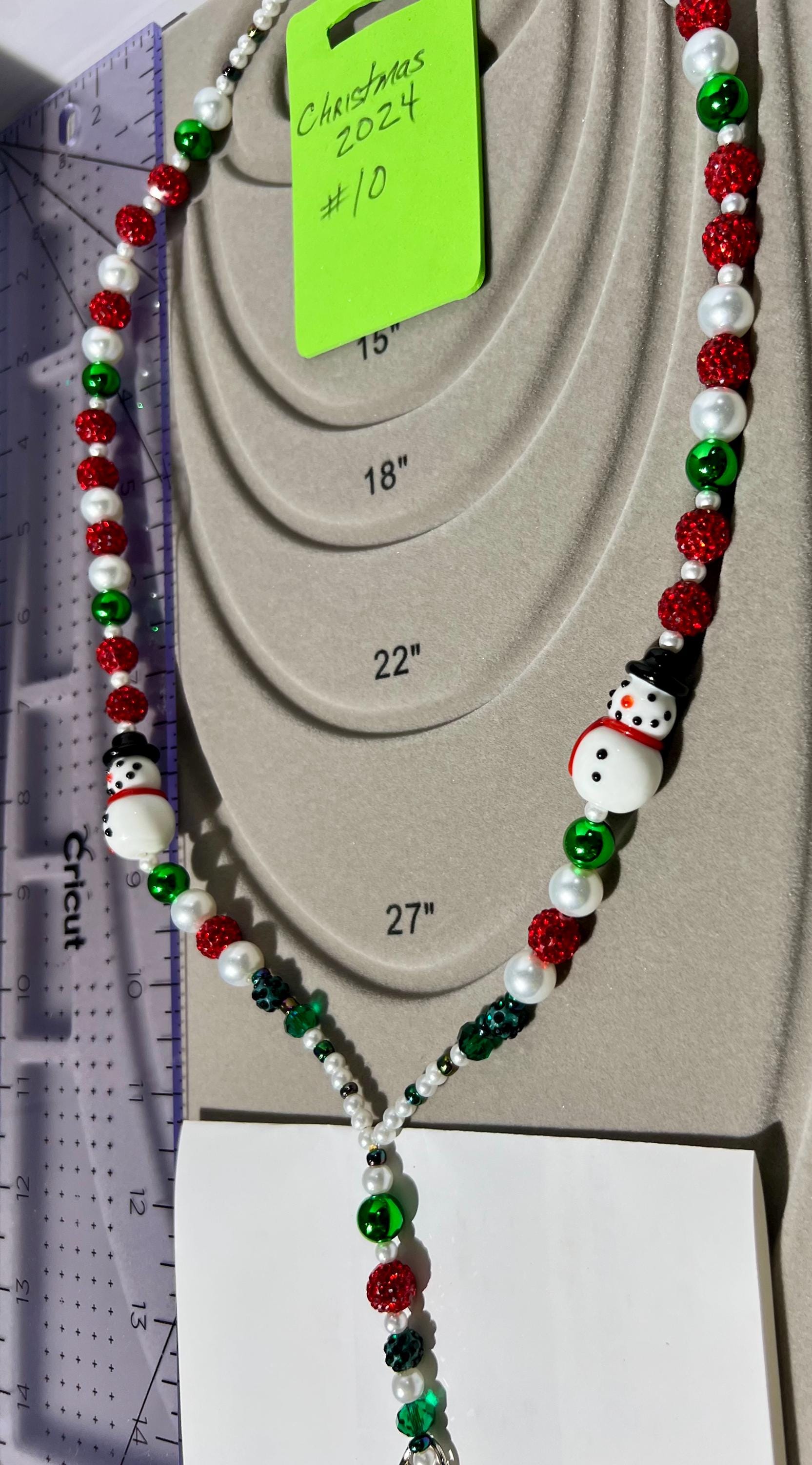 One of A Kind -Red, White & Green Beads with 2 Ceramic Painted Snowmen. The lanyard also has beads that are red and green to resemble ornaments. Additional beads are green, a coated pearl color and black and green metal.