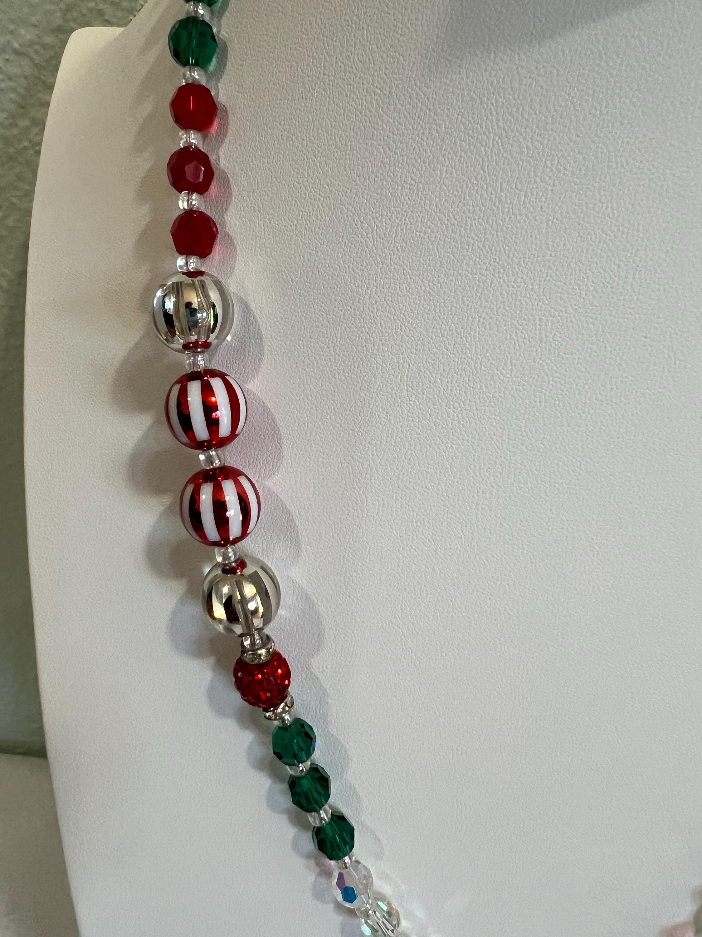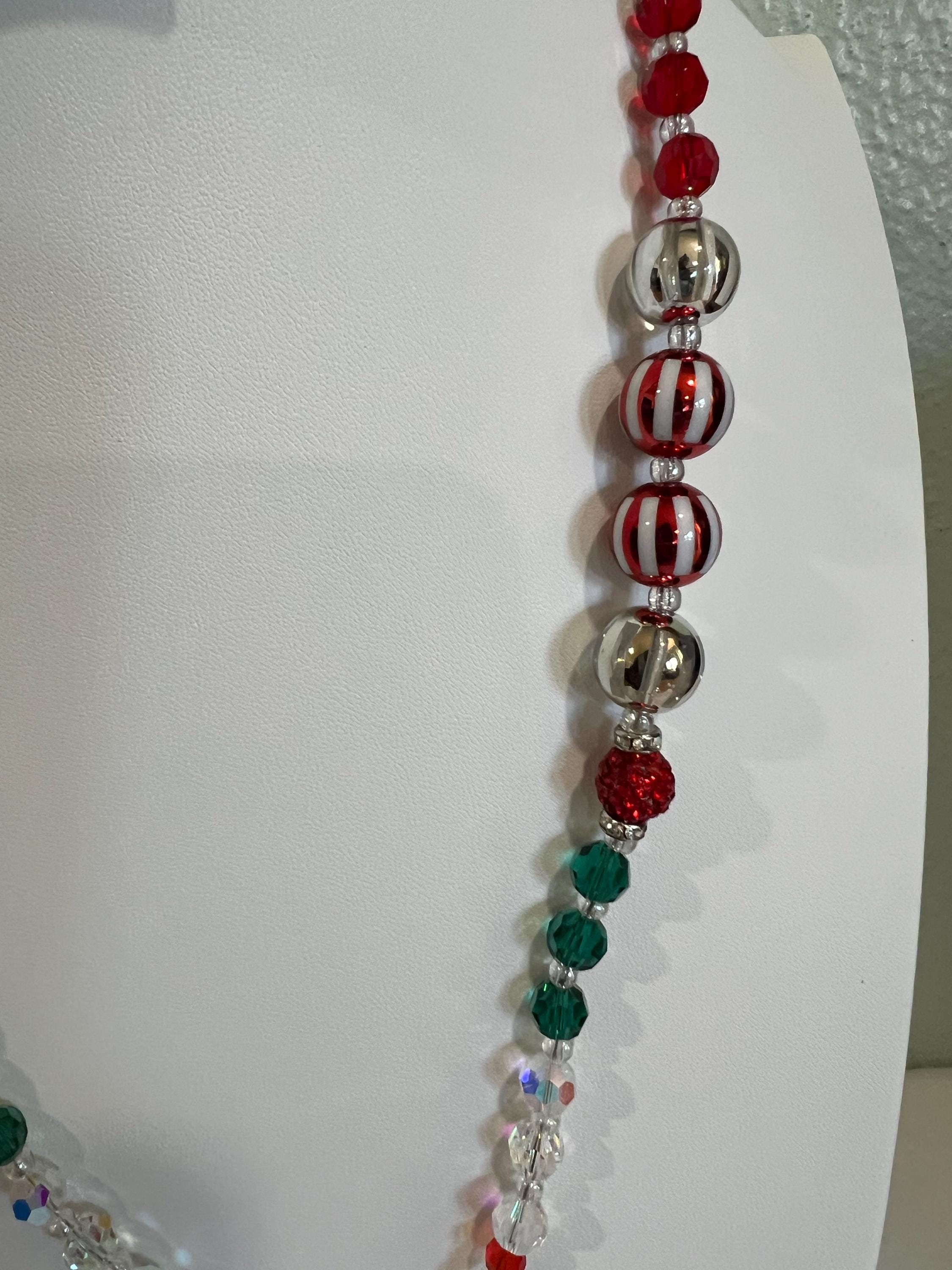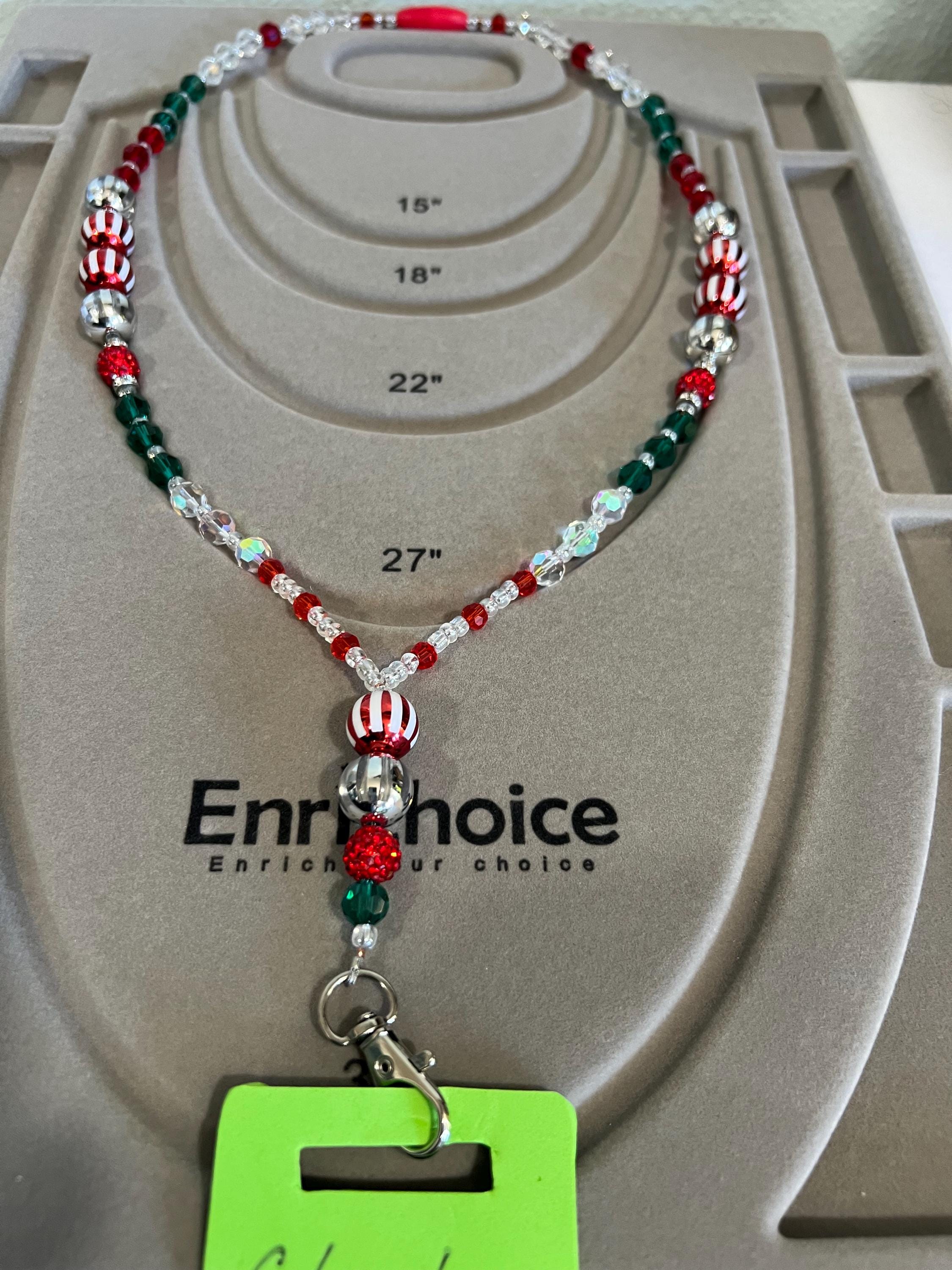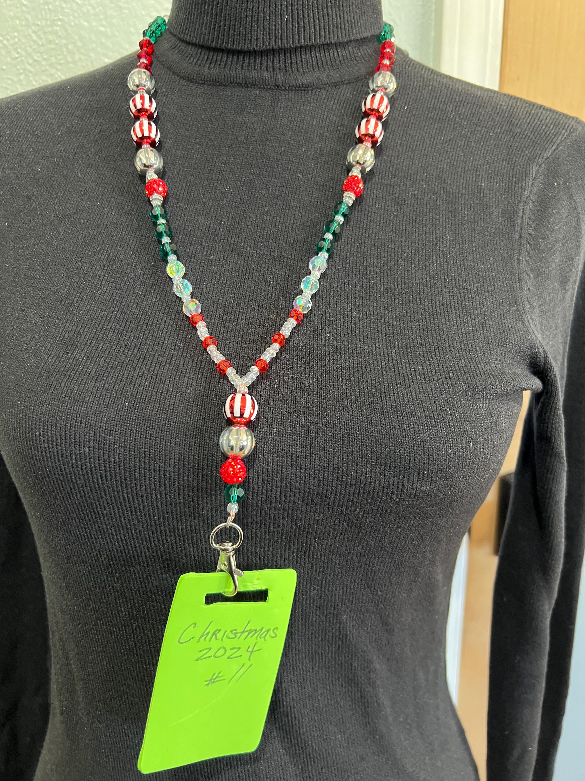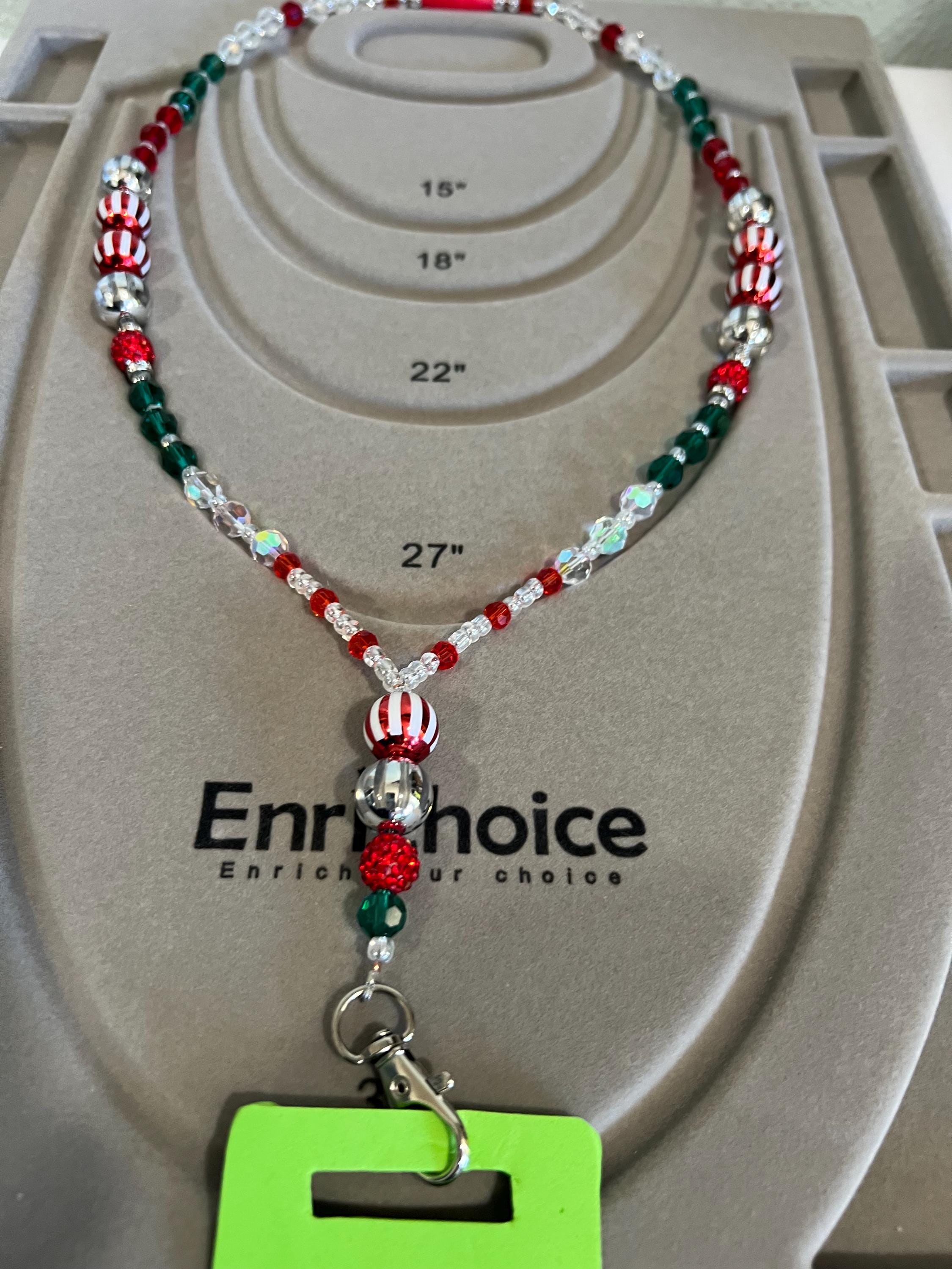 Unique One-Of-A- Kind Breakaway Lanyard - Christmas 2024 #11 - Red, White, Green, Silver and Clear Beads to resemble Christmas Ornaments