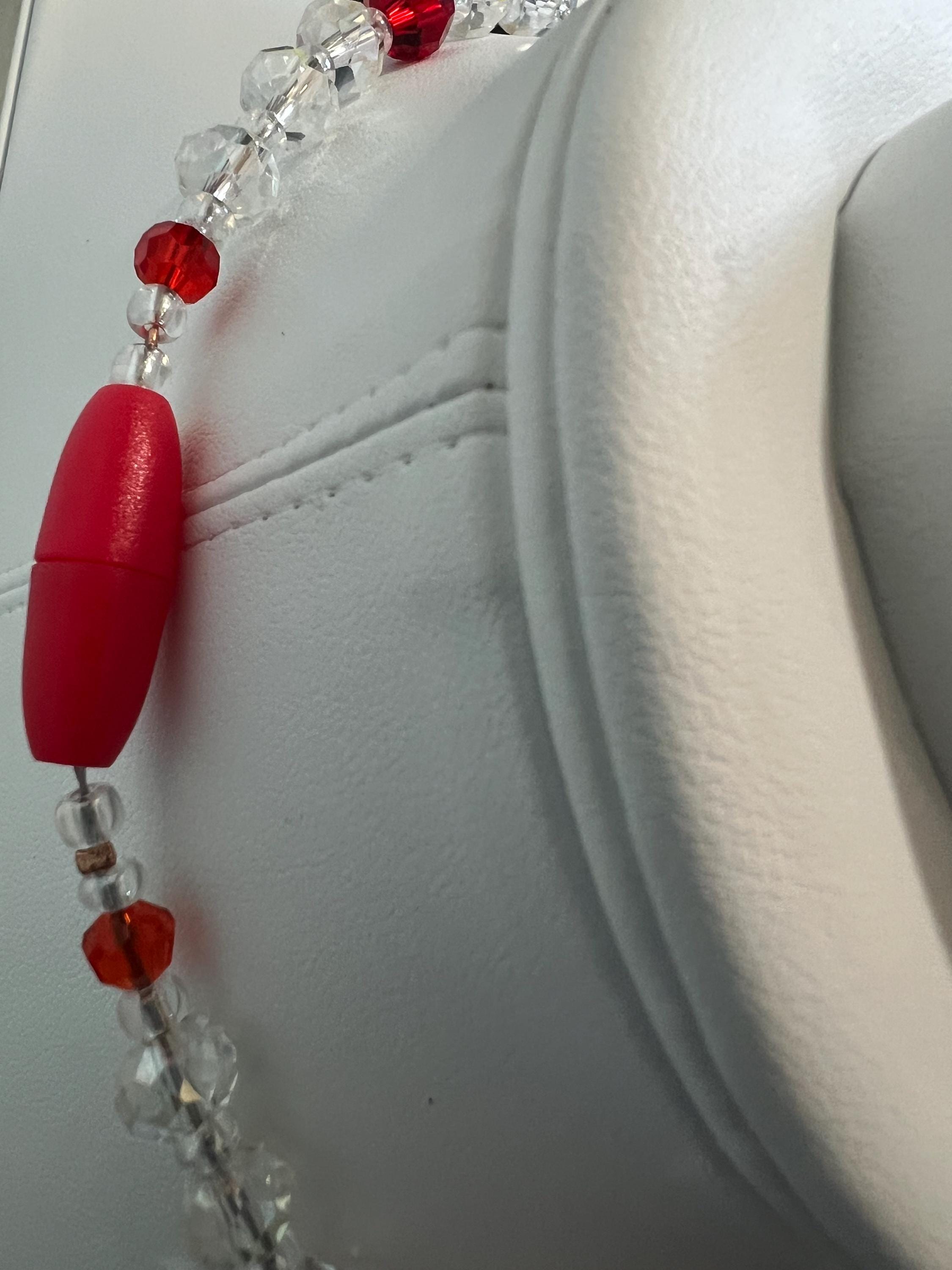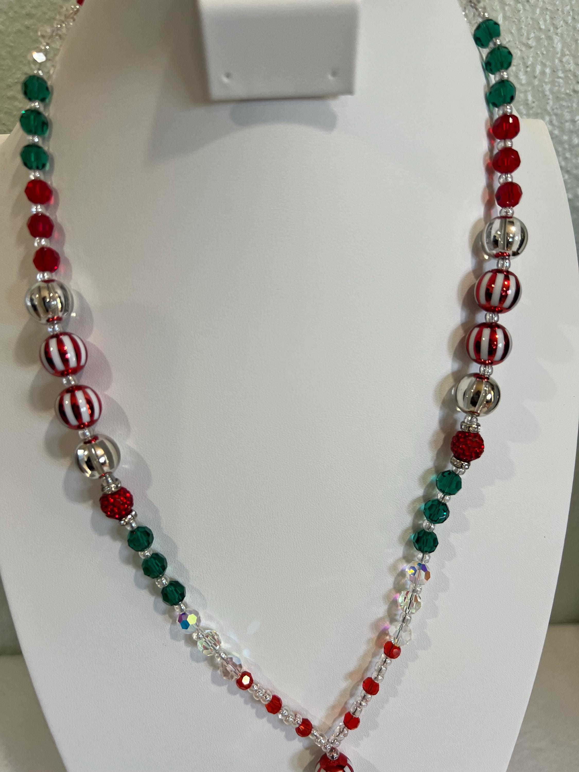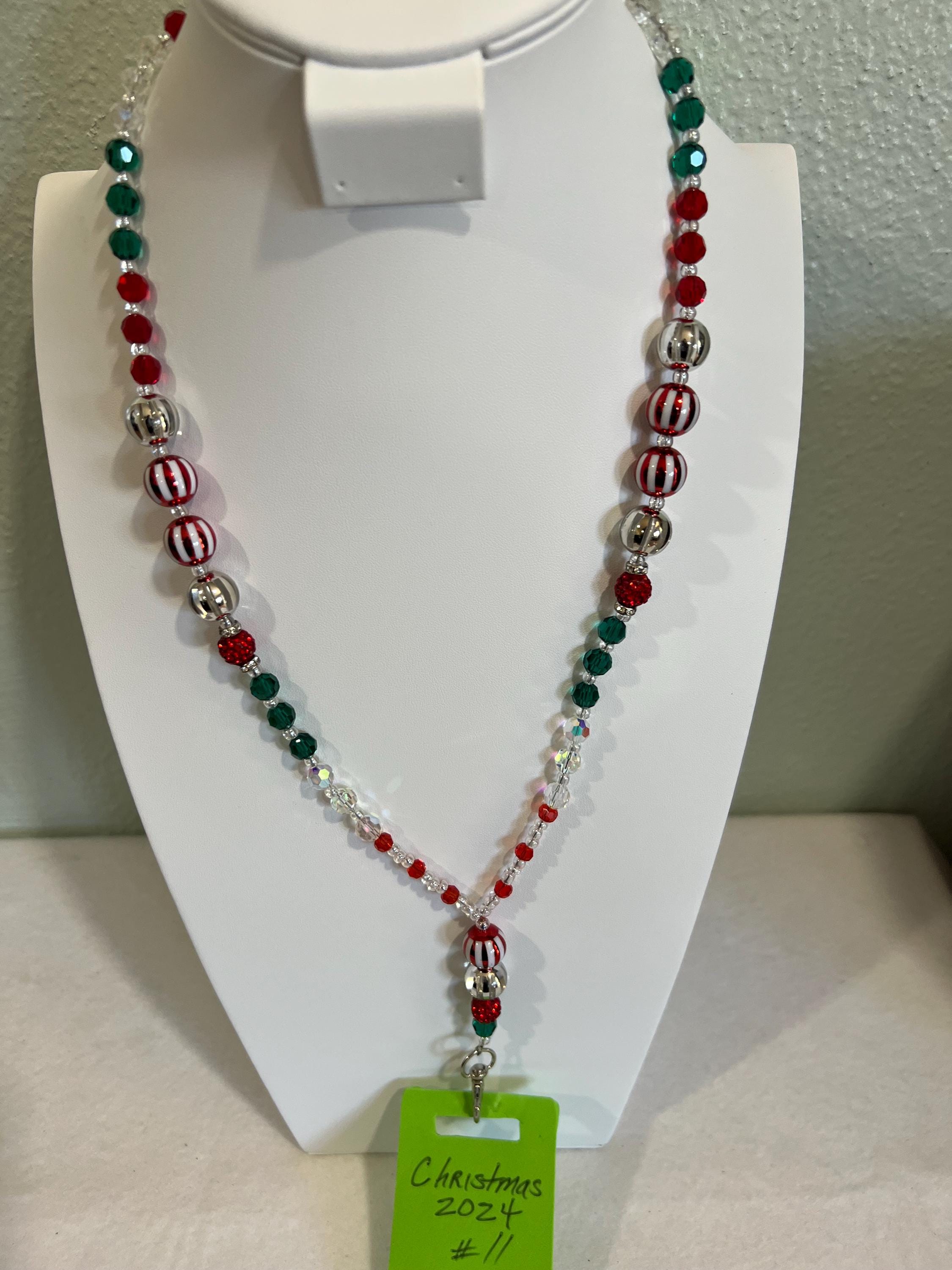 Unique One-Of-A- Kind Breakaway Lanyard - Christmas 2024 #11 - Red, White, Green and Clear Beads to resemble Christmas Ornaments - Additional beads are green, a coated pearl color and black and green metal.