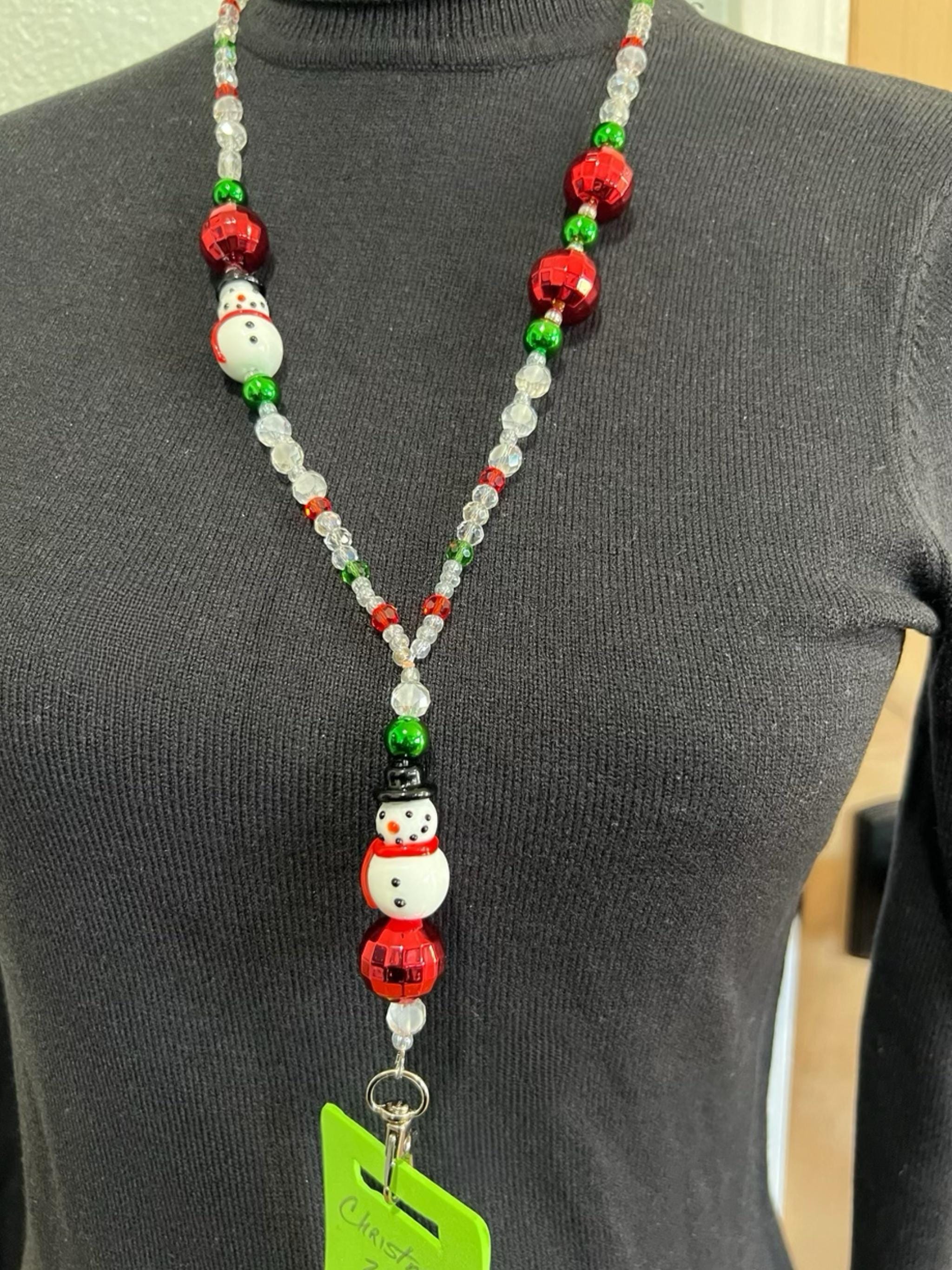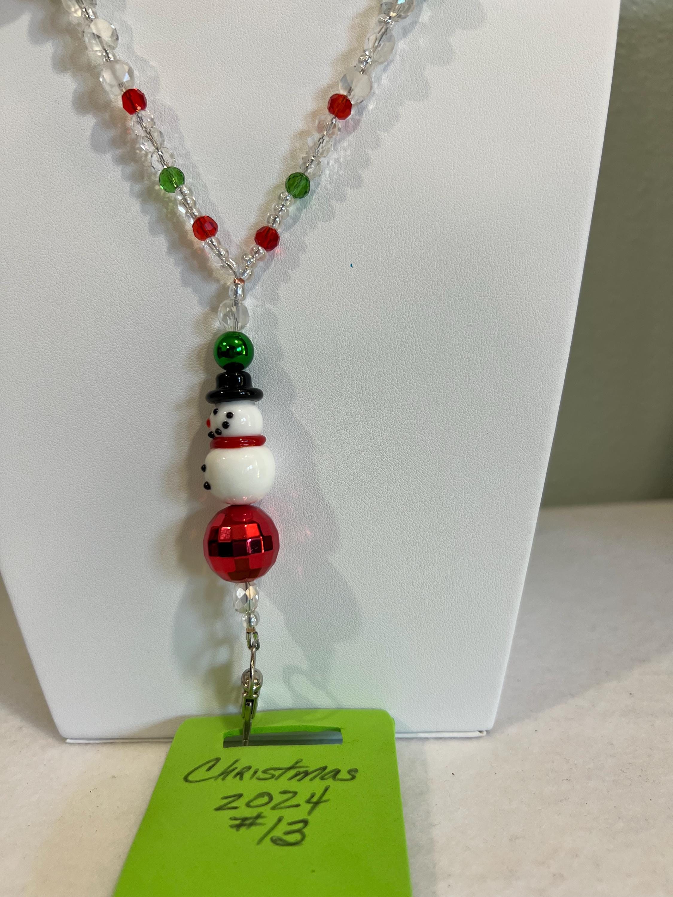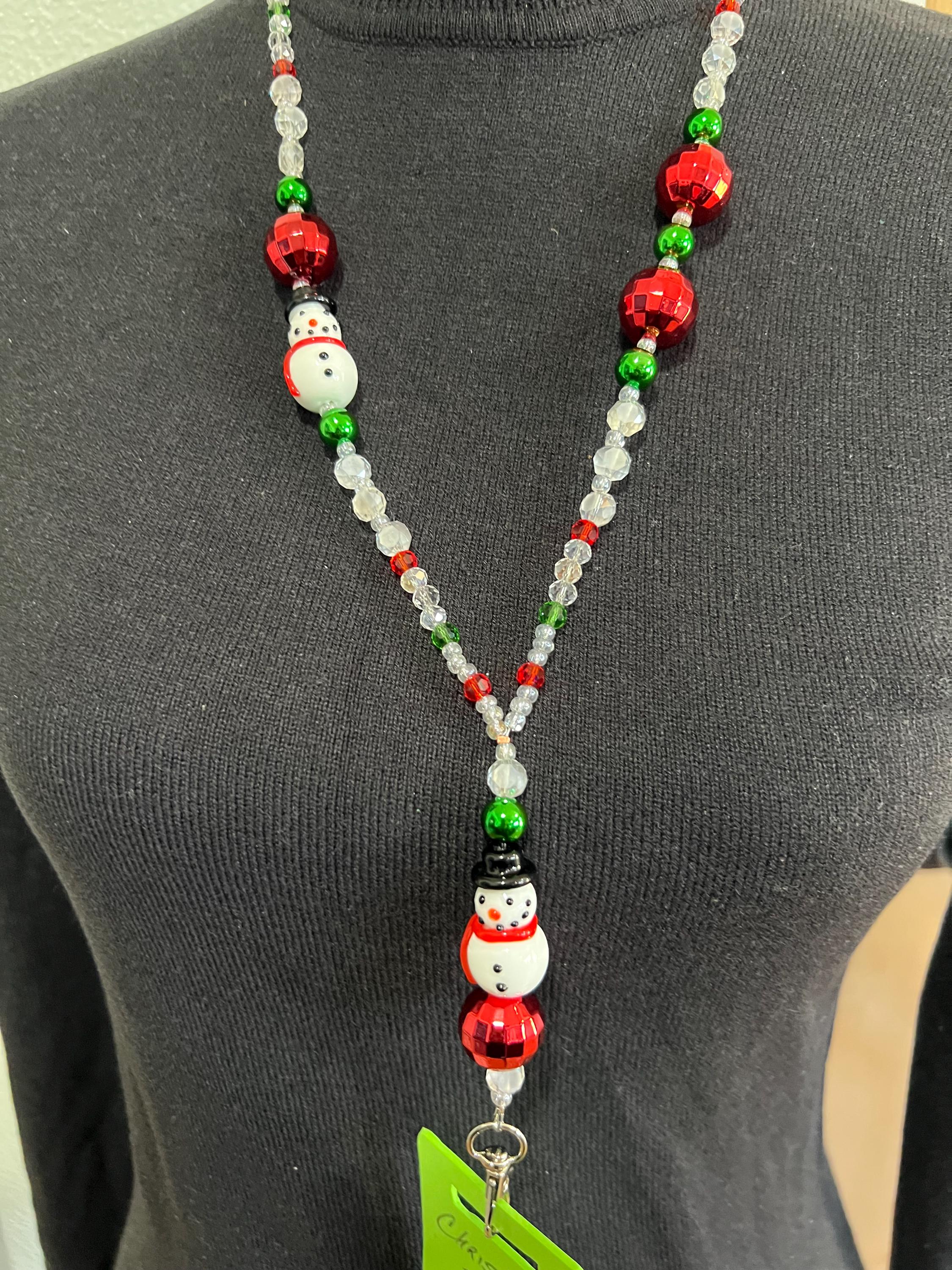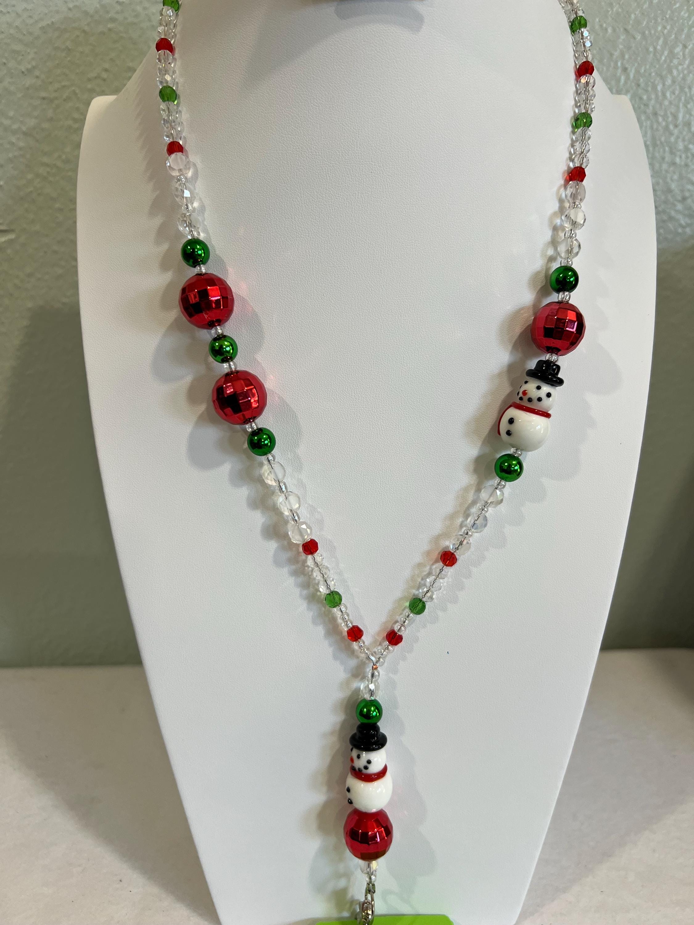 Unique One-Of-A- Kind Breakaway Lanyard - Christmas 2024 #13- Red, Green, Iridescent and Clear Beads with 2 Ceramic Snowmen Focal Beads