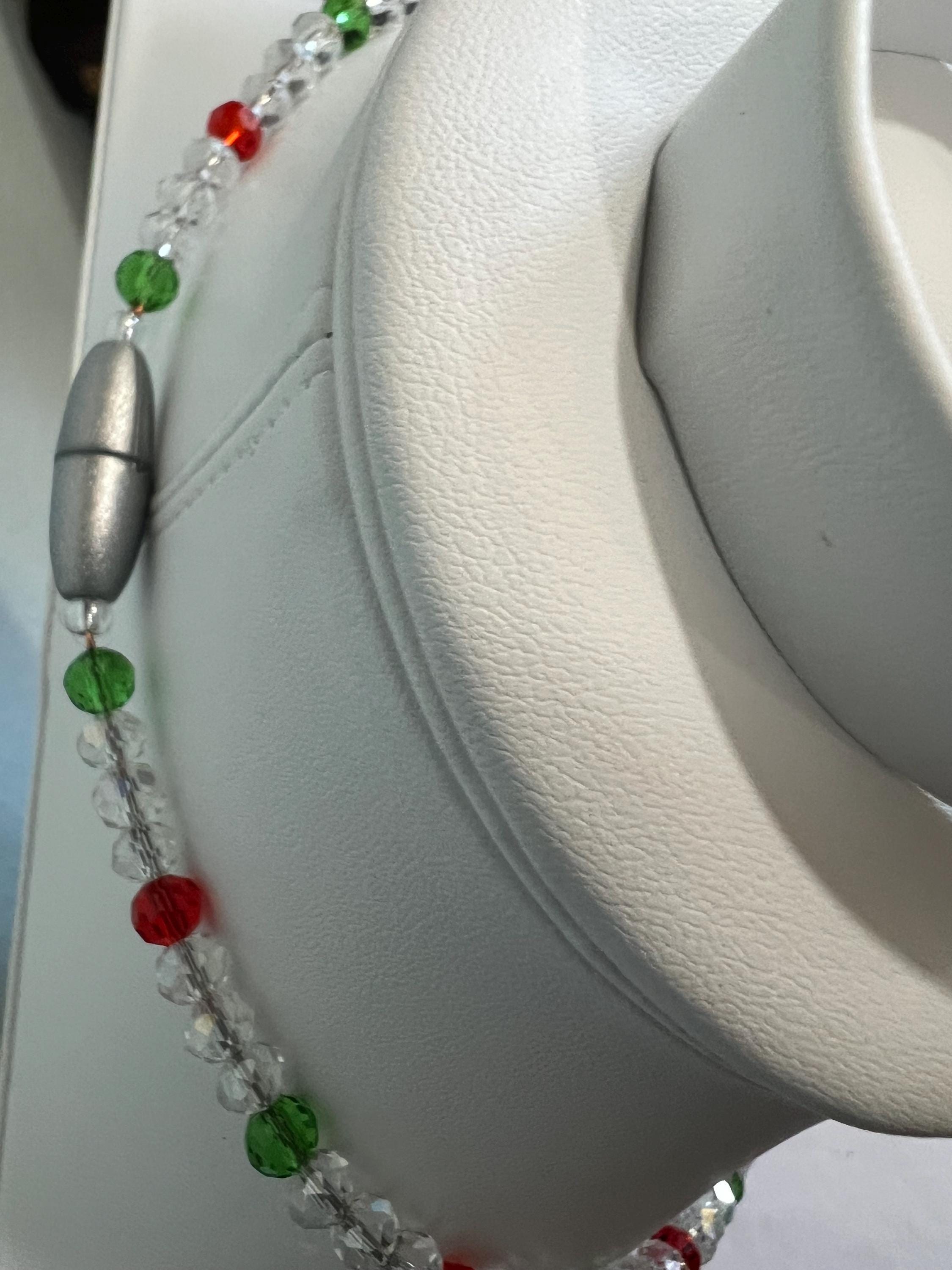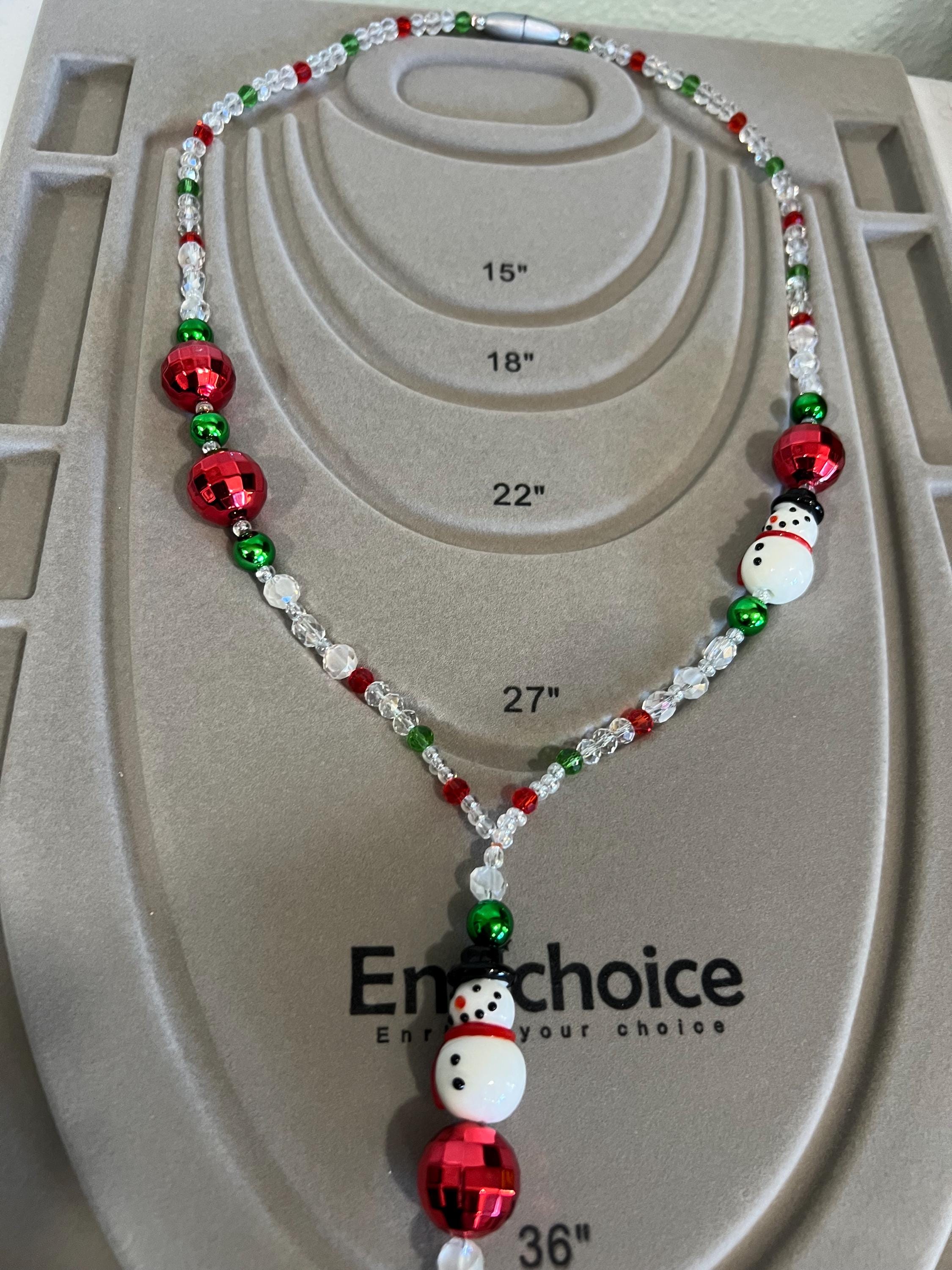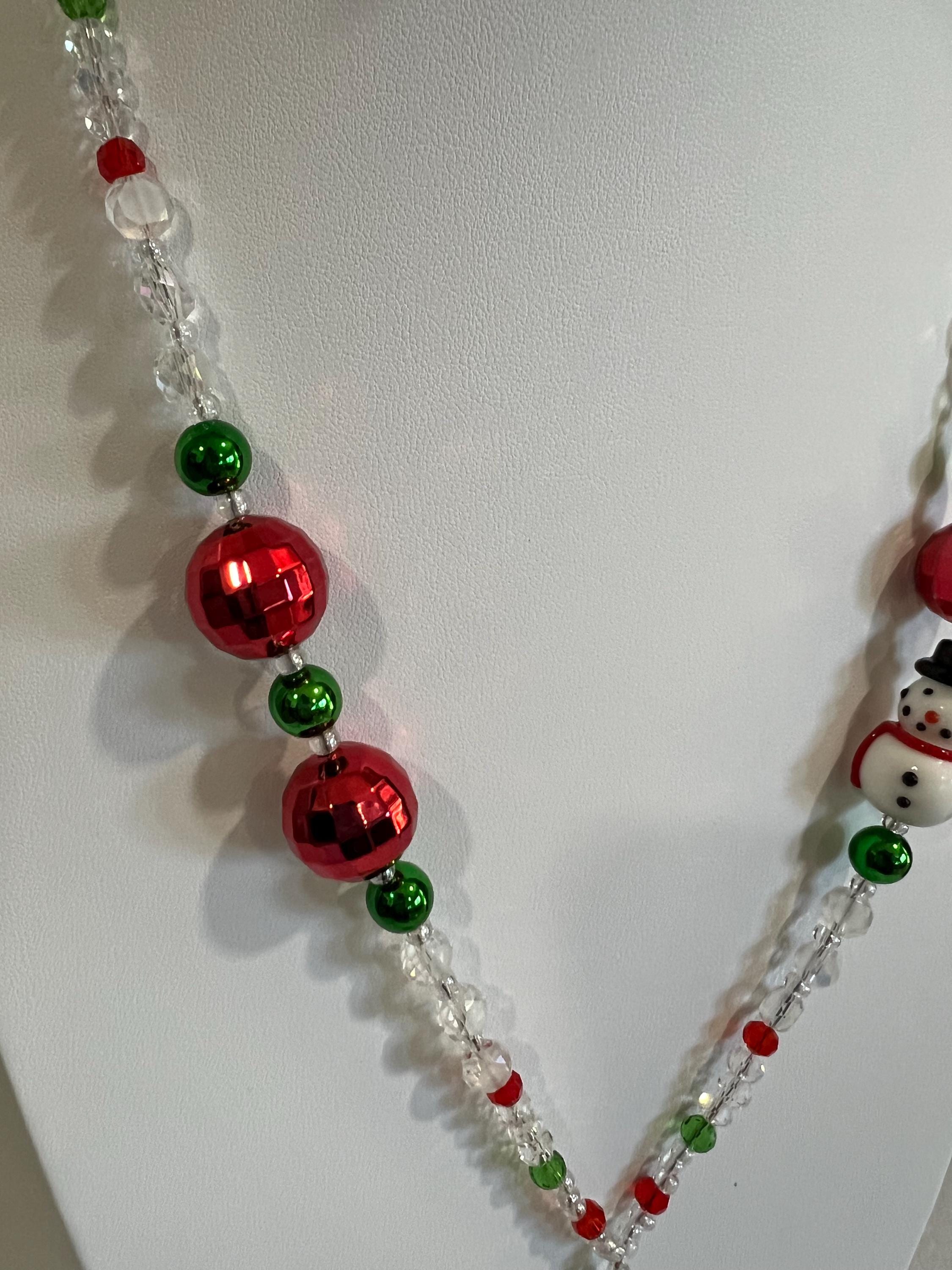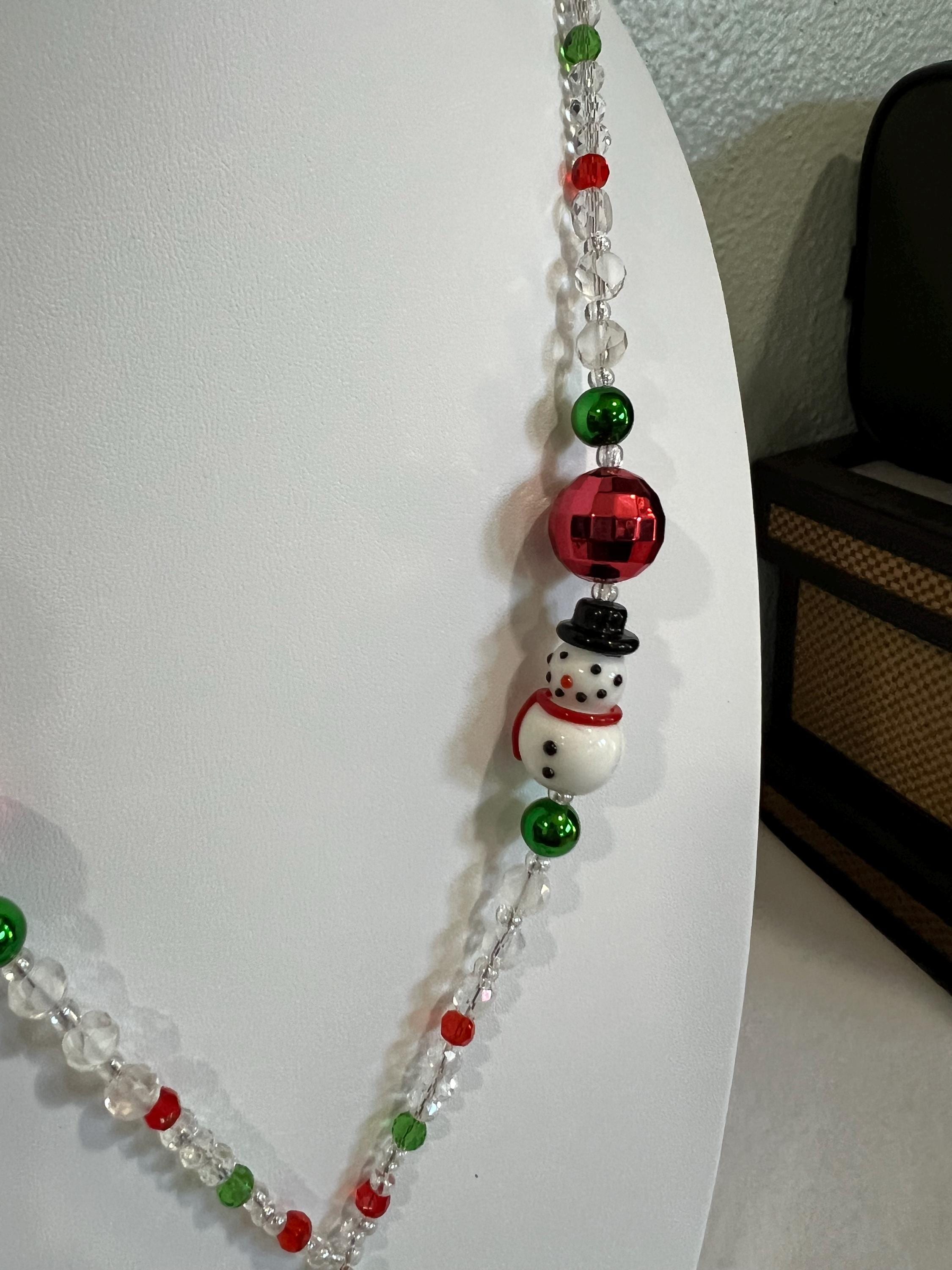 Unique One-Of-A- Kind Breakaway Lanyard - Christmas 2024 #13- Red, Green, Iridescent and Clear Beads with 2 Ceramic Snowmen Focal Beads