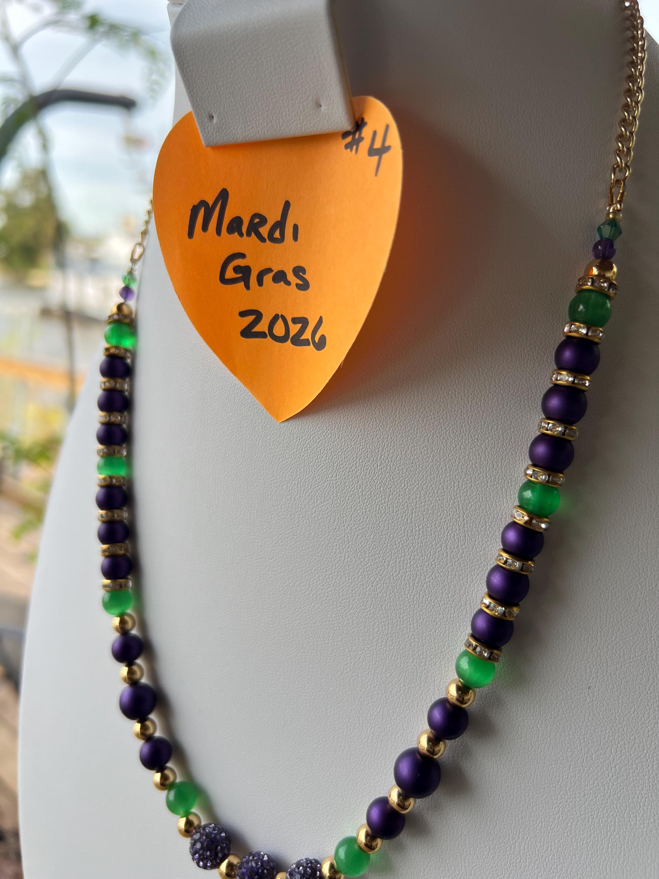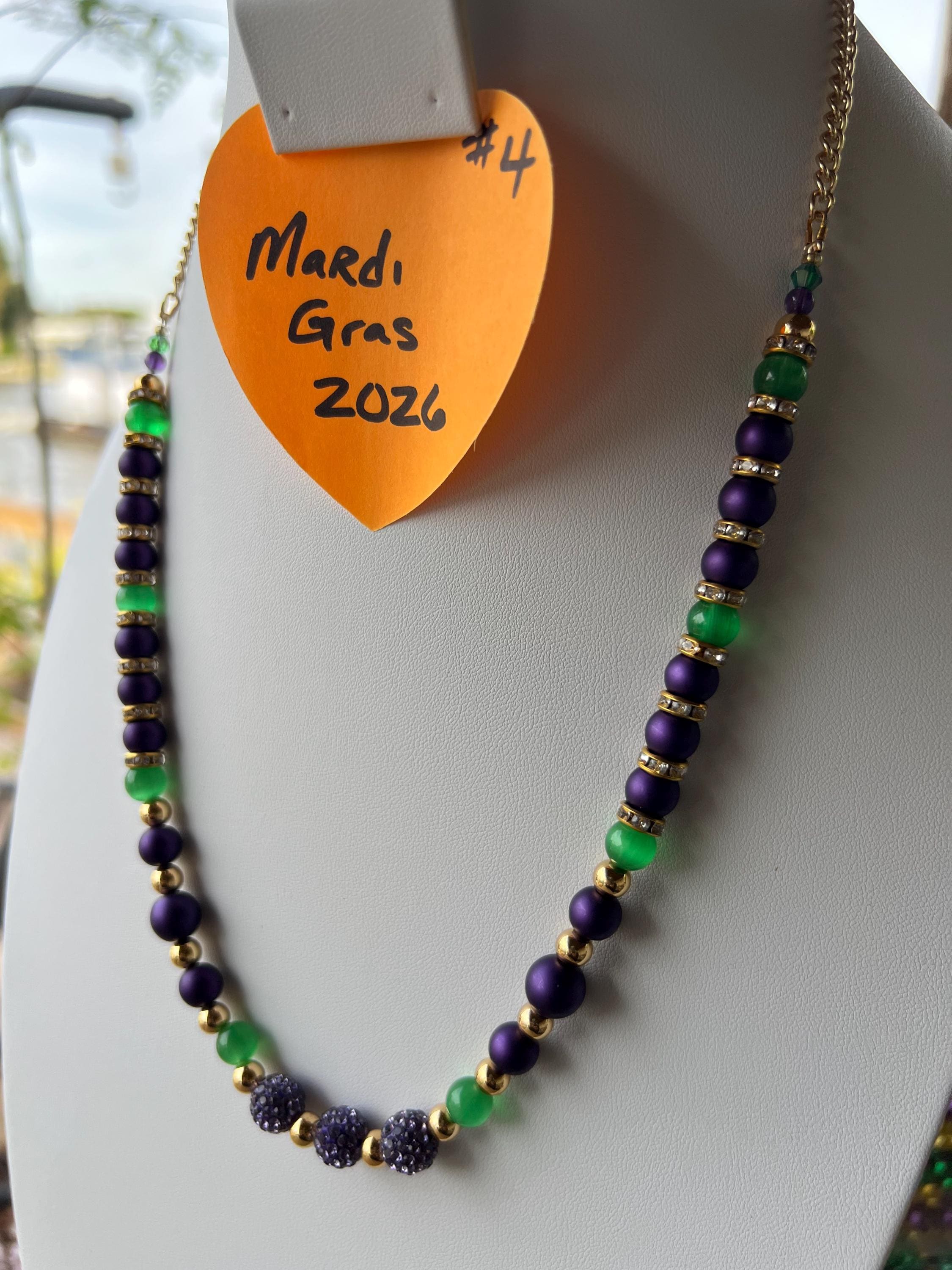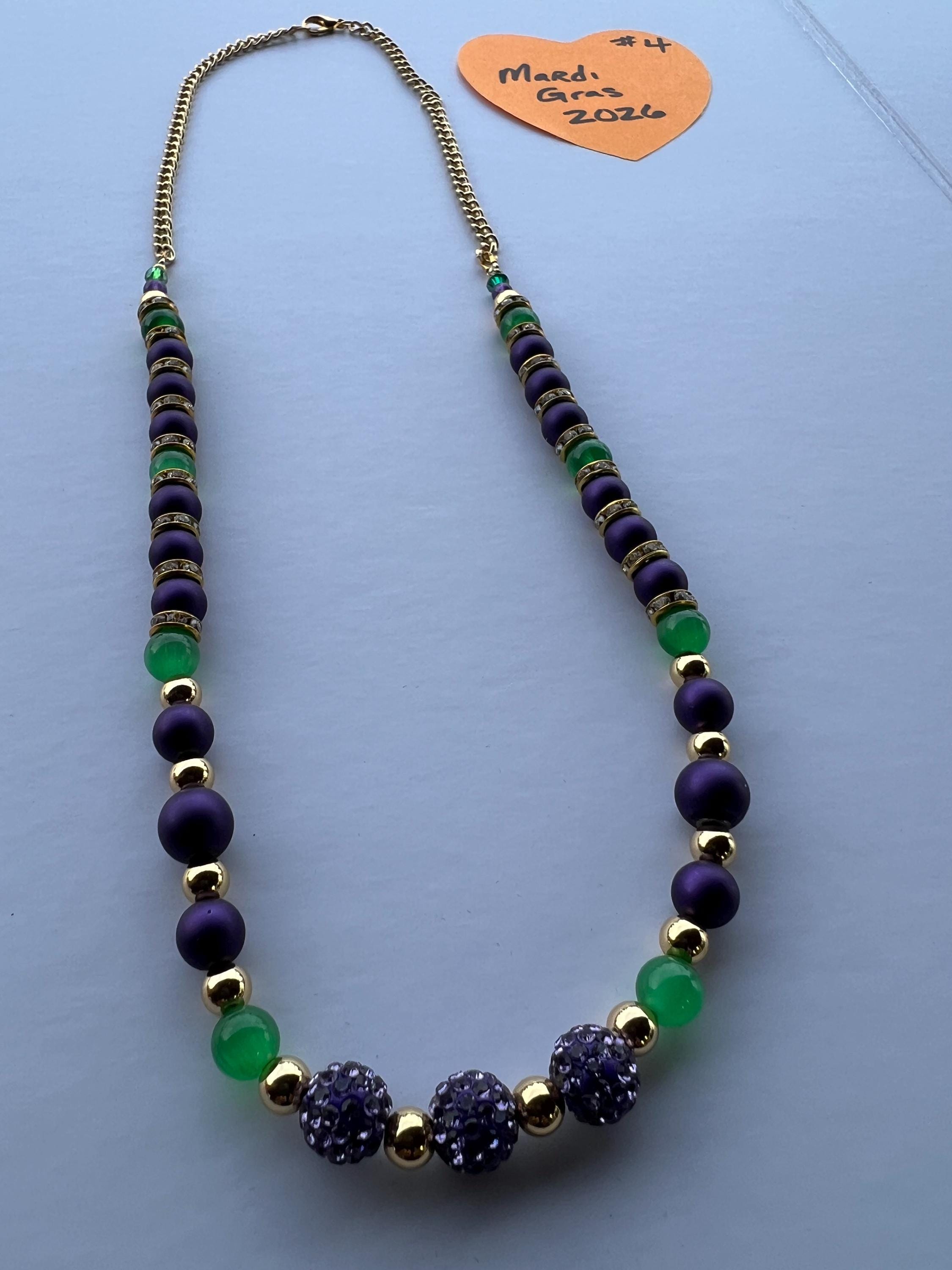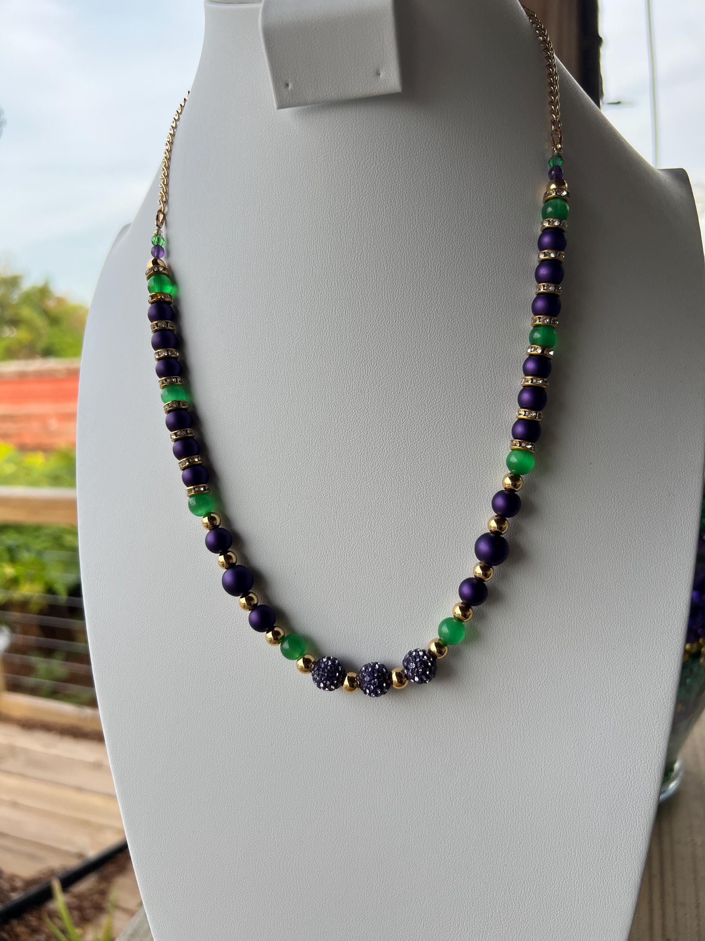 This dazzling 24.5-inch necklace features sparkling purple rhinestones, purple coated glass beads, gold-plated accents, and brilliant cubic zirconia spacers. Subtle green cat-eye beads add dimension and festival flair. Perfect for Mardi Gras events, holiday gatherings, or adding a touch of sparkle to daily outfits. Arrives in a luxurious purple velvet-lined gift drawer box, ready for gifting or safekeeping.