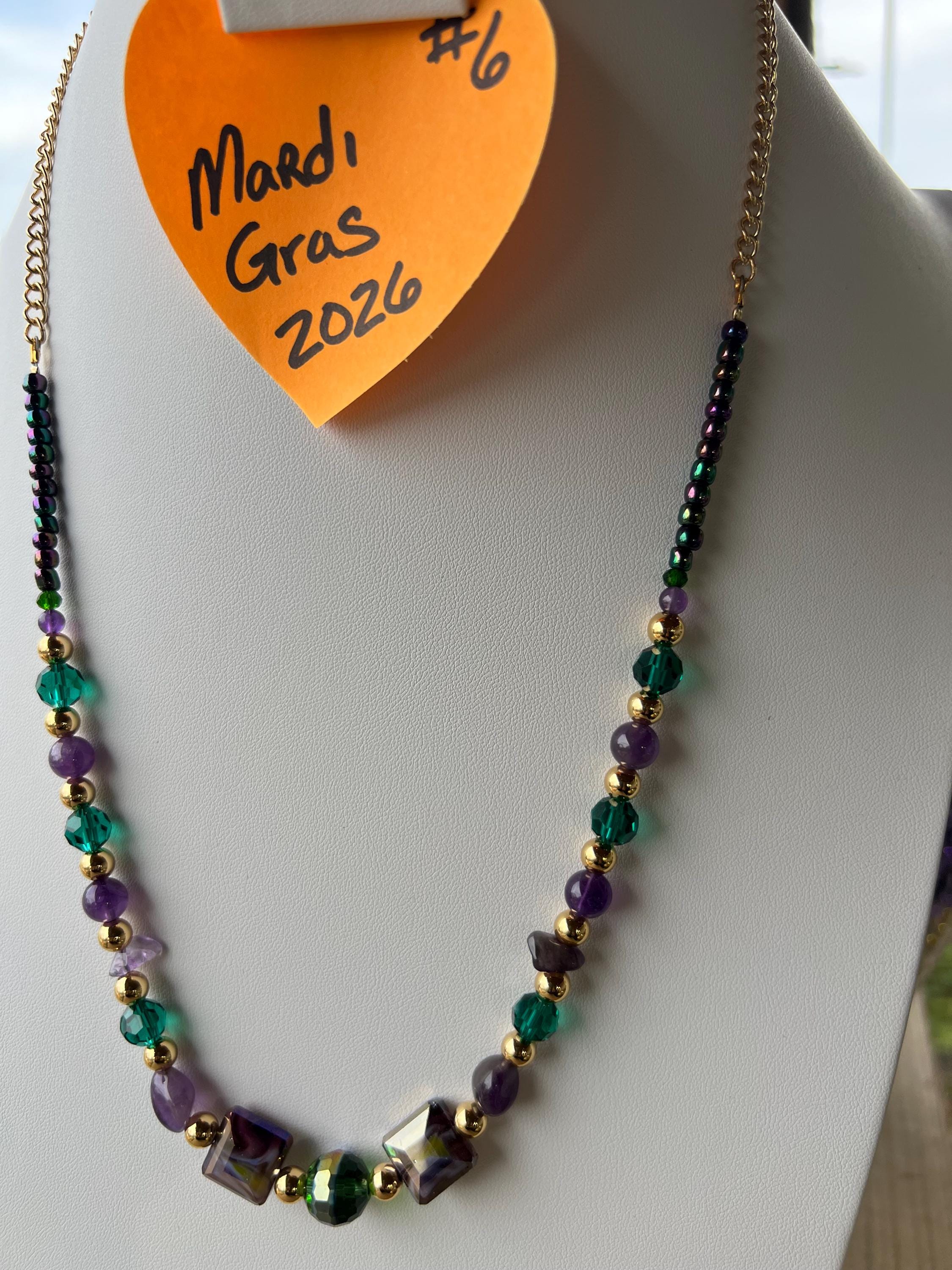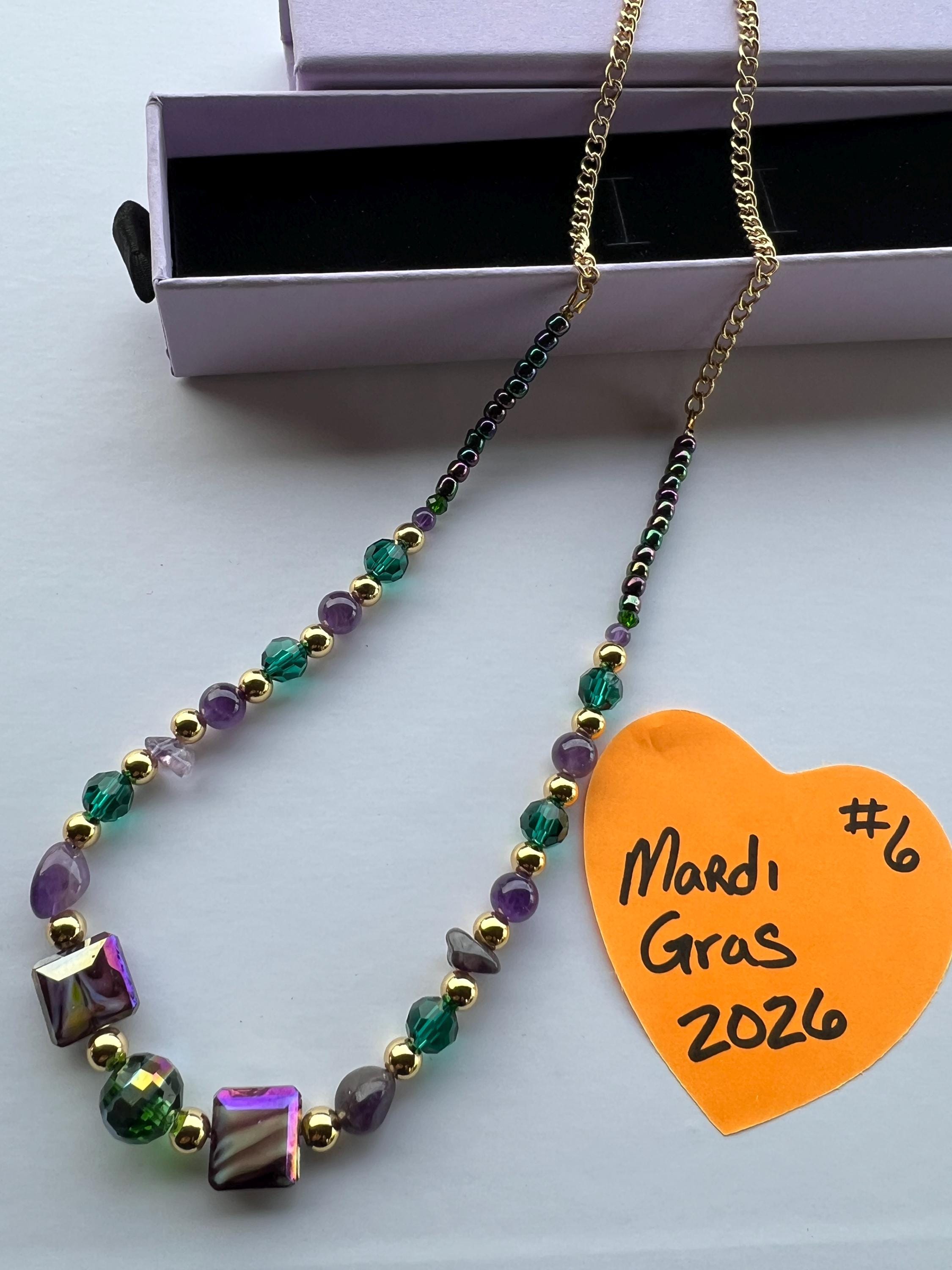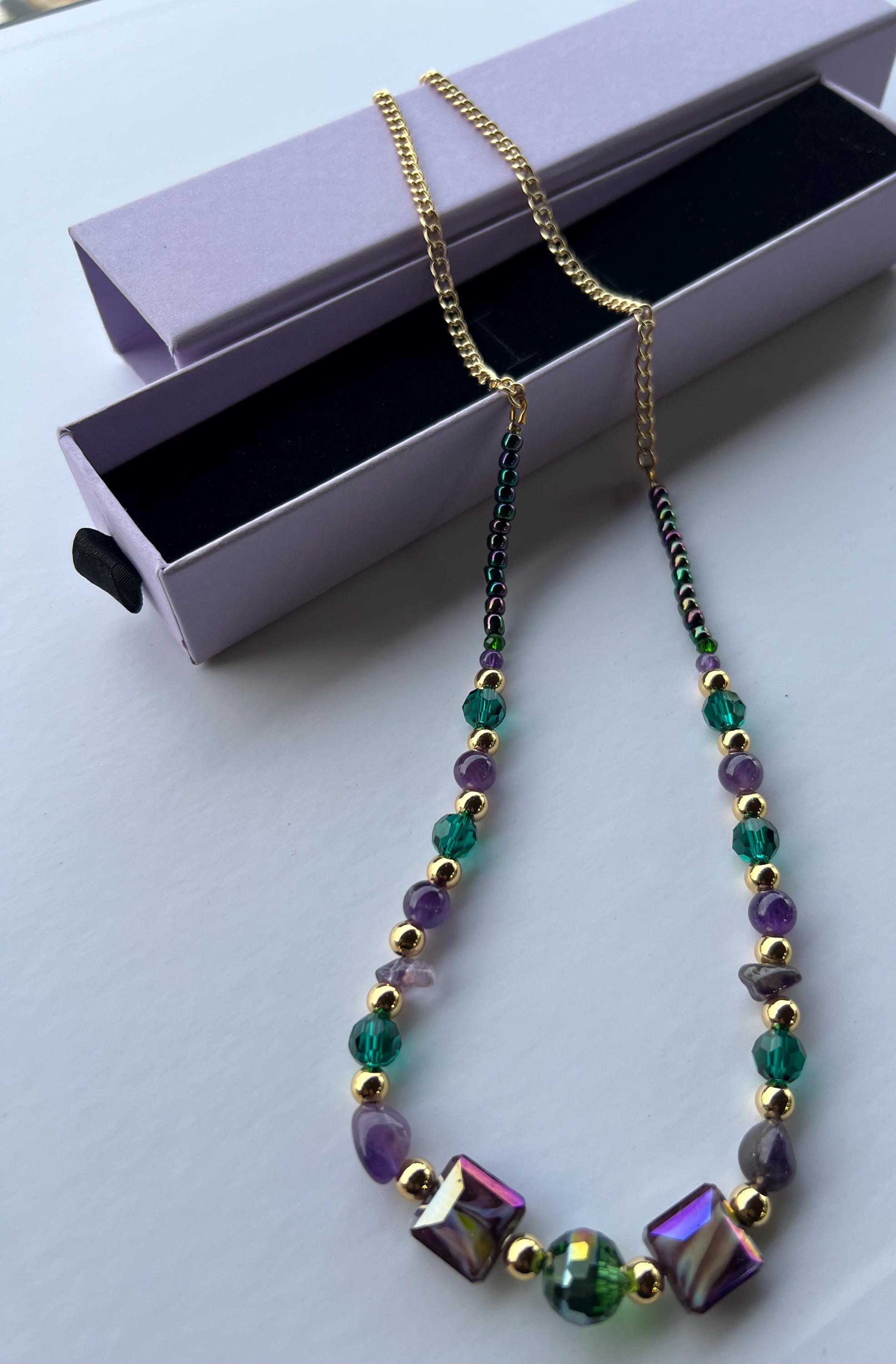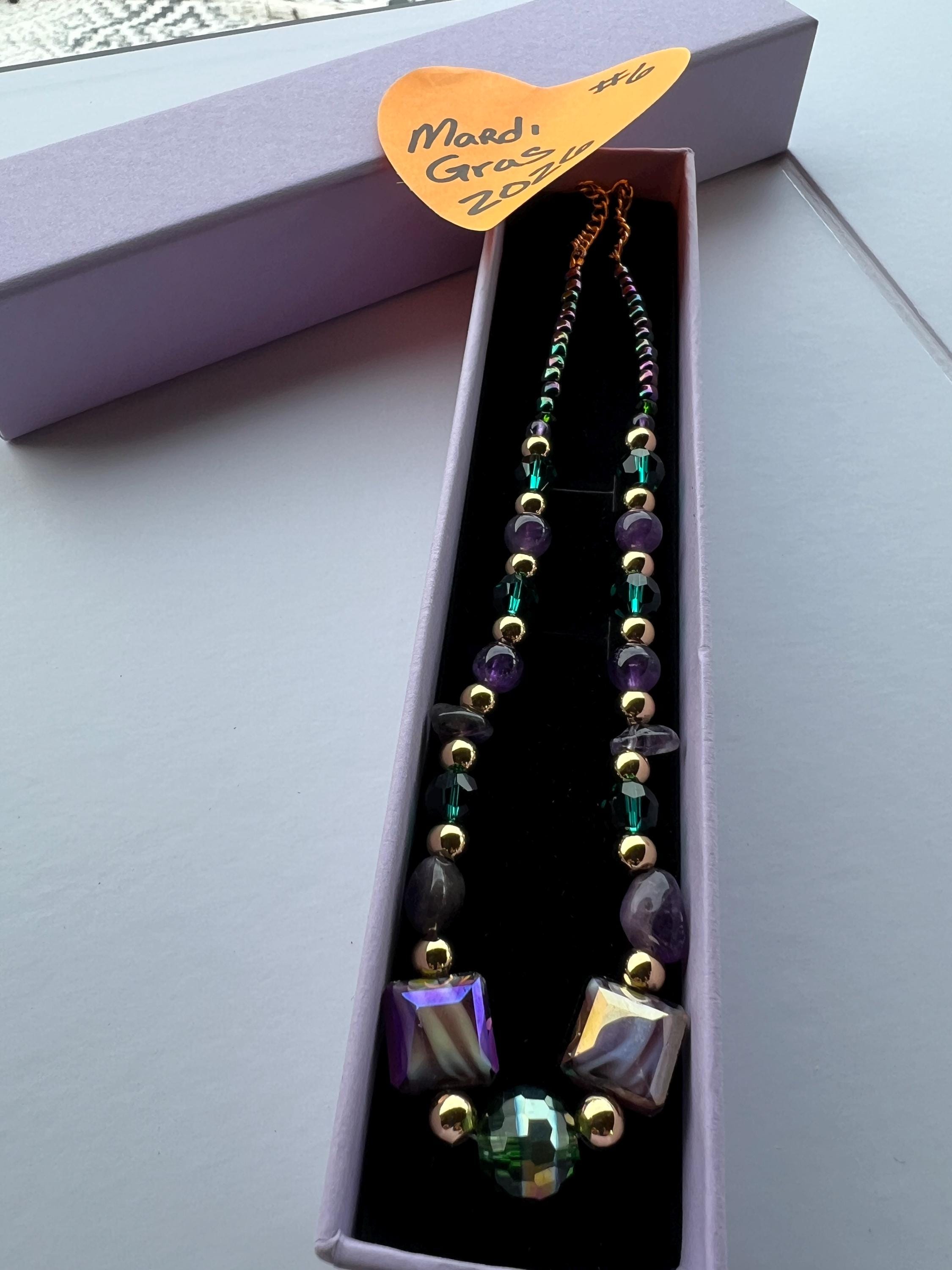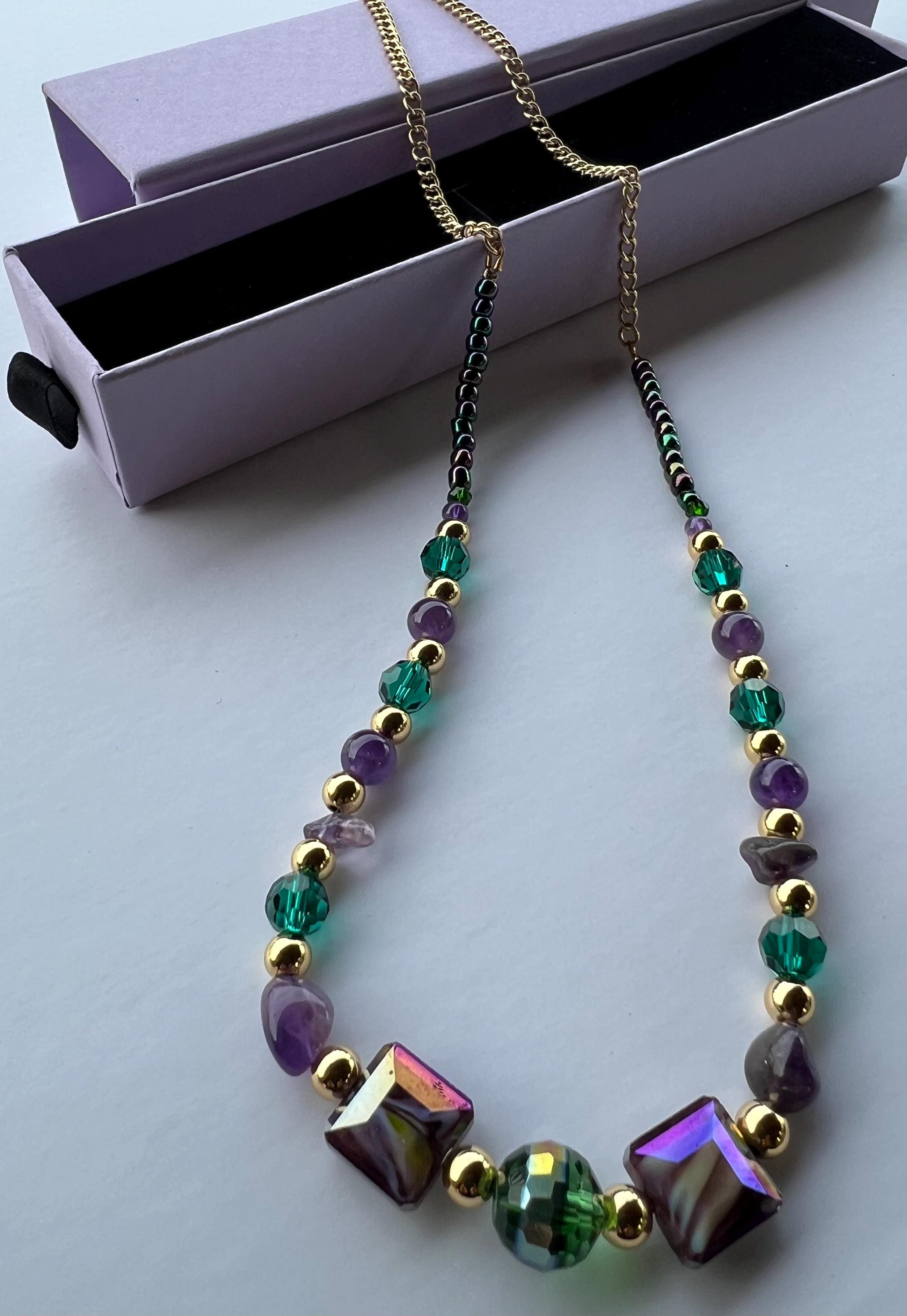 This 25-inch necklace blends purple stones, glass beads, gold-plated accents, and multi-colored bead details for a vibrant Mardi Gras-inspired look. Eye-catching yet versatile, it pairs beautifully with seasonal outfits, office wear, or cruise attire. Presented in a durable velvet-lined purple drawer box, it makes a thoughtful and festive gift for someone who loves handcrafted jewelry with personality.