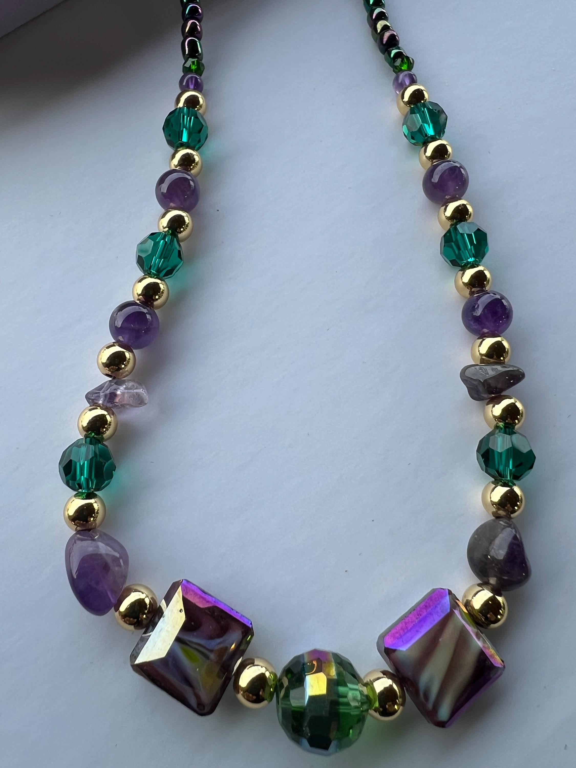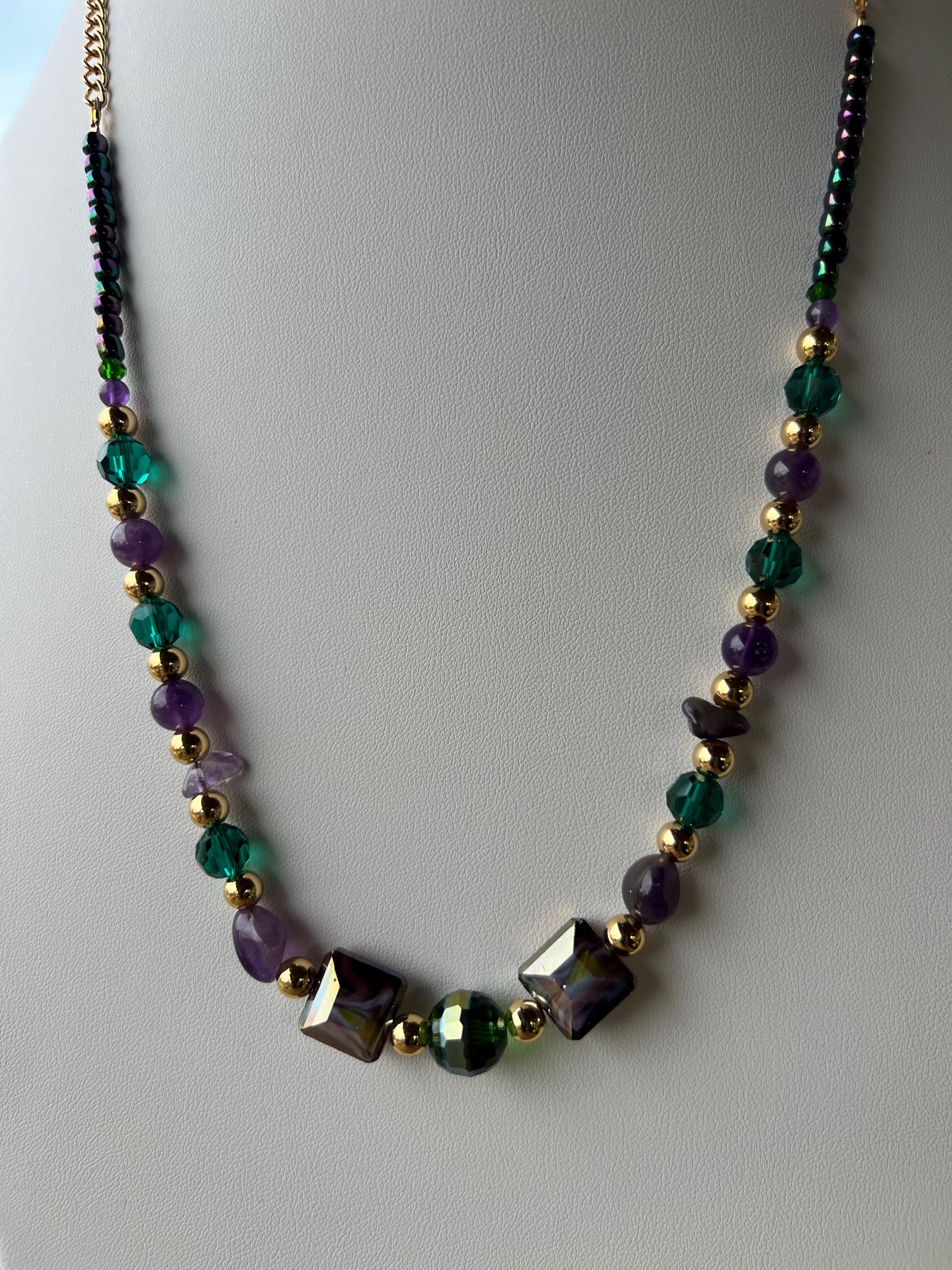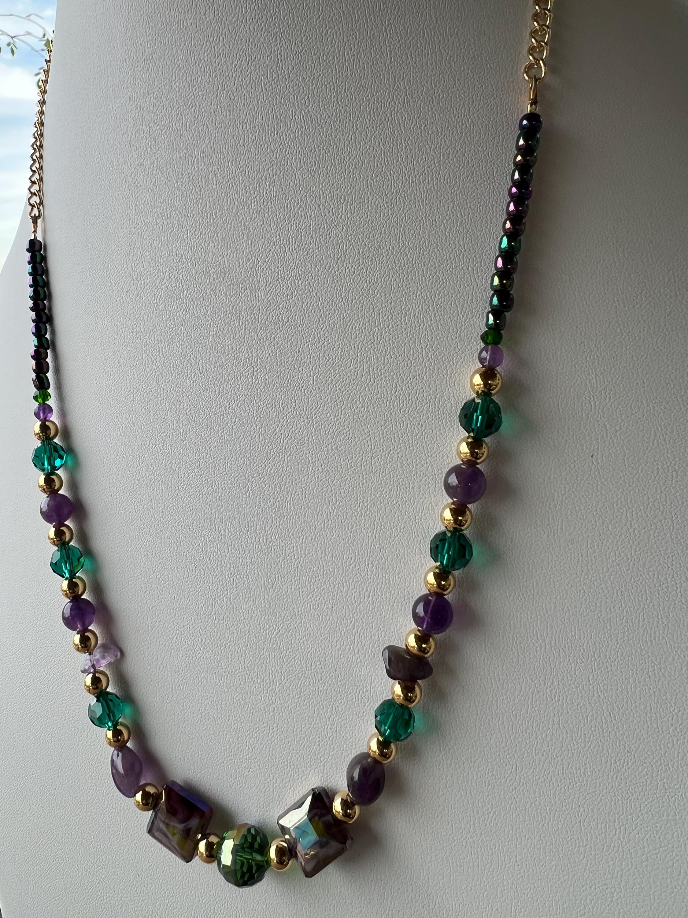 Purple Stone & Glass 25” Necklace w Golden Accents and Green Multi-Faceted Beads