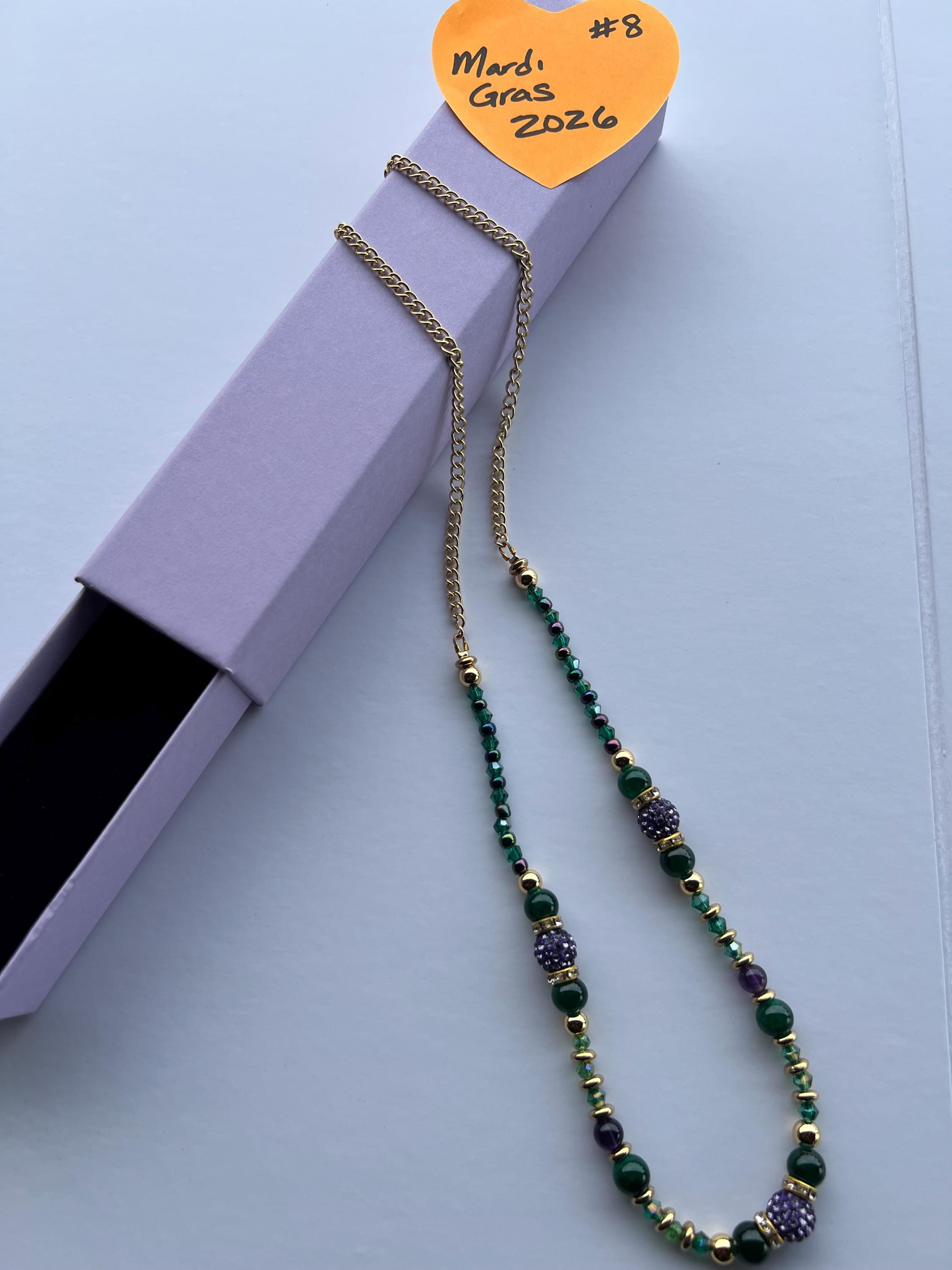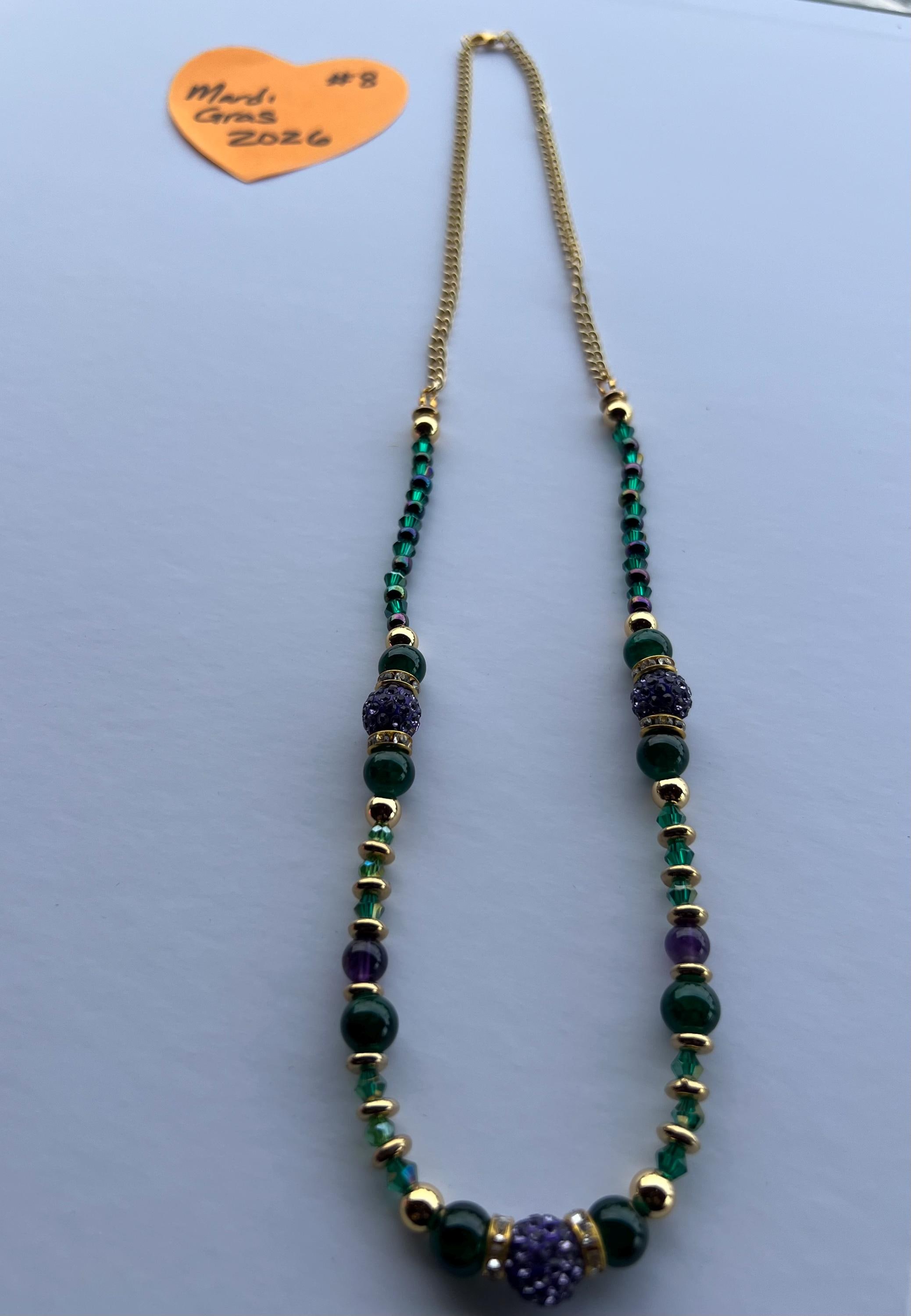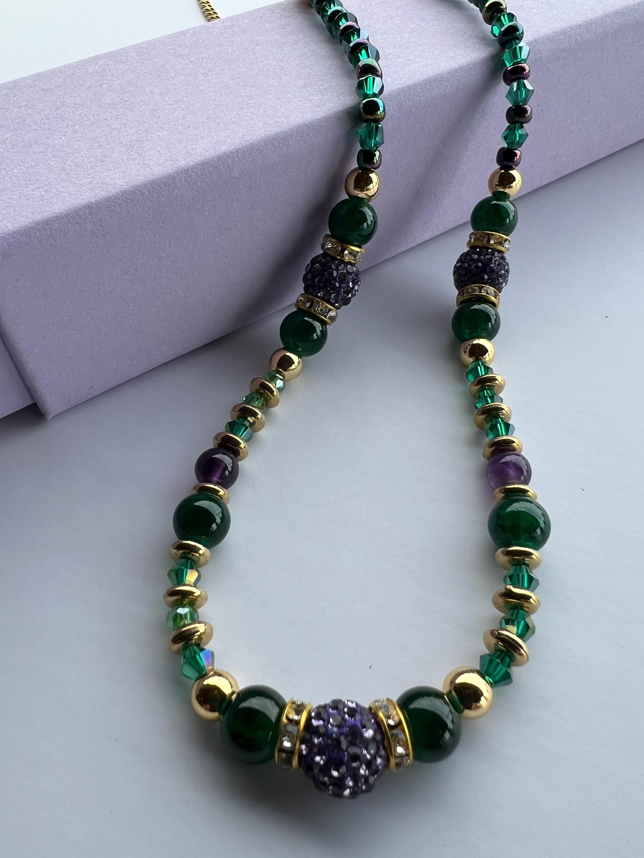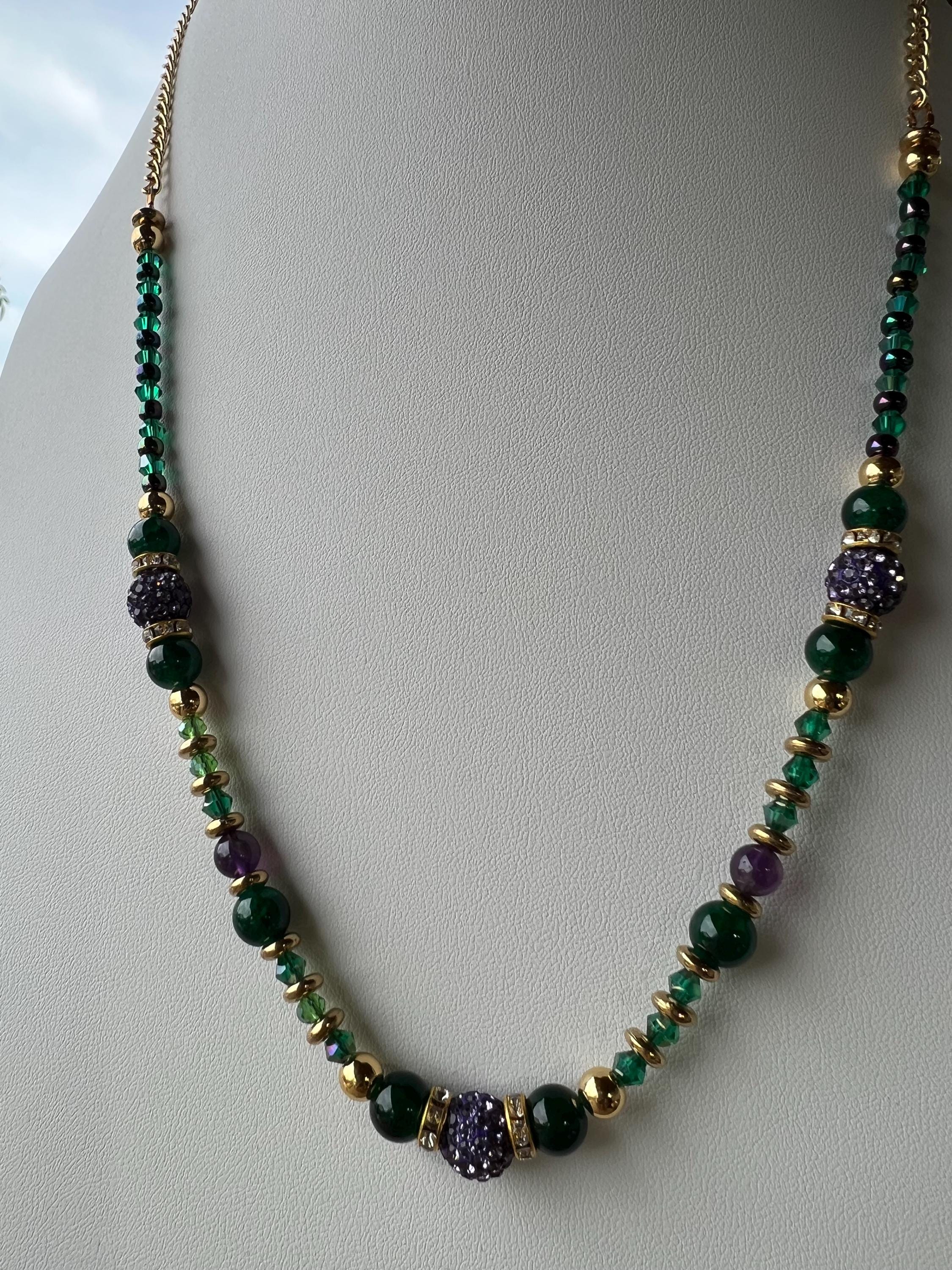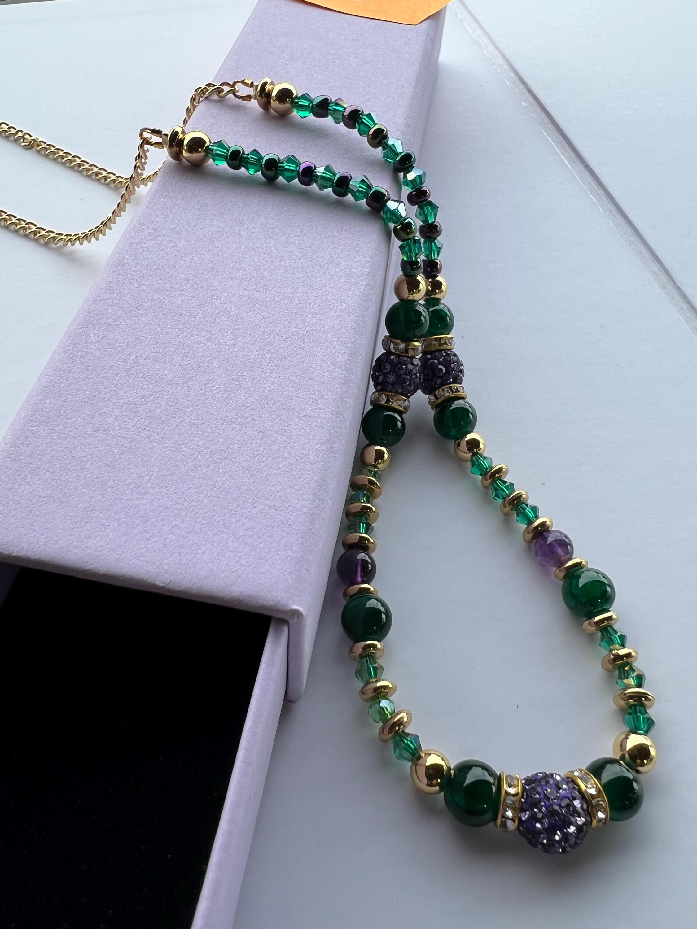 With a rich combination of purple rhinestones, green stones, gold-plated beads, and cubic zirconia highlights, this 26-inch necklace radiates Mardi Gras sparkle. Elegant yet lively, it suits celebrations, office fashion, or everyday wear. It arrives in a velvet-lined purple drawer box—perfect for gifting or protecting this unique handcrafted piece.