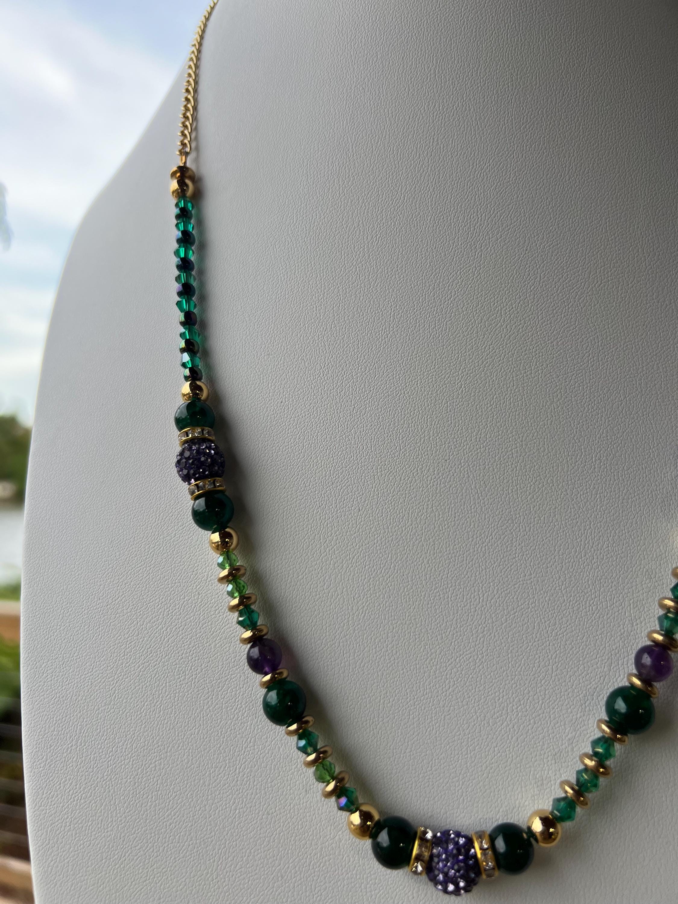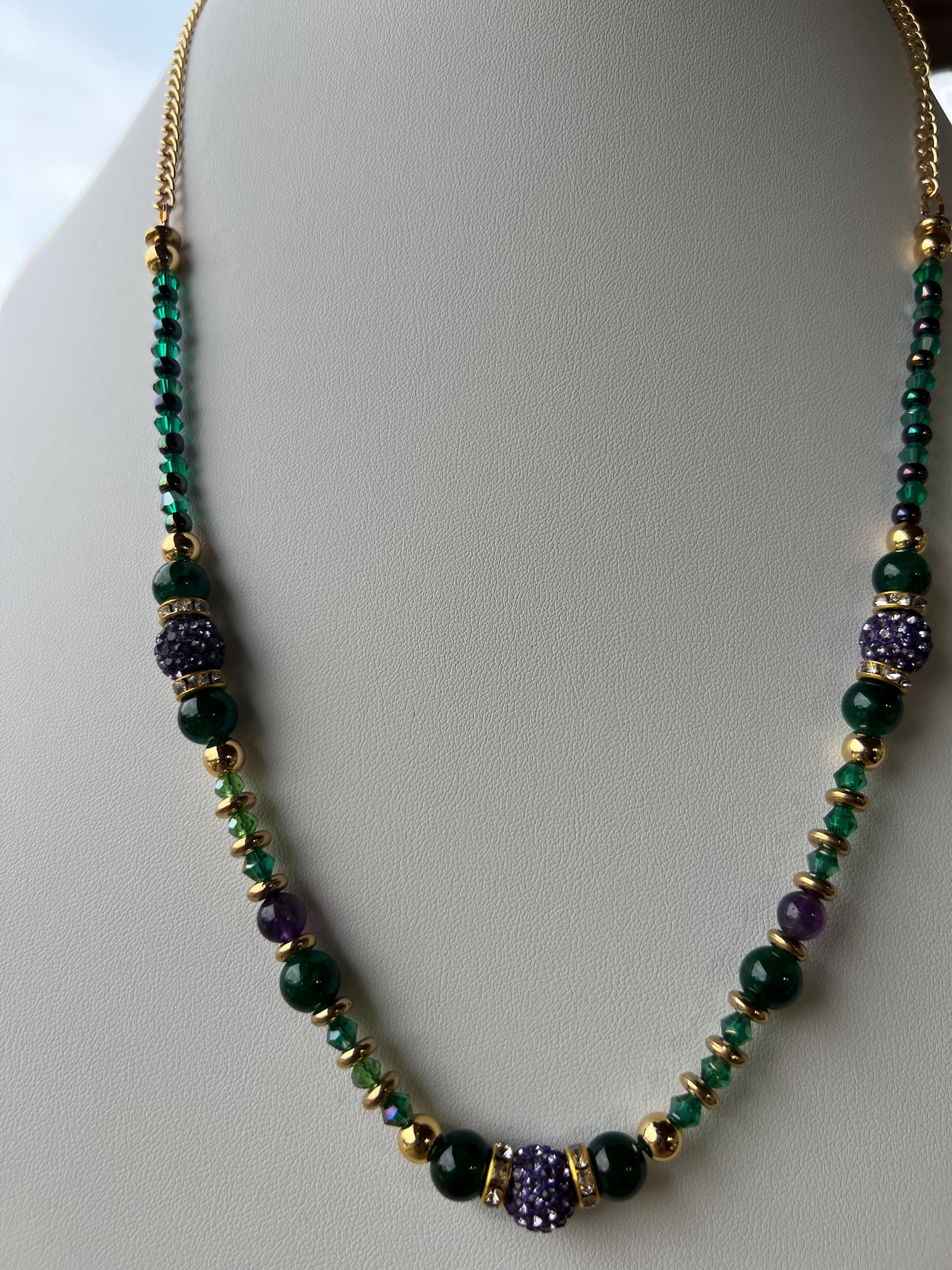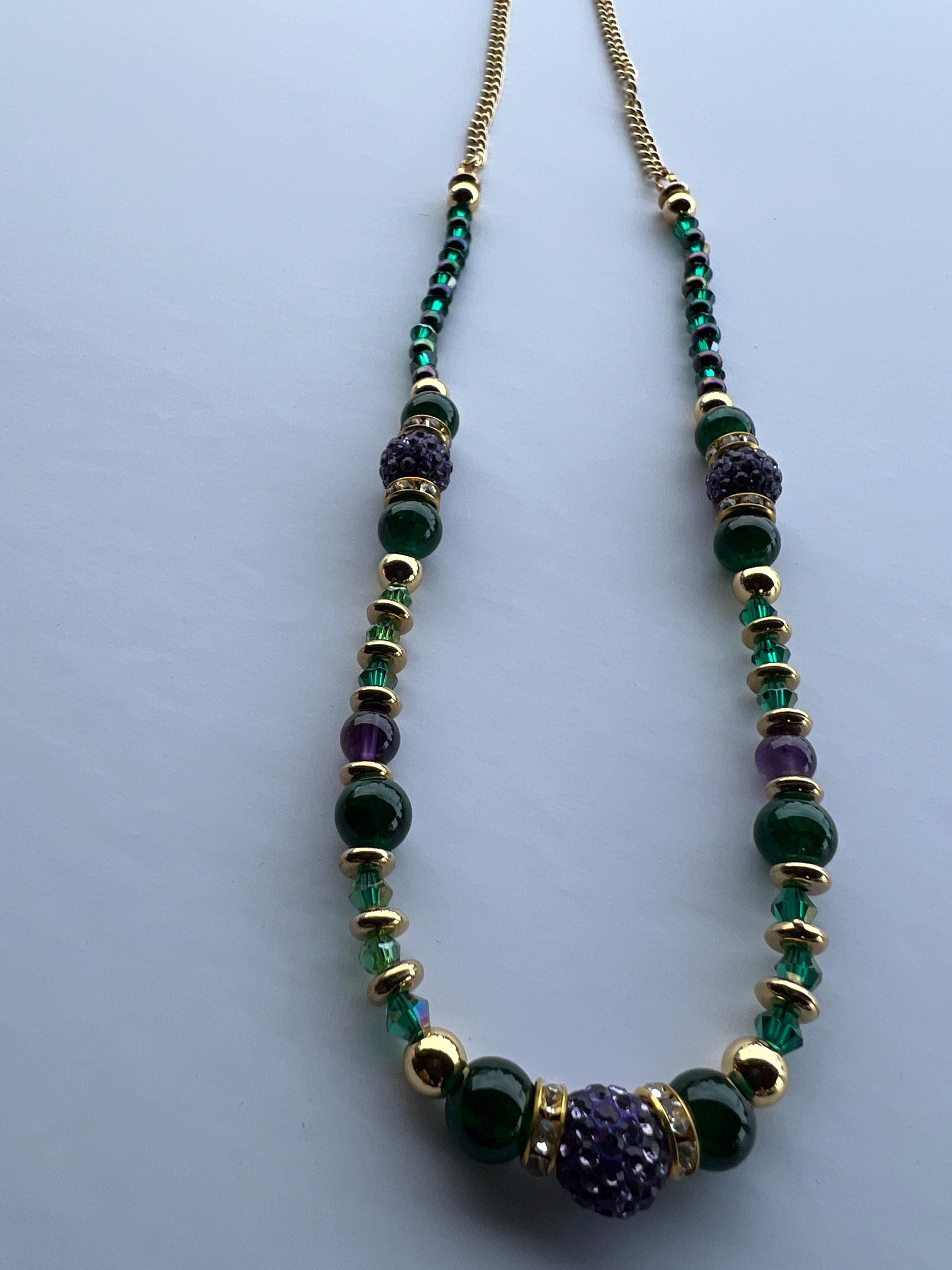 Purple Rhinestone & Green Stone 26” Mardi Gras Necklace w Gold and CZ Accents