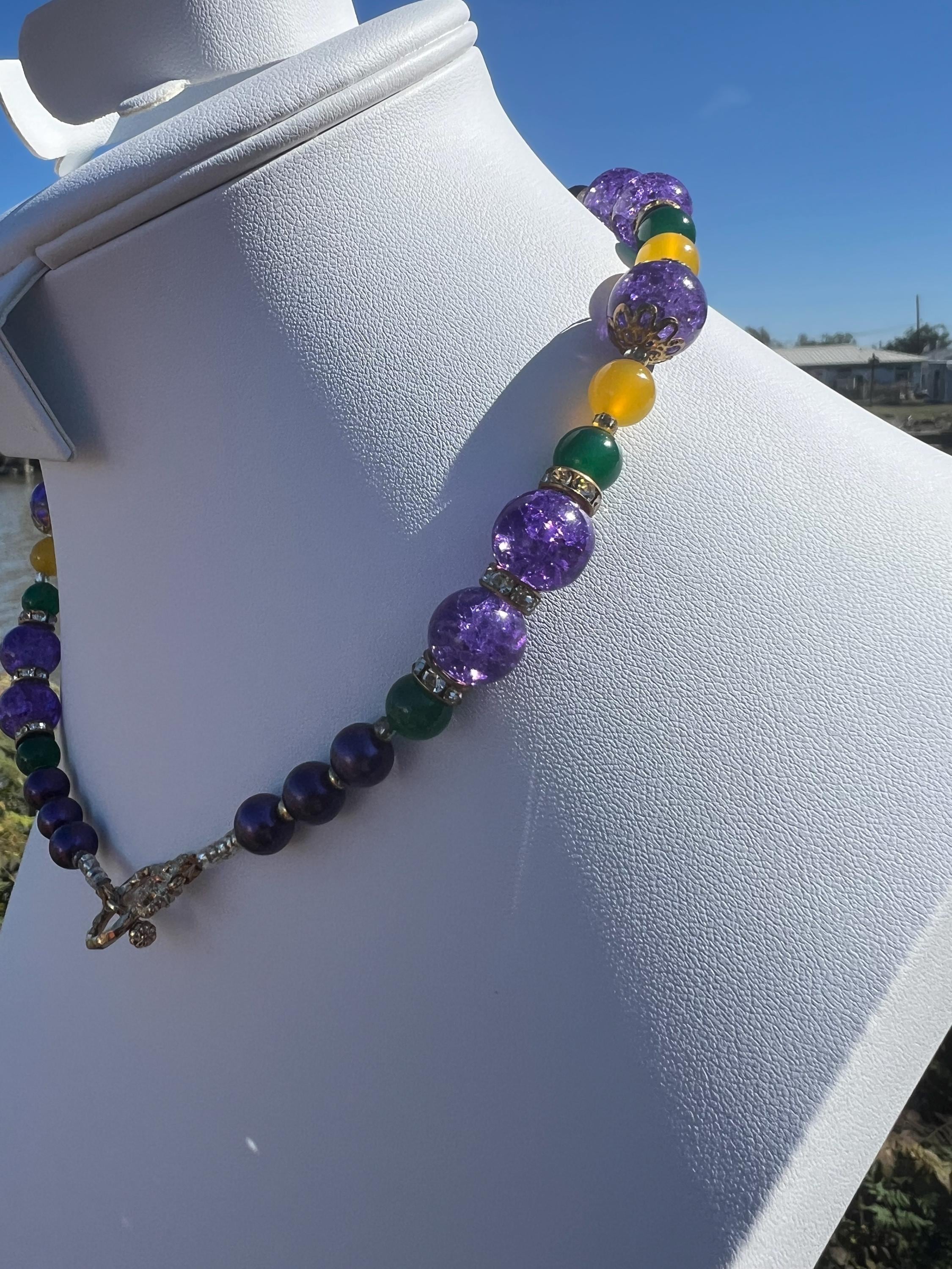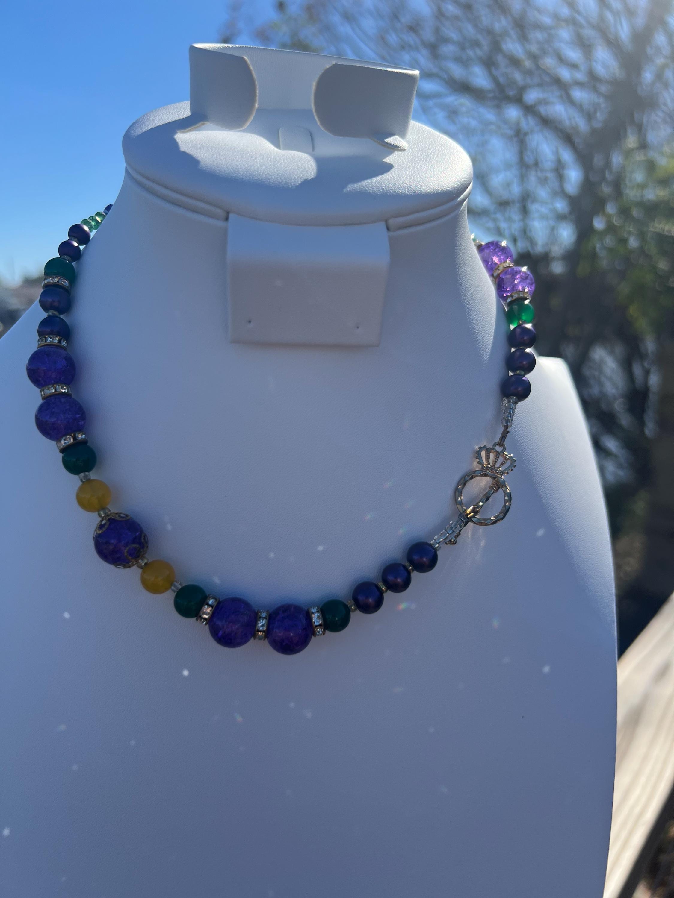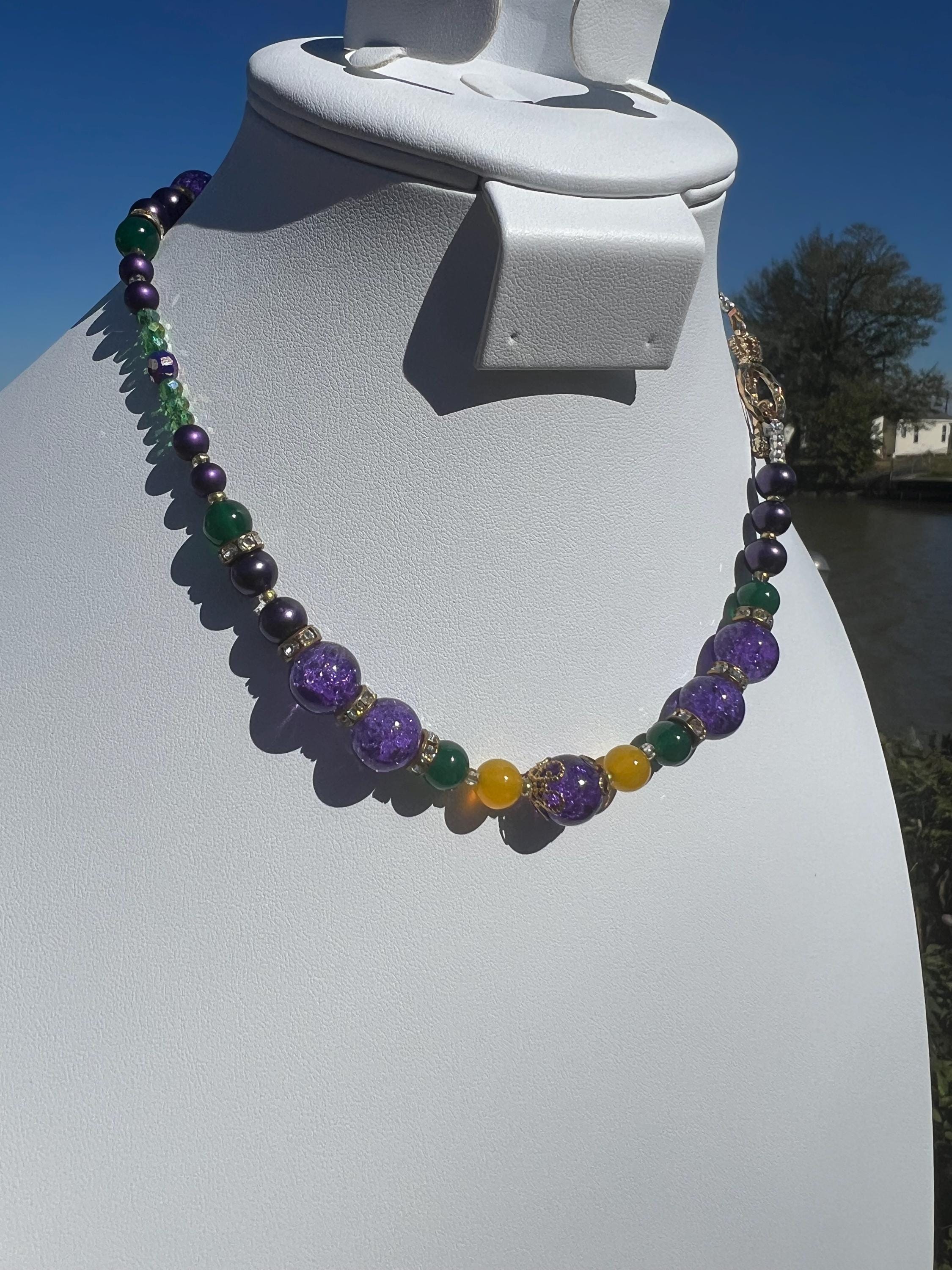 Celebrate Mardi Gras with a one-of-a-kind handcrafted necklace designed for versatility, color, and joyful expression. Each necklace in this collection is created using a vibrant mix of purple, green, and gold beads inspired by Carnival season, making it perfect for festive events, office celebrations, cruises, or everyday statement wear.