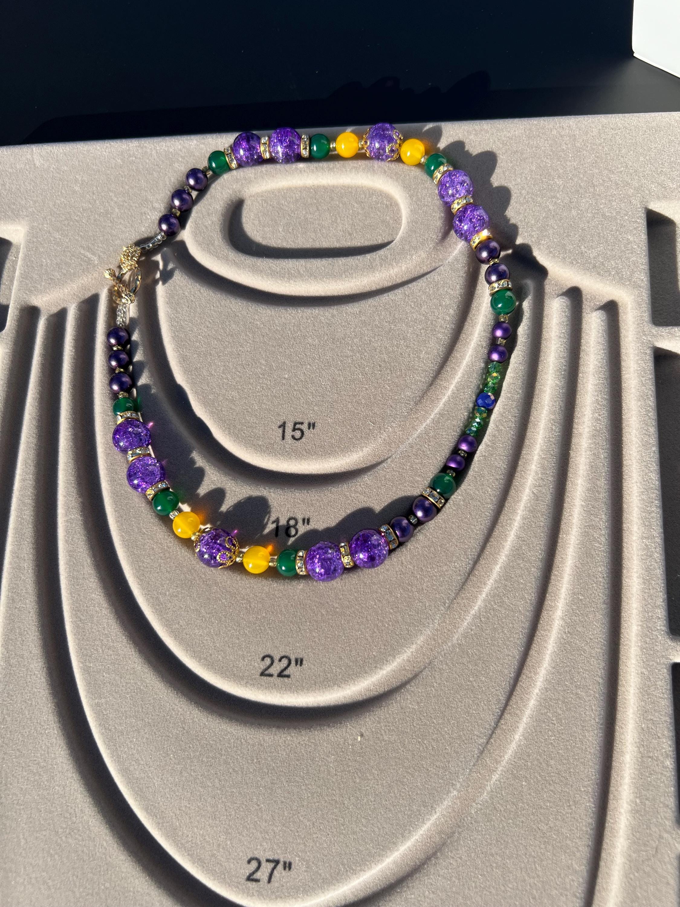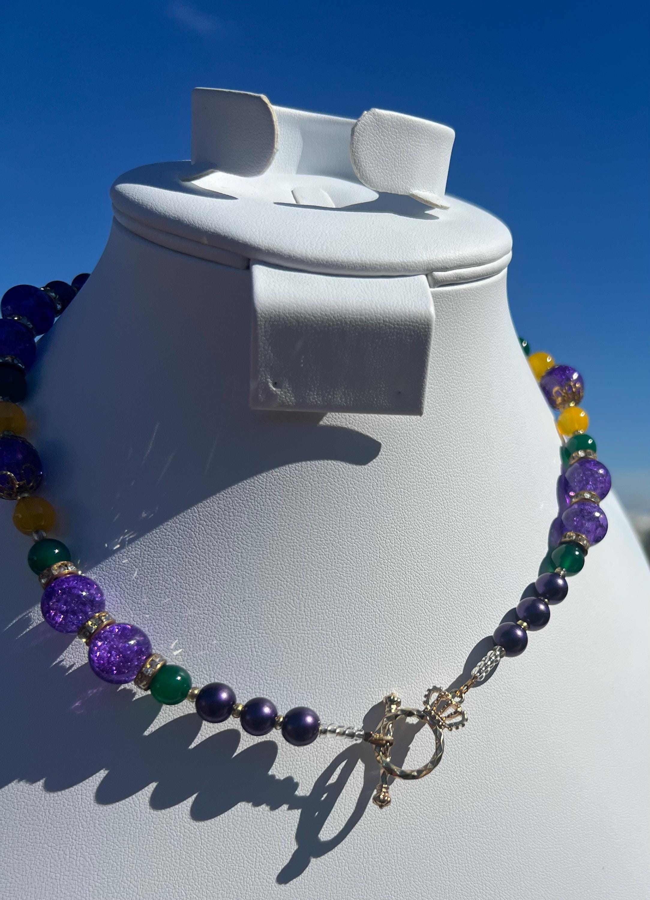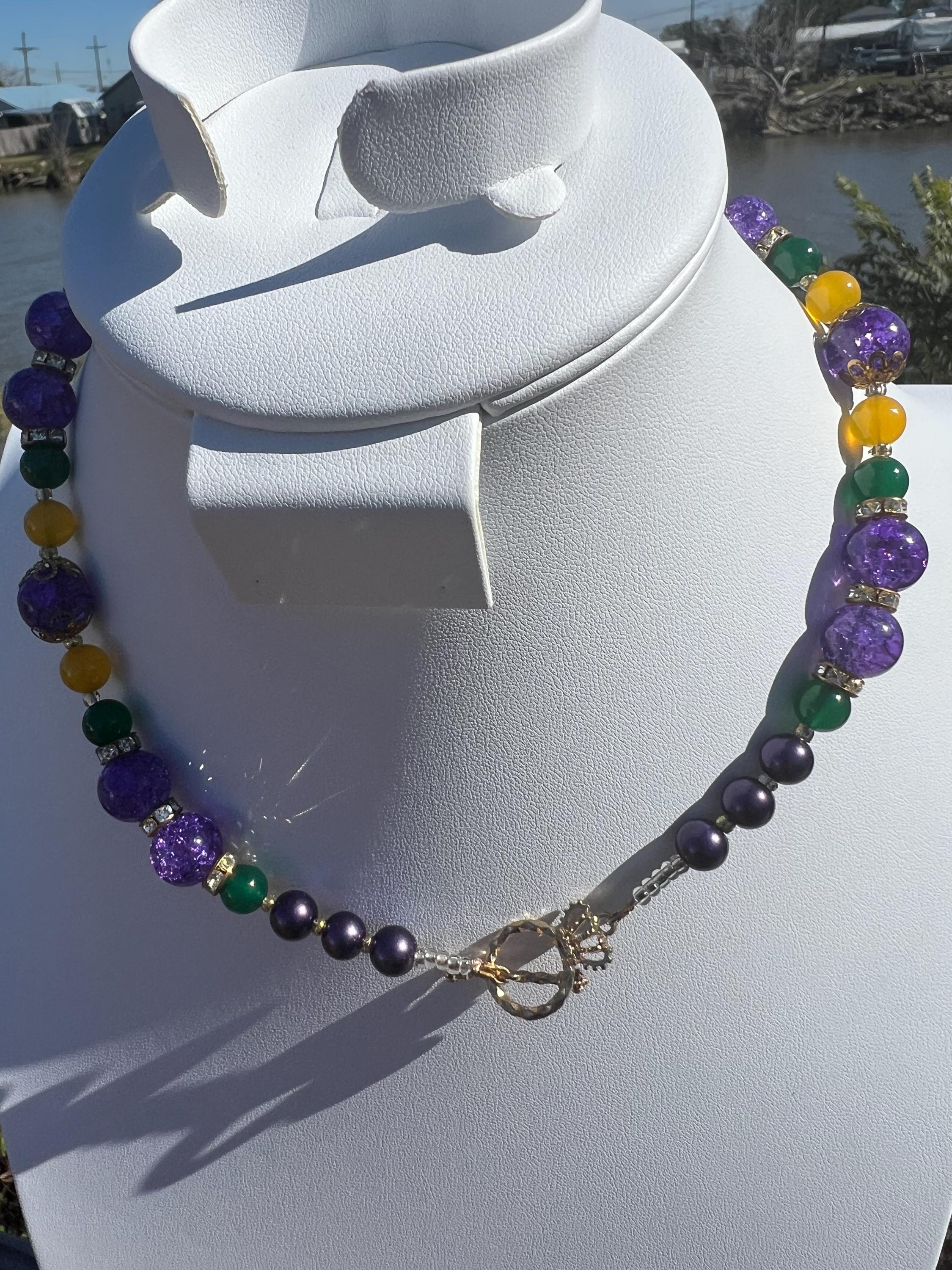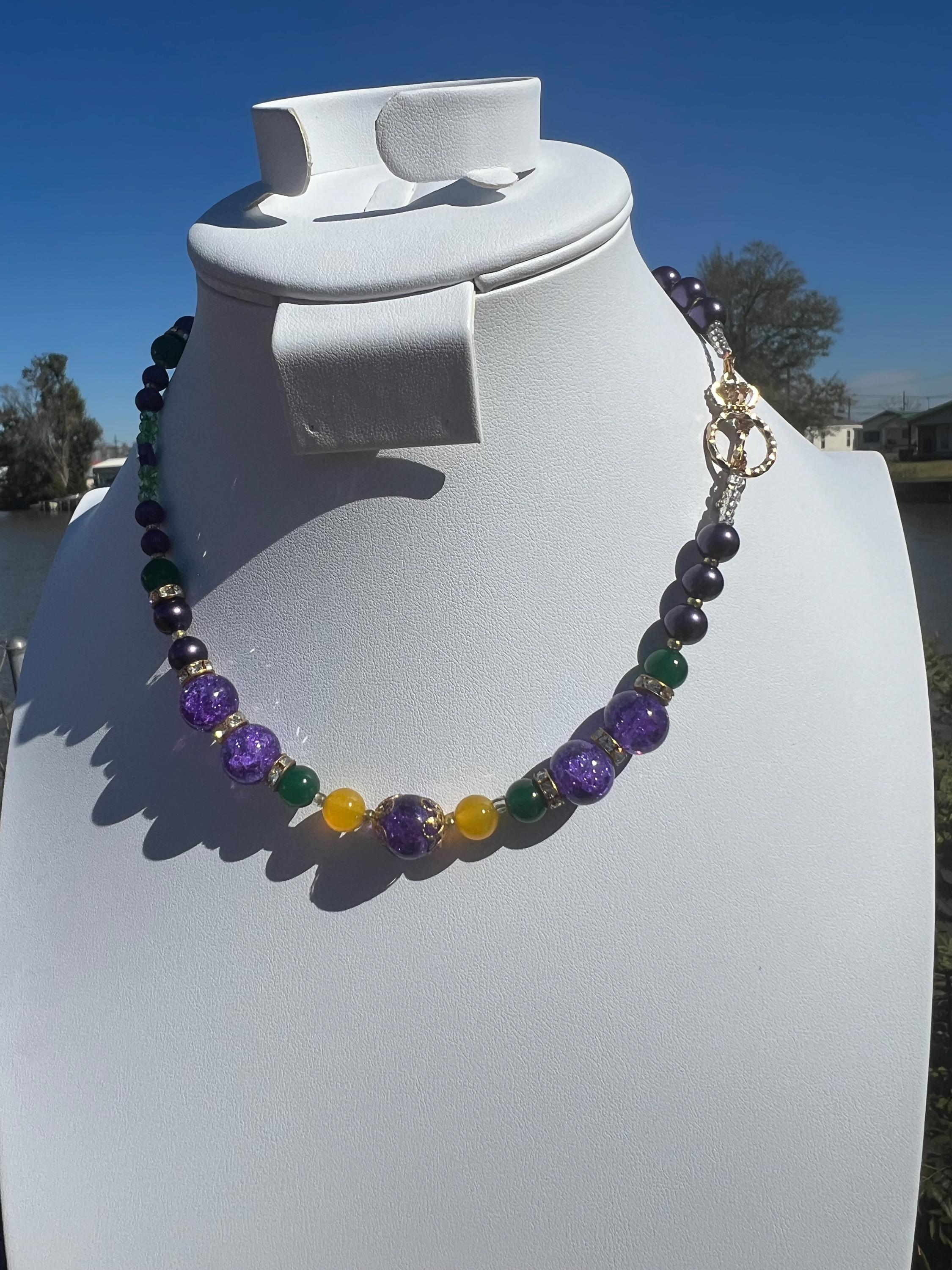 Celebrate Mardi Gras with a one-of-a-kind handcrafted necklace designed for versatility, color, and joyful expression. Each necklace in this collection is created using a vibrant mix of purple, green, and gold beads inspired by Carnival season, making it perfect for festive events, office celebrations, cruises, or everyday statement wear.