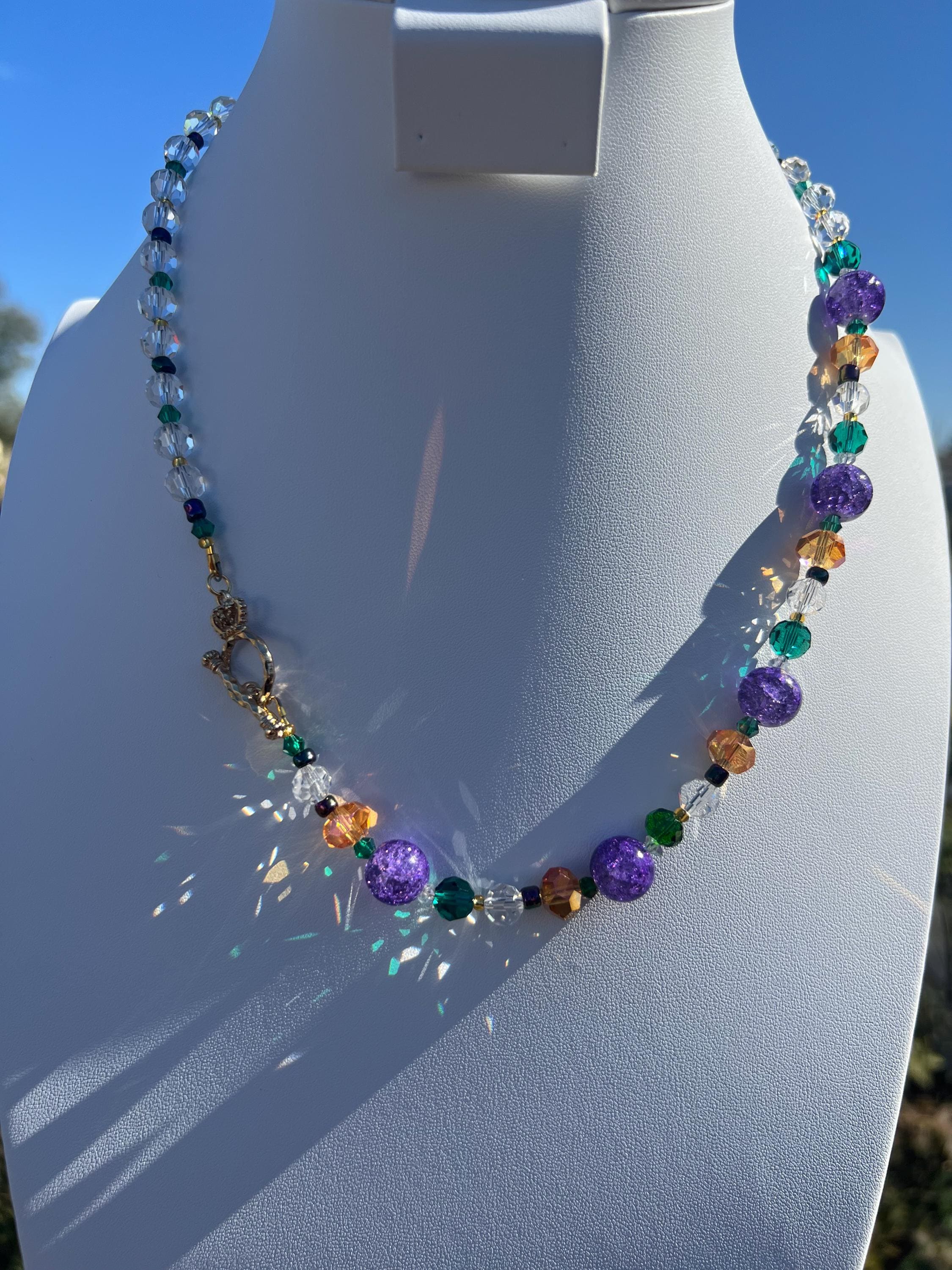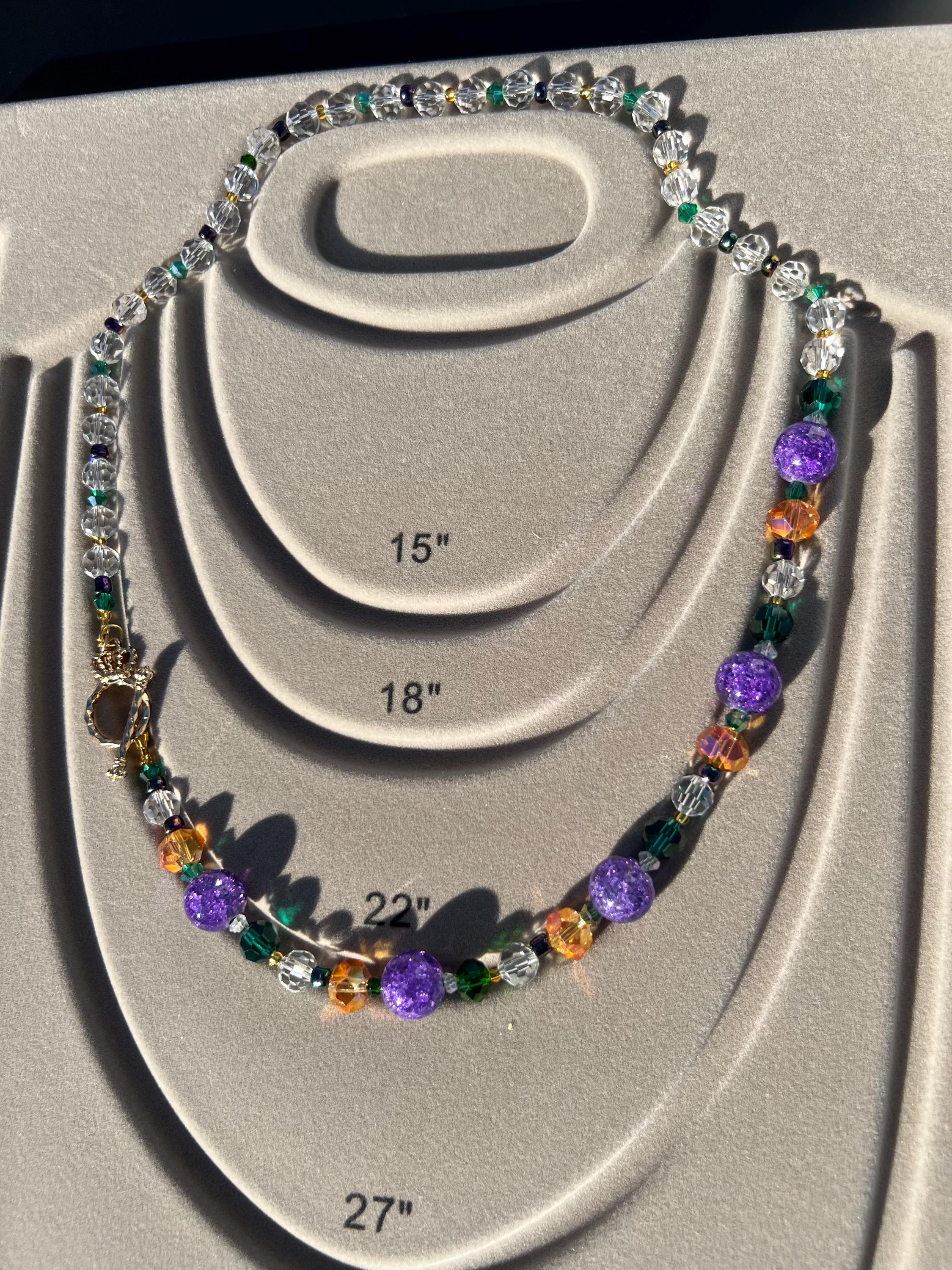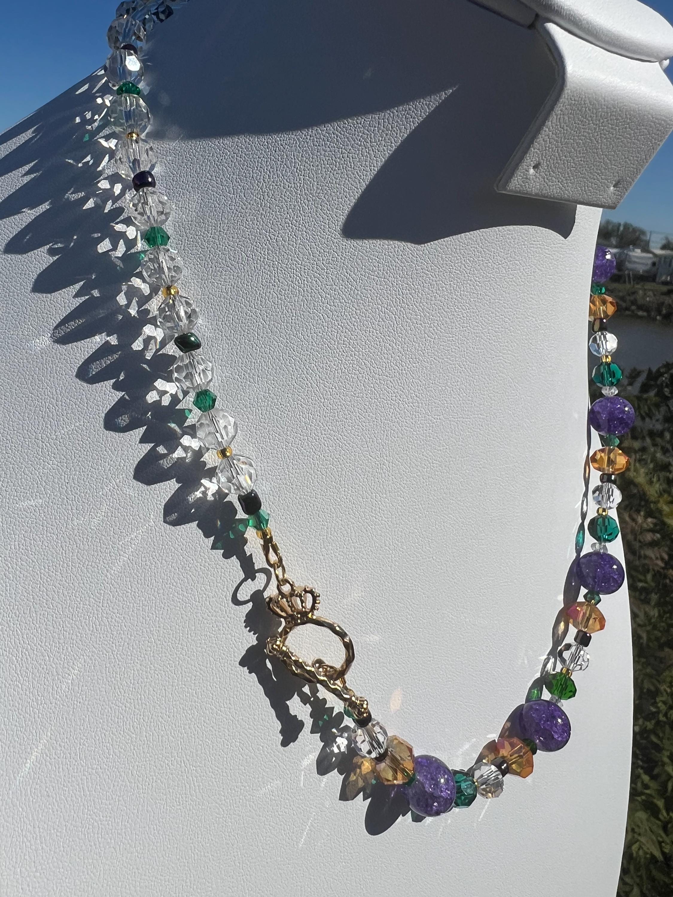 Celebrate Mardi Gras with a one-of-a-kind handcrafted necklace designed for versatility, color, and joyful expression. Each necklace in this collection is created using a vibrant mix of purple, green, and gold beads inspired by Carnival season, making it perfect for festive events, office celebrations, cruises, or everyday statement wear.