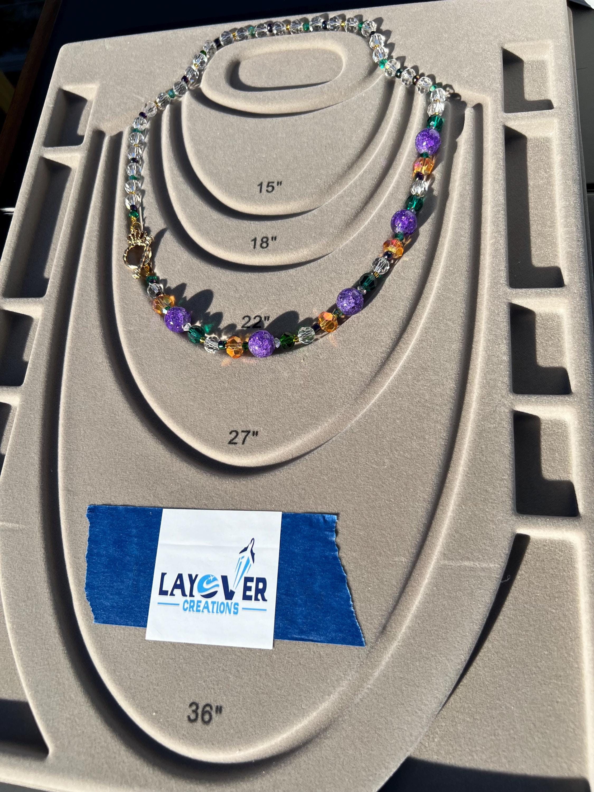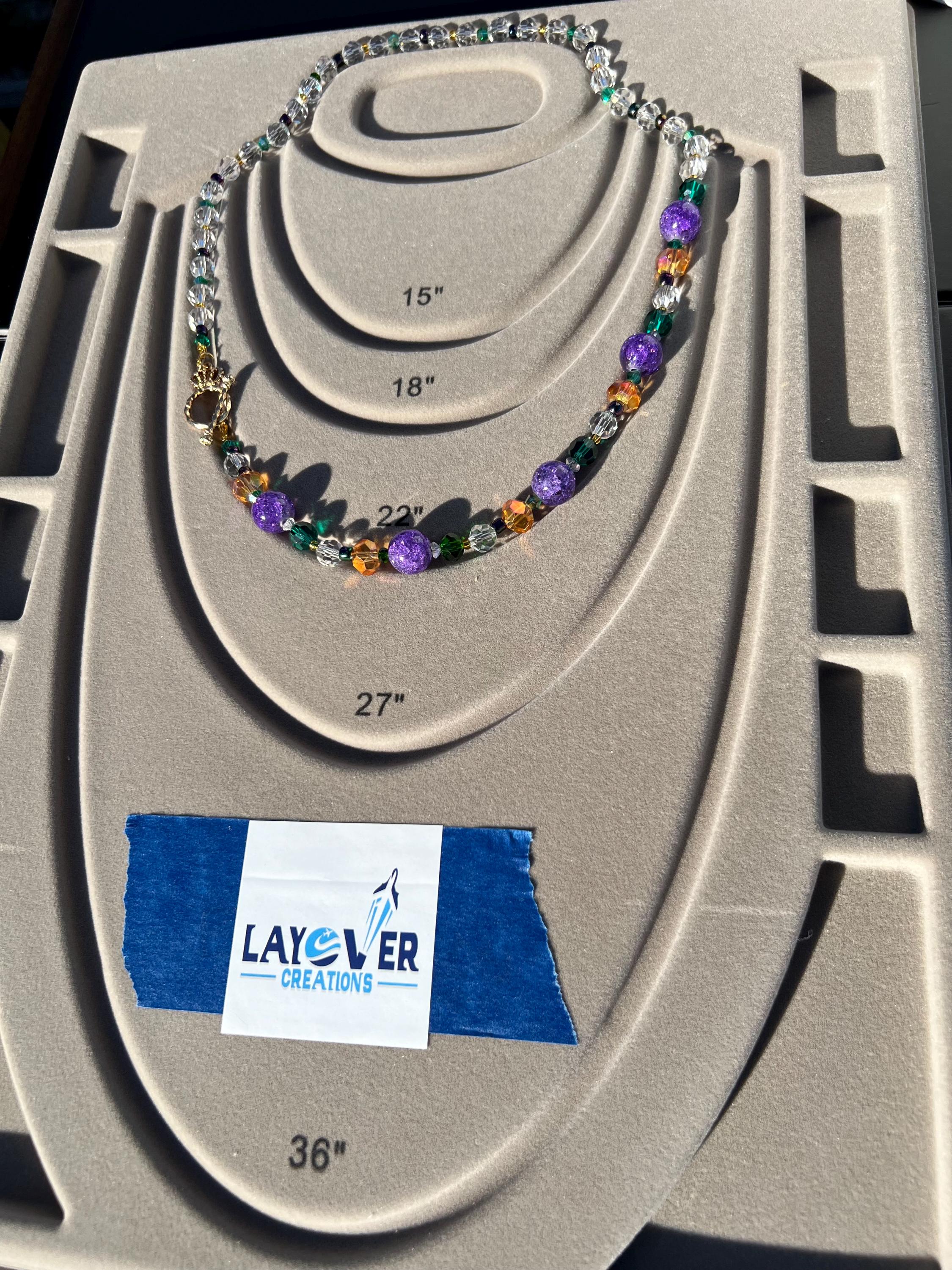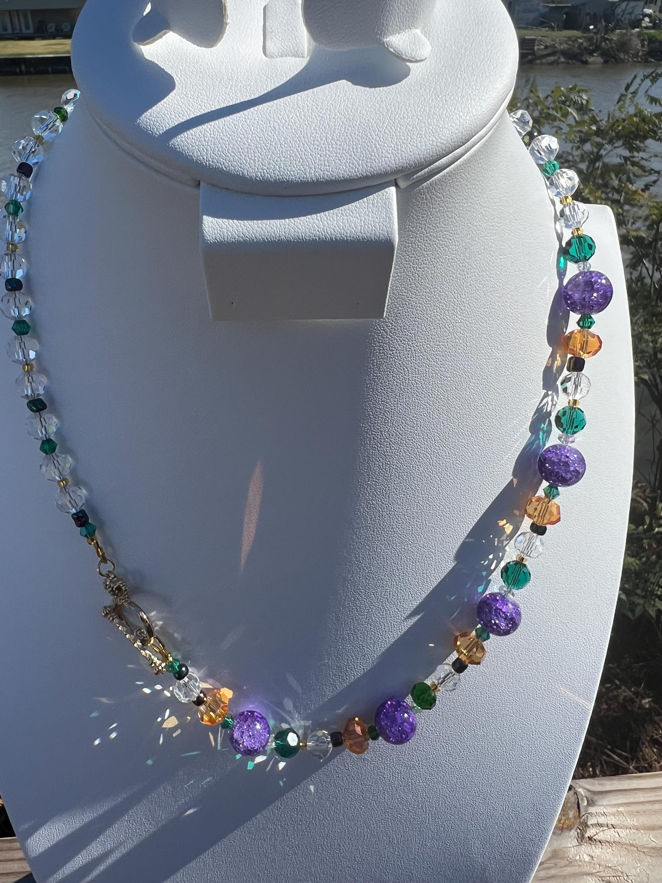 Celebrate Mardi Gras with a one-of-a-kind handcrafted necklace designed for versatility, color, and joyful expression. Each necklace in this collection is created using a vibrant mix of purple, green, and gold beads inspired by Carnival season, making it perfect for festive events, office celebrations, cruises, or everyday statement wear.