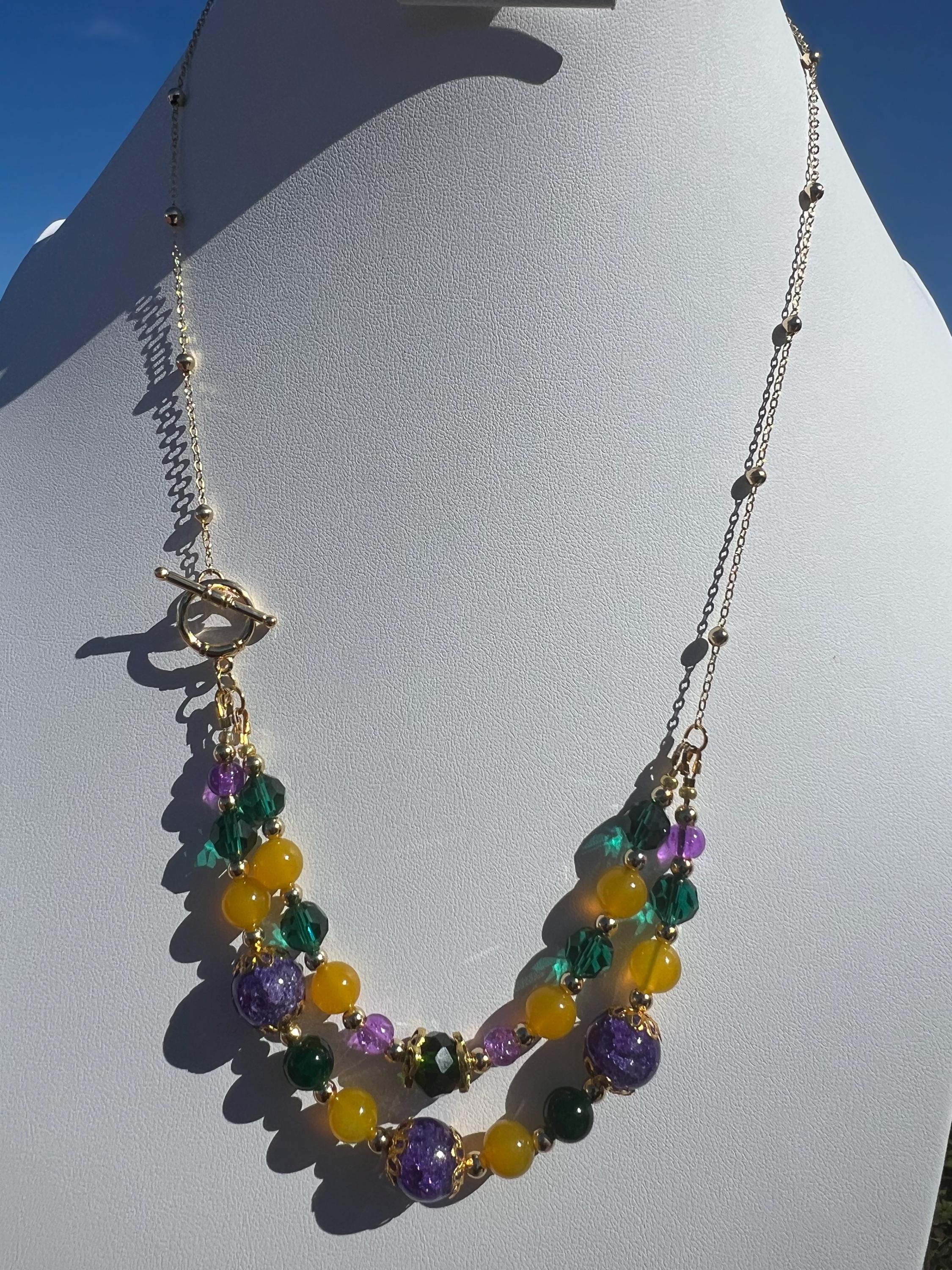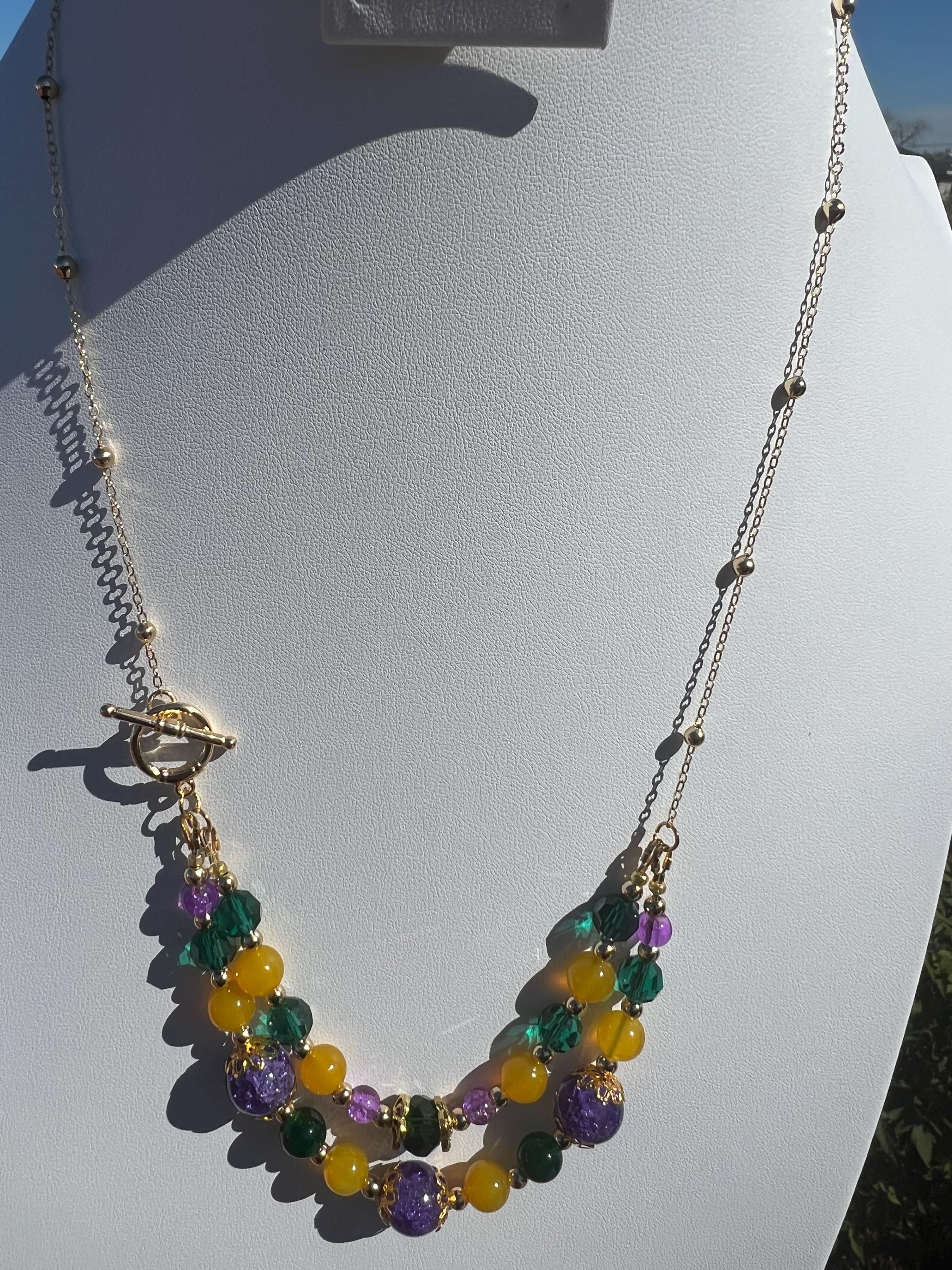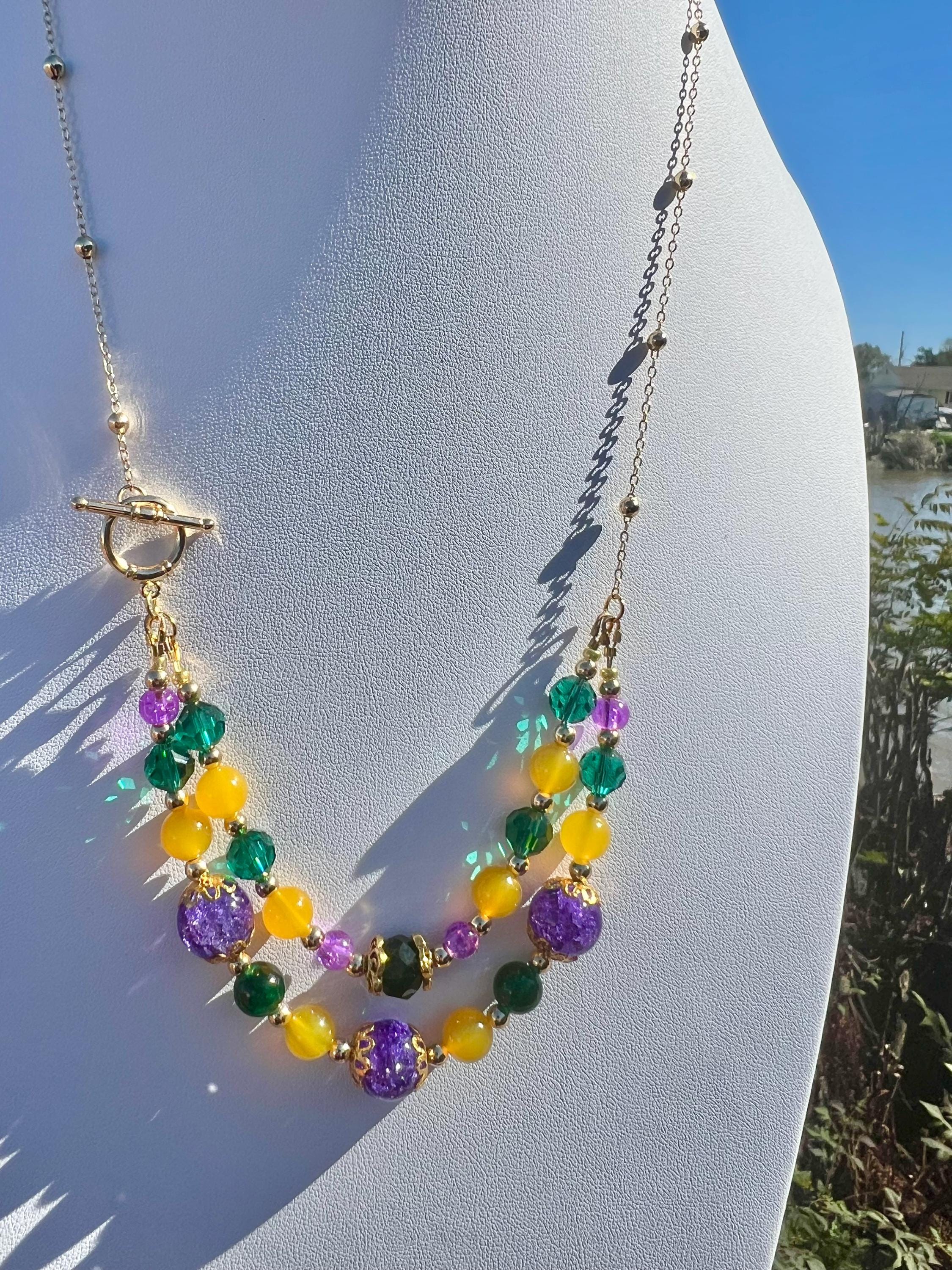 Celebrate Mardi Gras with a one-of-a-kind handcrafted necklace designed for versatility, color, and joyful expression. Each necklace in this collection is created using a vibrant mix of purple, green, and gold beads inspired by Carnival season, making it perfect for festive events, office celebrations, cruises, or everyday statement wear.