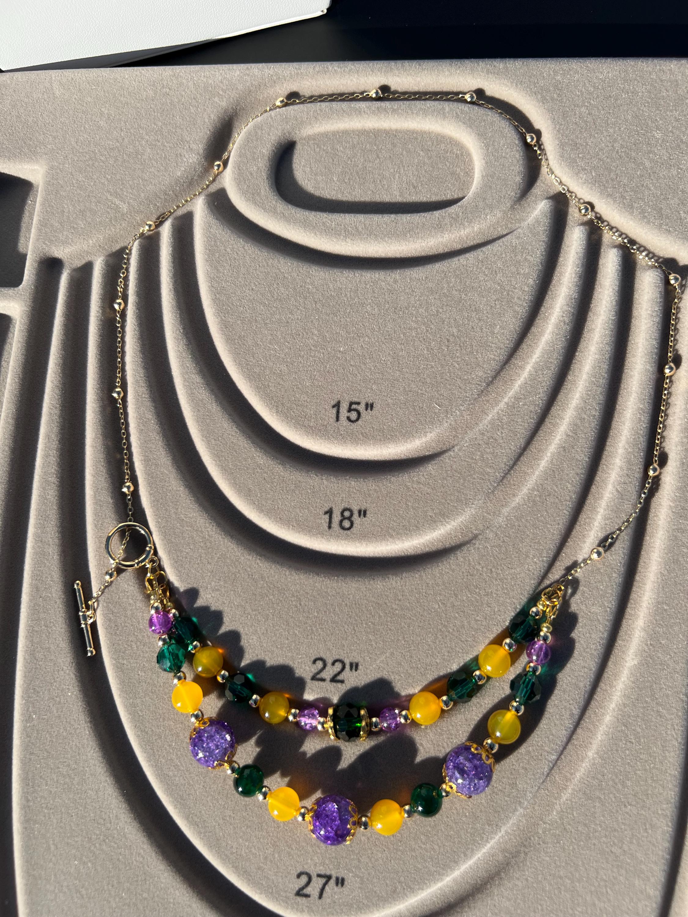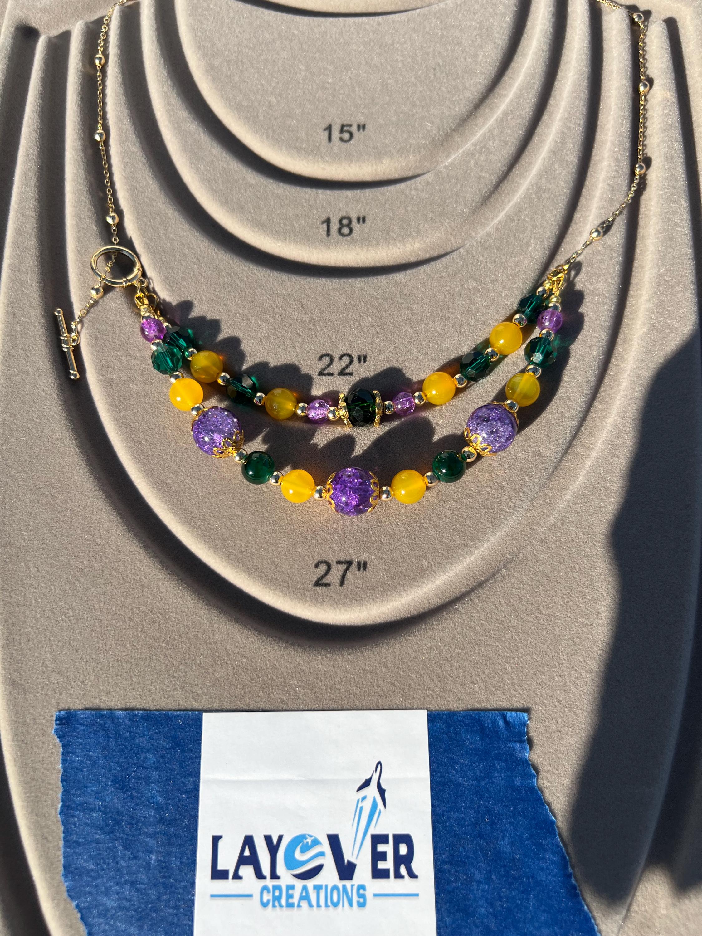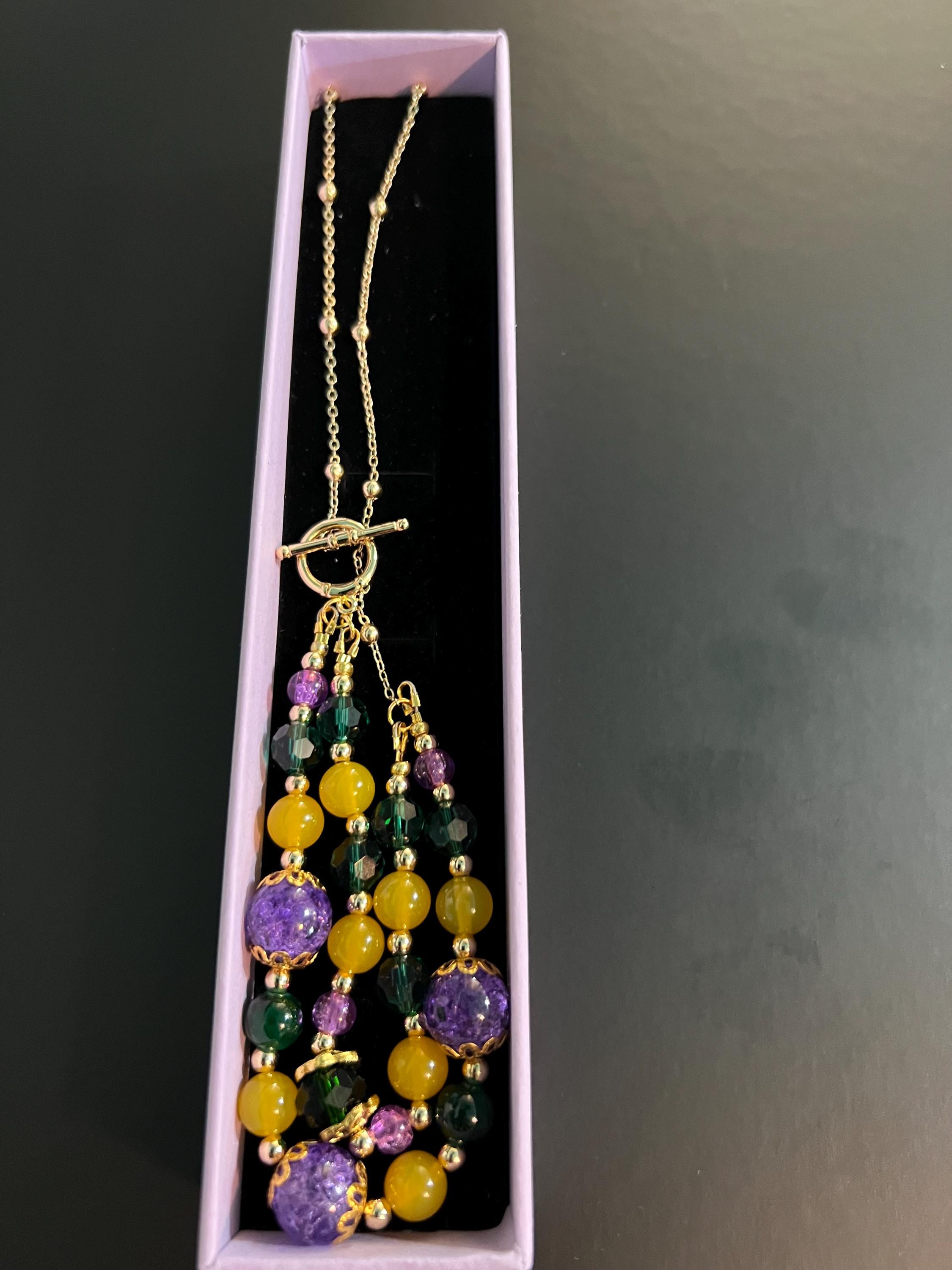 Celebrate Mardi Gras with a one-of-a-kind handcrafted necklace designed for versatility, color, and joyful expression. Each necklace in this collection is created using a vibrant mix of purple, green, and gold beads inspired by Carnival season, making it perfect for festive events, office celebrations, cruises, or everyday statement wear.