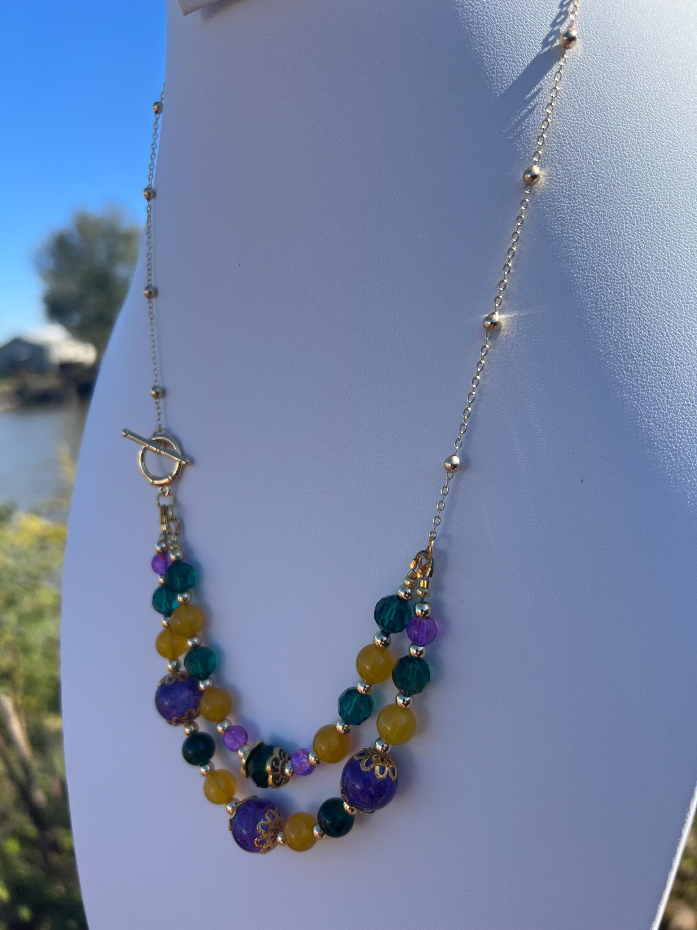 23” Handmade Double Strand Mardi Gras Necklace – Glass, Stone & Metal Beads with 14k Gold Chain, Toggle Clasp
