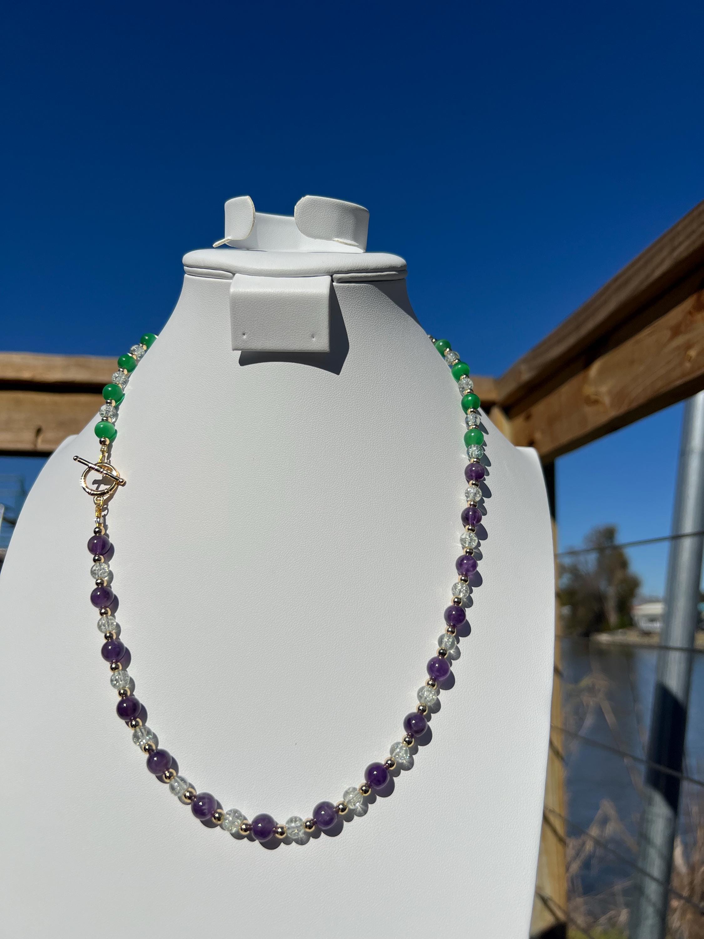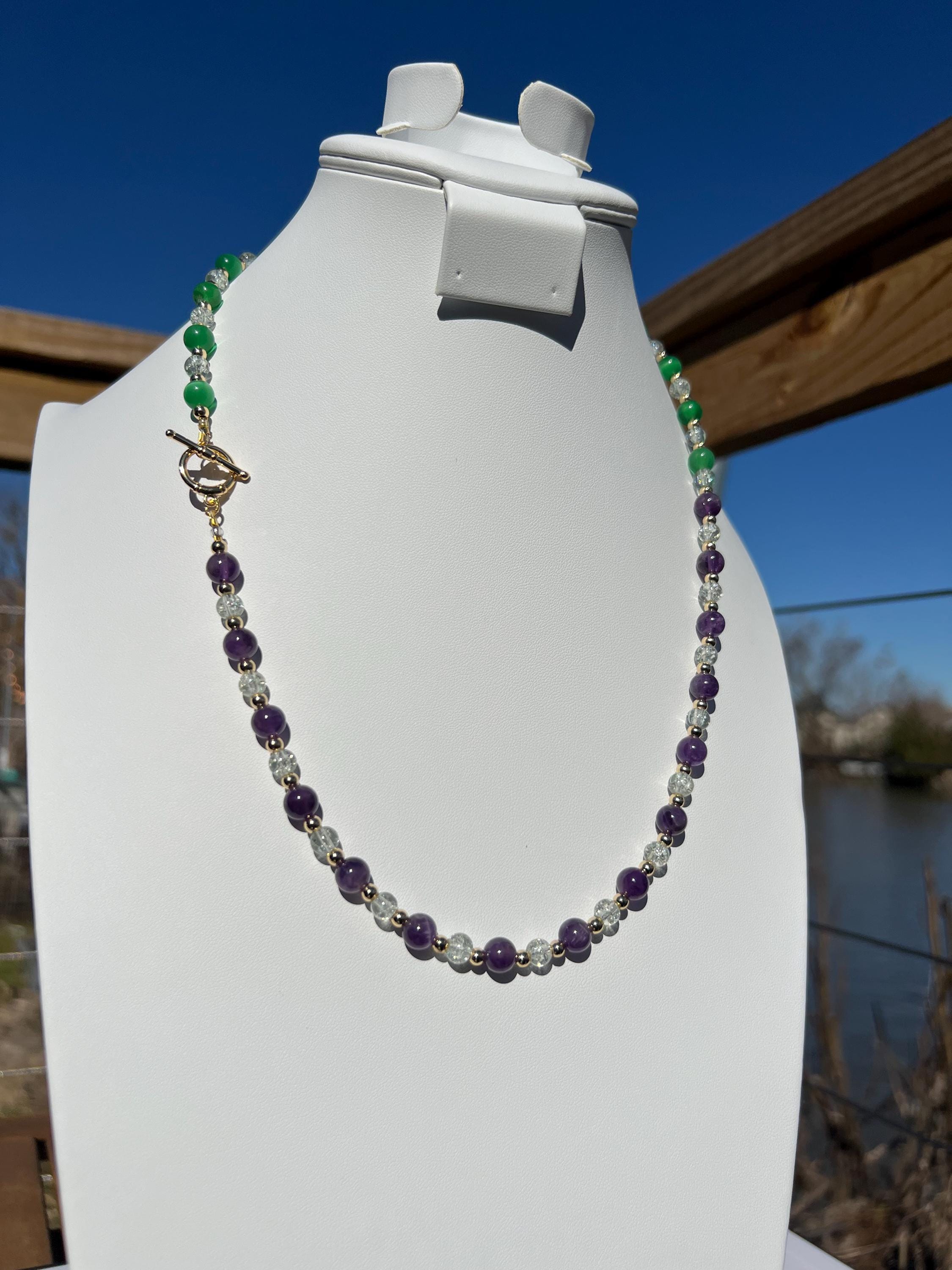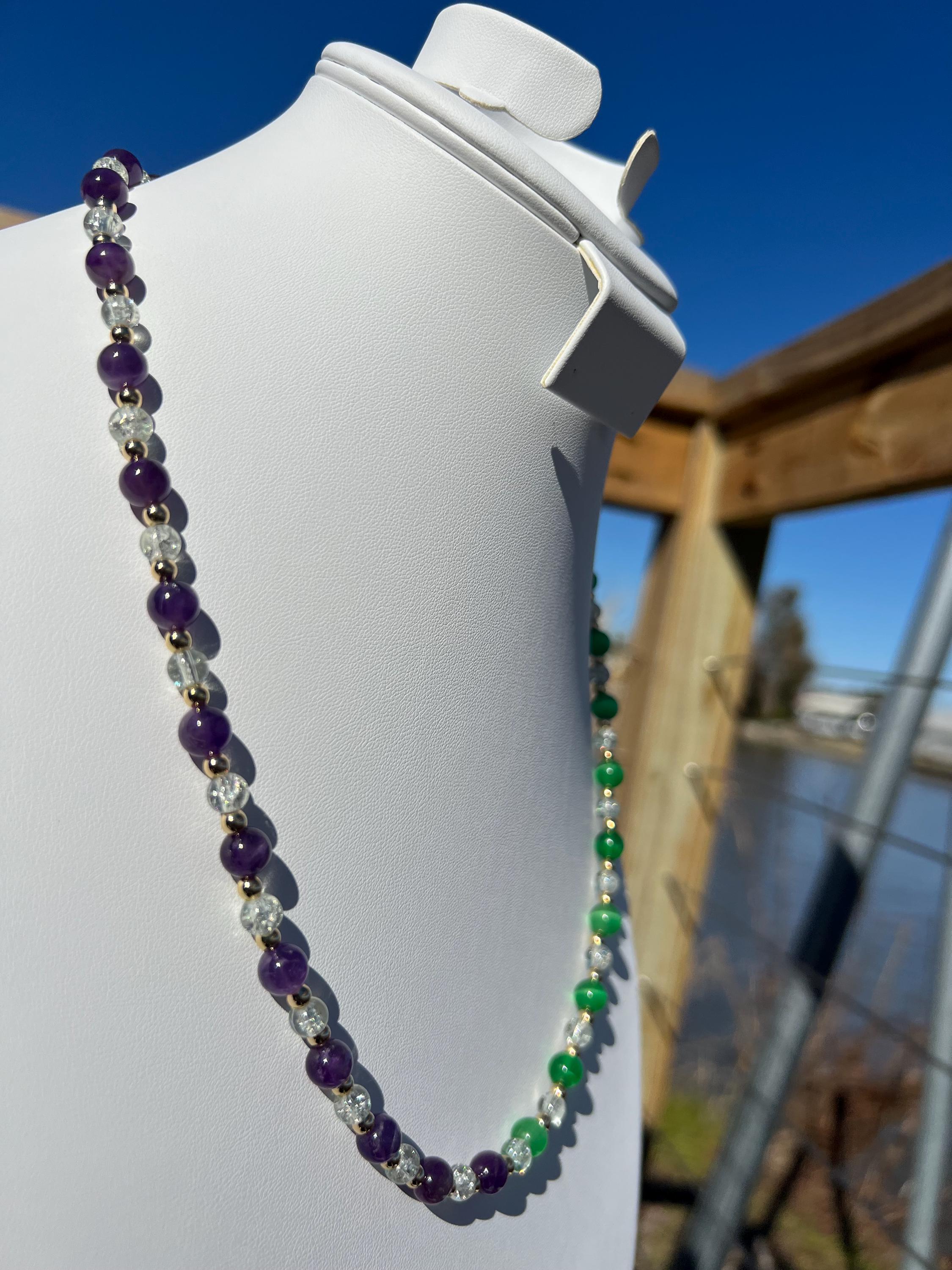 23” Mardi Gras Necklace – Purple-Green-Gold Stone-Glass-Metal Beads with Toggle Clasp,