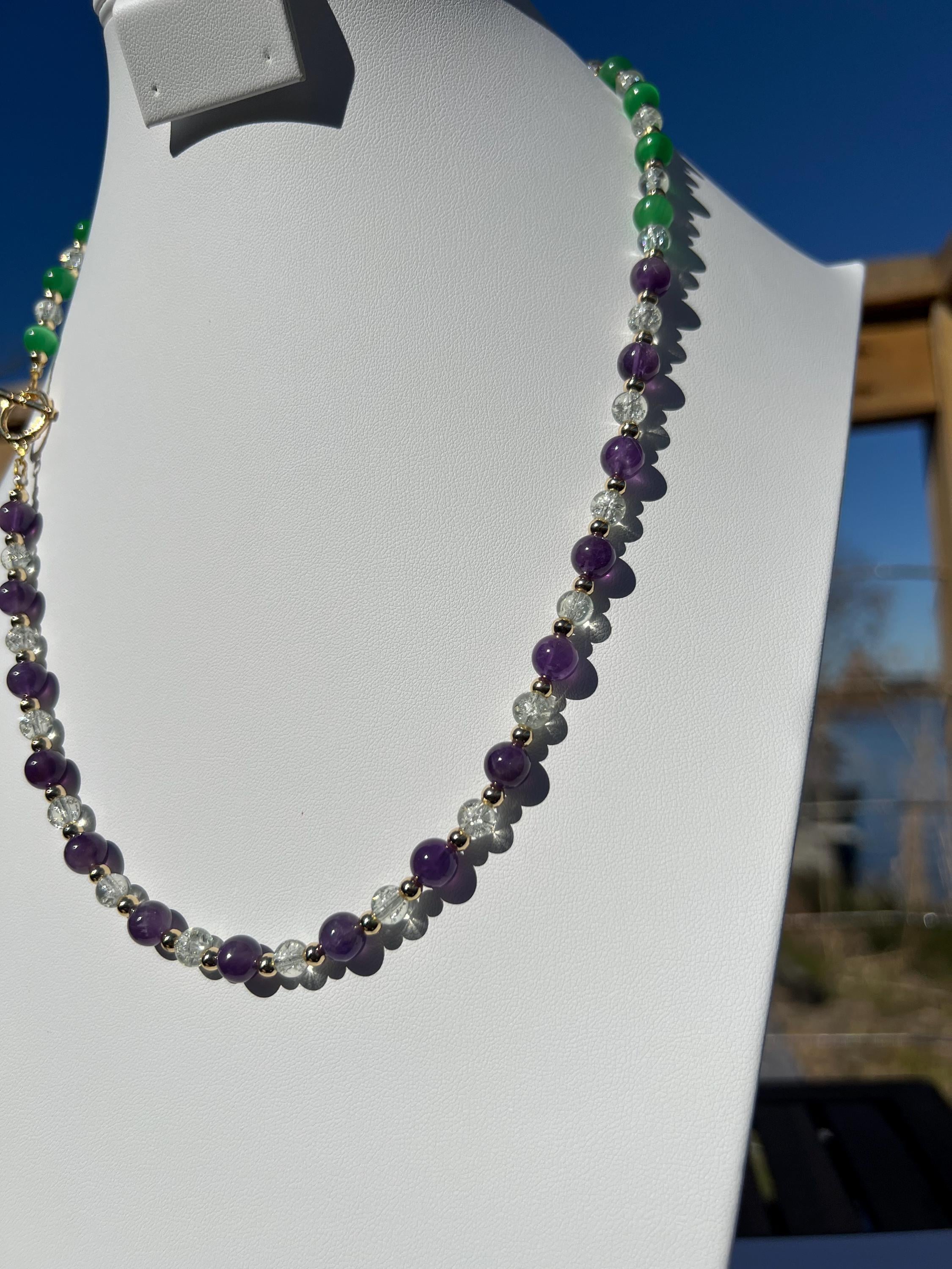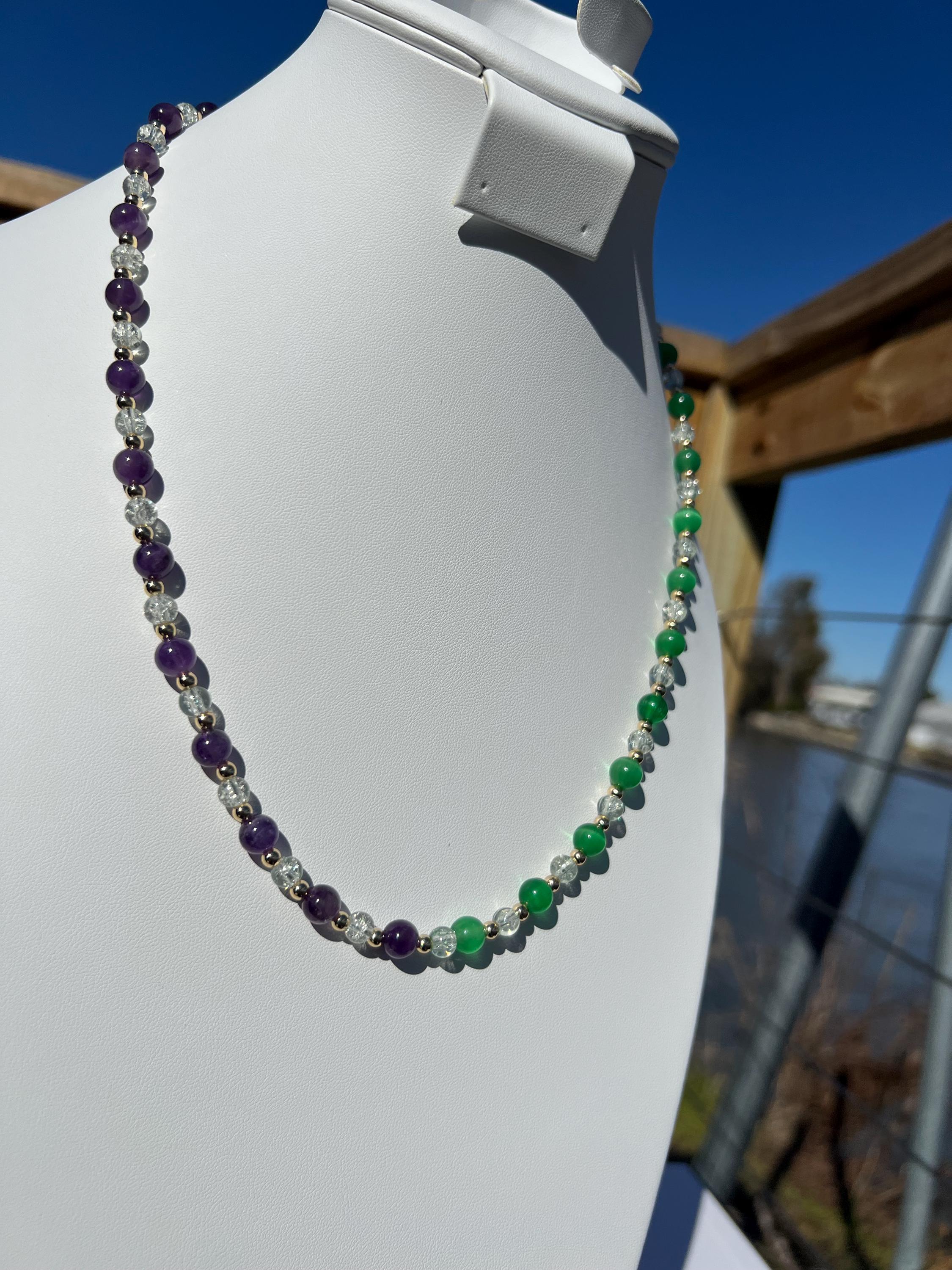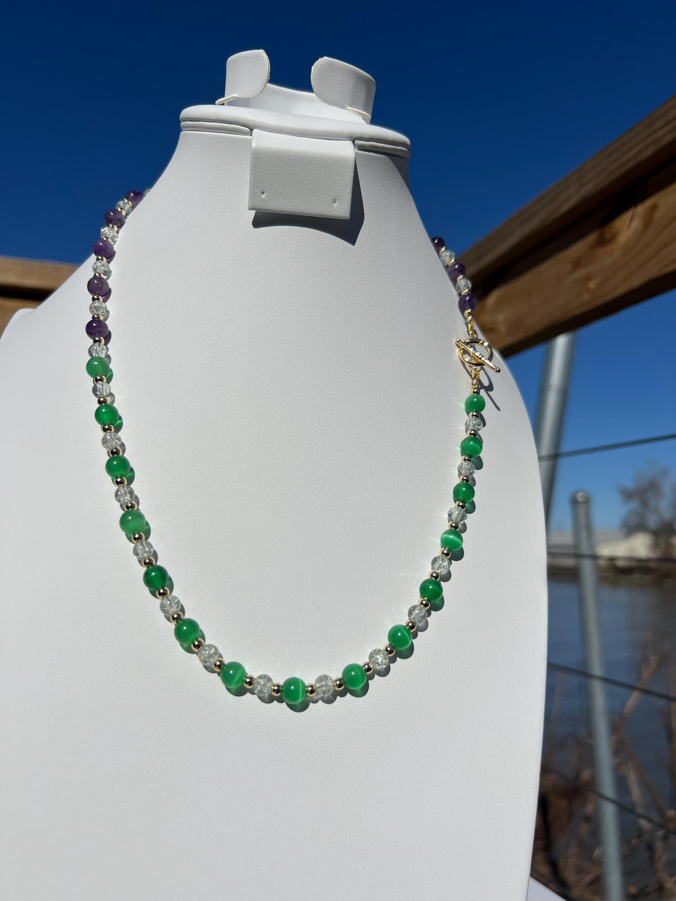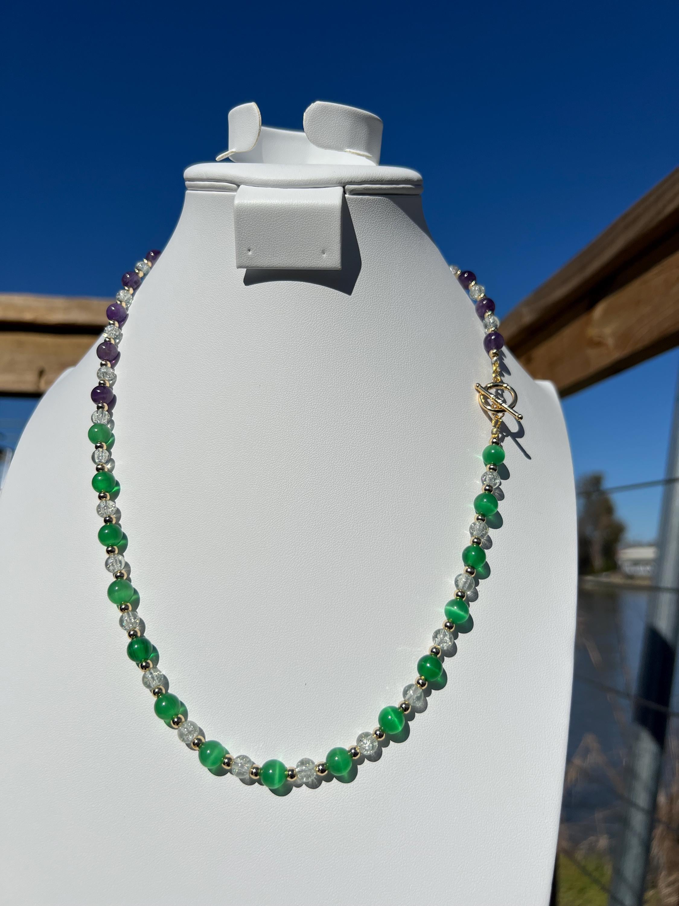 23” Mardi Gras Necklace – Purple-Green-Gold Stone-Glass-Metal Beads with Toggle Clasp,