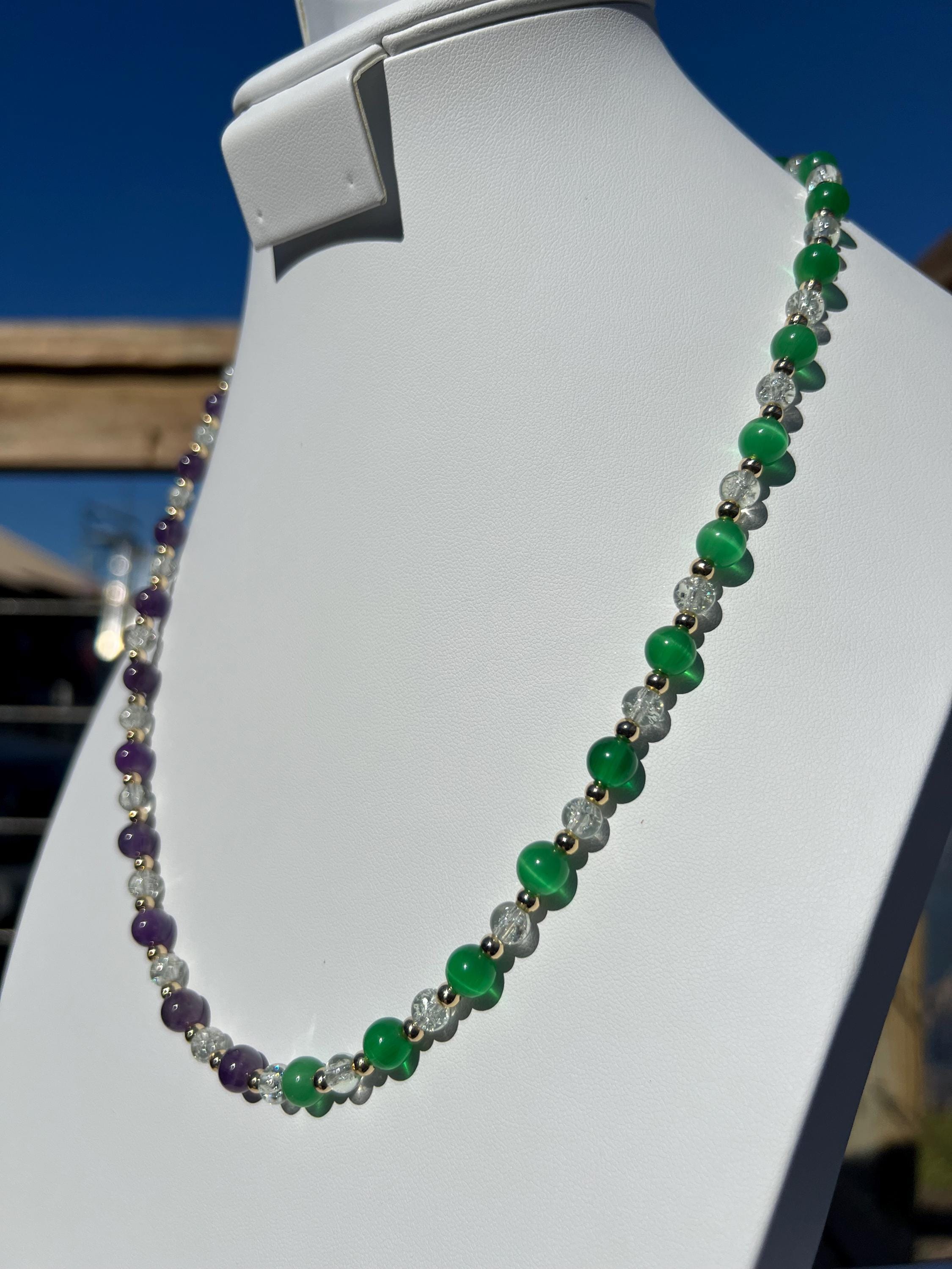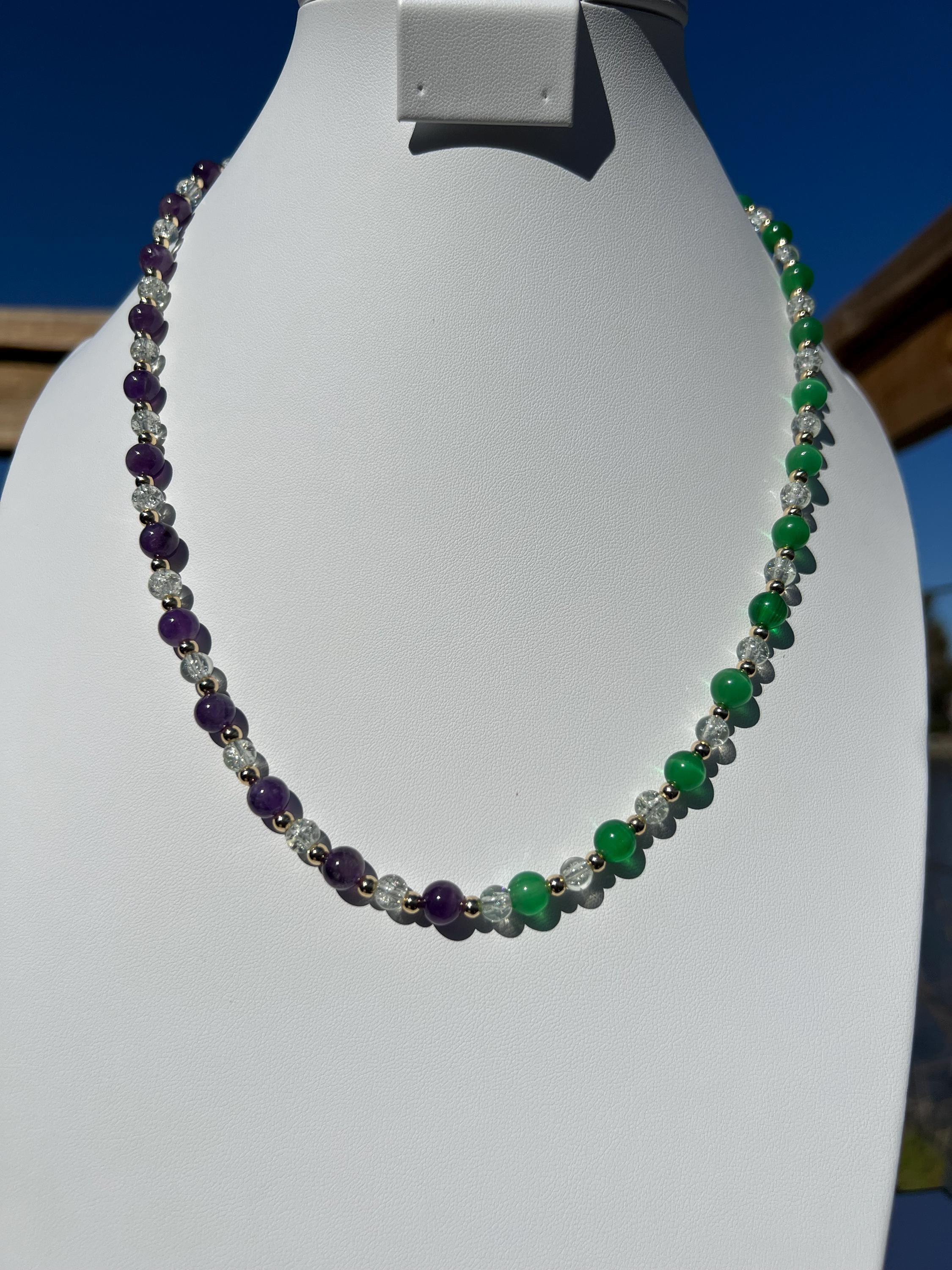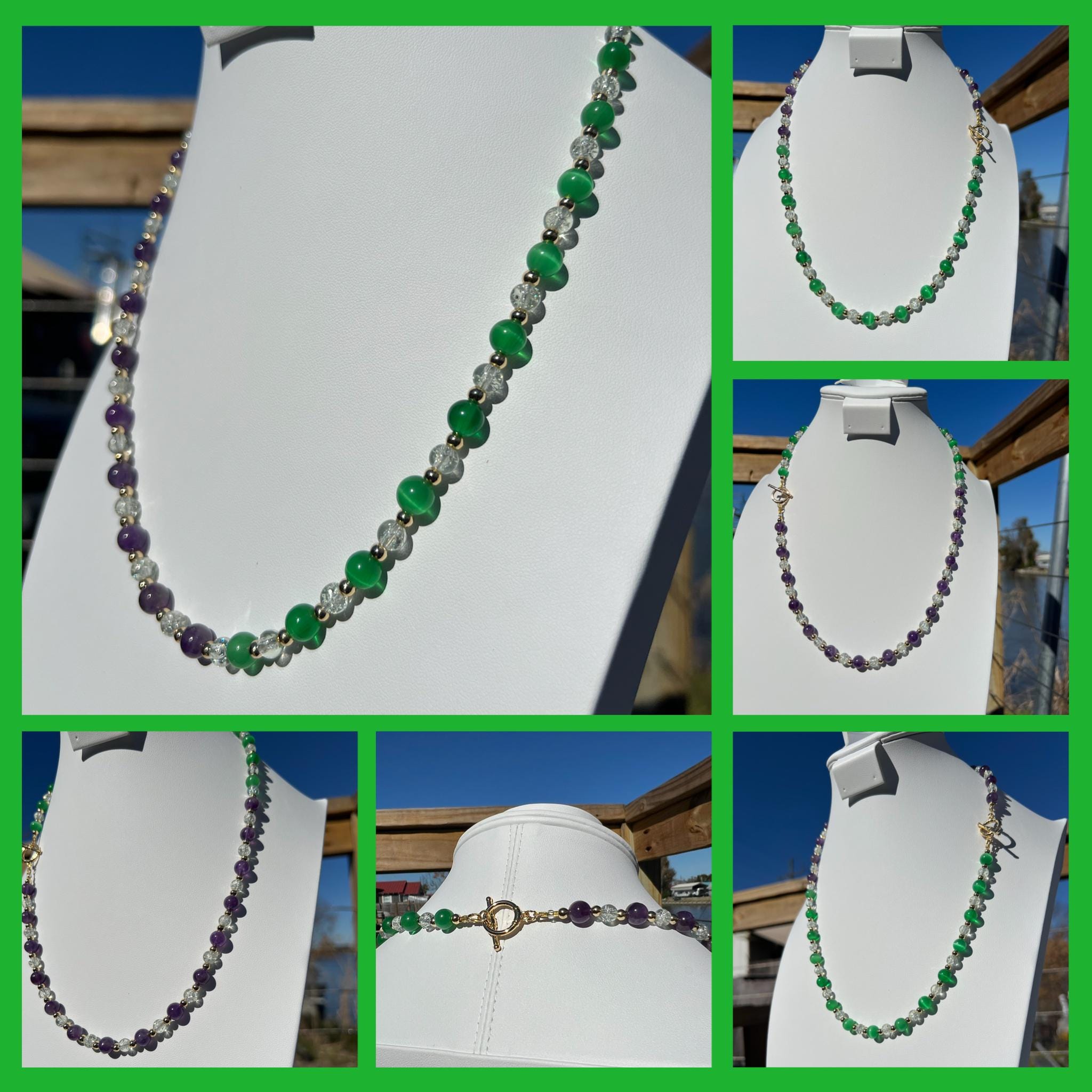 Celebrate Mardi Gras with a one-of-a-kind handcrafted necklace designed for versatility, color, and joyful expression. Each necklace in this collection is created using a vibrant mix of purple, green, and gold beads inspired by Carnival season, making it perfect for festive events, office celebrations, cruises, or everyday statement wear.