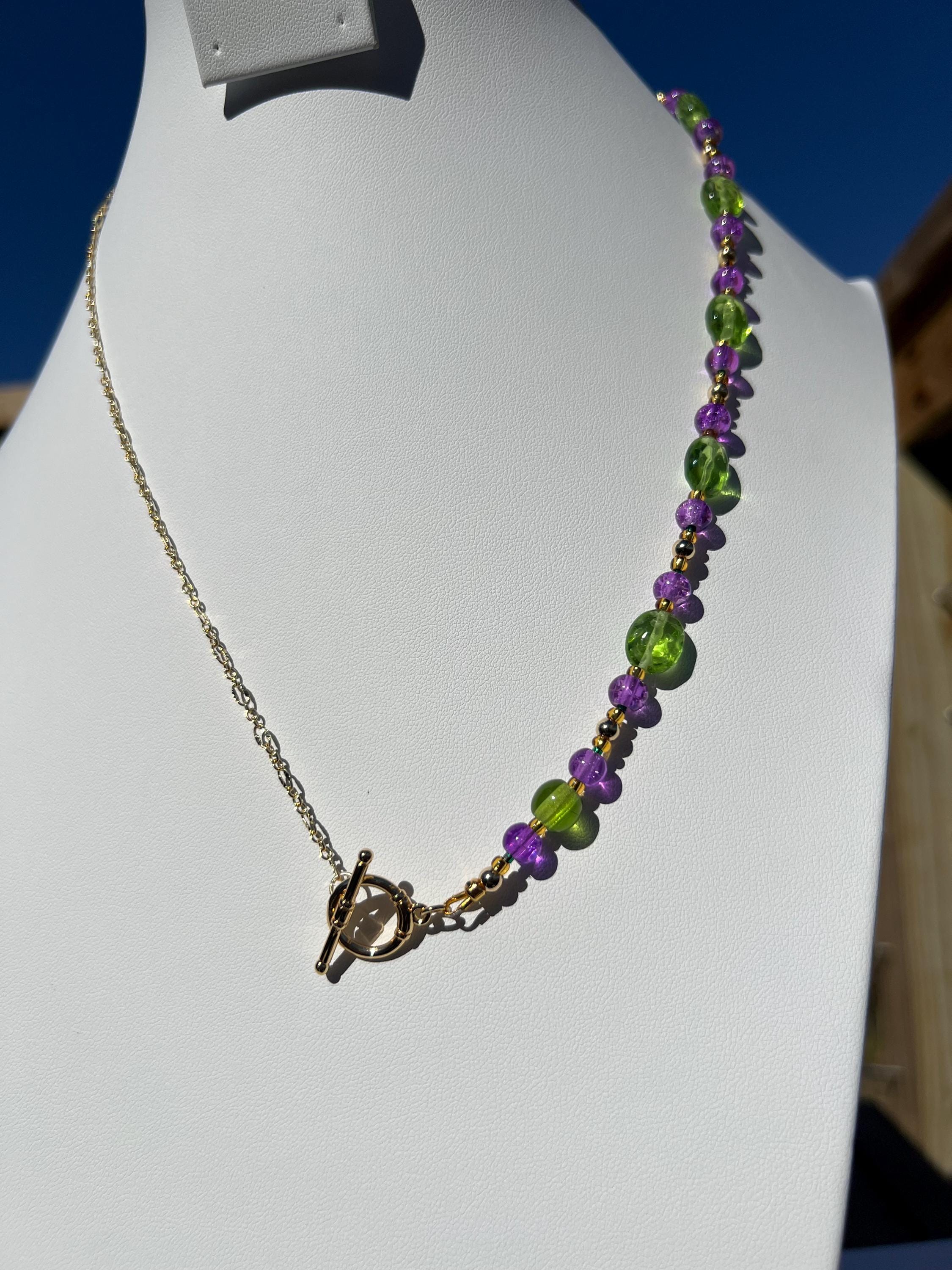 22” Asymmetric Chain and Glass Bead Mardi Gras Necklace – Toggle Clasp Handmade Jewelry