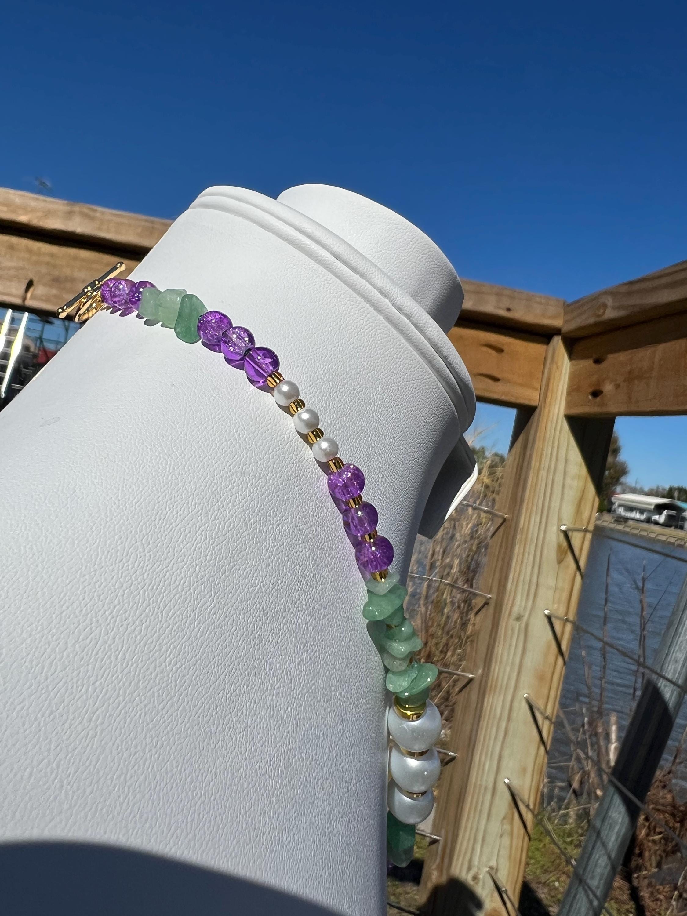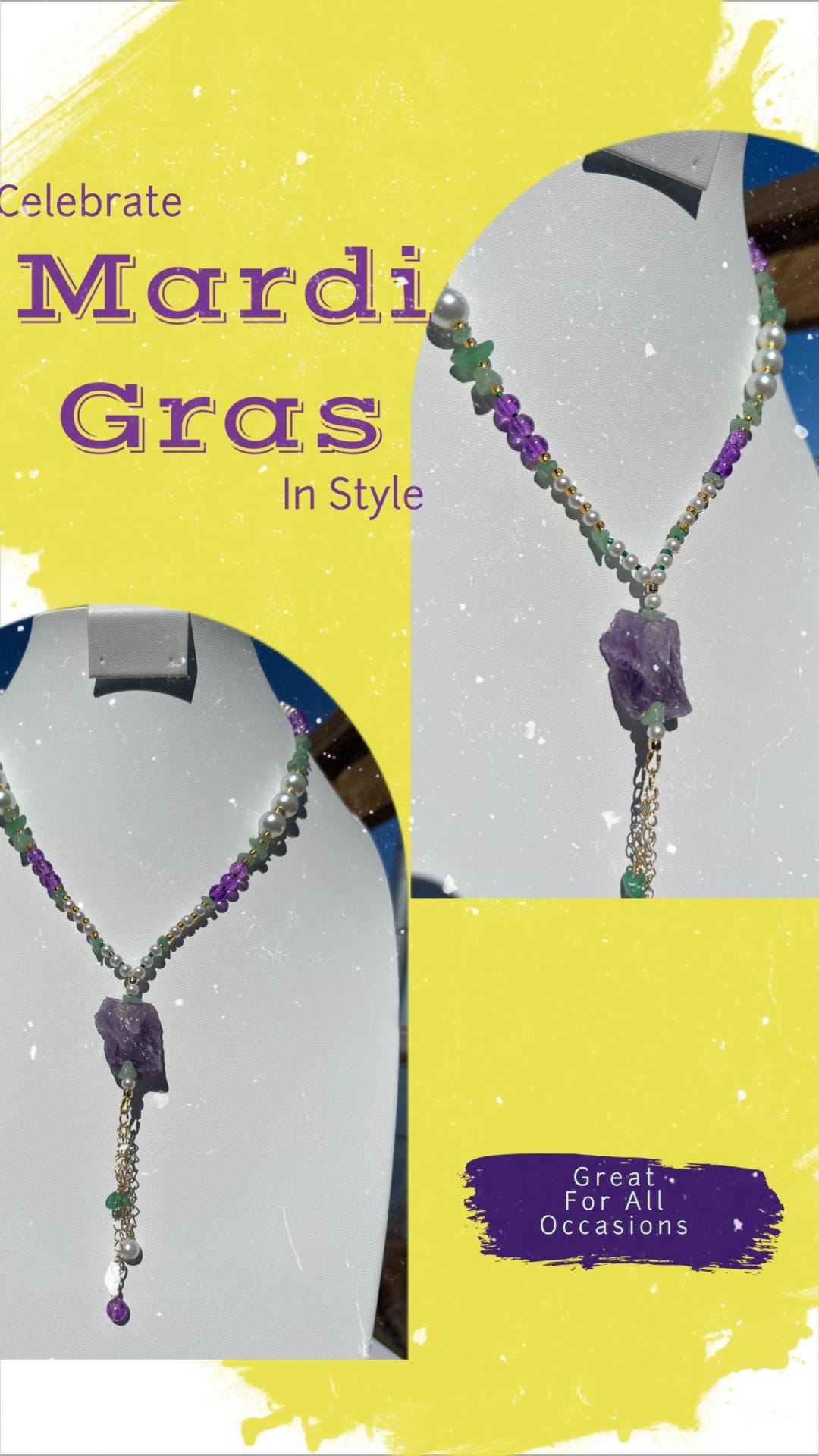 Celebrate Mardi Gras with a one-of-a-kind handcrafted necklace designed for versatility, color, and joyful expression. Each necklace in this collection is created using a vibrant mix of purple, green, and gold beads inspired by Carnival season, making it perfect for festive events, office celebrations, cruises, or everyday statement wear.