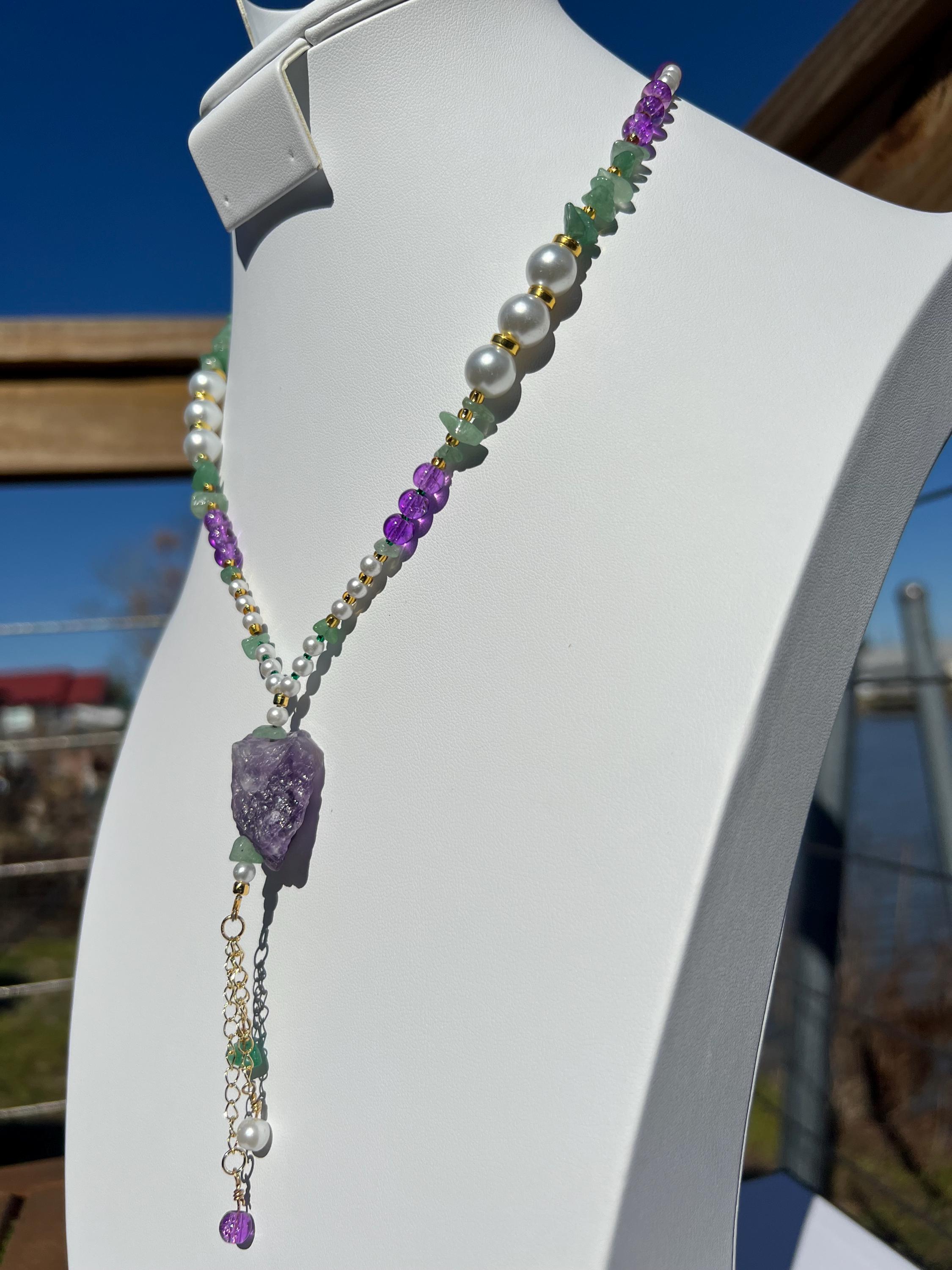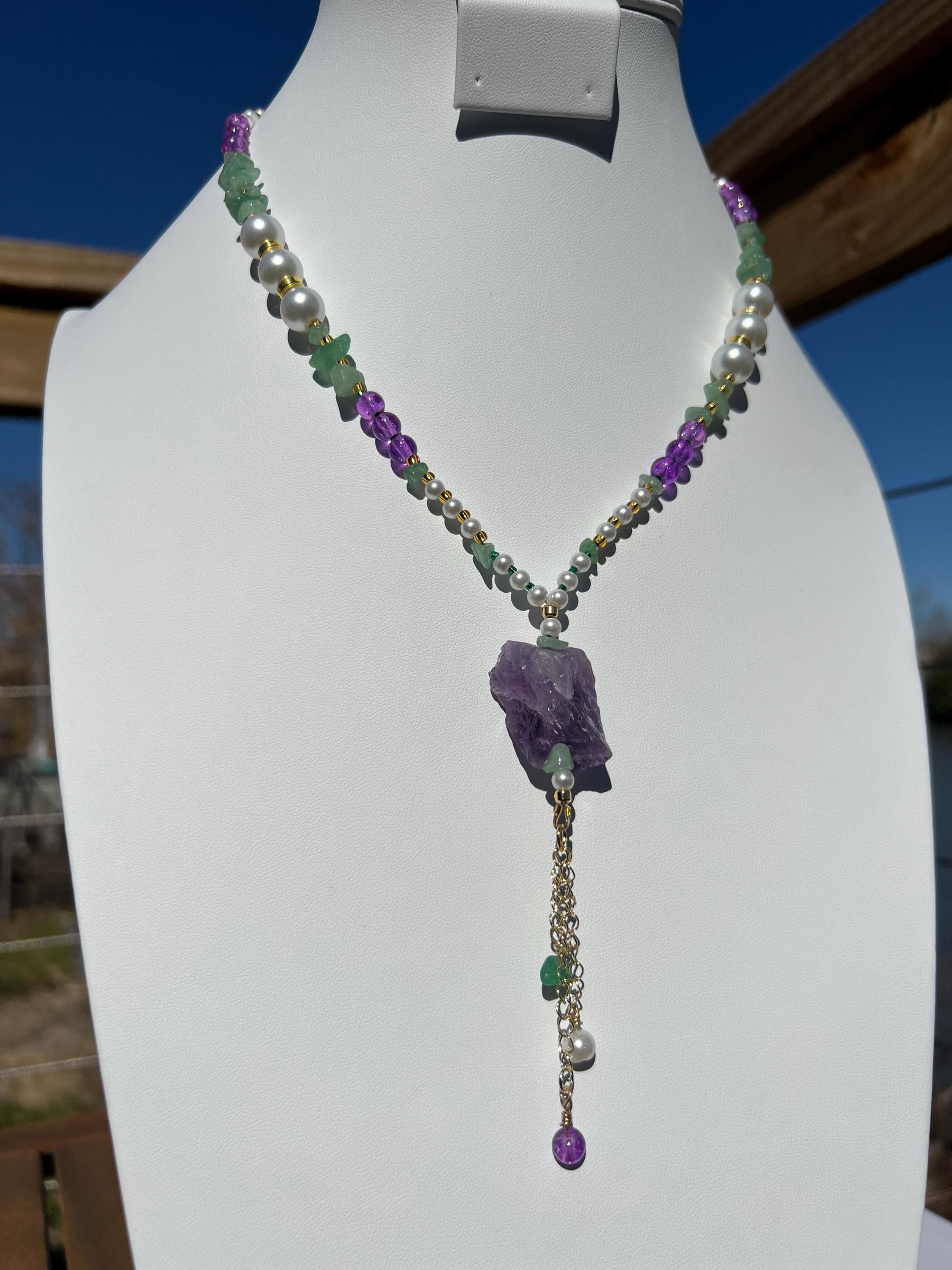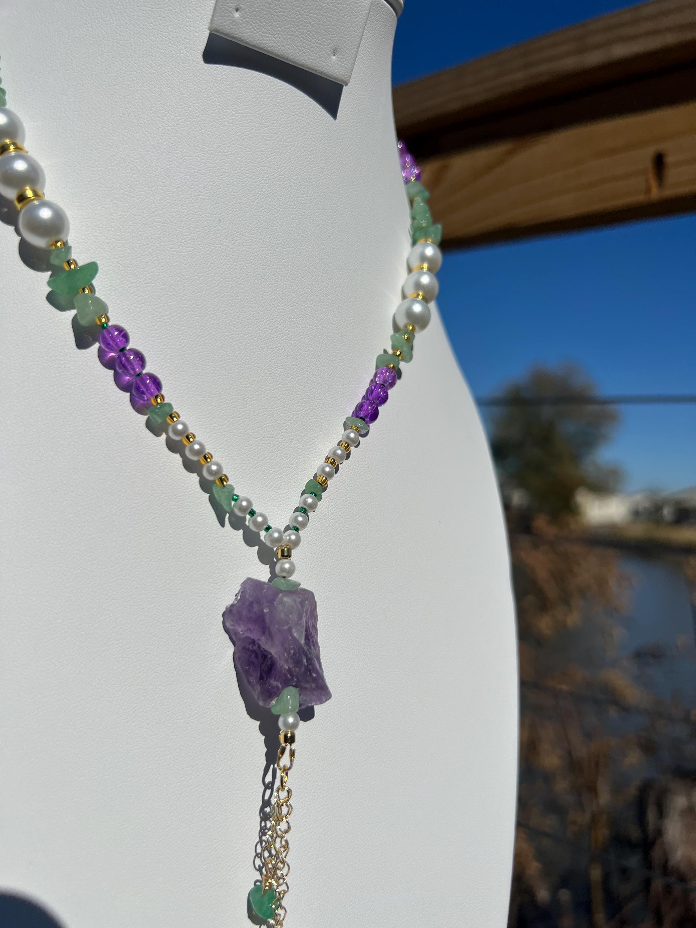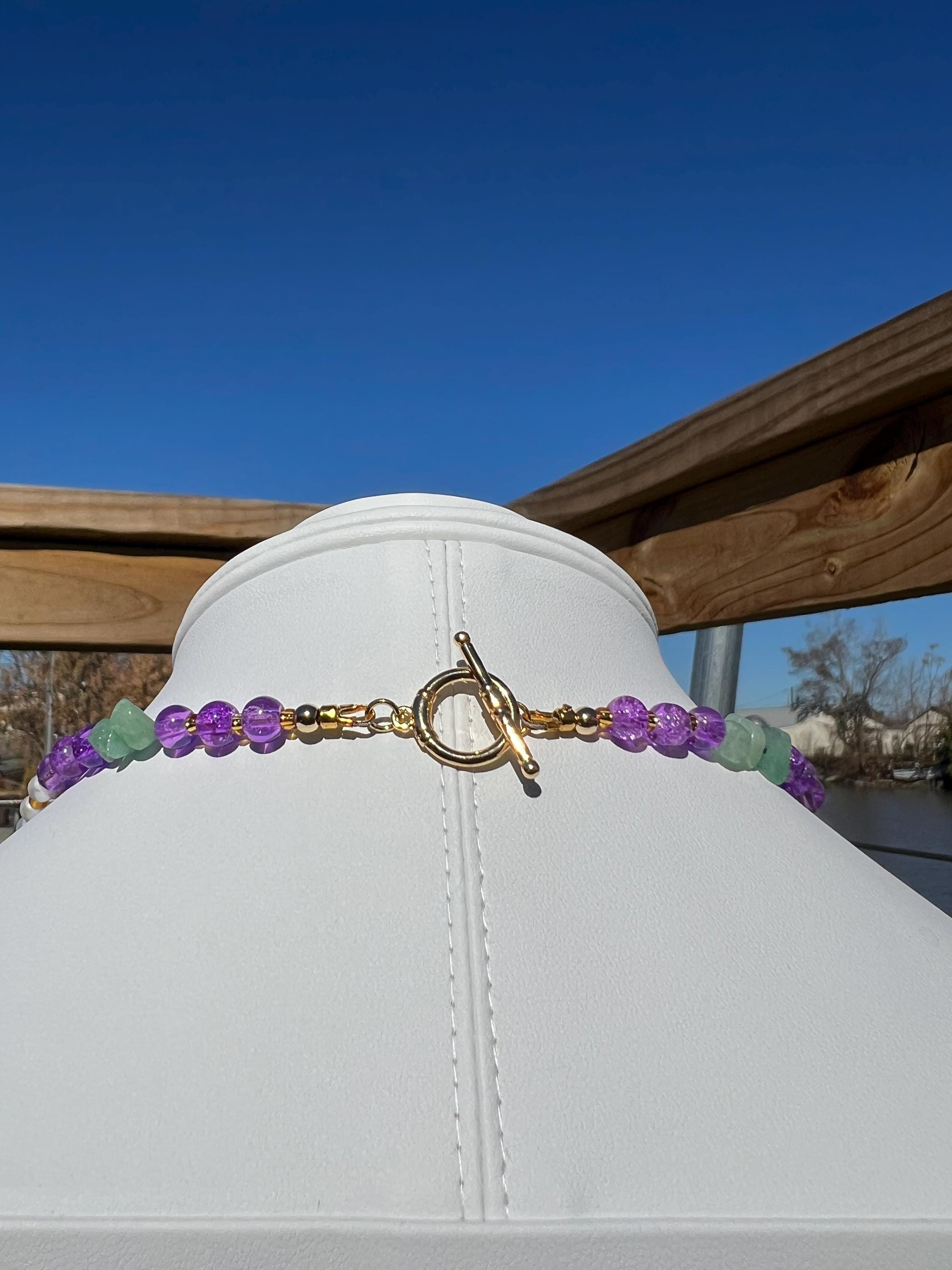 18” Mardi Gras Necklace with Amethyst Pendant– Purple-Green-Gold-Faux Pearl Stone-Glass-Metal Beads with Toggle Clasp,