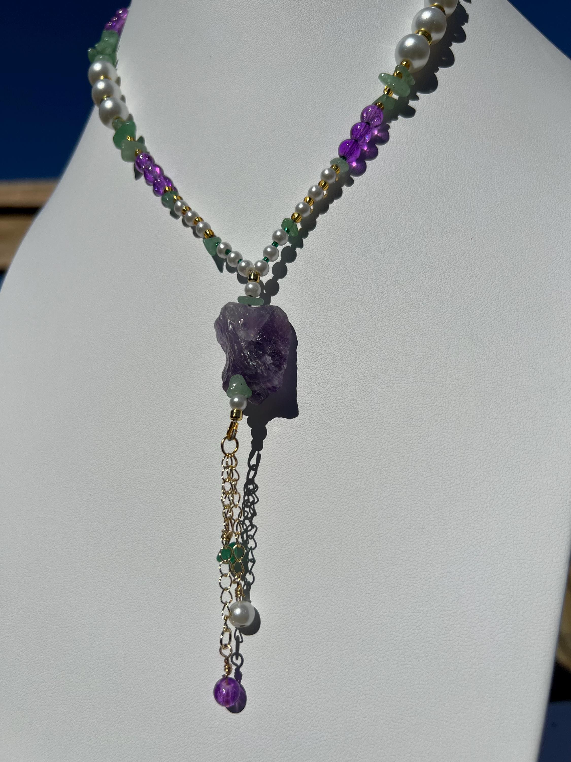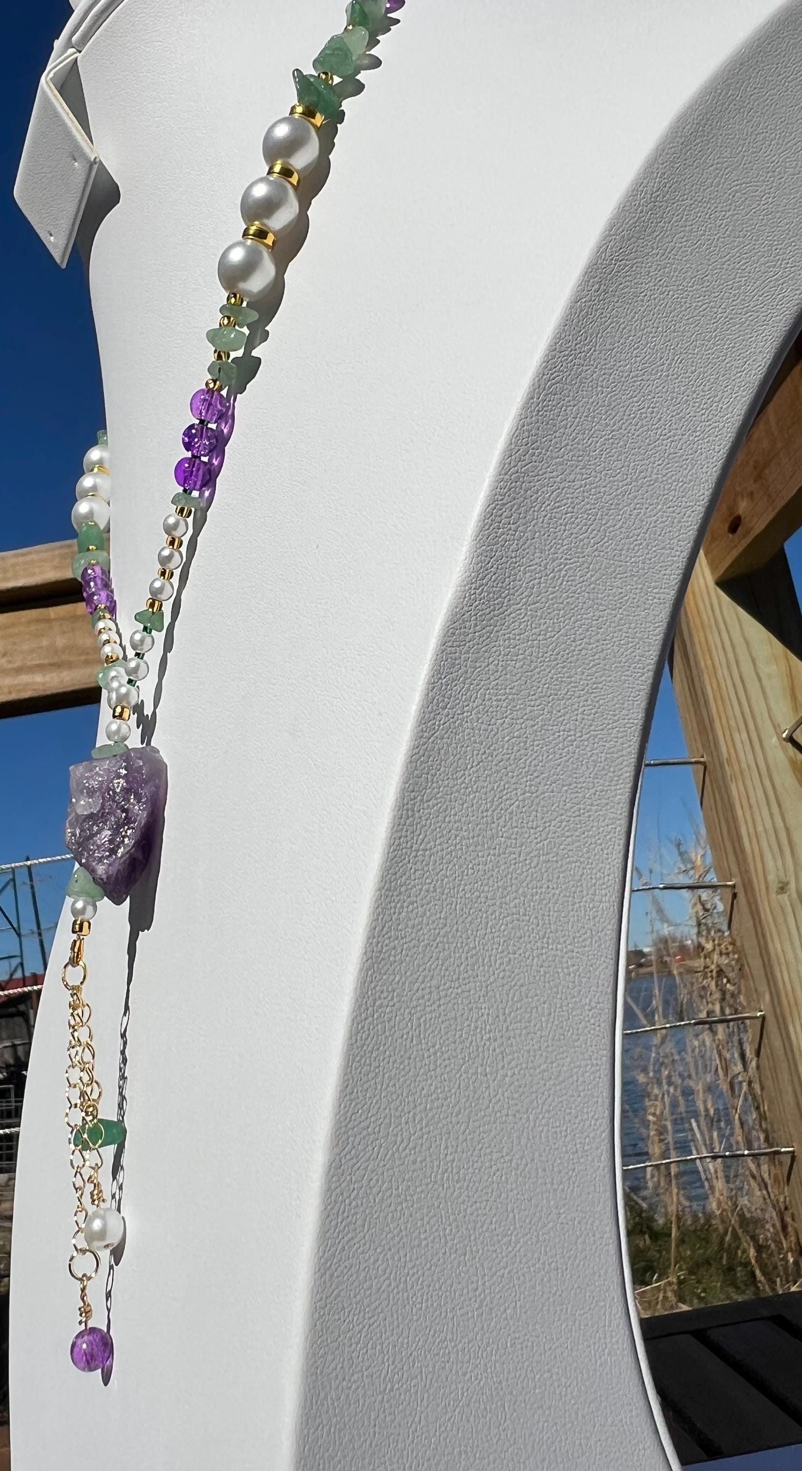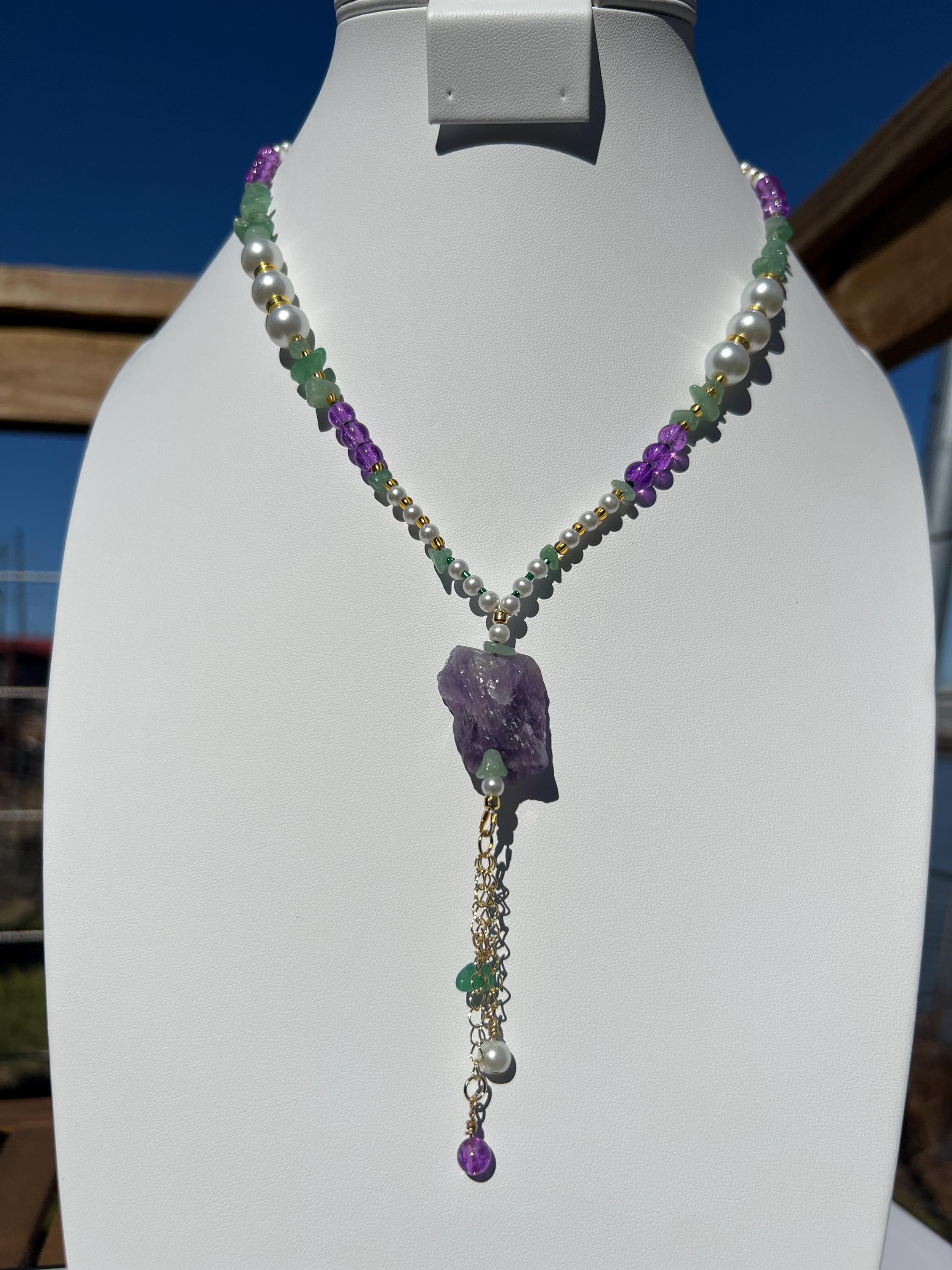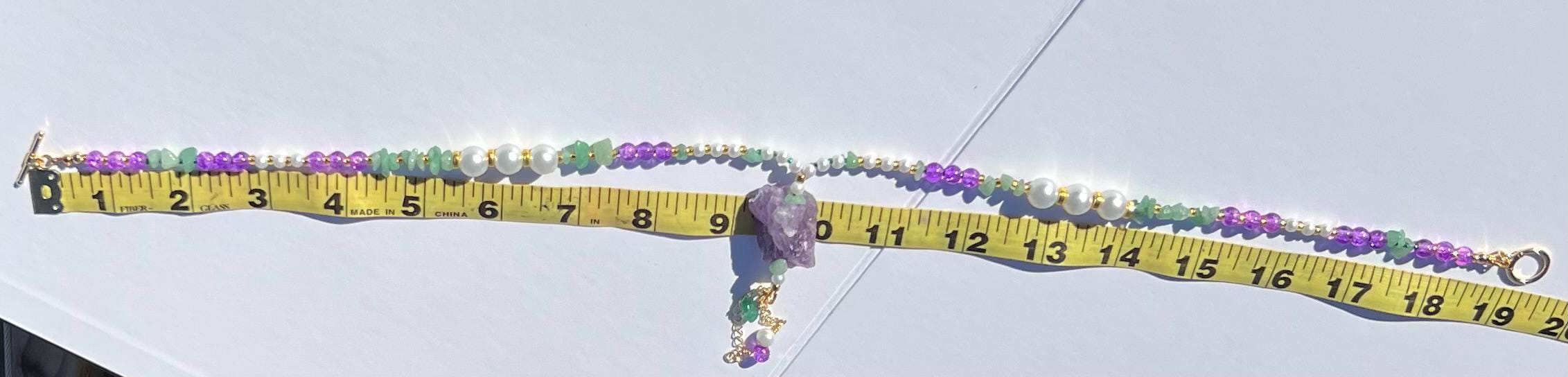 18” Mardi Gras Necklace with Amethyst Pendant– Purple-Green-Gold-Faux Pearl Stone-Glass-Metal Beads with Toggle Clasp,