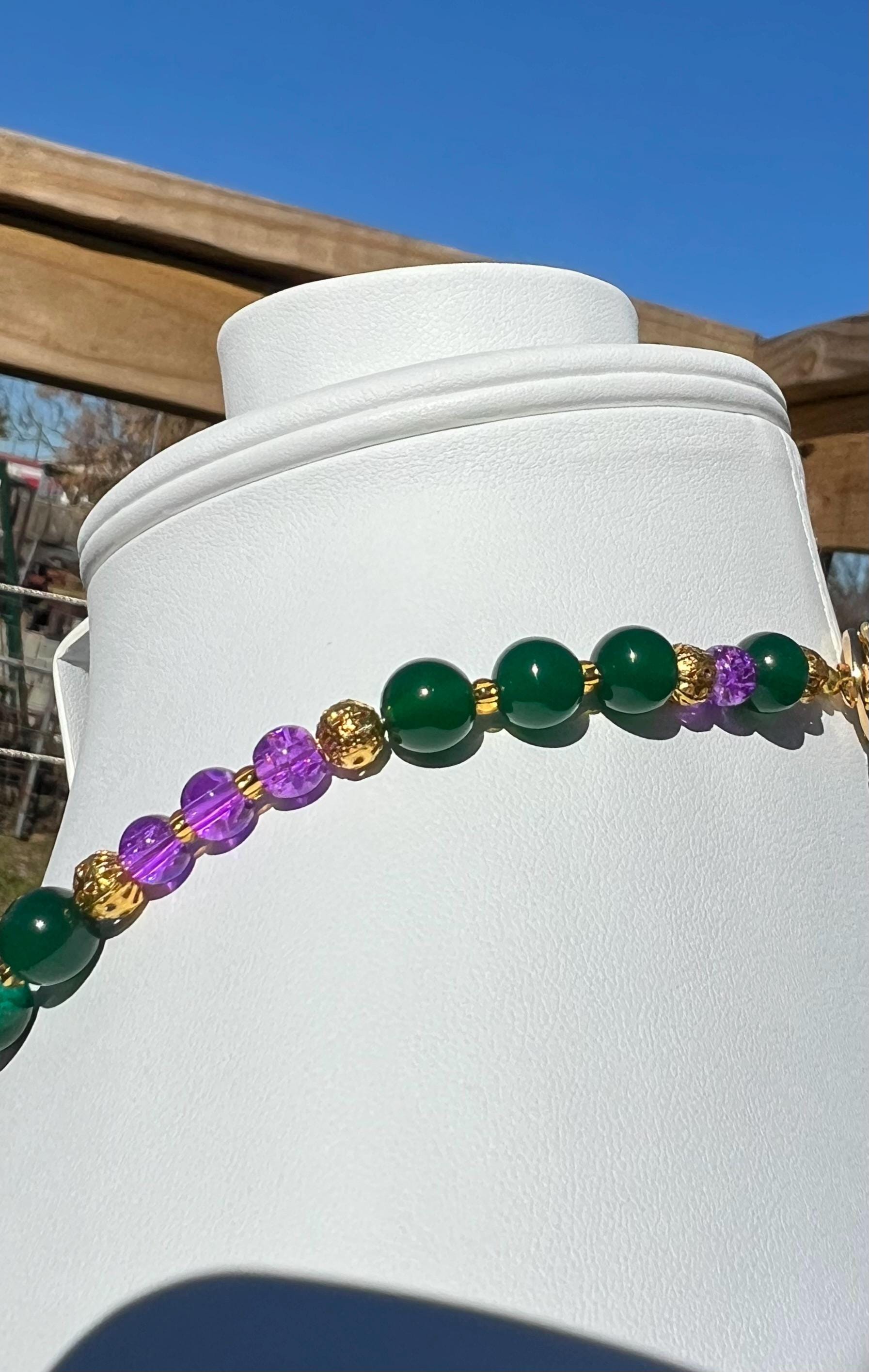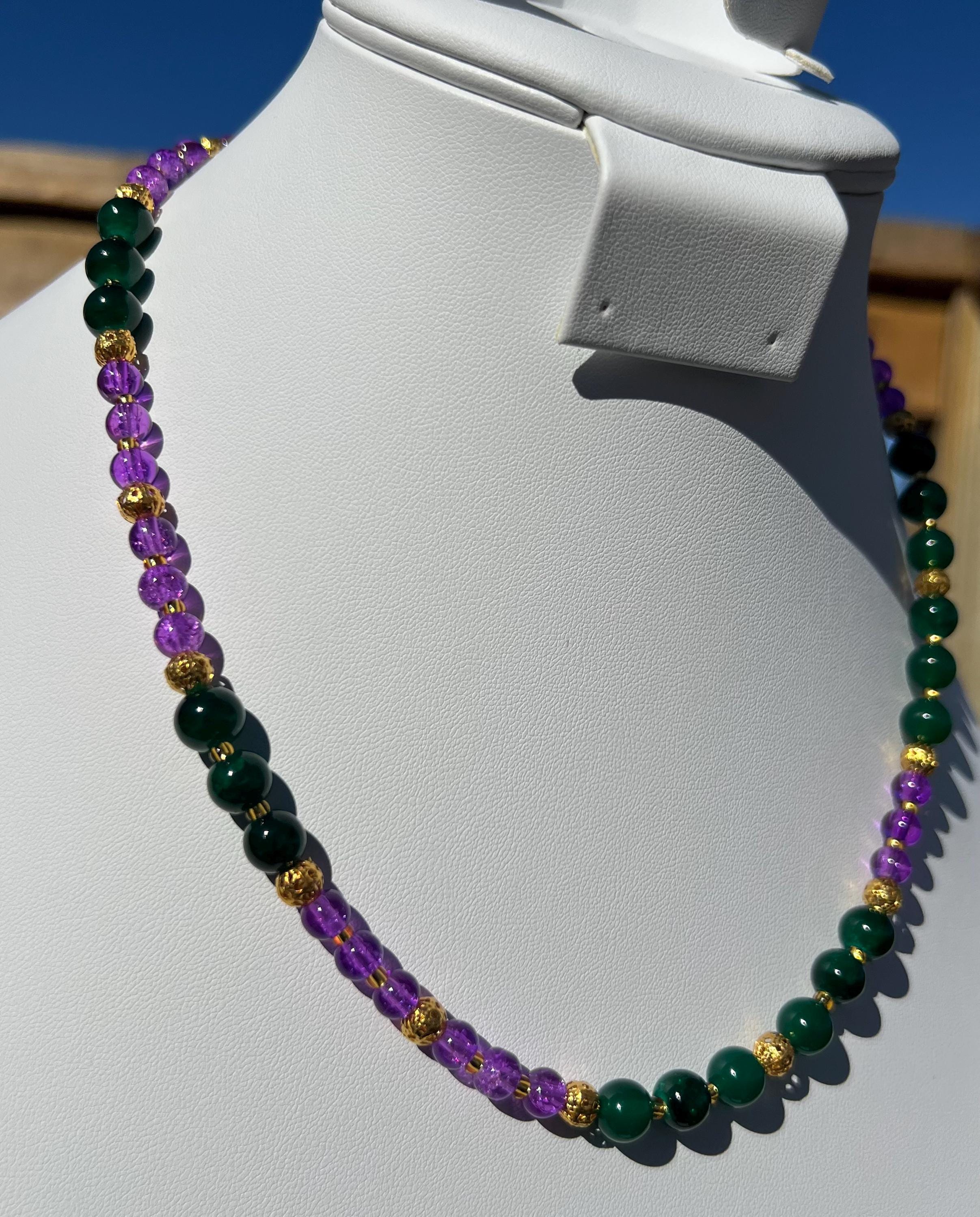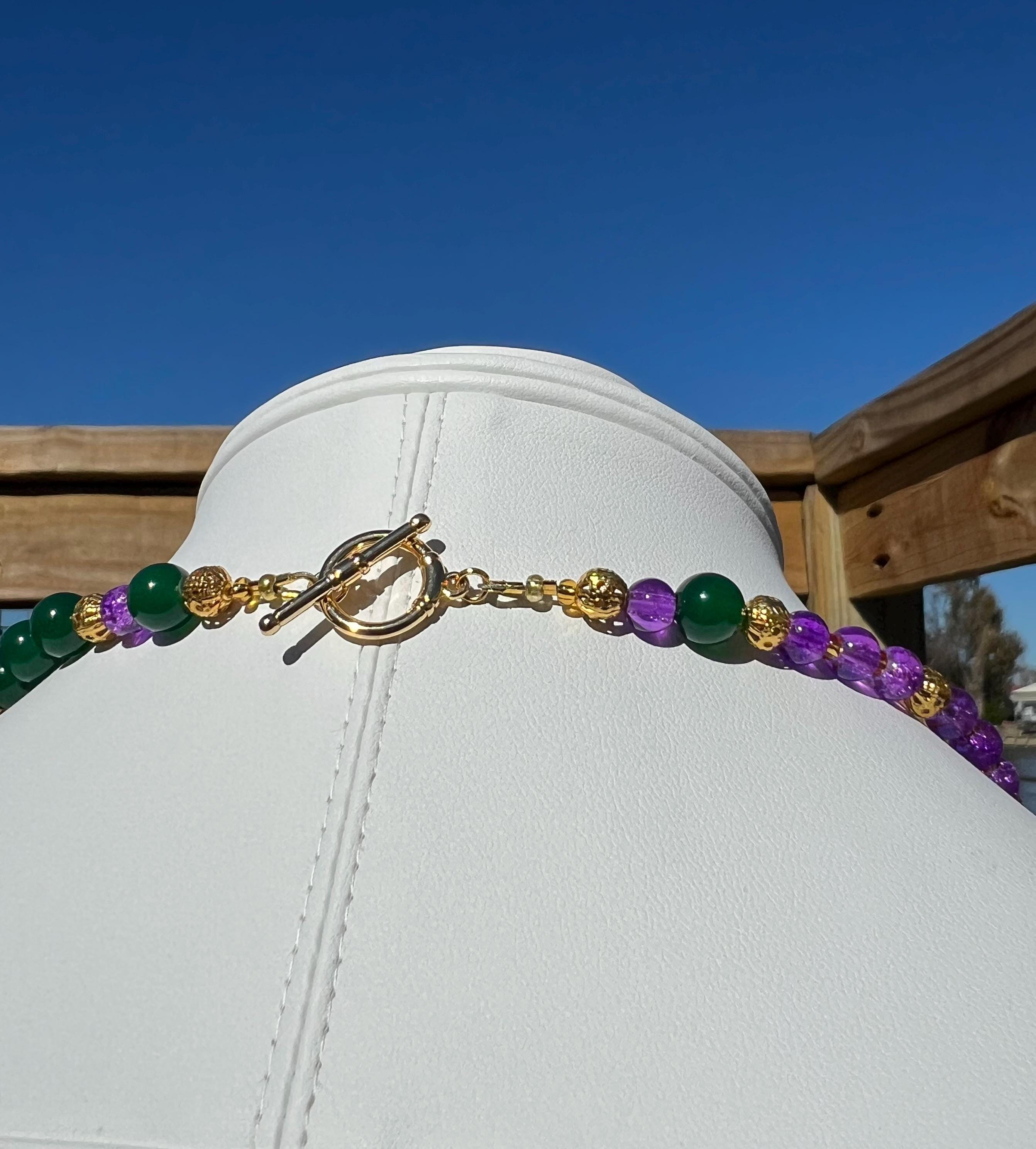 Celebrate Mardi Gras with a one-of-a-kind handcrafted necklace designed for versatility, color, and joyful expression. Each necklace in this collection is created using a vibrant mix of purple, green, and gold beads inspired by Carnival season, making it perfect for festive events, office celebrations, cruises, or everyday statement wear.