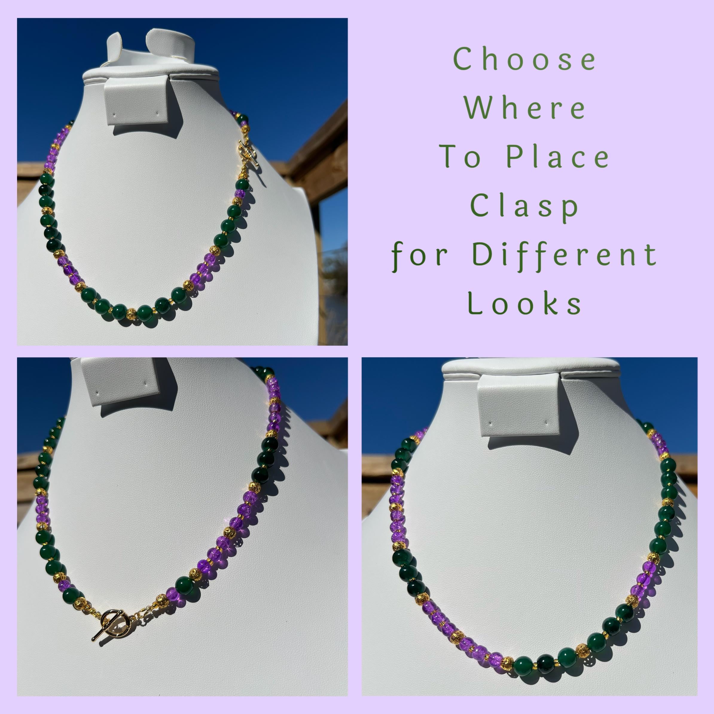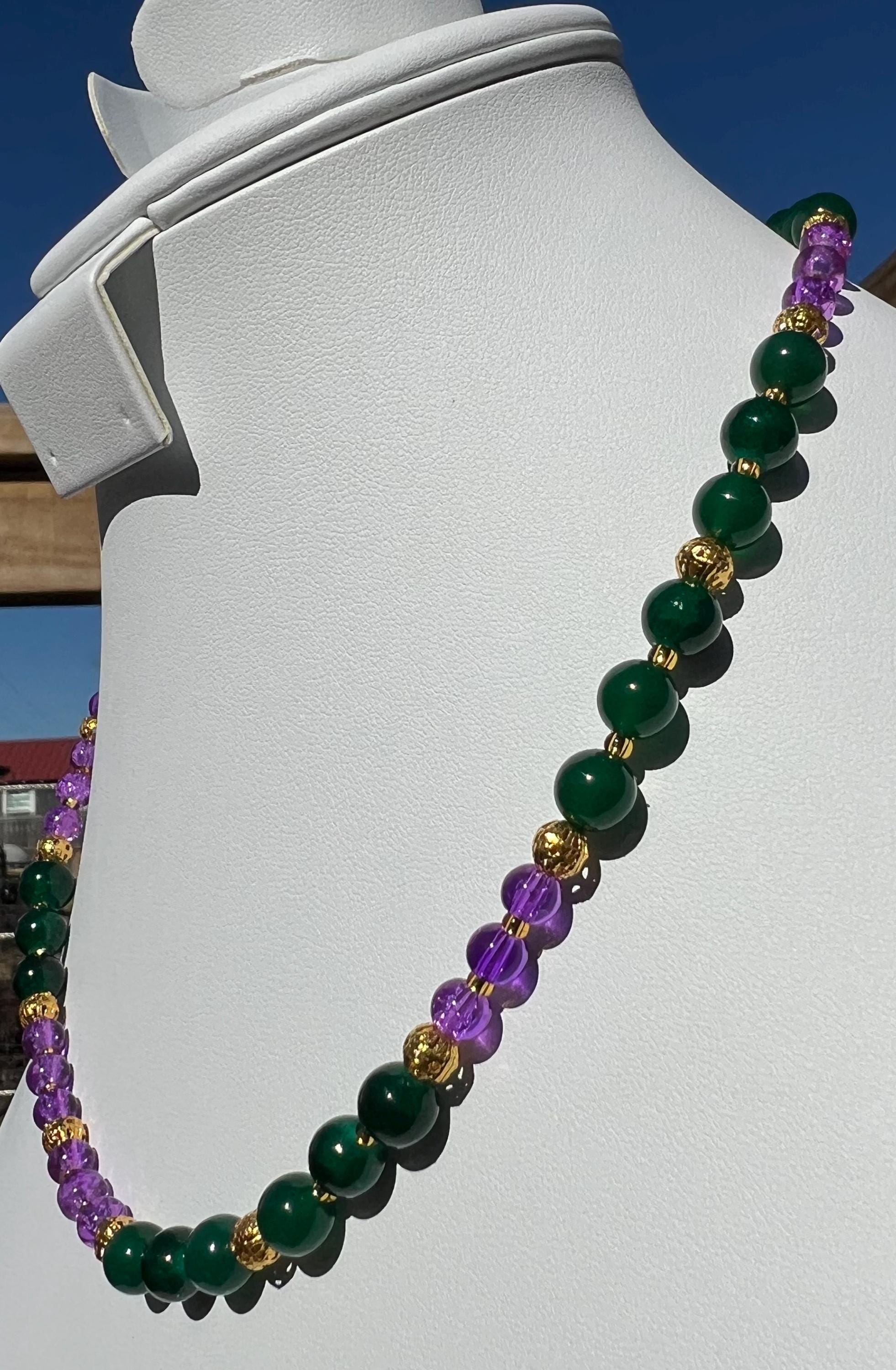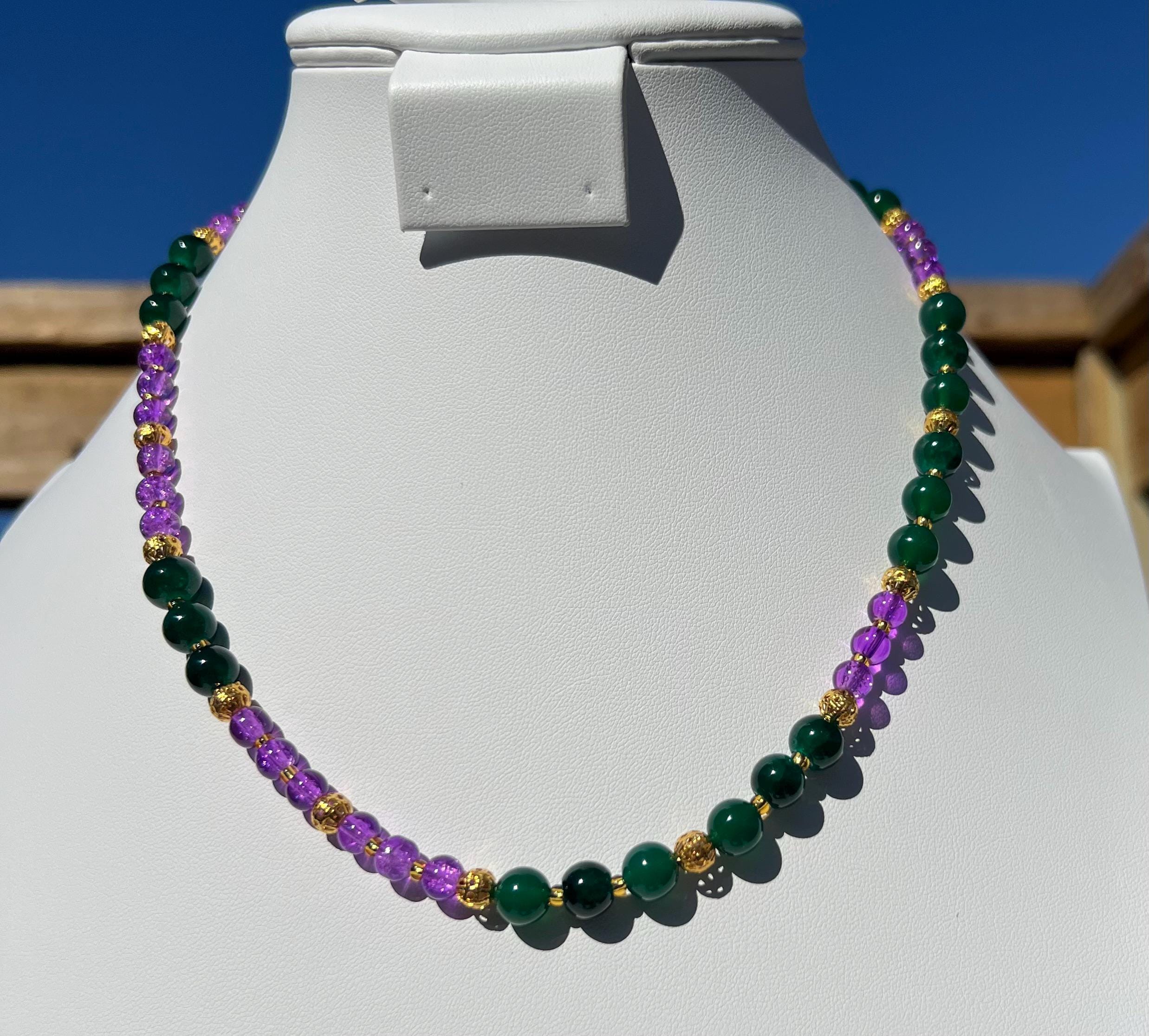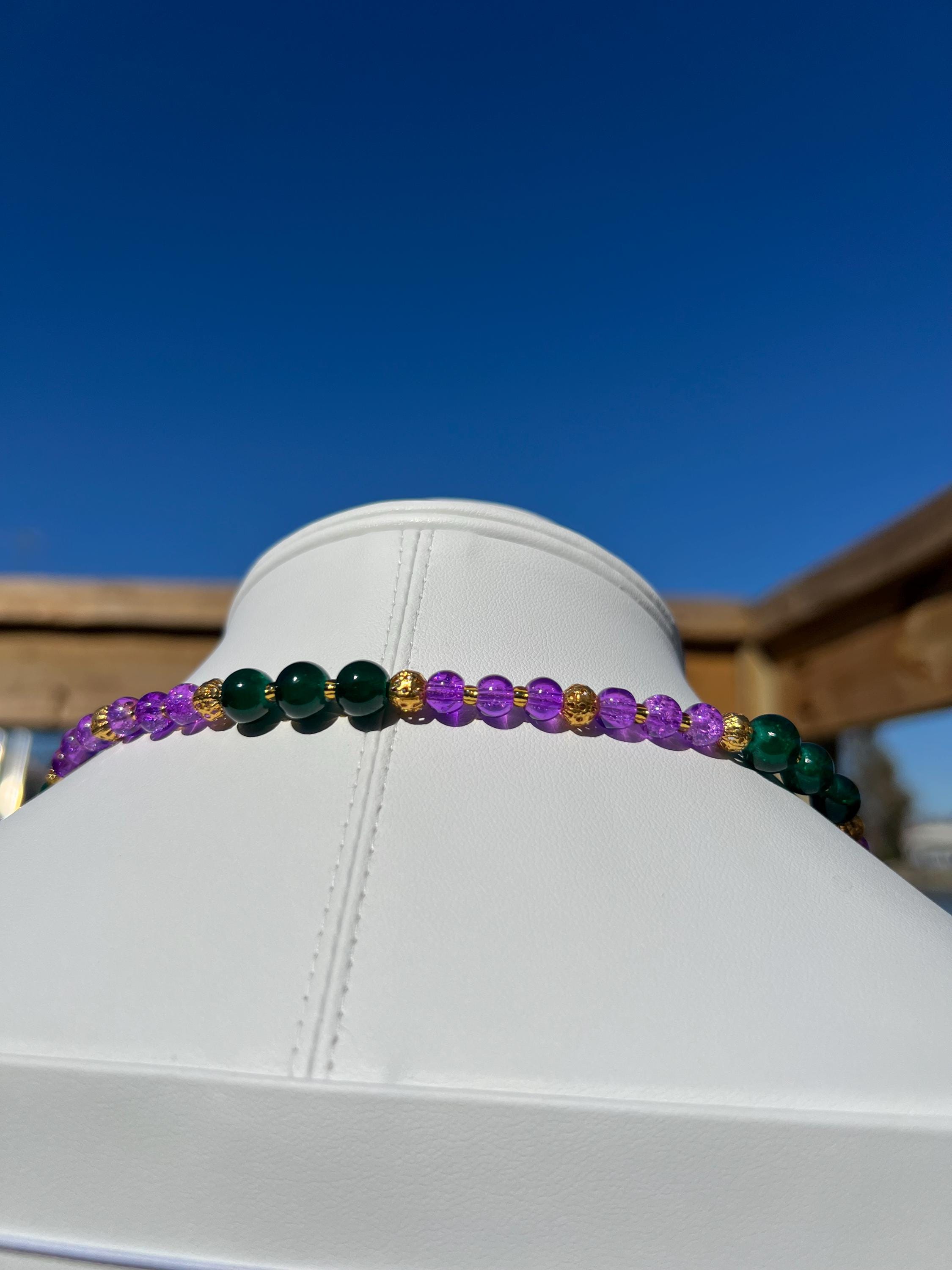Celebrate Mardi Gras with a one-of-a-kind handcrafted necklace designed for versatility, color, and joyful expression. Each necklace in this collection is created using a vibrant mix of purple, green, and gold beads inspired by Carnival season, making it perfect for festive events, office celebrations, cruises, or everyday statement wear.