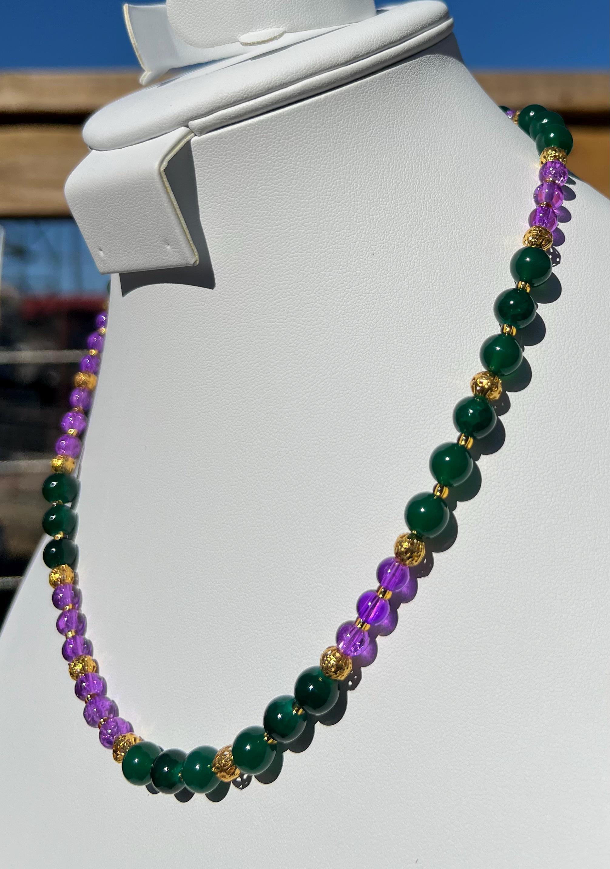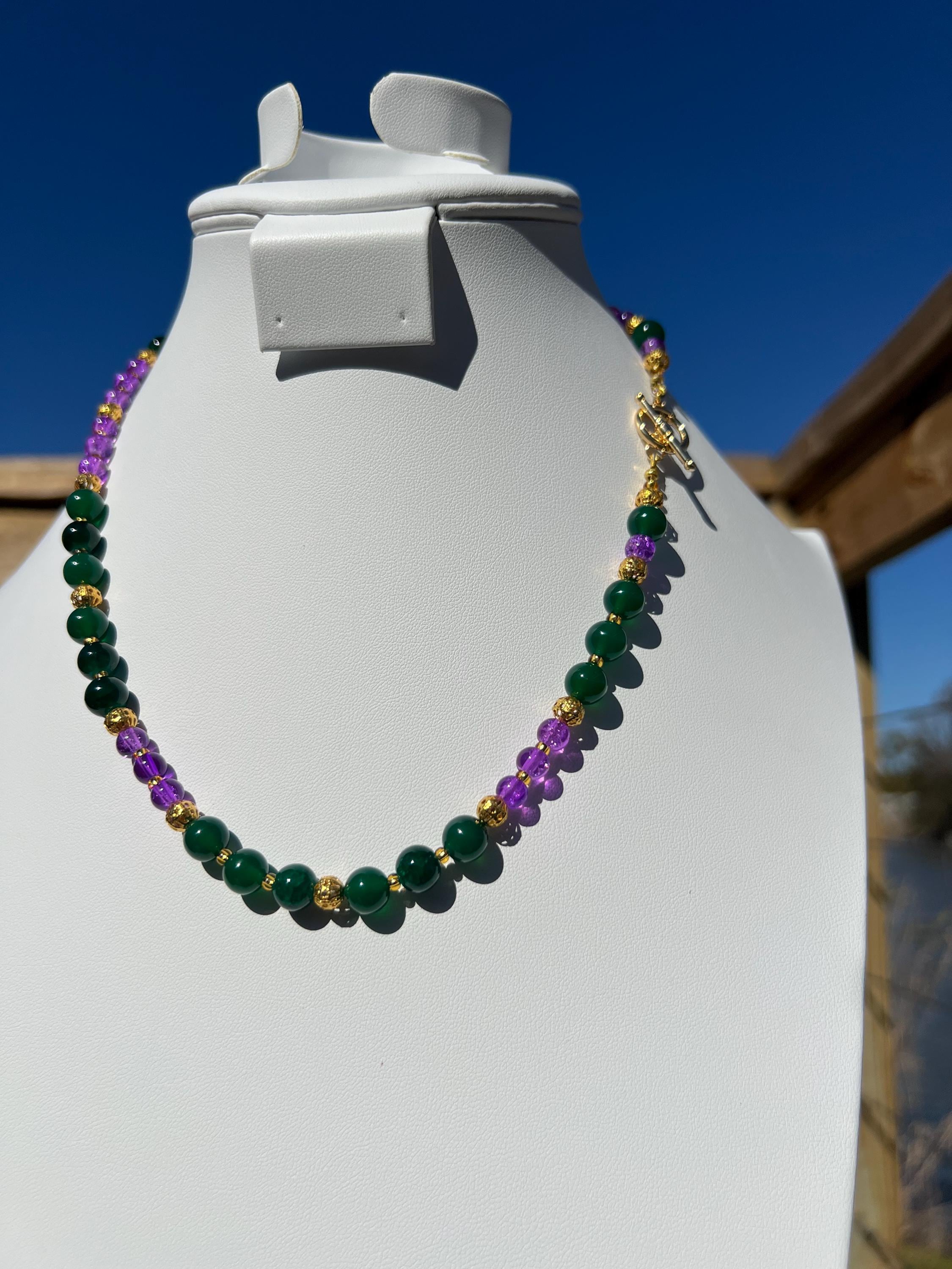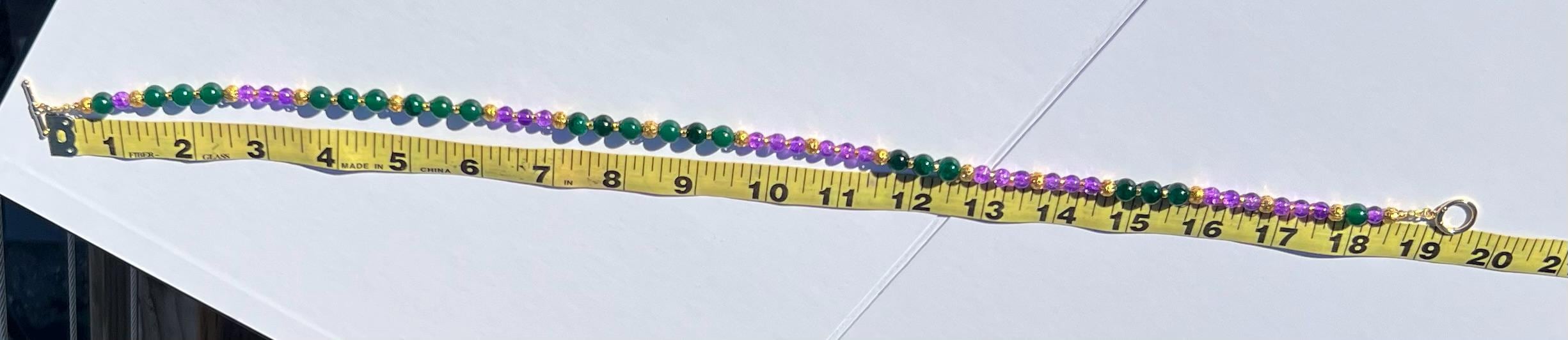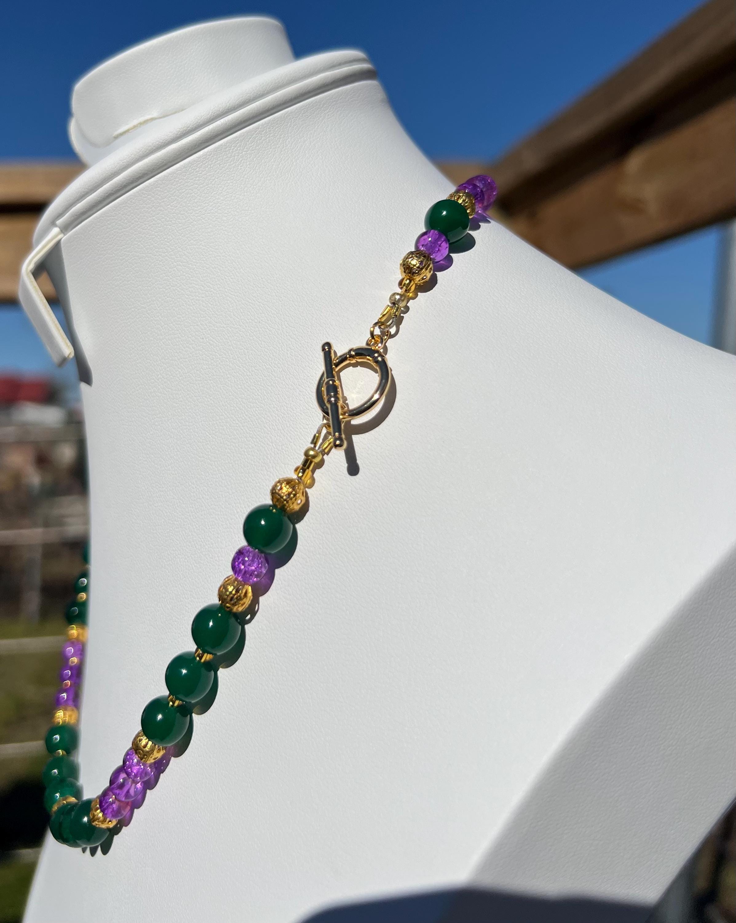18-1/2” Mardi Gras Necklace – Purple and Green-Gold Accents Stone-Glass-Metal Beads with Toggle Clasp,