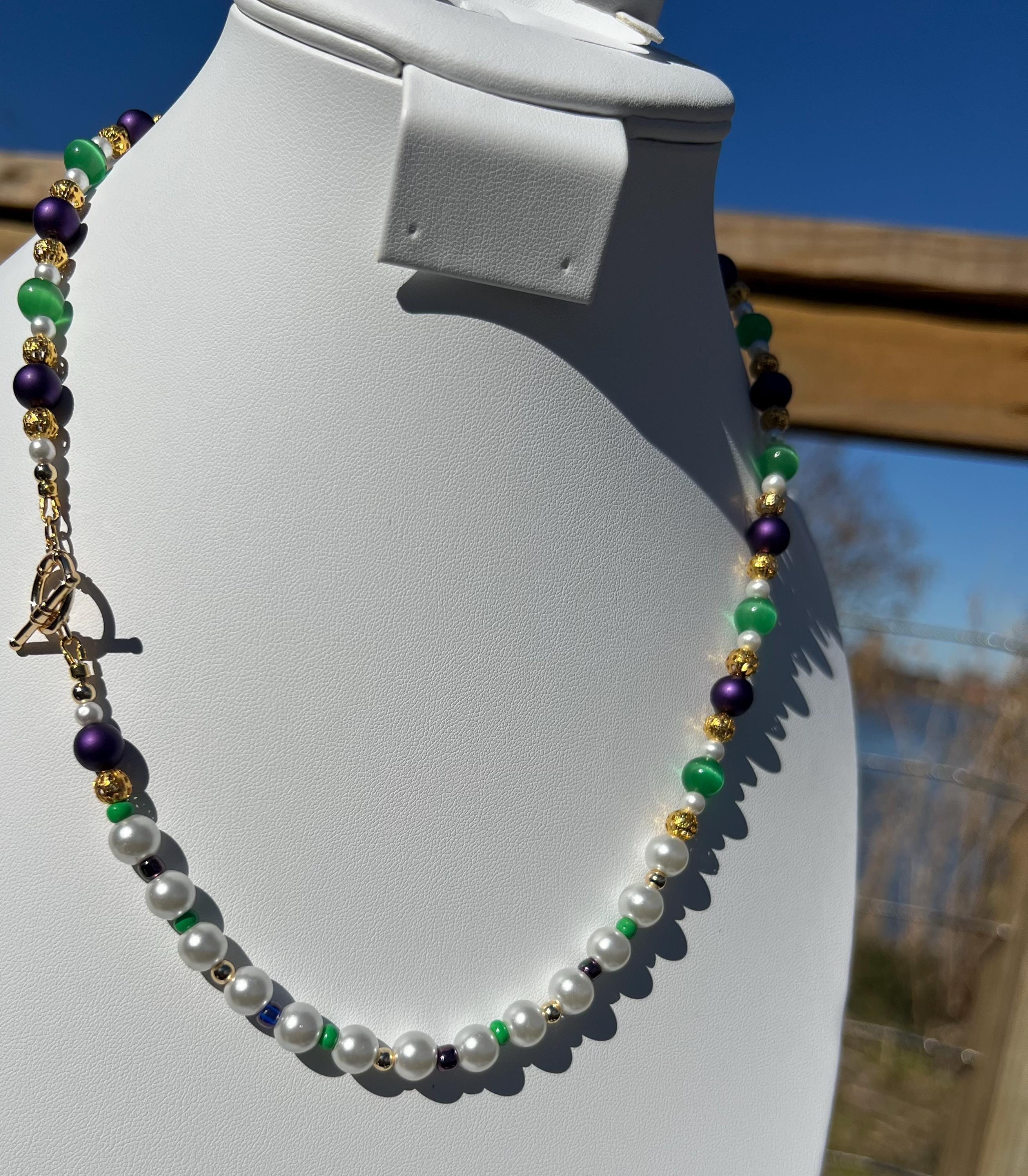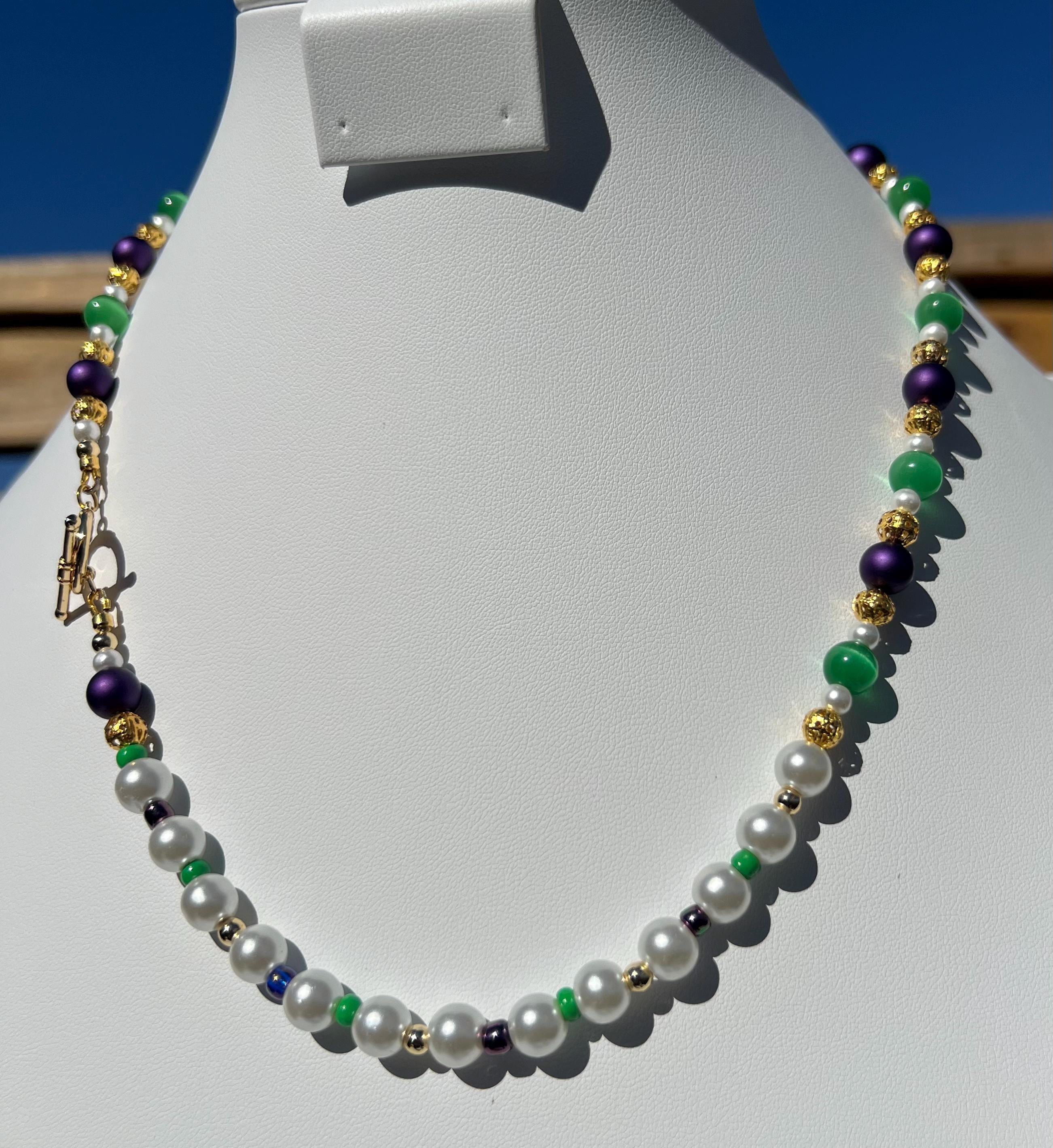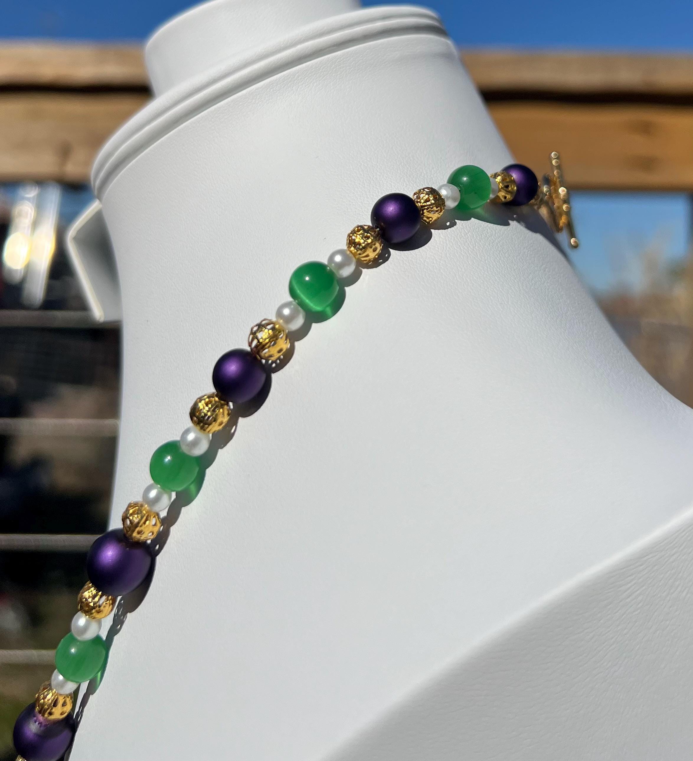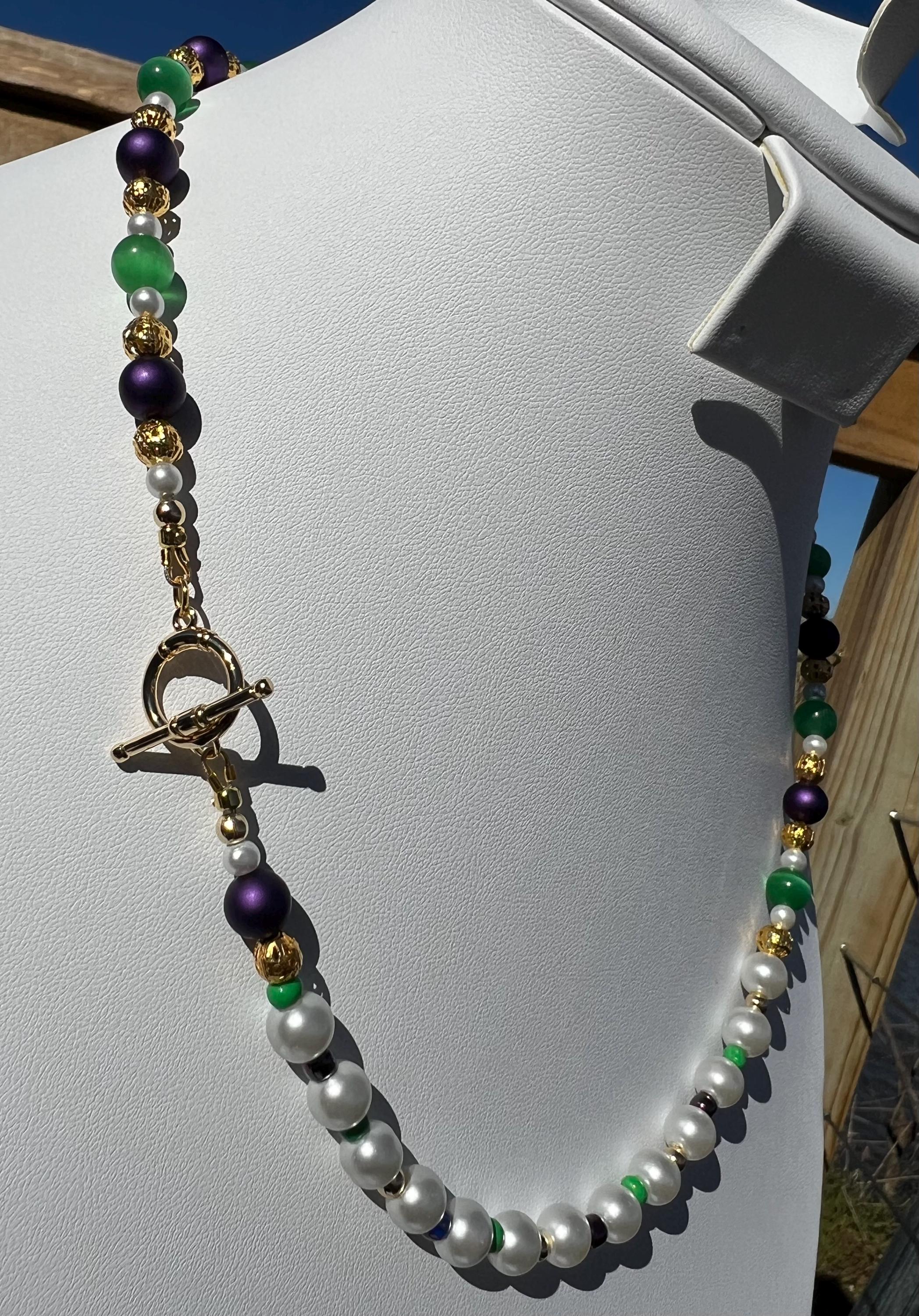 21” Mardi Gras Necklace – Purple-Green-Gold-Faux Pearl-Glass-Metal Beads with Toggle Clasp