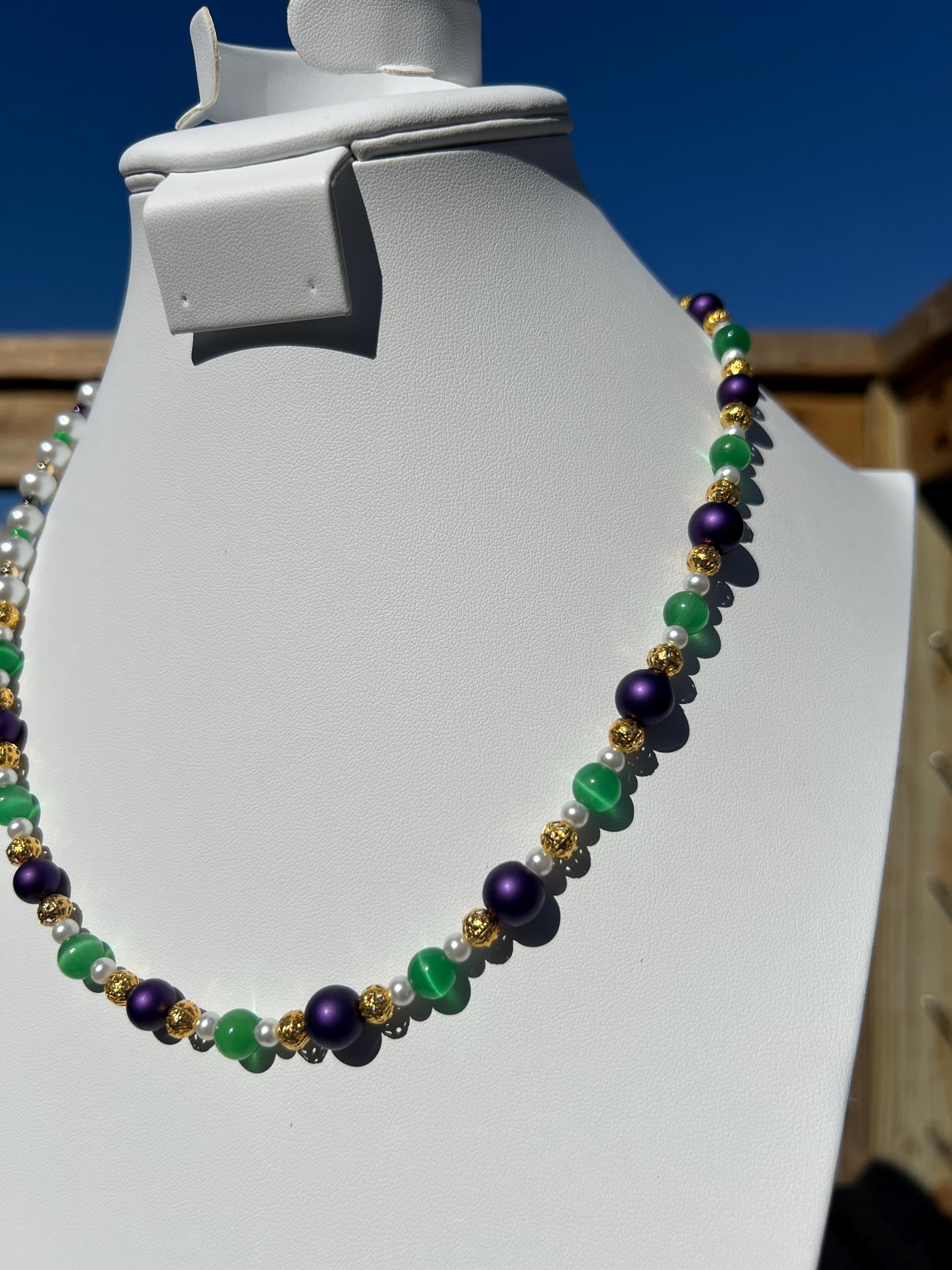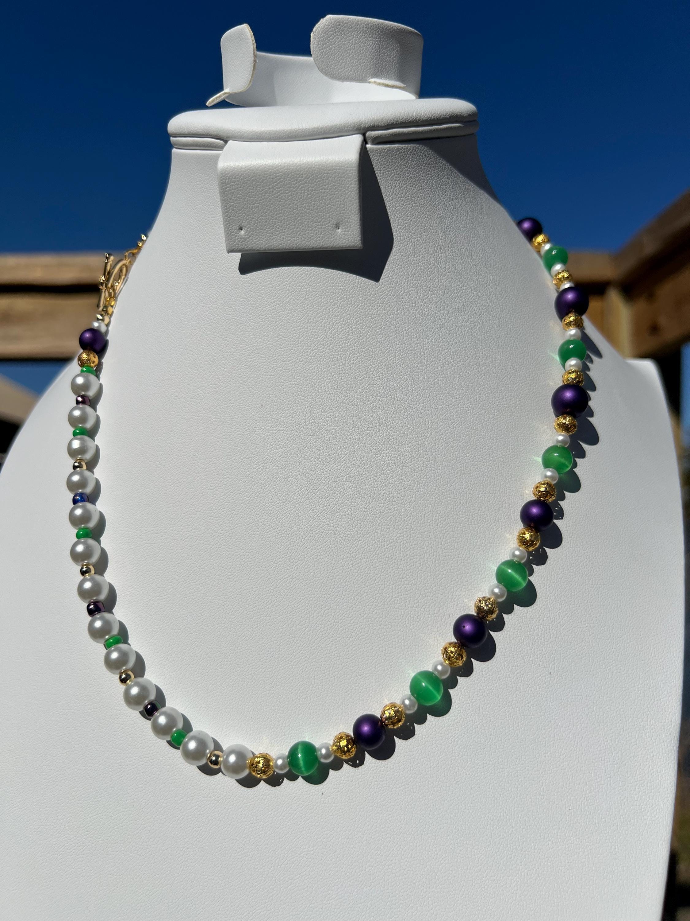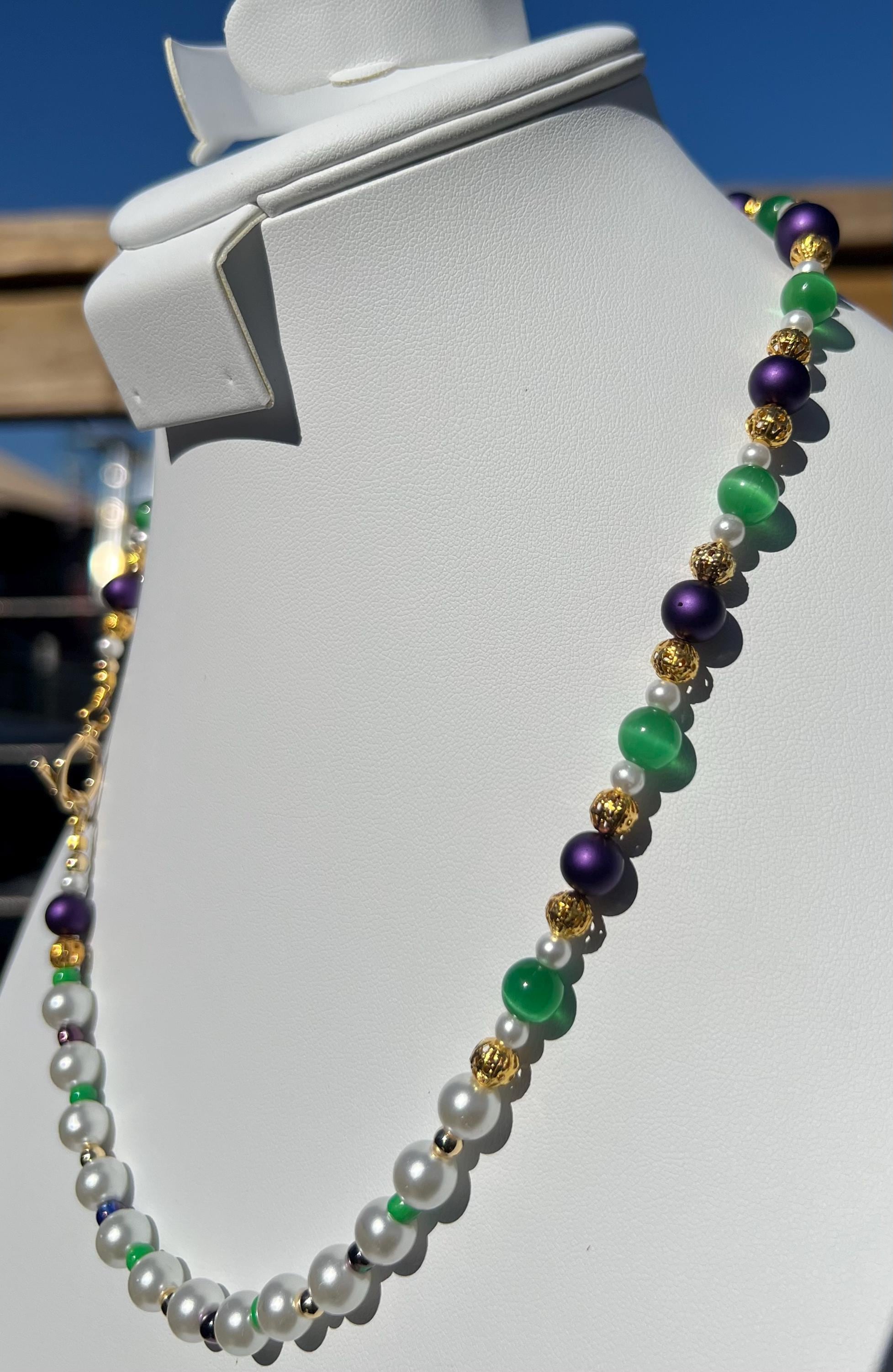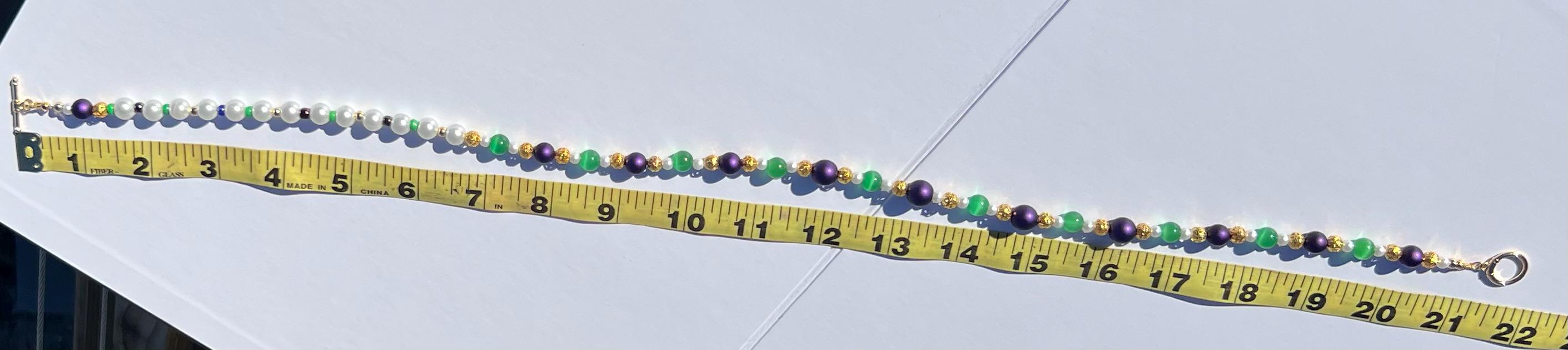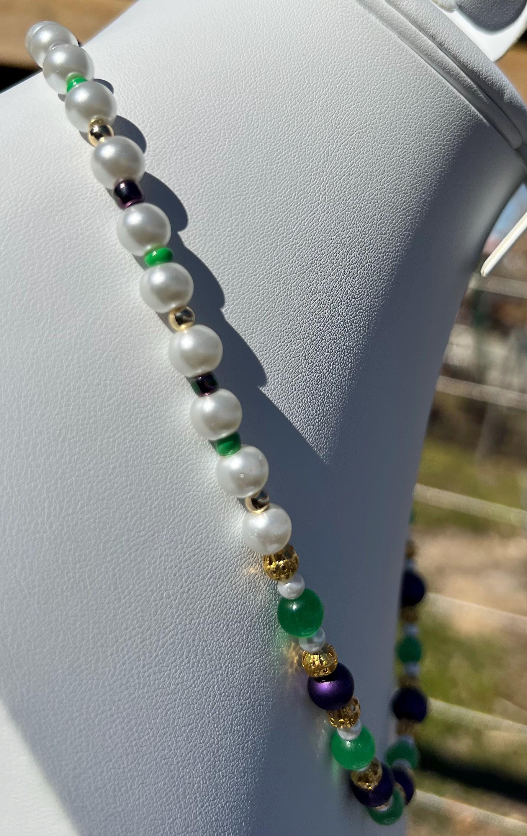 21” Mardi Gras Necklace – Purple-Green-Gold-Faux Pearl-Glass-Metal Beads with Toggle Clasp