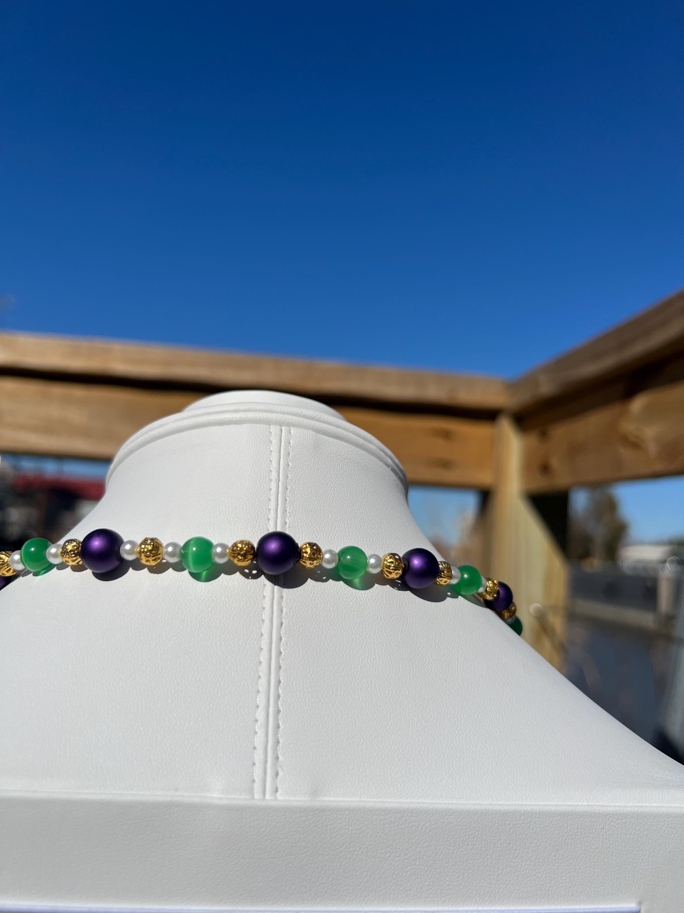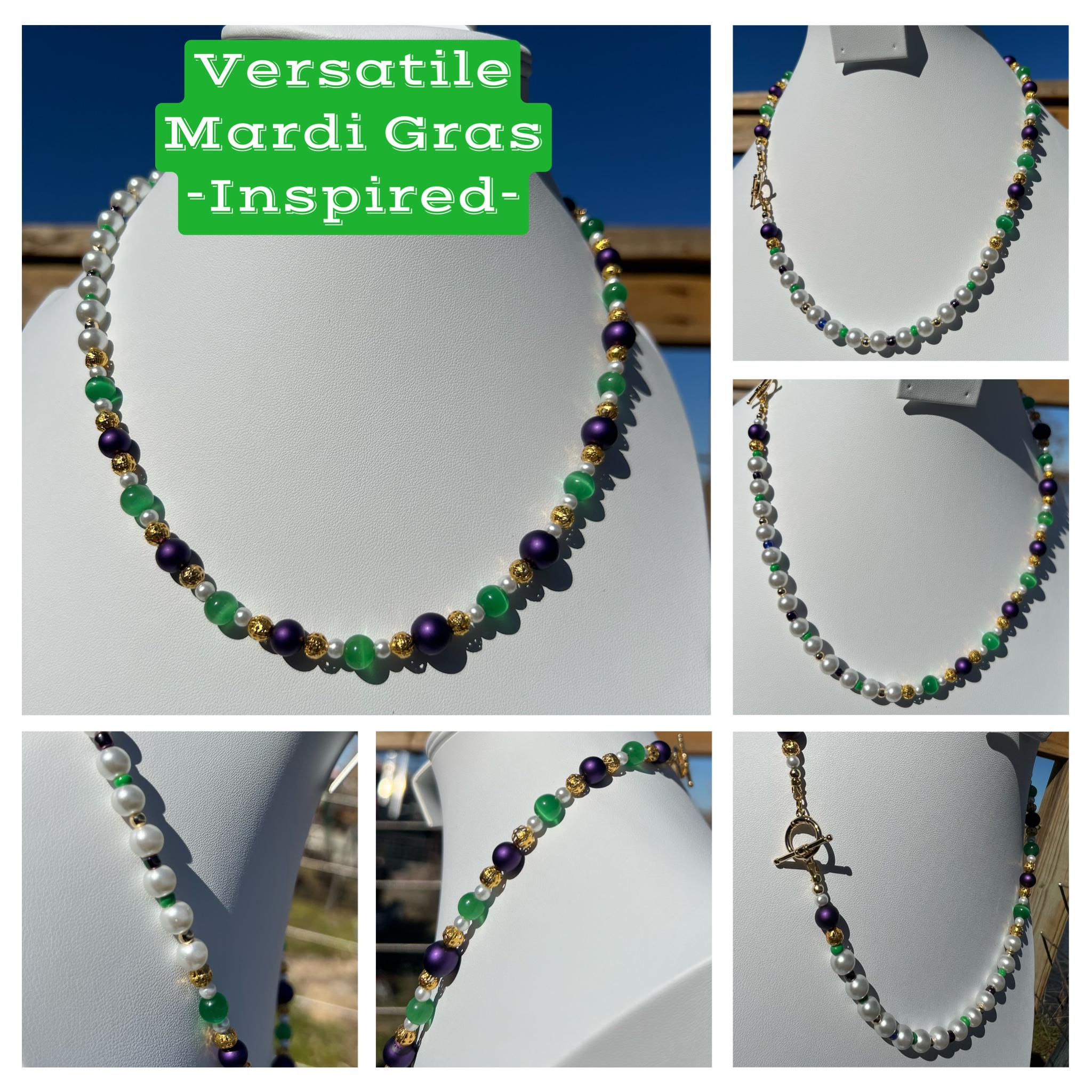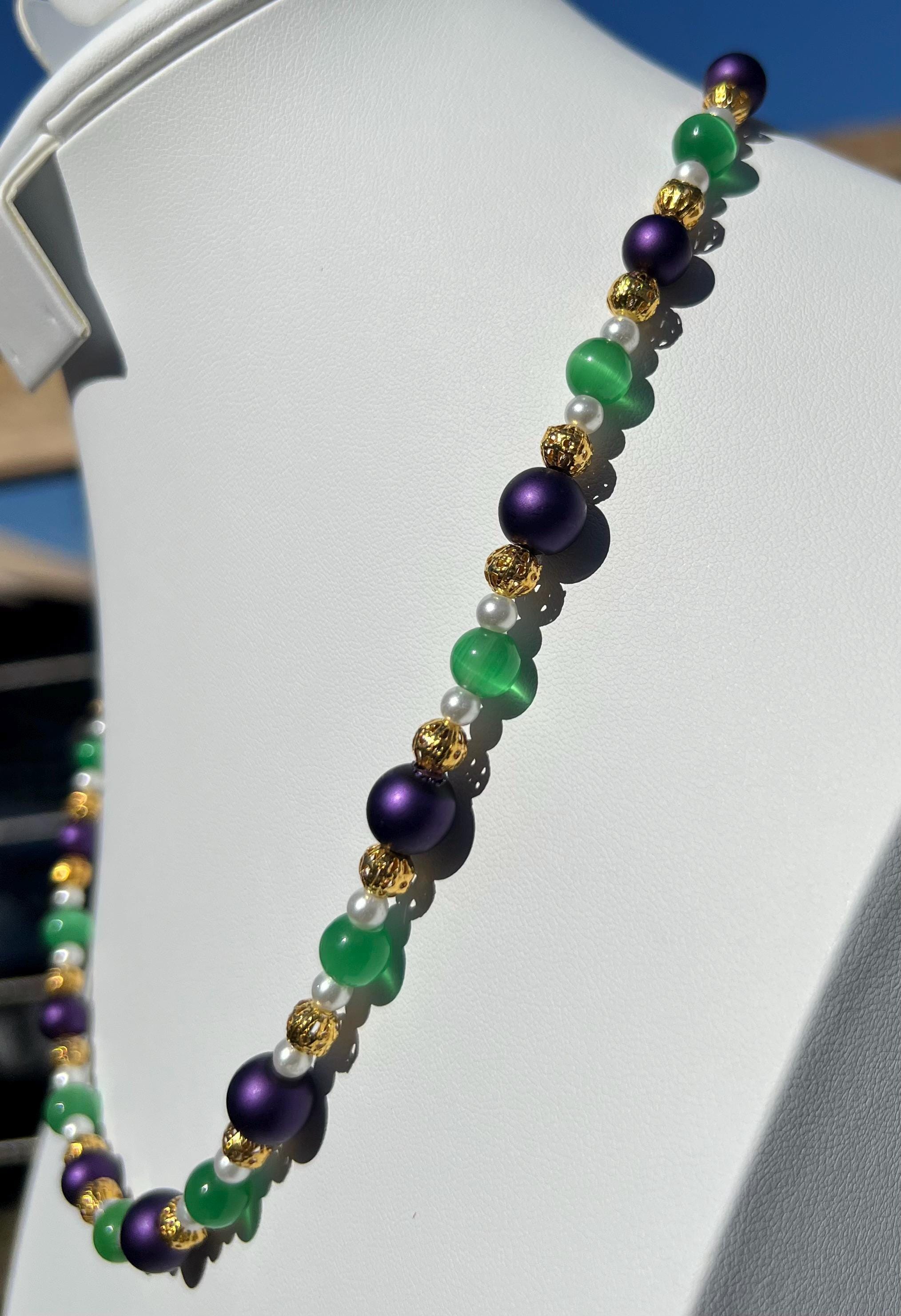 Celebrate Mardi Gras with a one-of-a-kind handcrafted necklace designed for versatility, color, and joyful expression. Each necklace in this collection is created using a vibrant mix of purple, green, and gold beads inspired by Carnival season, making it perfect for festive events, office celebrations, cruises, or everyday statement wear.