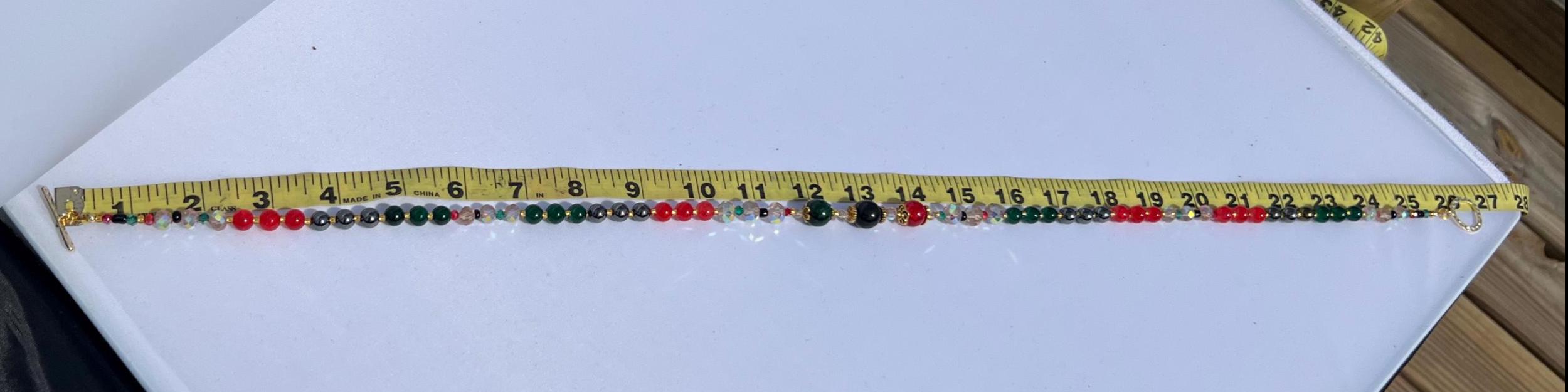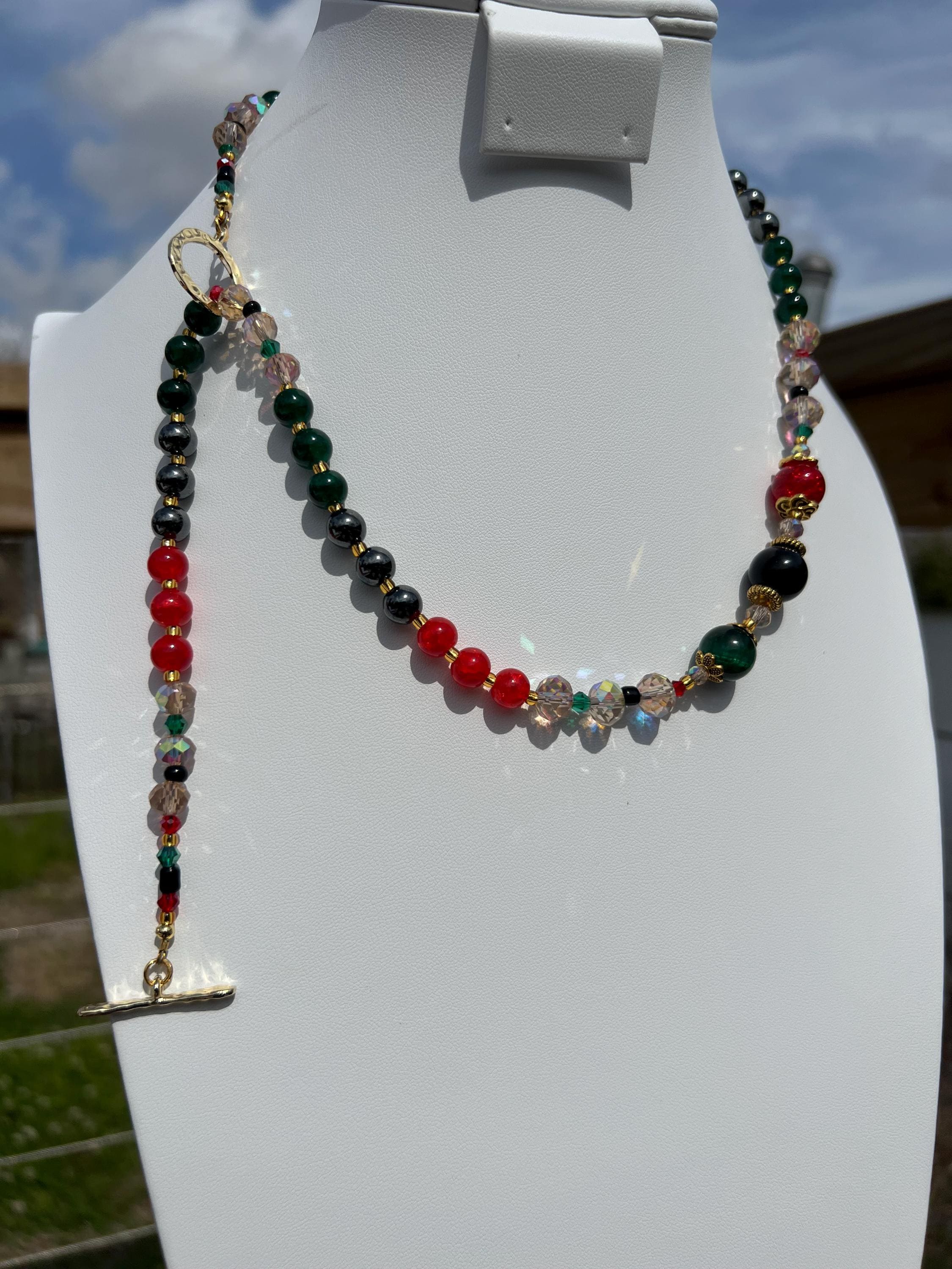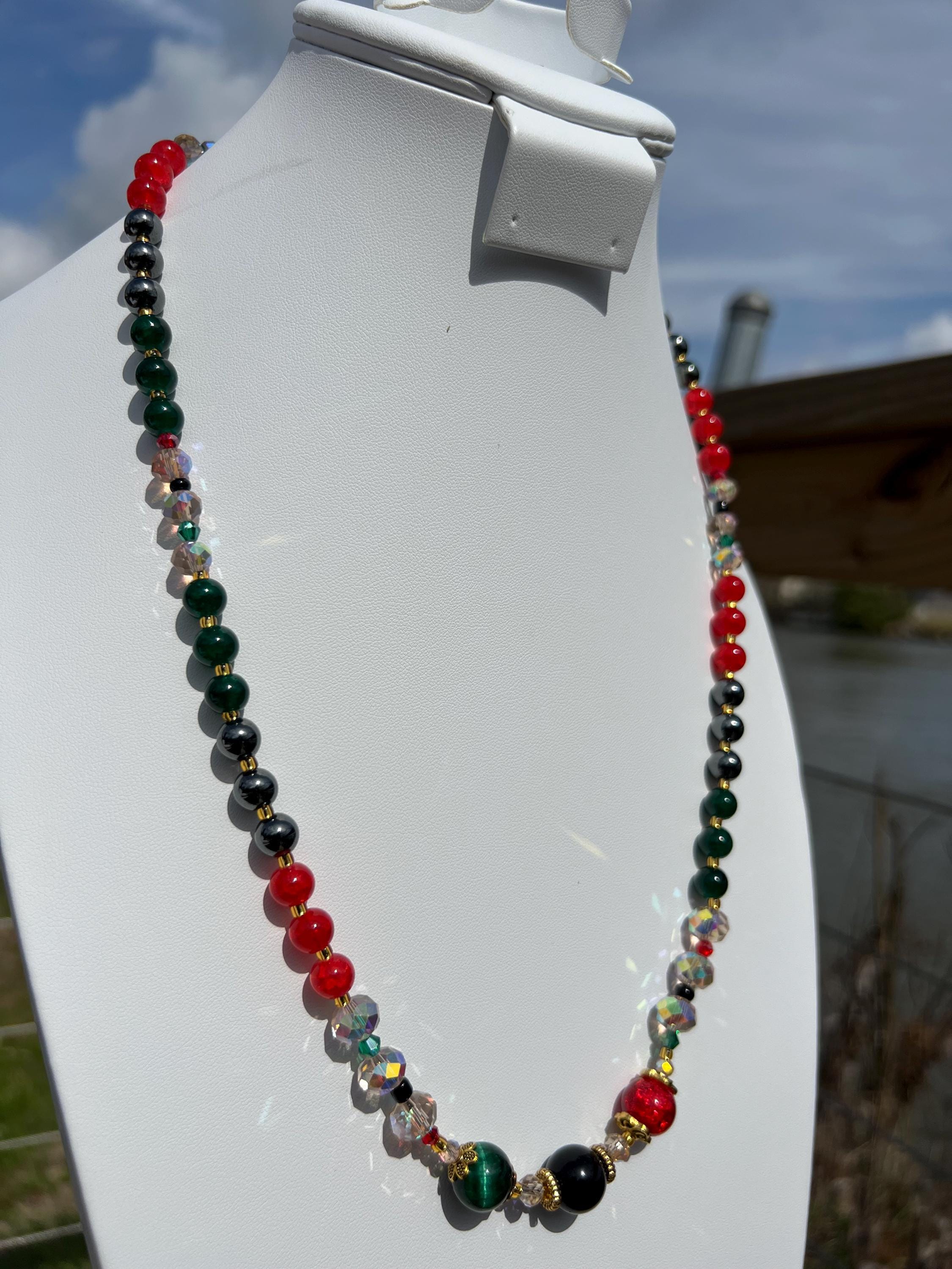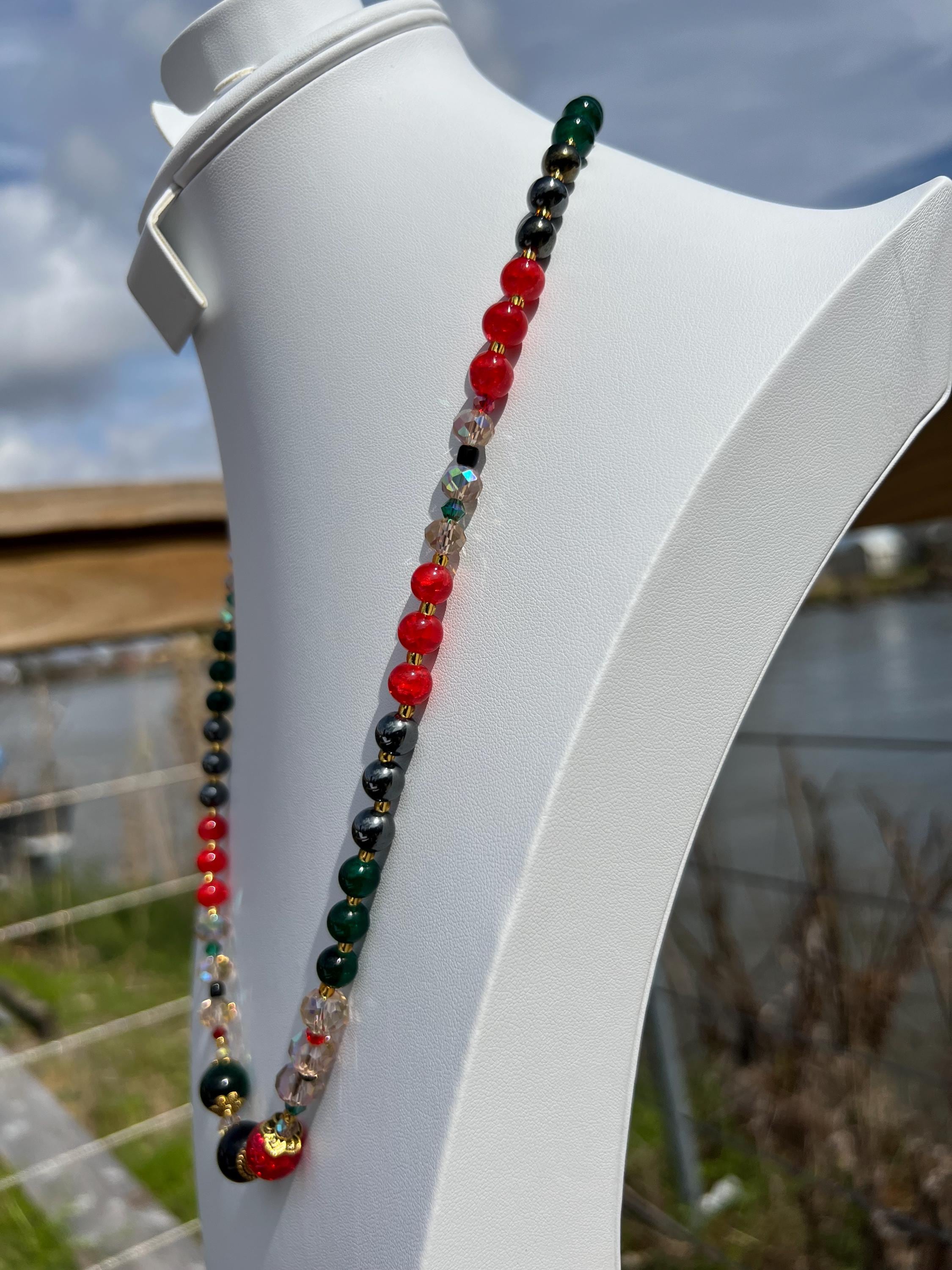 Show your support and celebrate Black Heritage Month with a one-of-a-kind handcrafted necklace designed for versatility, color, and joyful expression. Each necklace in this collection is created using a vibrant mix of red, black, green, and gold beads signifying the blood shed for freedom, strength and resilience, abundance and prosperity. This necklace is perfect for festive events, office celebrations, cruises, or everyday statement wear.