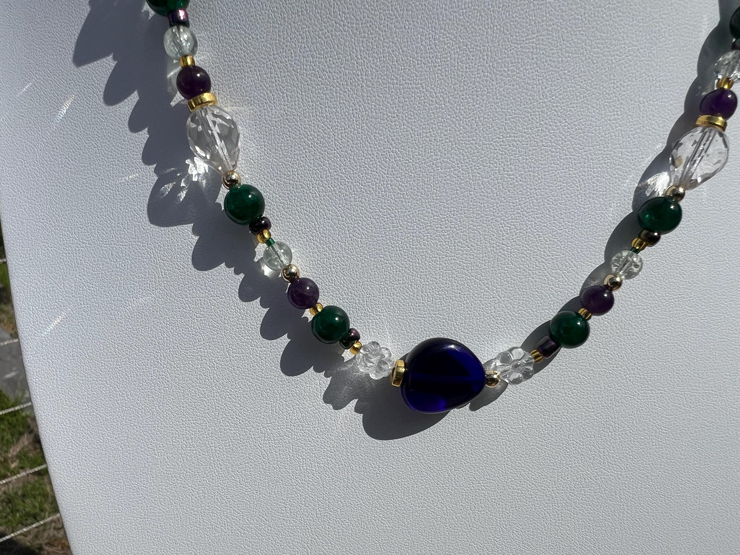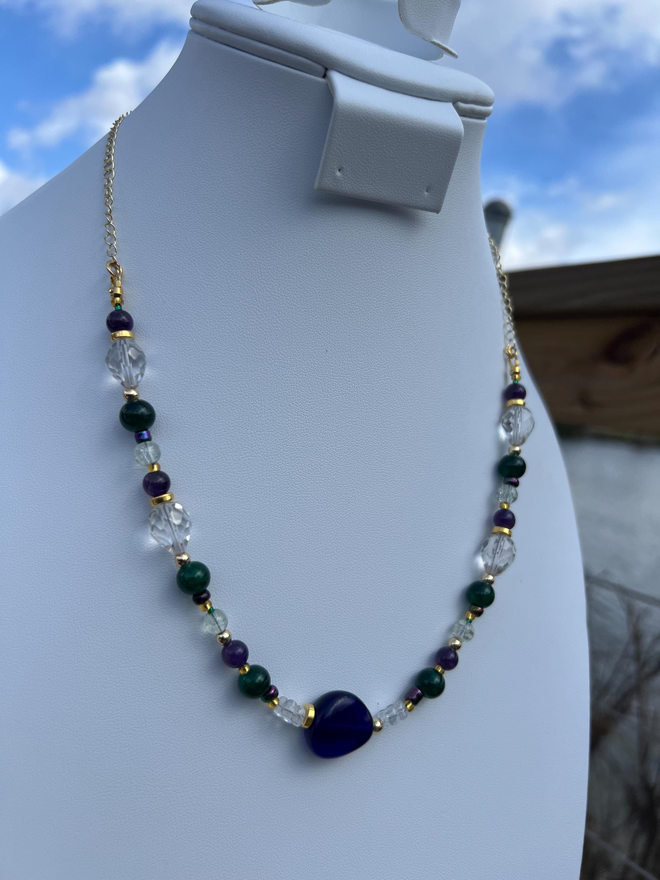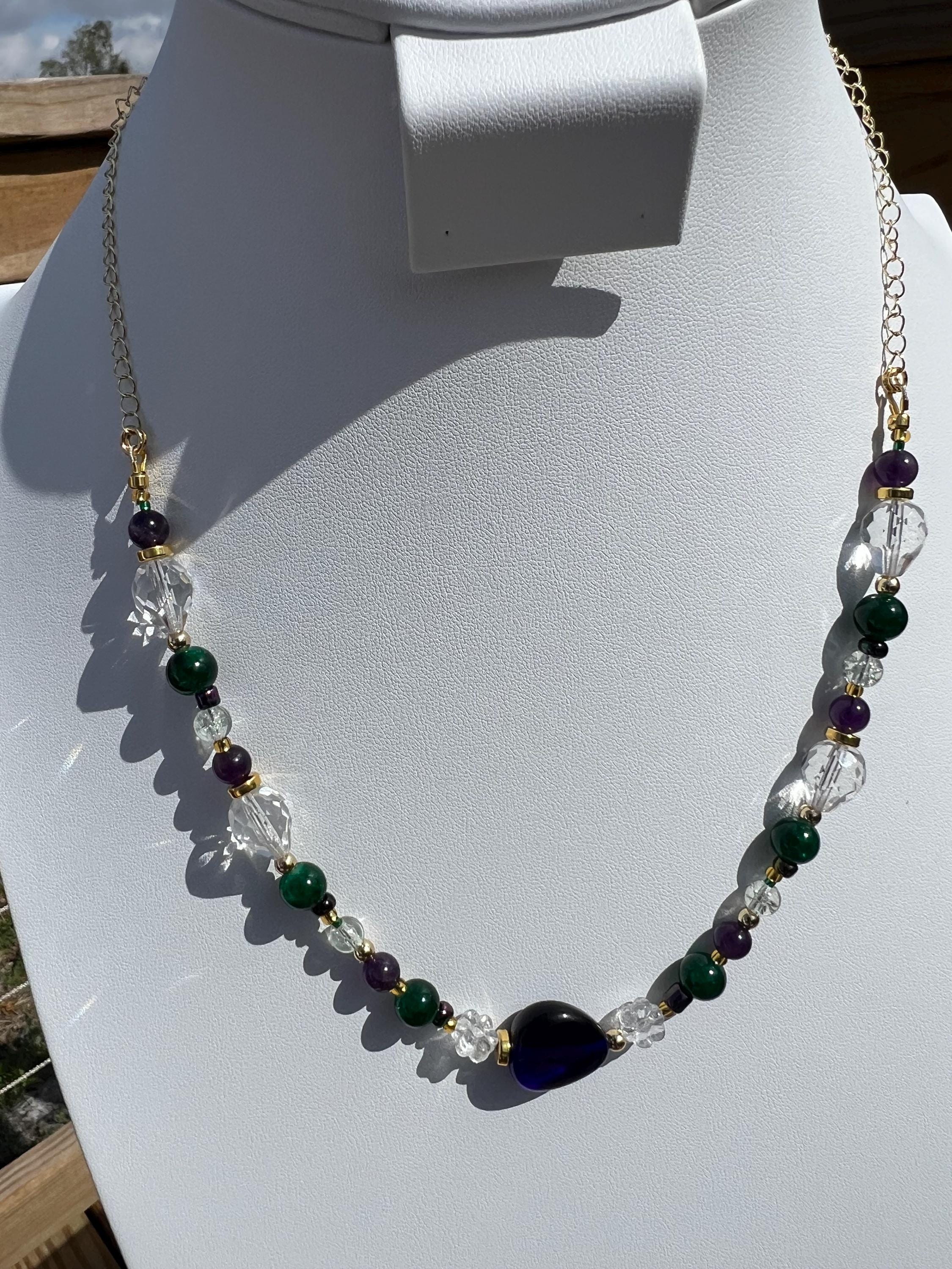 Each necklace in this collection is individually handcrafted and may include a combination of multi-faceted beads, natural stones, glass beads, polymer clay, rhinestones, cubic zirconia accents, and gold-plated elements. No two are alike, ensuring the necklace you receive is truly one of a kind.