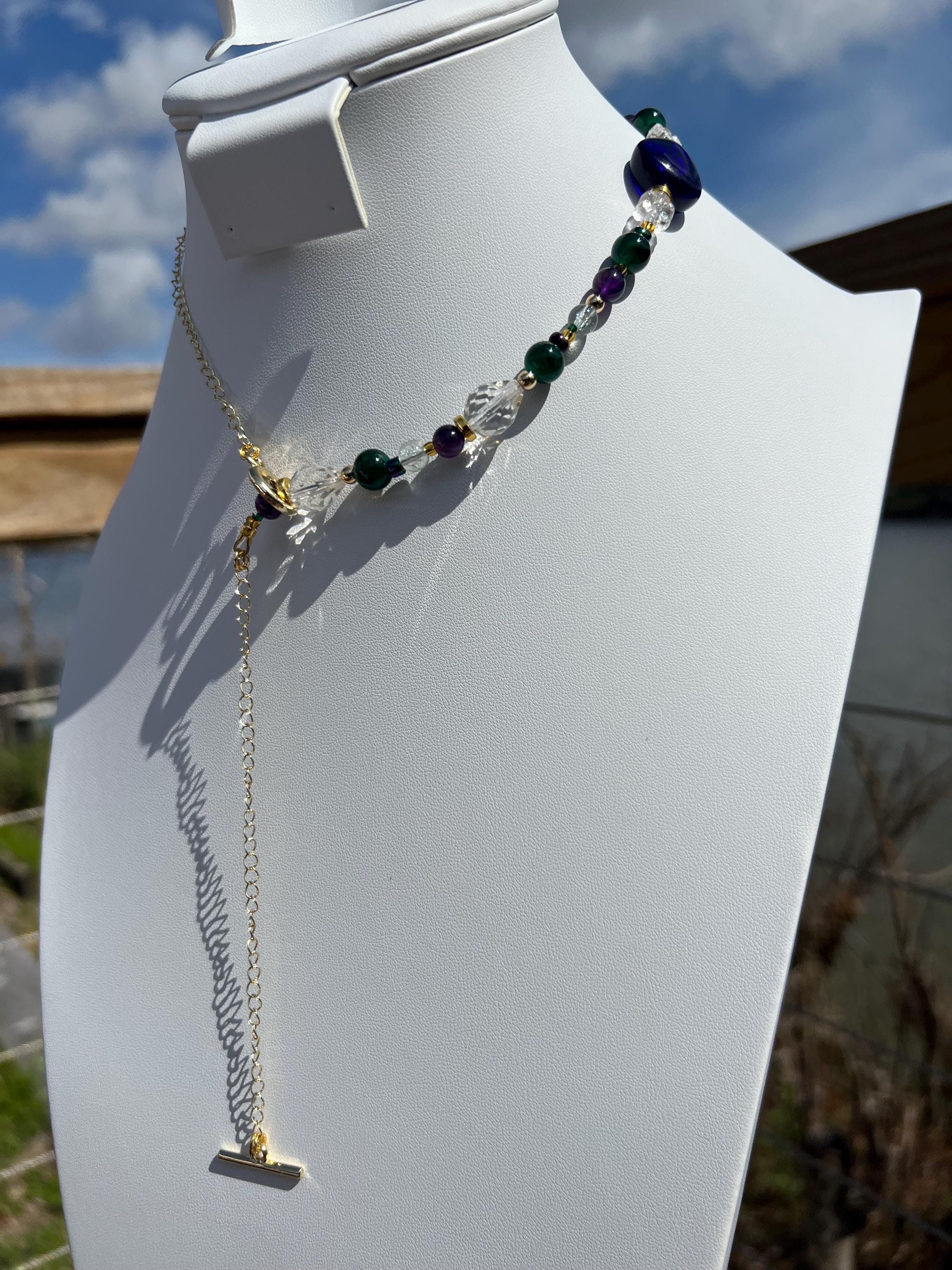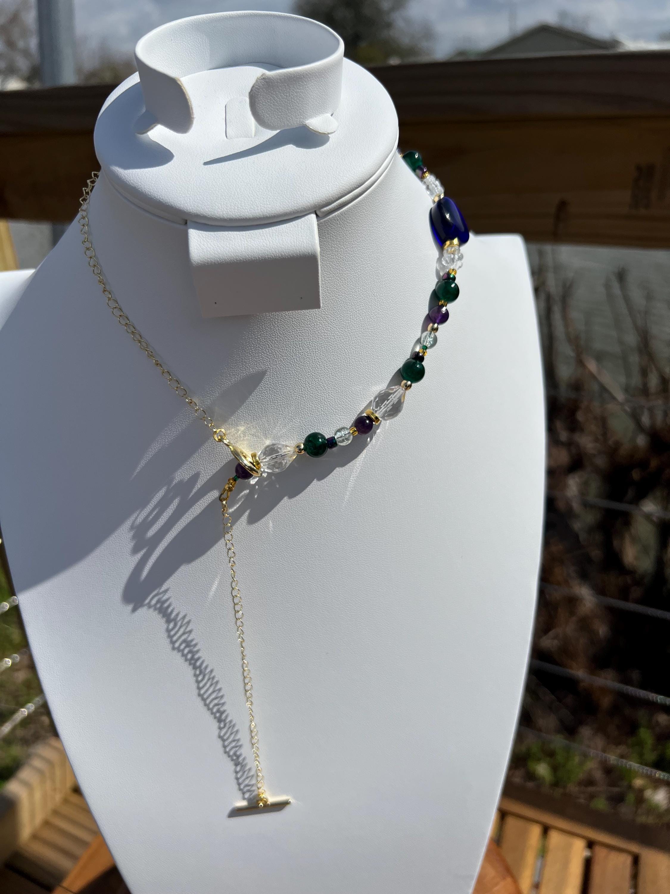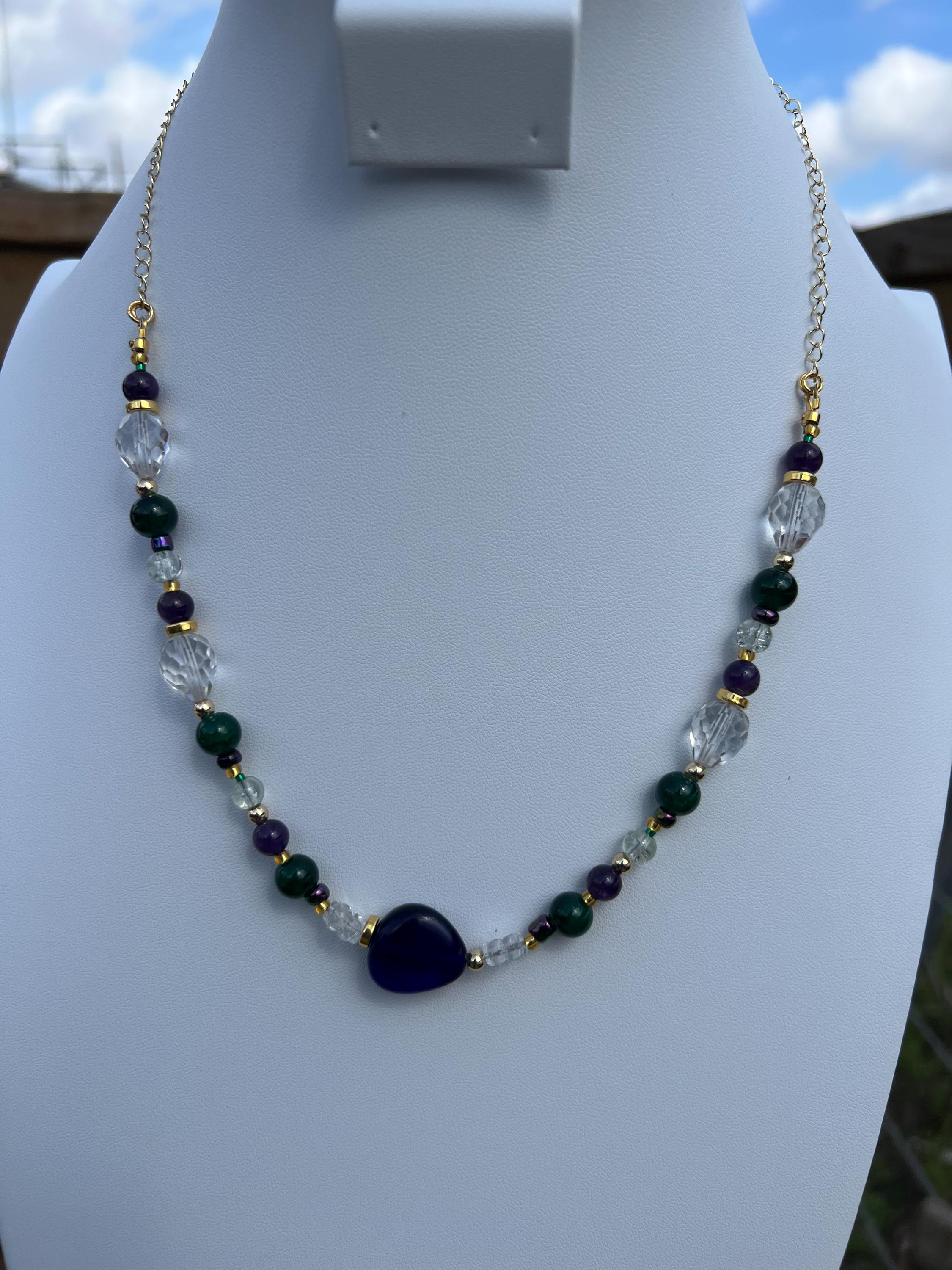 Each necklace in this collection is individually handcrafted and may include a combination of multi-faceted beads, natural stones, glass beads, polymer clay, rhinestones, cubic zirconia accents, and gold-plated elements. No two are alike, ensuring the necklace you receive is truly one of a kind.